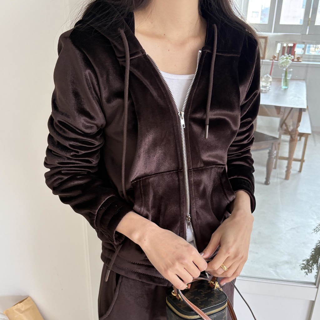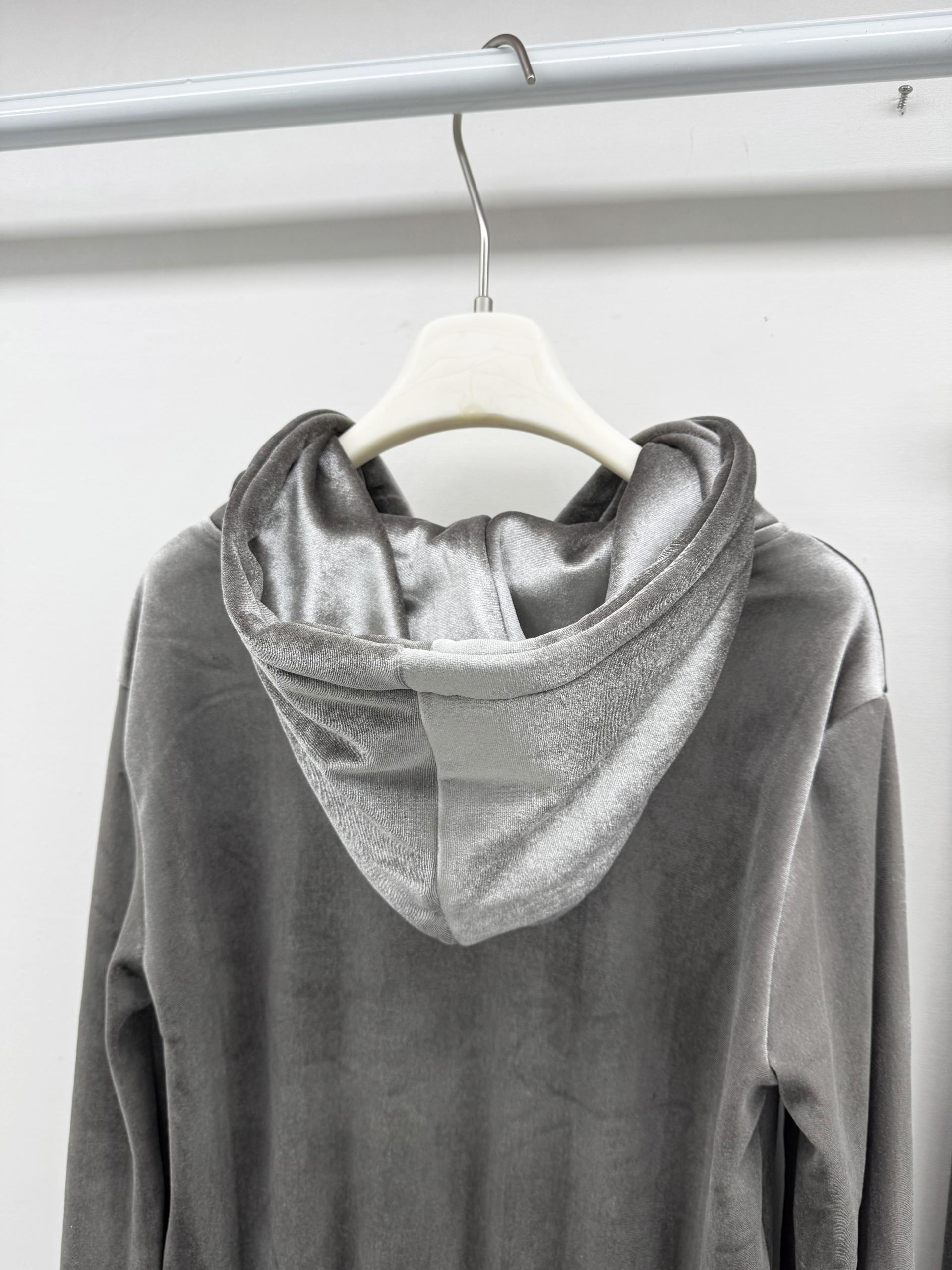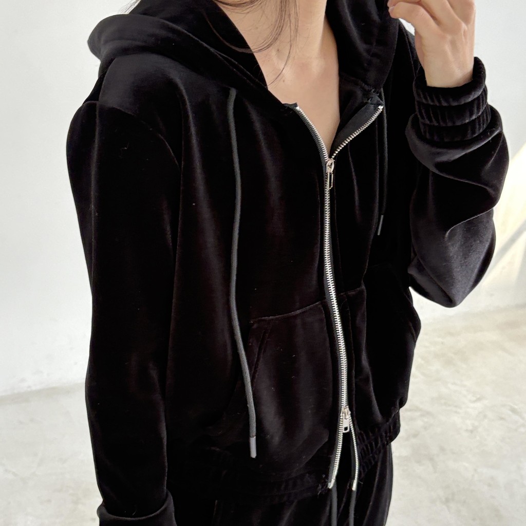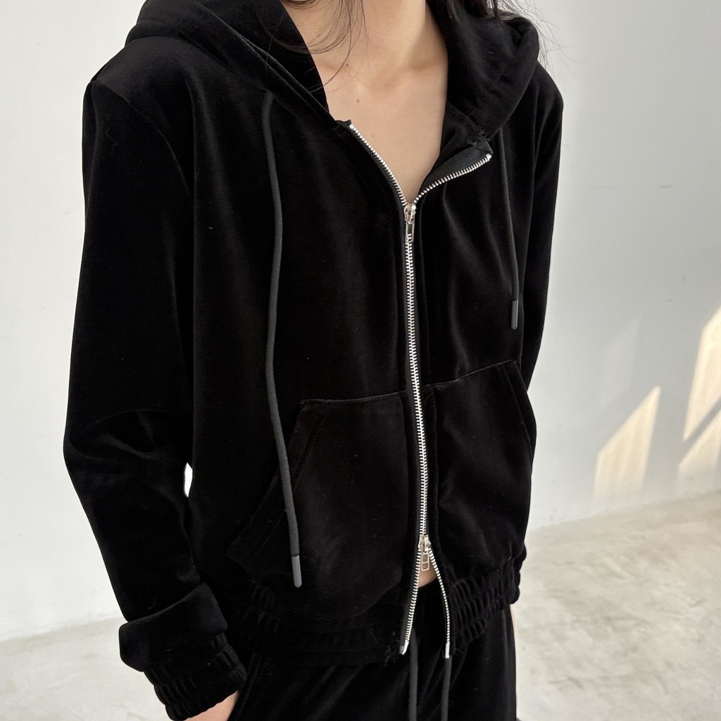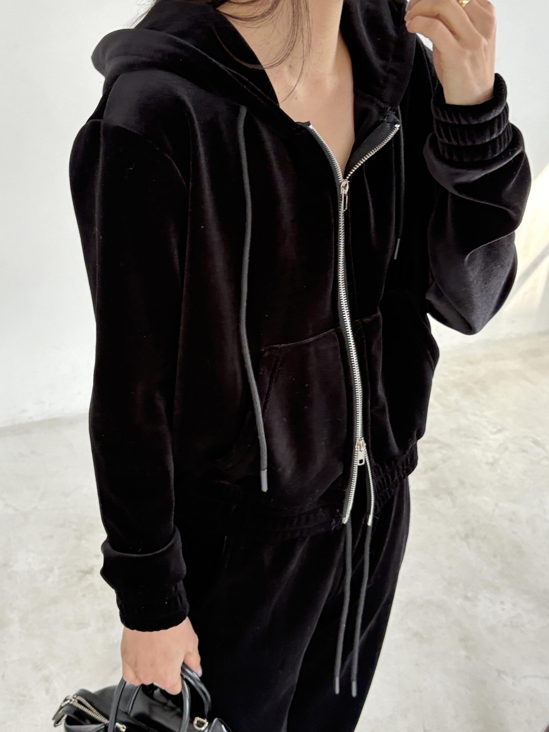 부드럽게 흐르는 벨벳 소재로 제작된 후드 집업입니다.