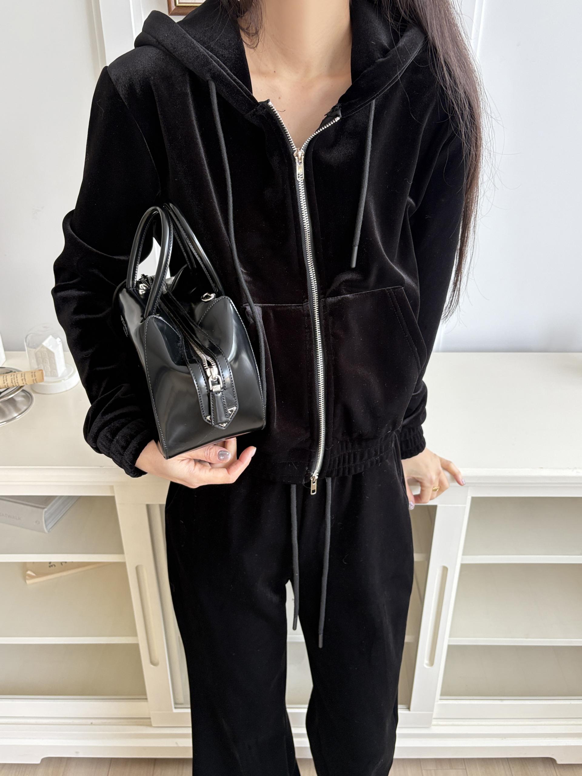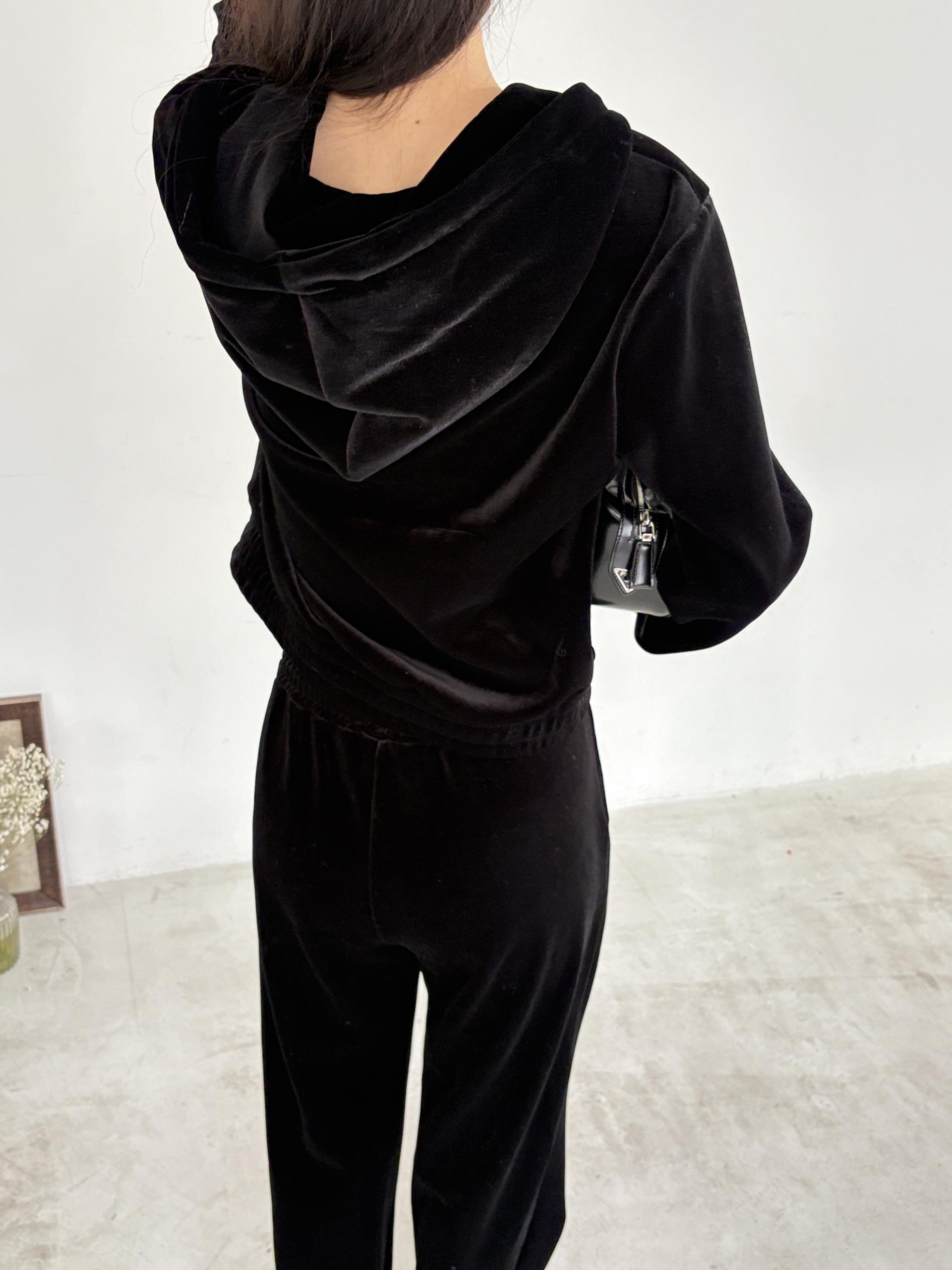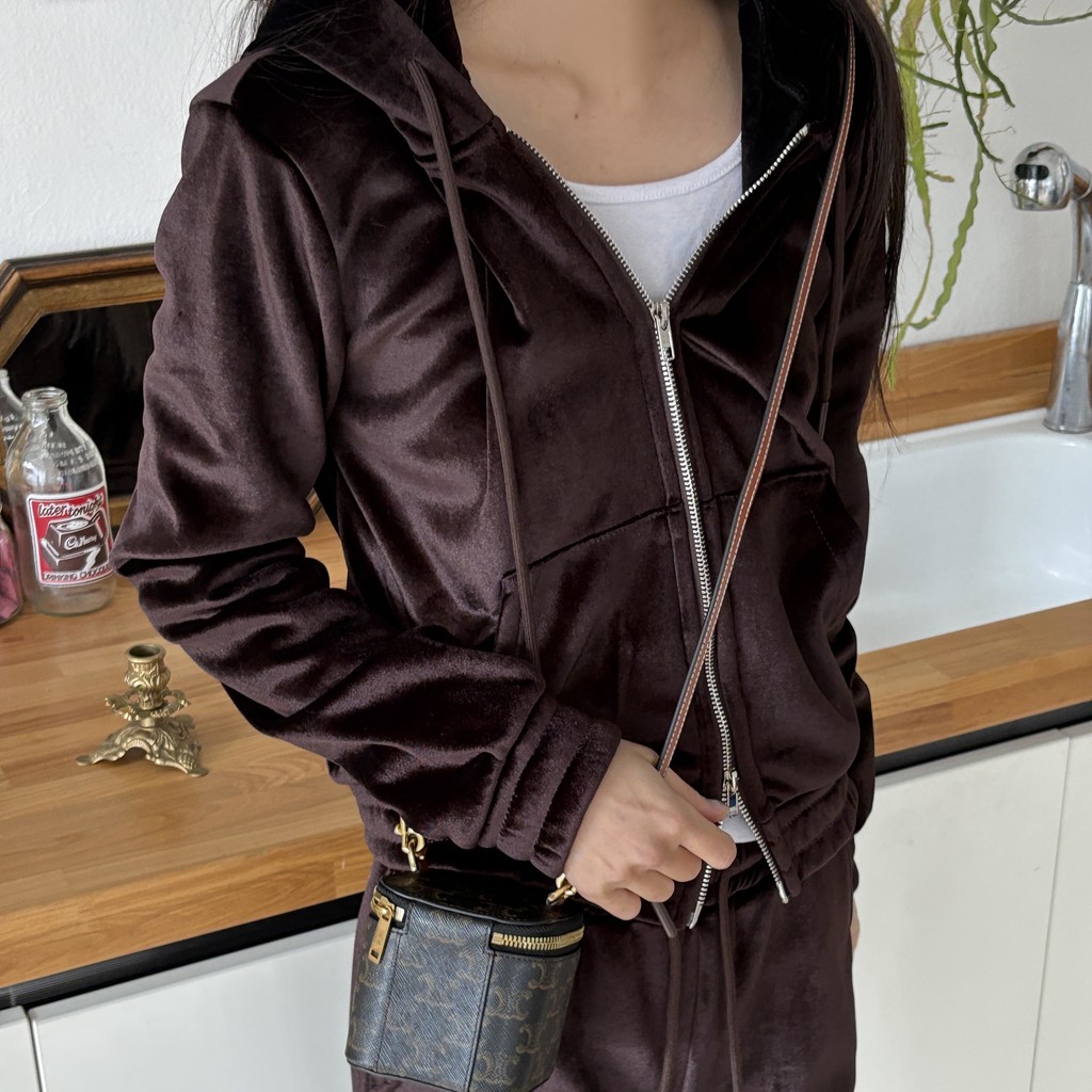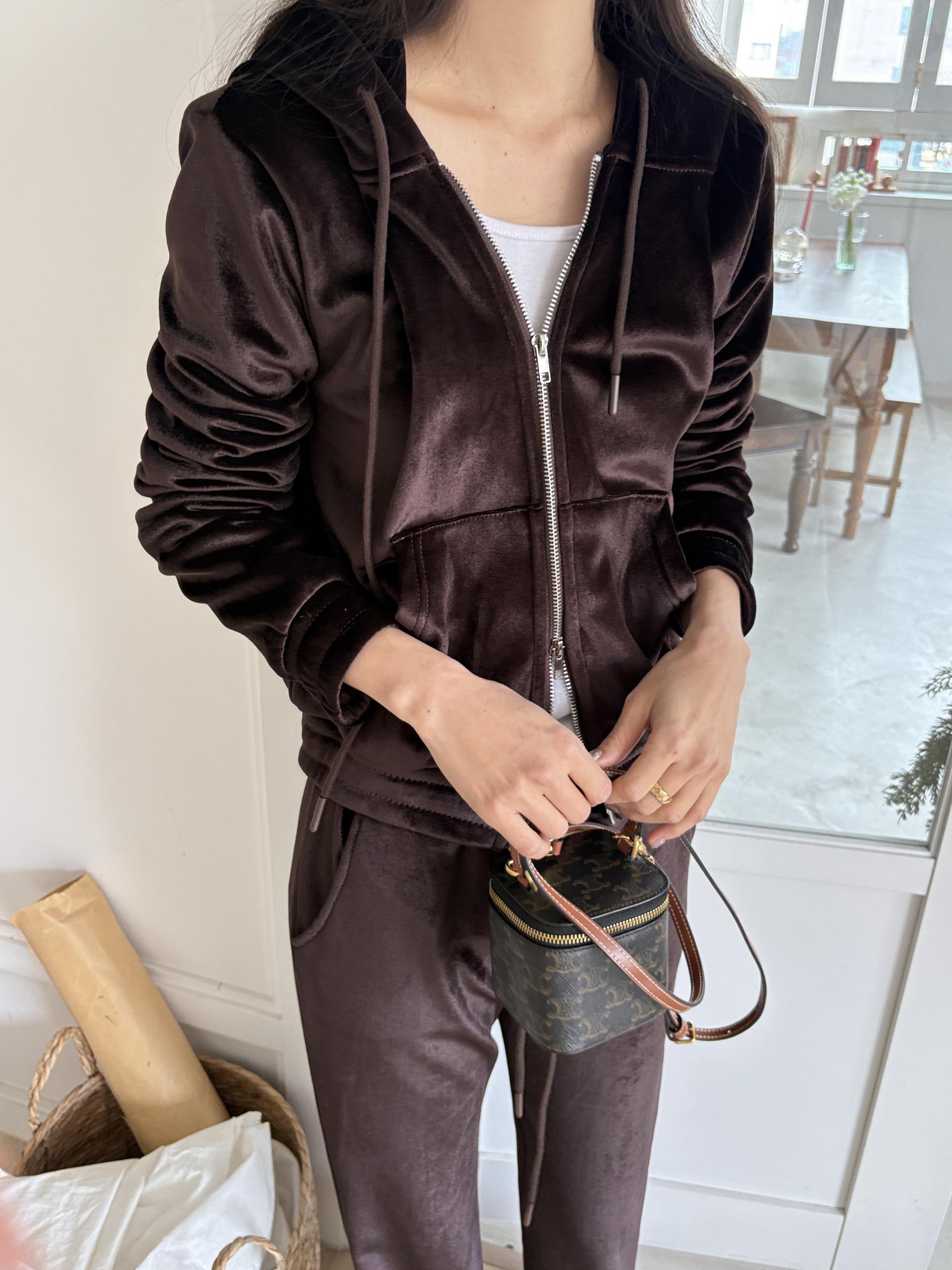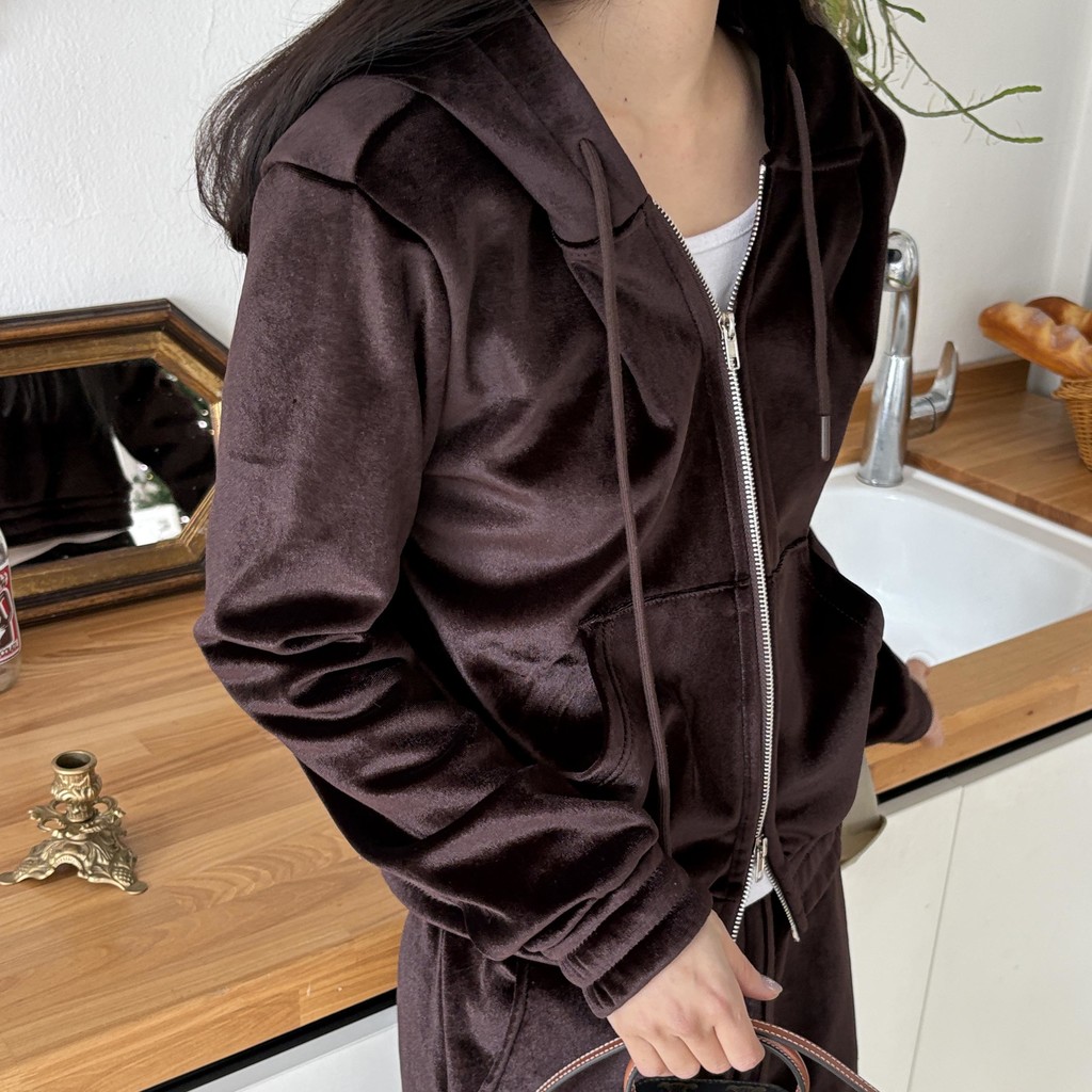 부드럽게 흐르는 벨벳 소재로 제작된 후드 집업입니다.