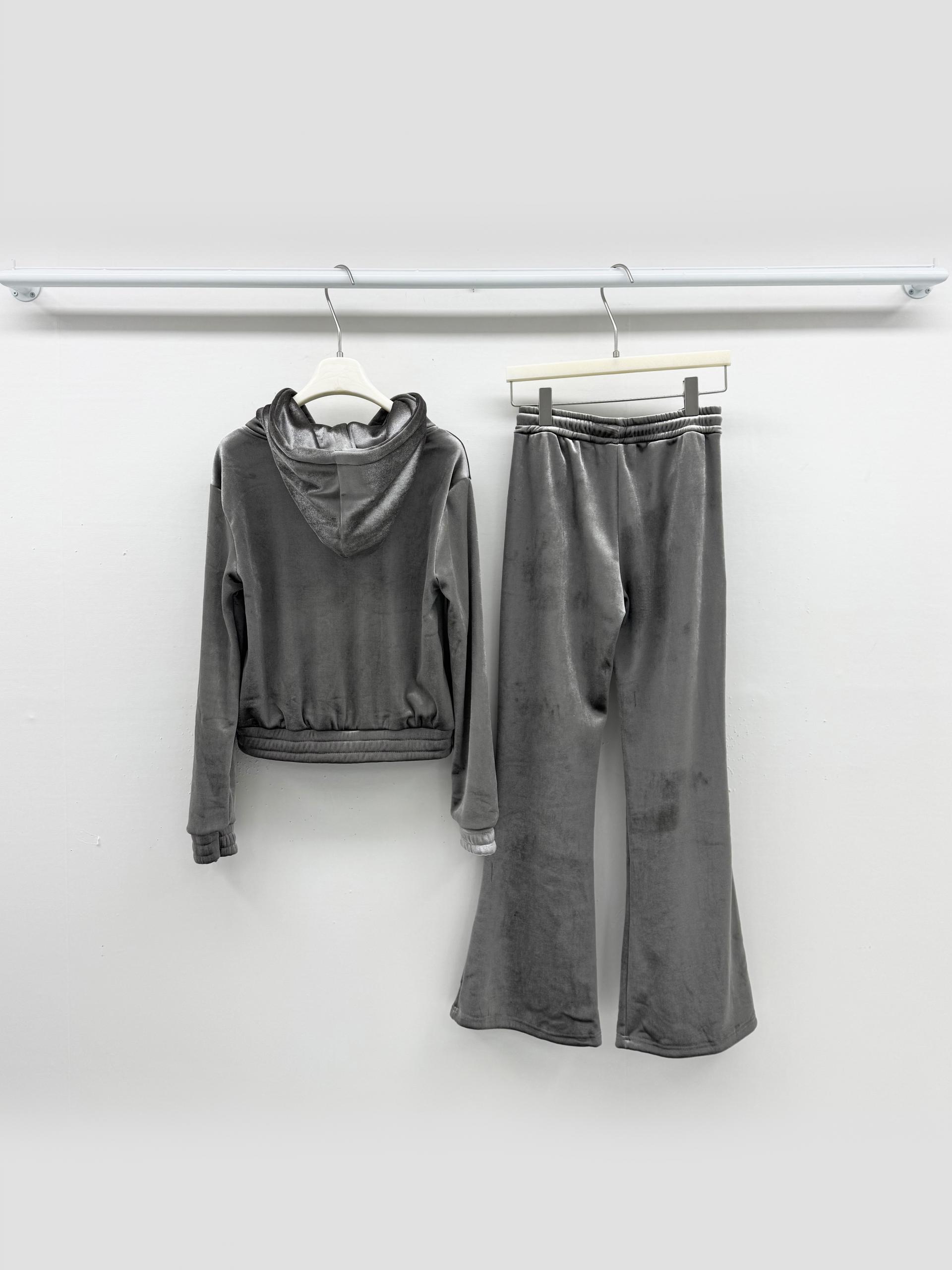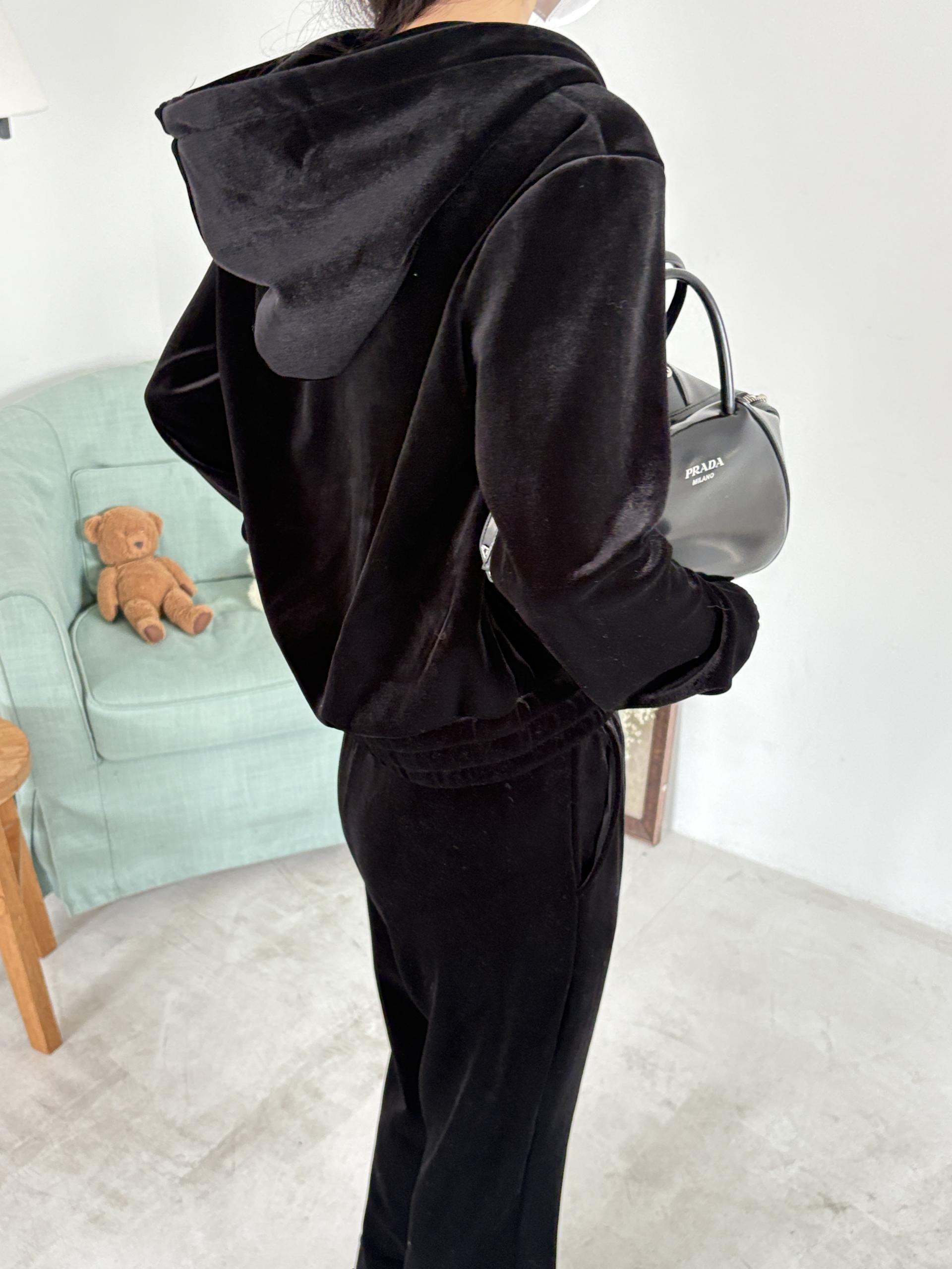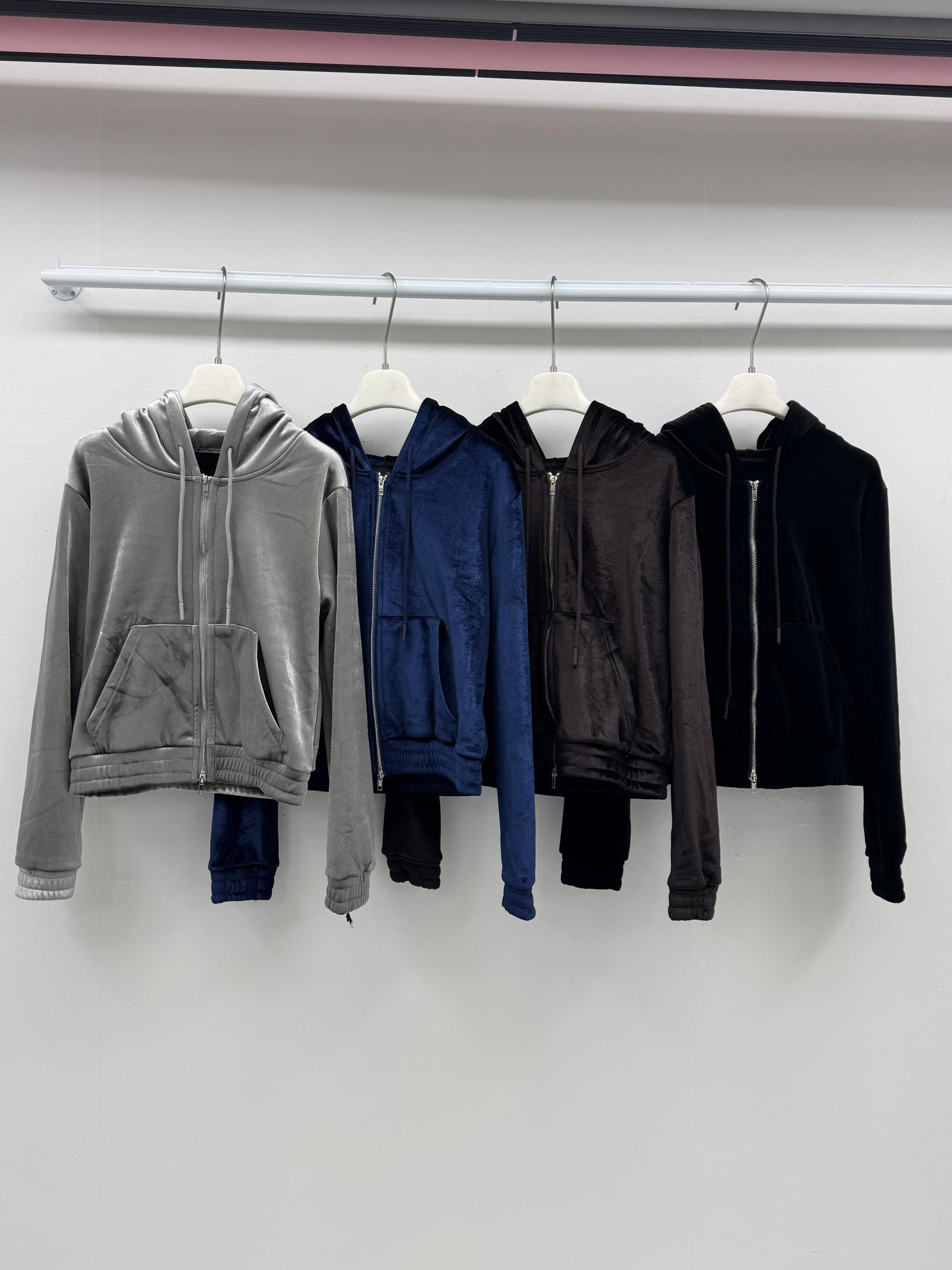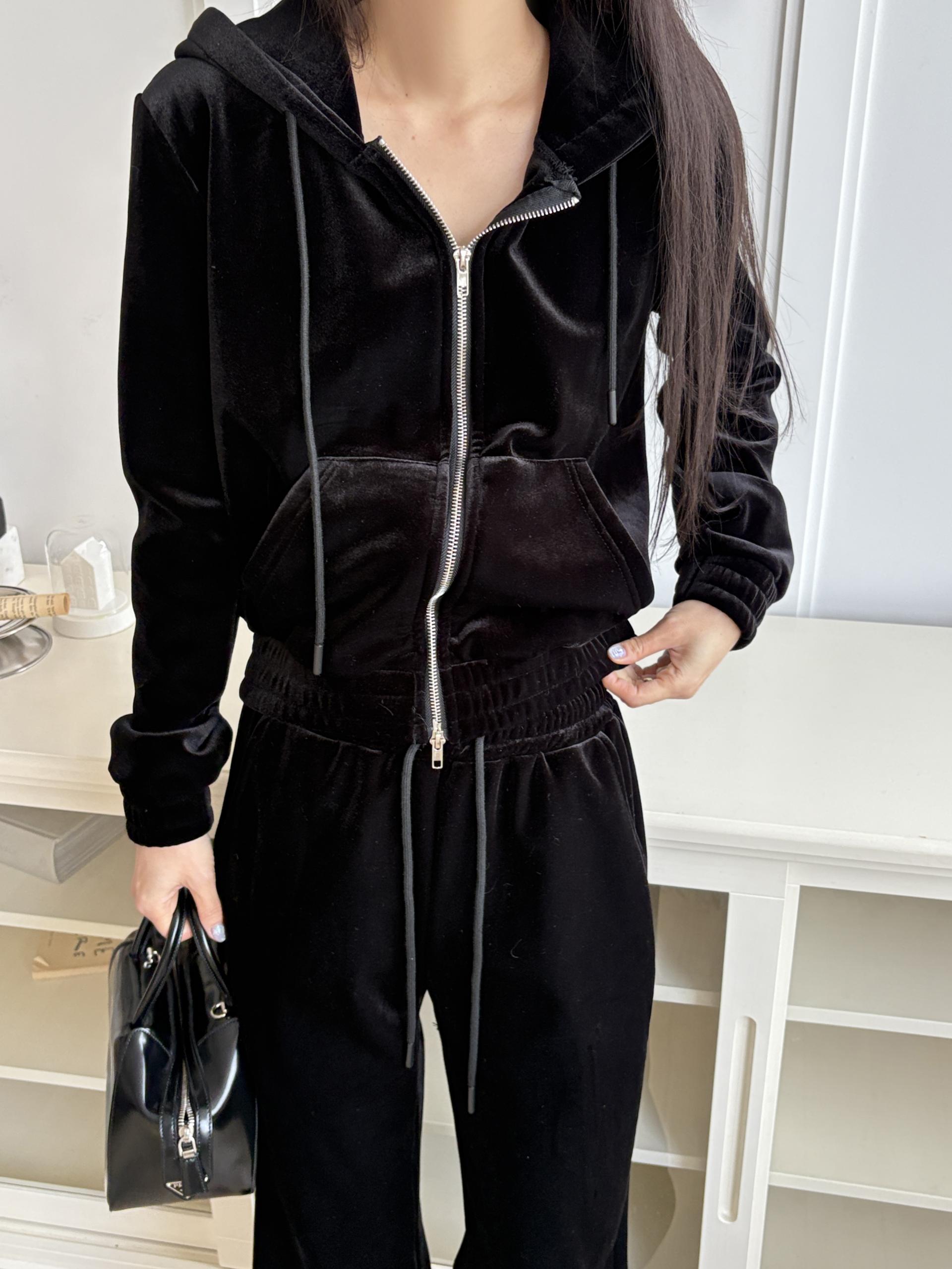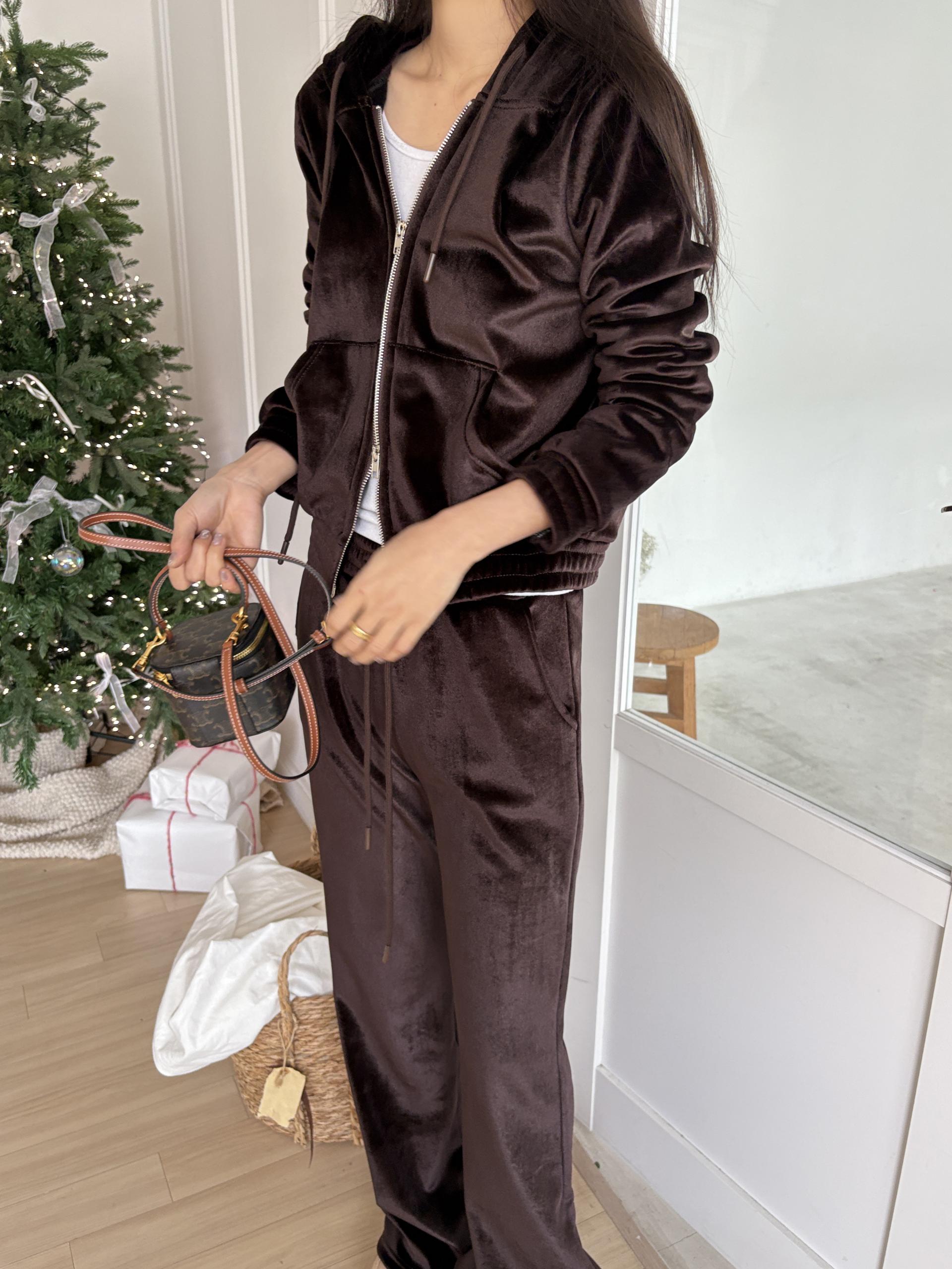 부드럽게 흐르는 벨벳 소재로 제작된 후드 집업입니다.