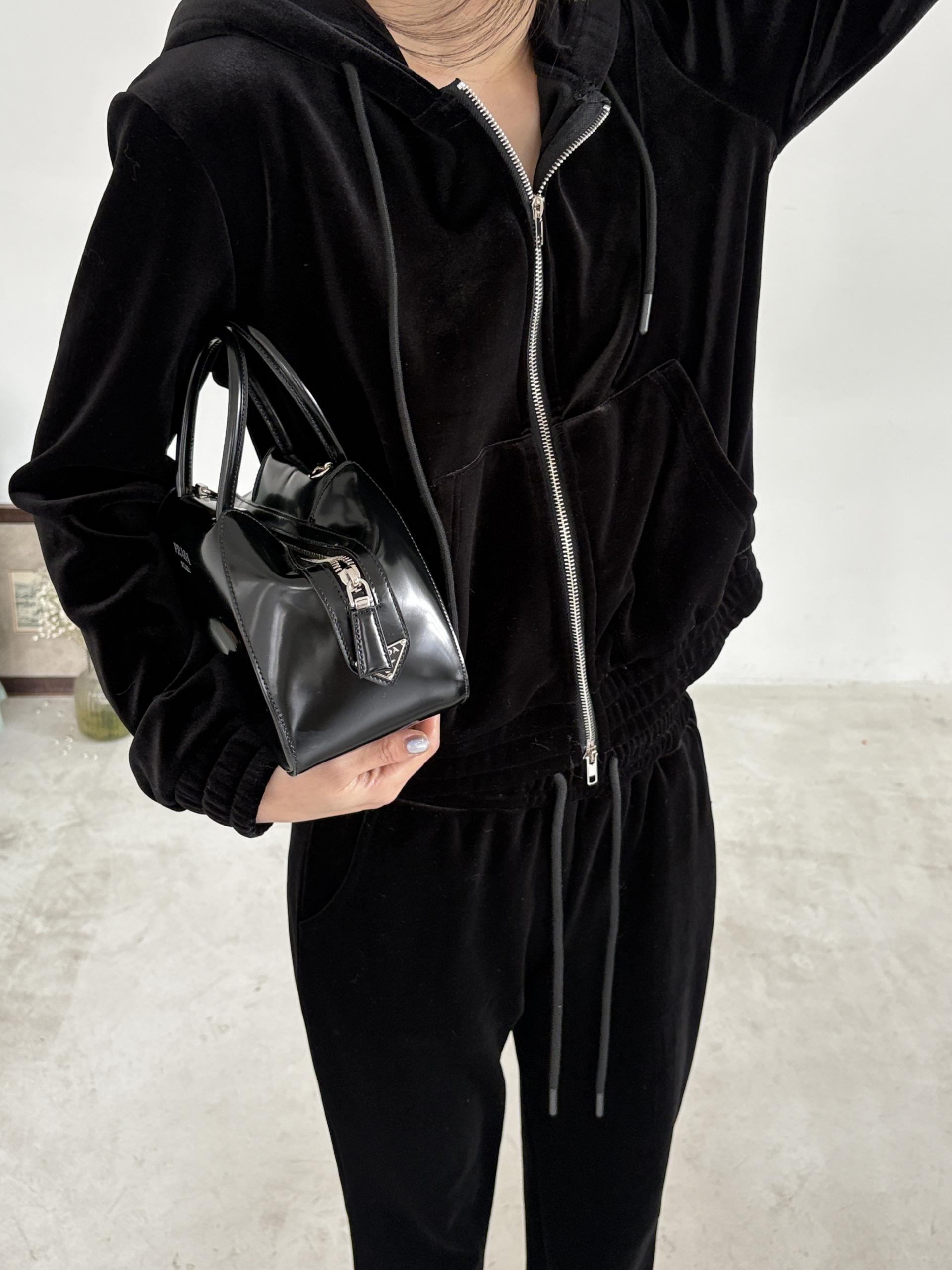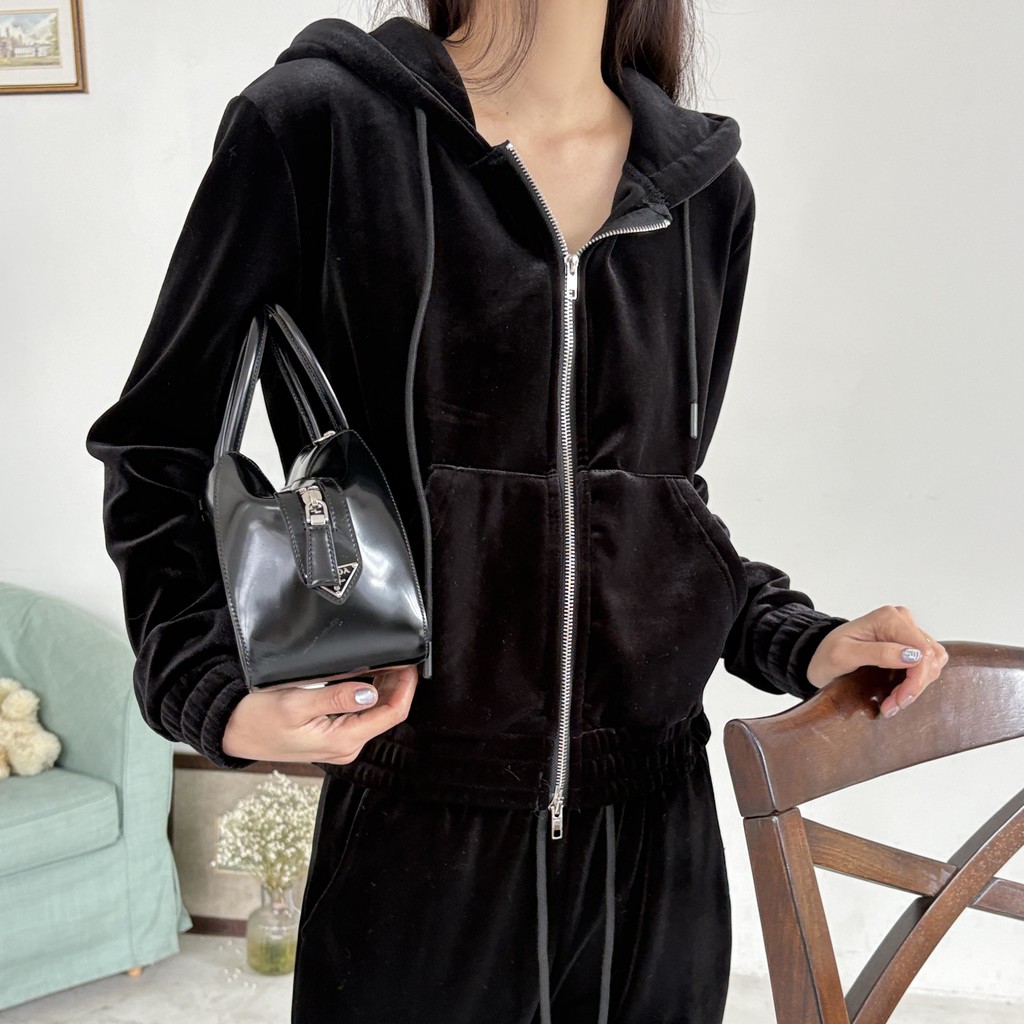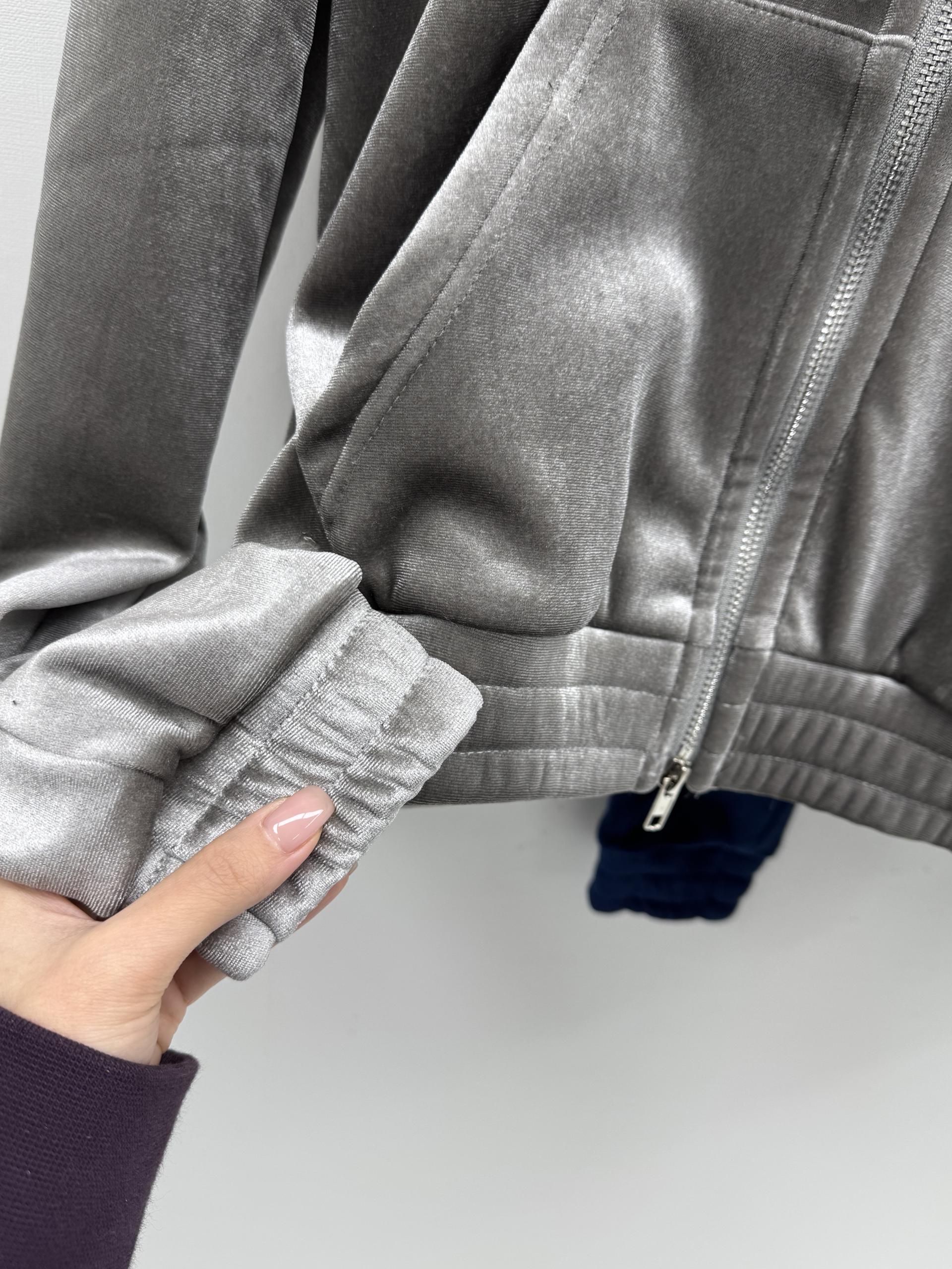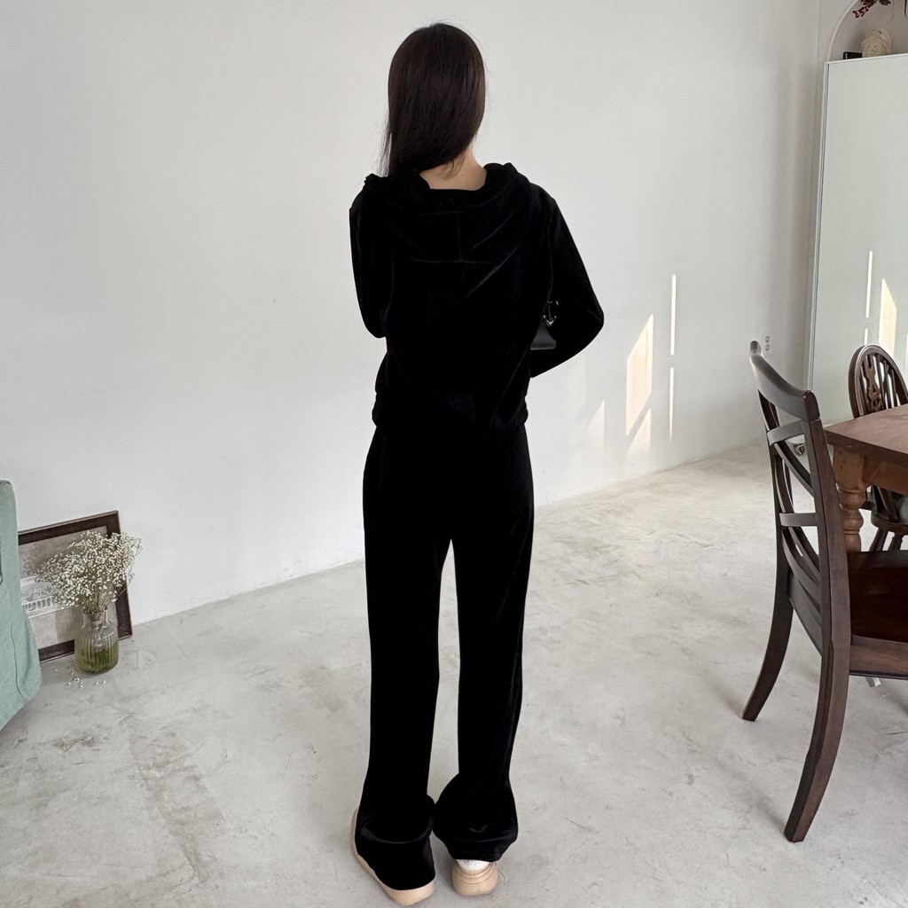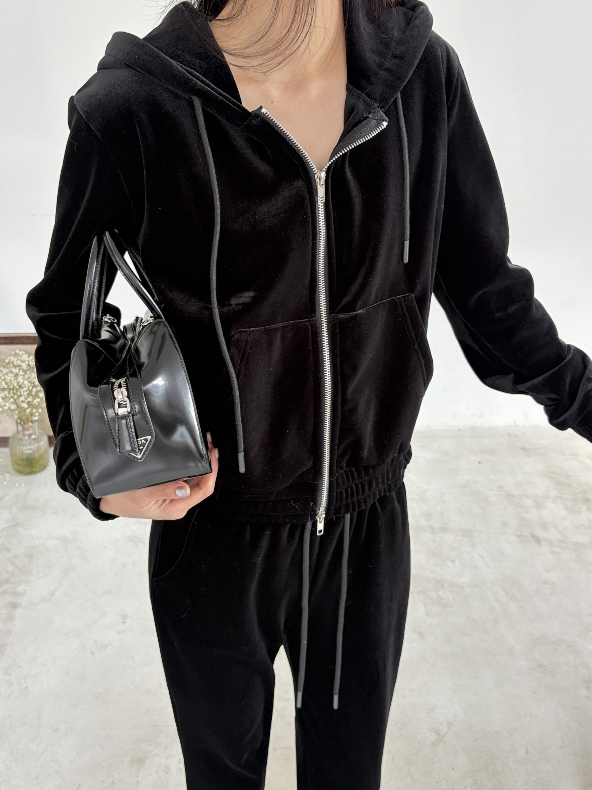 부드럽게 흐르는 벨벳 소재로 제작된 후드 집업입니다.