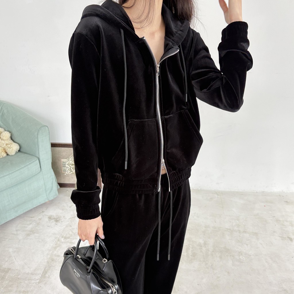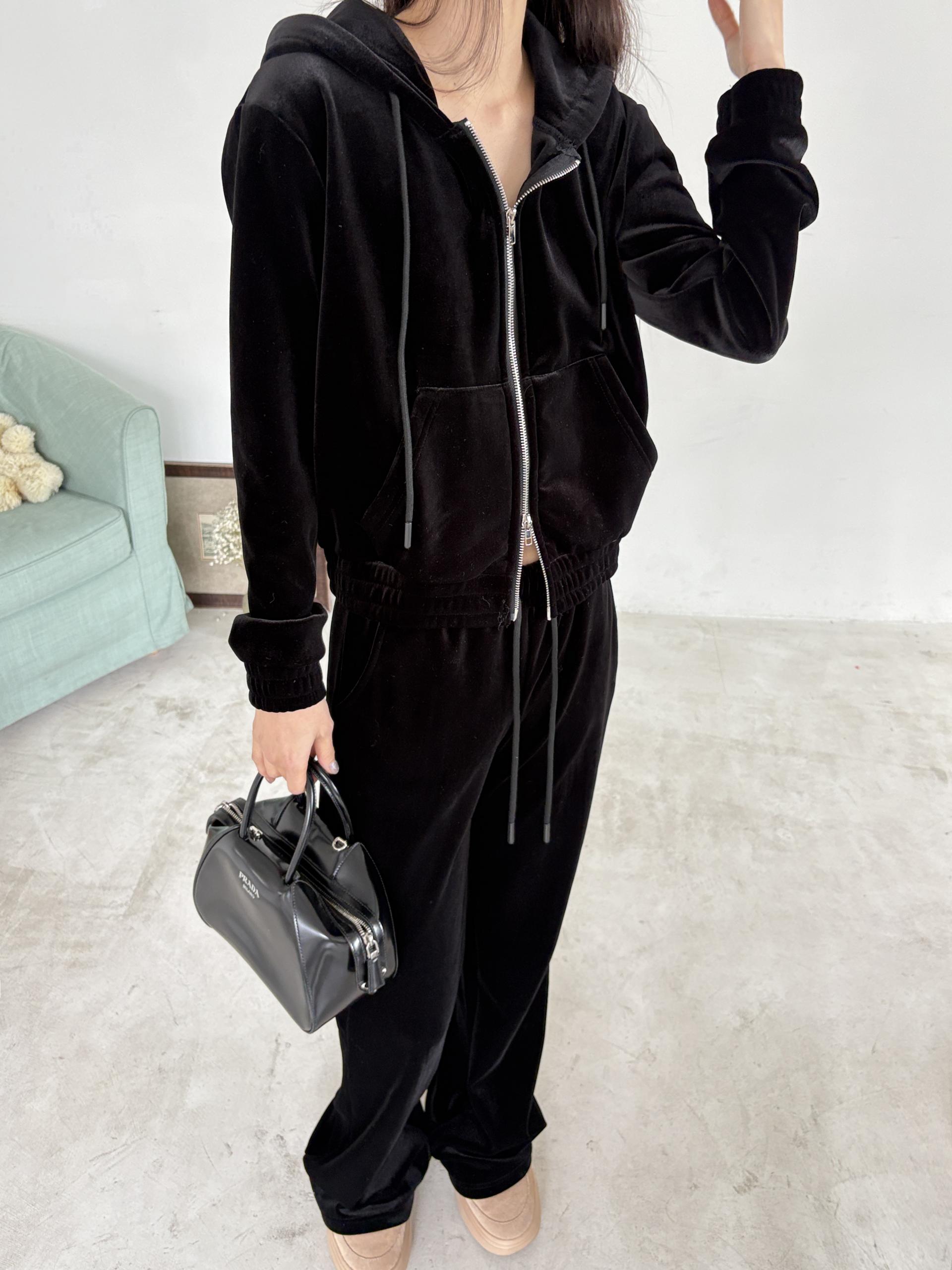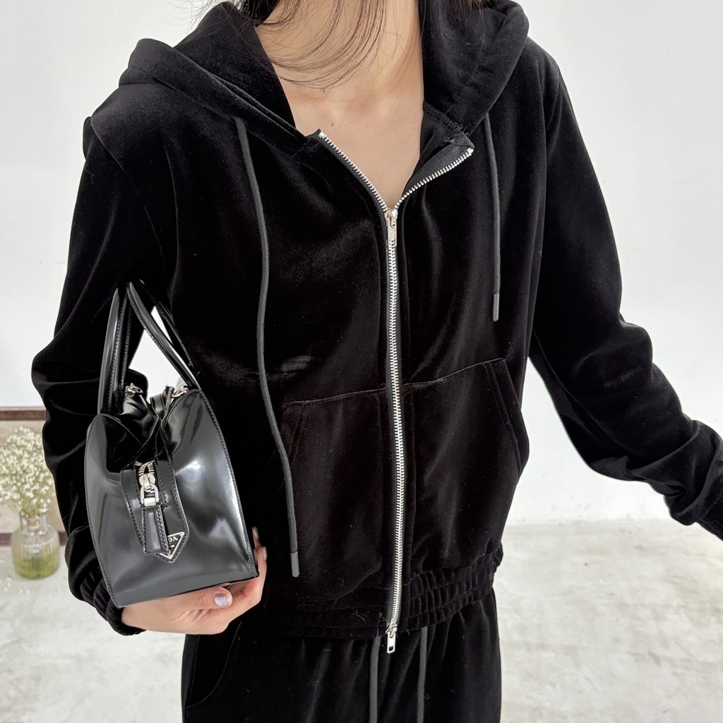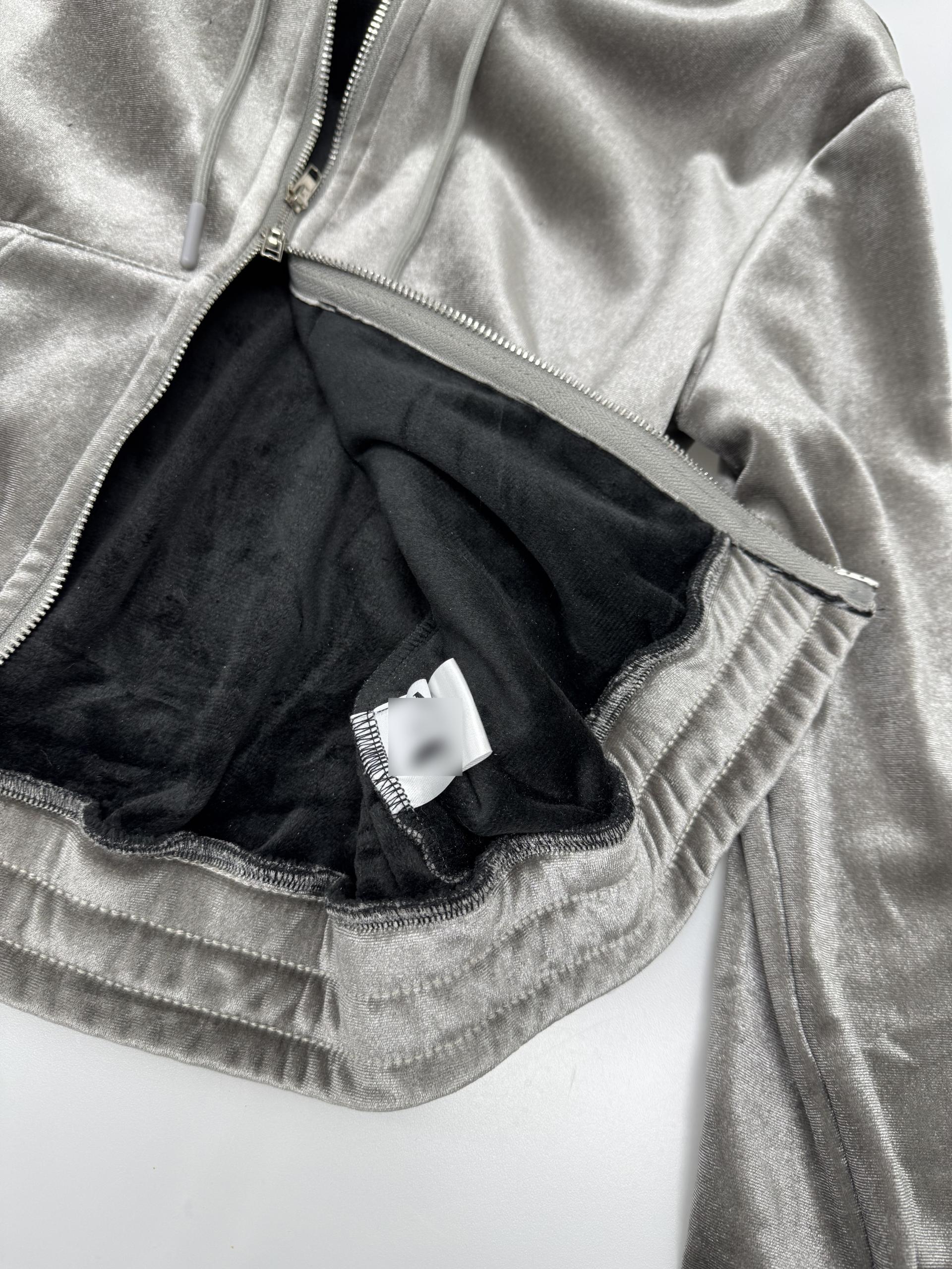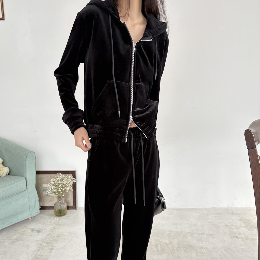 부드럽게 흐르는 벨벳 소재로 제작된 후드 집업입니다.