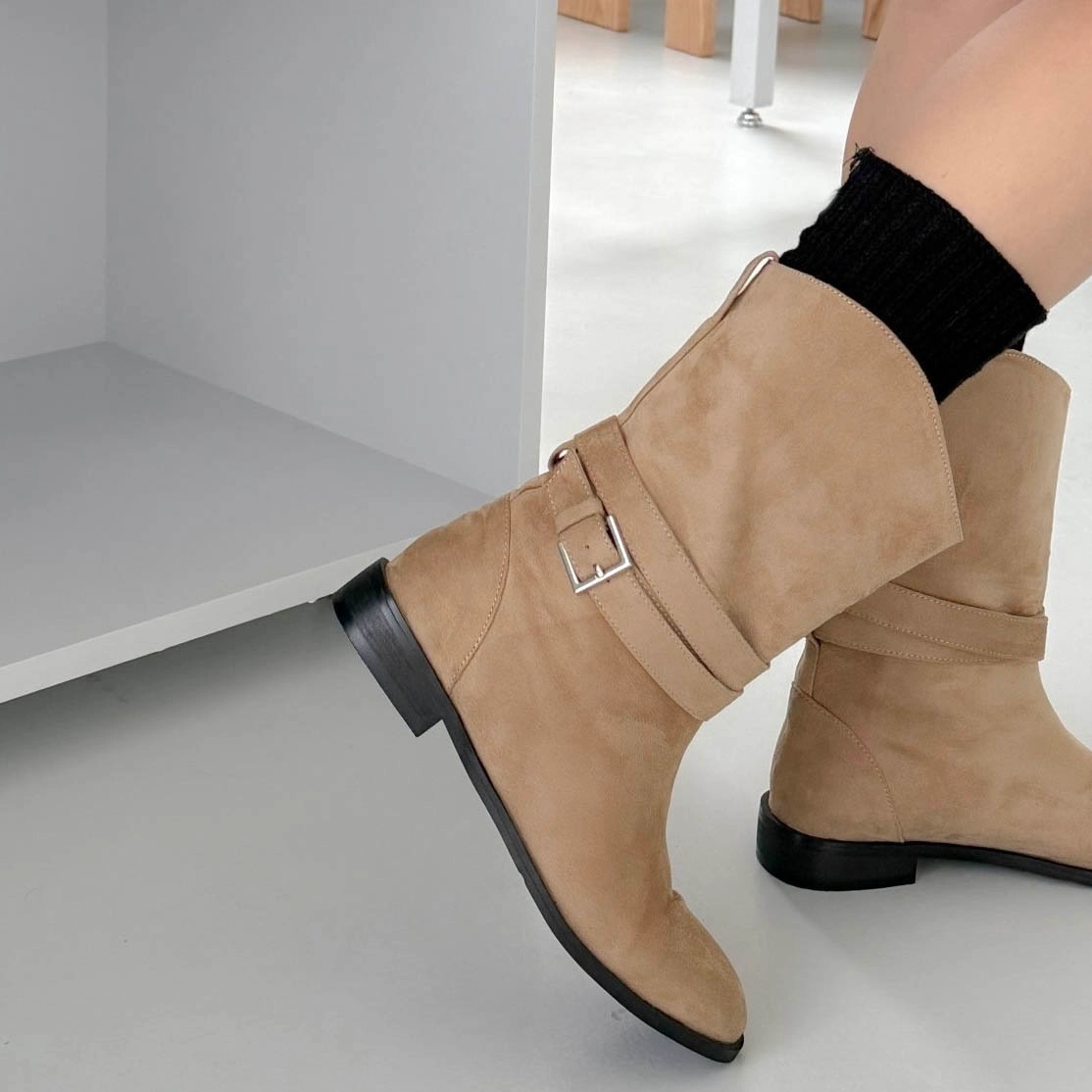 벨트 라운드토 레더 스웨이드 가을 2.5cm 로우힐 미들 통부츠 | 2color