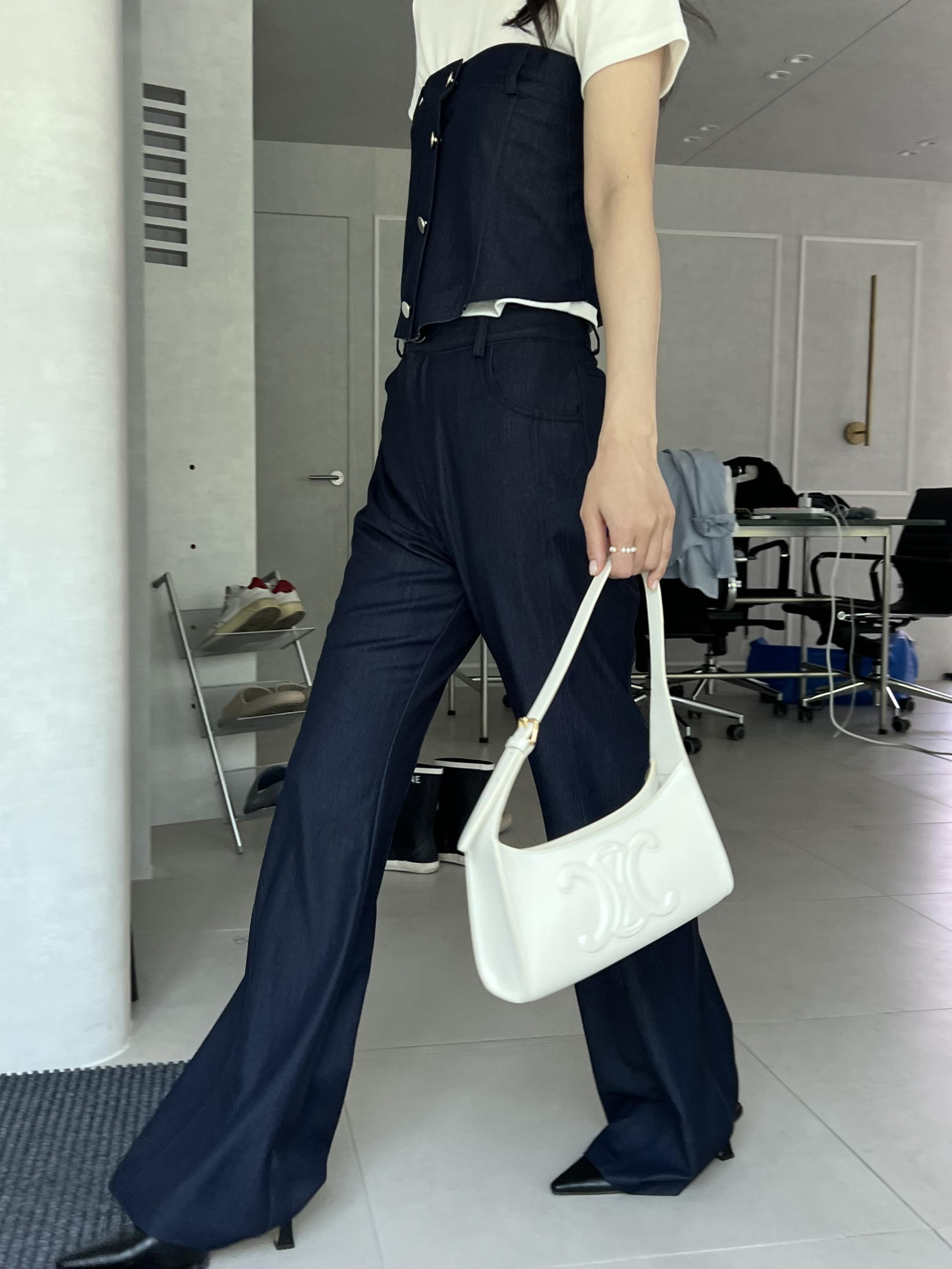 뒷 절개 라인이 하체를 볼륨감 있게 잡아주고, 하이웨스트 밑위에 슬림하게 떨어지는 부츠컷 핏으로 굉장히 날씬하면서 다리가 길어 보이는 팬츠에요. 기장 자체도 매우 긴 편이라 하이힐과 같이 롱 한 매력을 살려 착용하시거나 어느 정도 수선해 주셔도 좋아요.