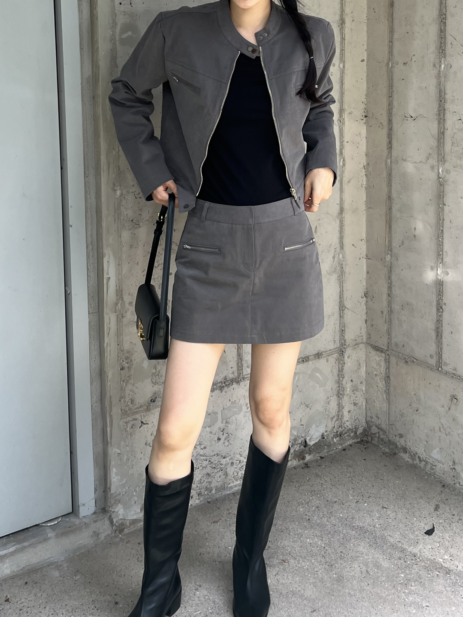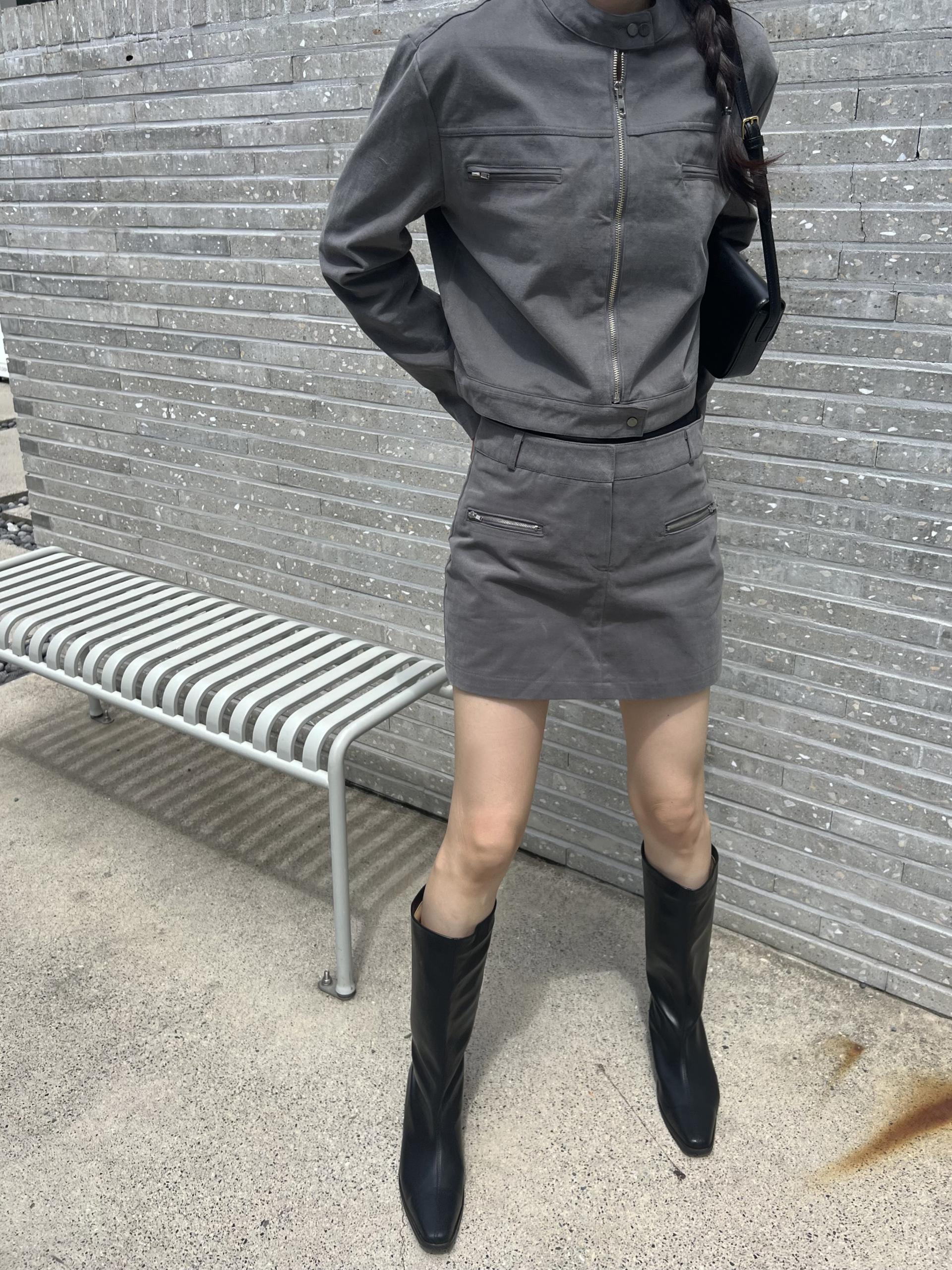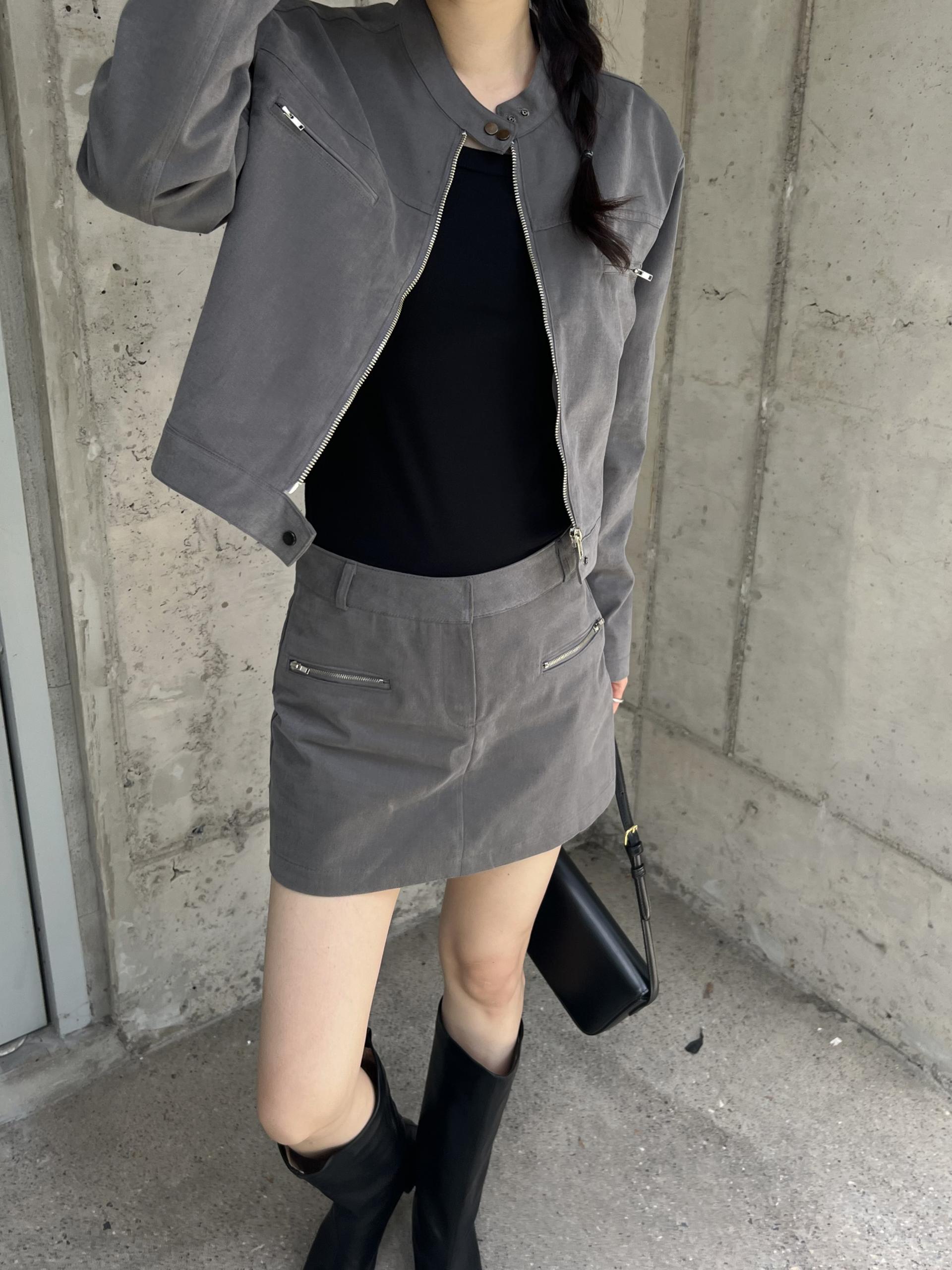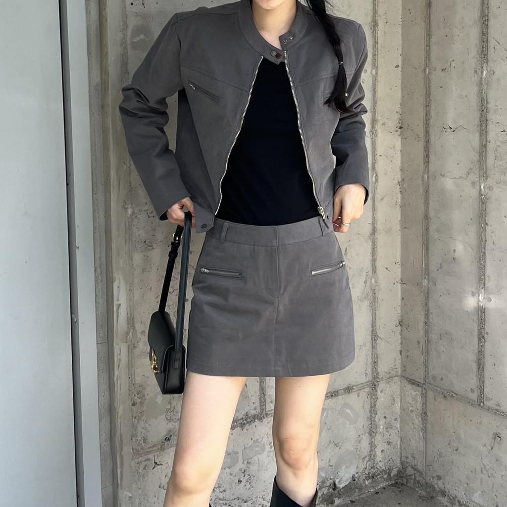 스웨이드 느낌이 나도록 피치 가공된 아주 빳빳한 코튼 소재이며, 셋업으로 입으면 하의가 치마바지라 중성적인 매력 안에서도 여성스러운 느낌을 살릴 수 있어 좋았어요. 미니 기장으로 부츠와 함께 코디했을 때 더욱 멋스럽고 완성도 있는 스타일링이 되실 거예요.