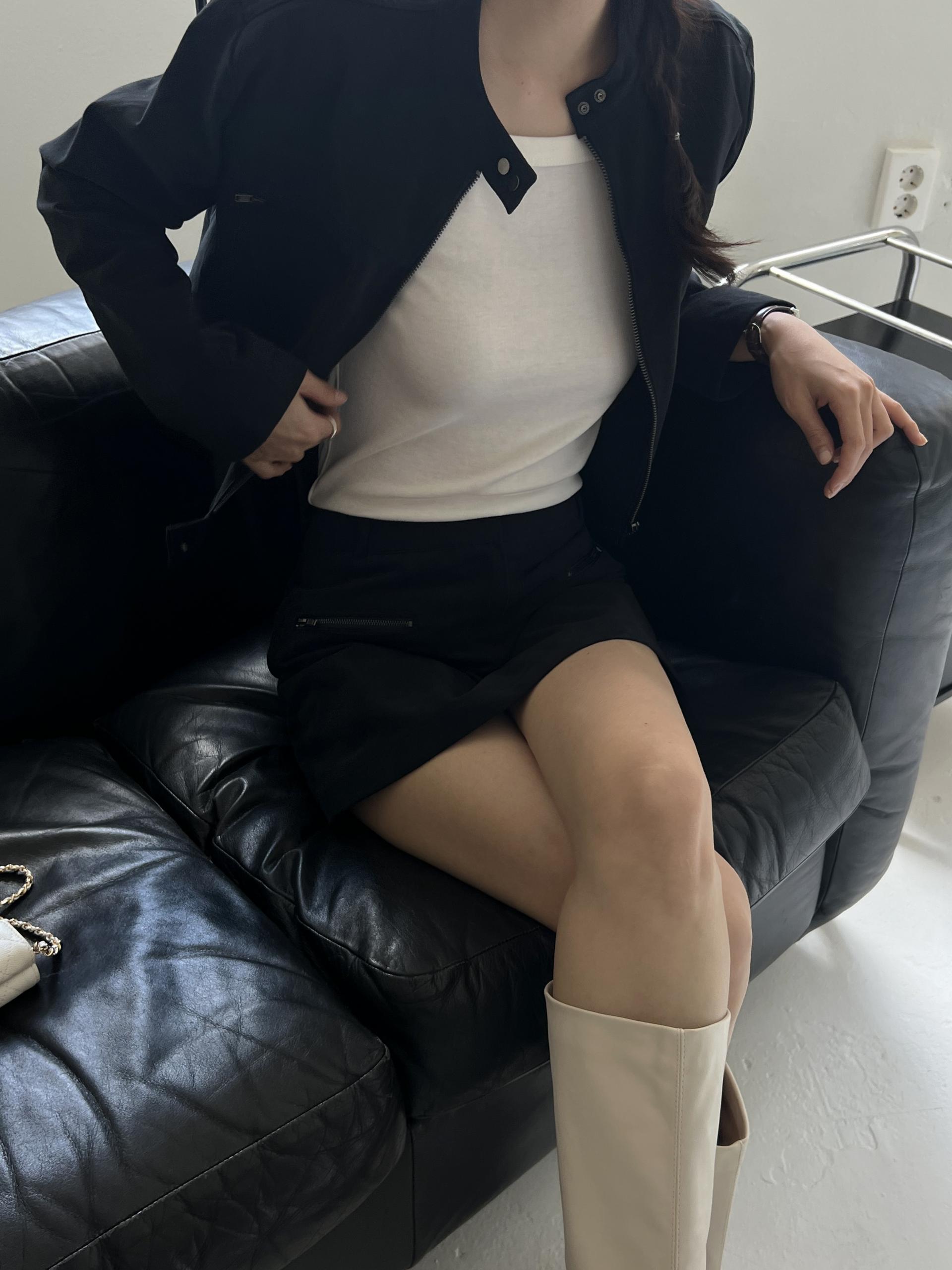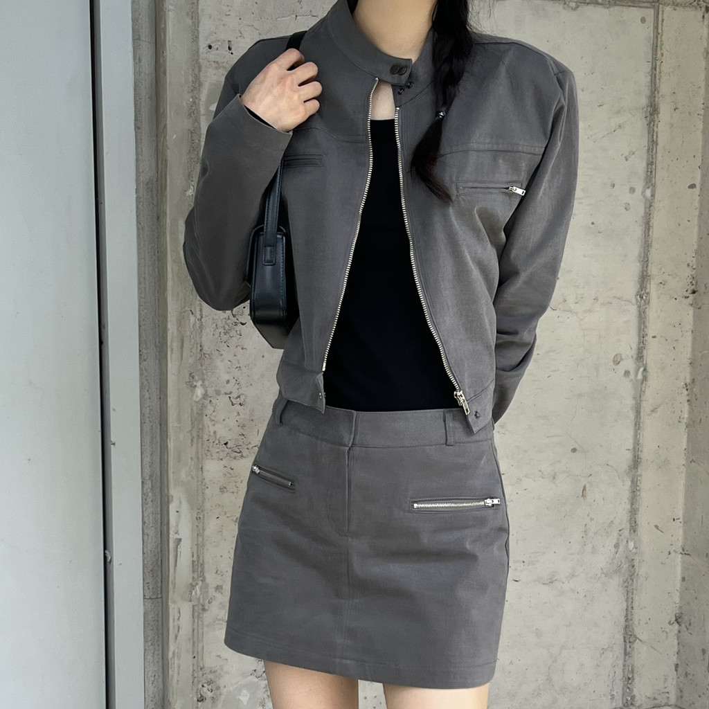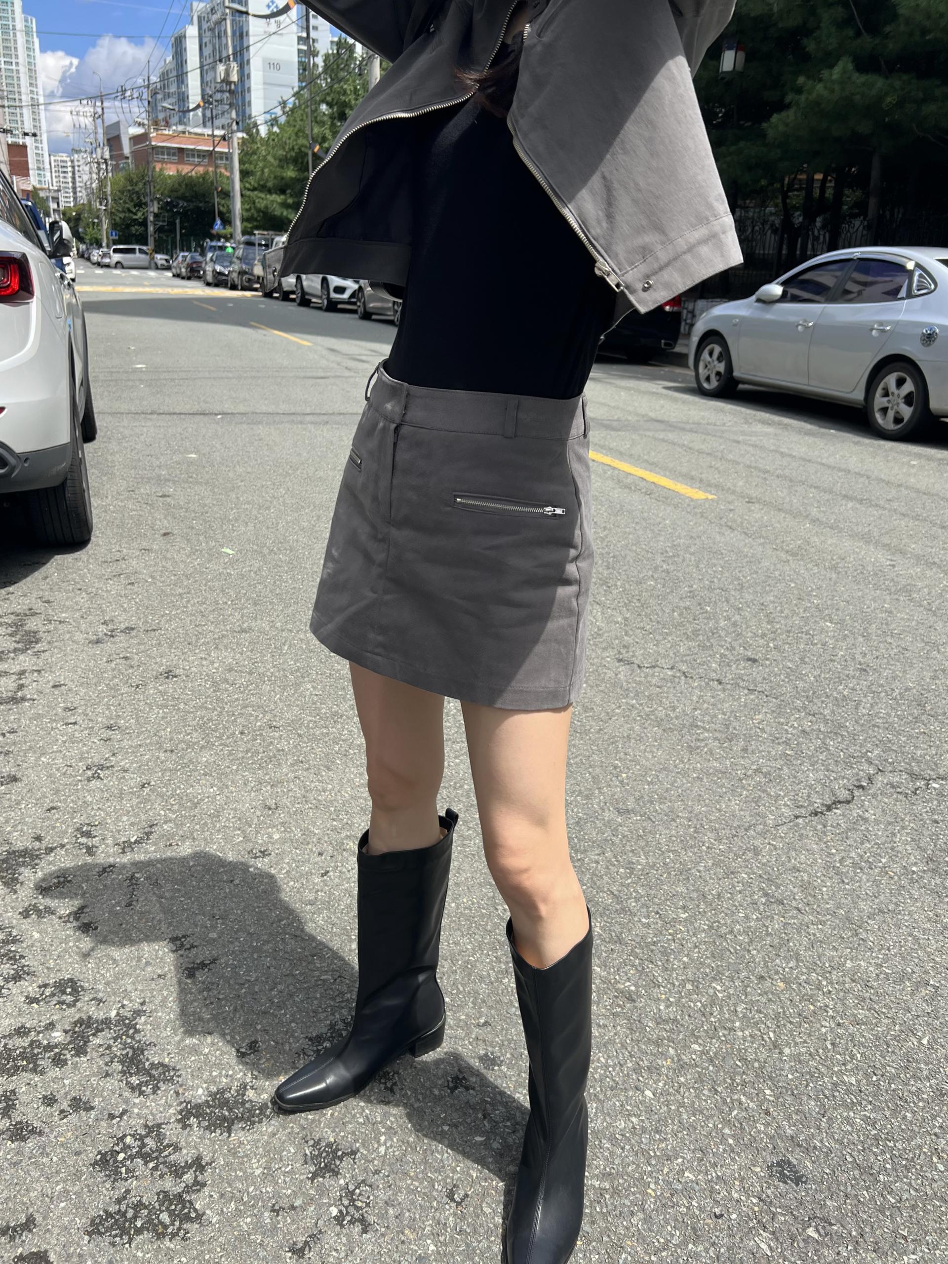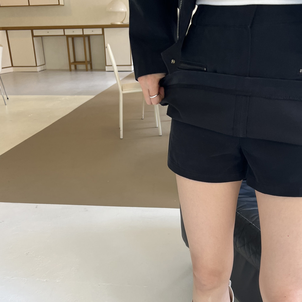 스웨이드 느낌이 나도록 피치 가공된 아주 빳빳한 코튼 소재이며, 셋업으로 입으면 하의가 치마바지라 중성적인 매력 안에서도 여성스러운 느낌을 살릴 수 있어 좋았어요. 미니 기장으로 부츠와 함께 코디했을 때 더욱 멋스럽고 완성도 있는 스타일링이 되실 거예요.