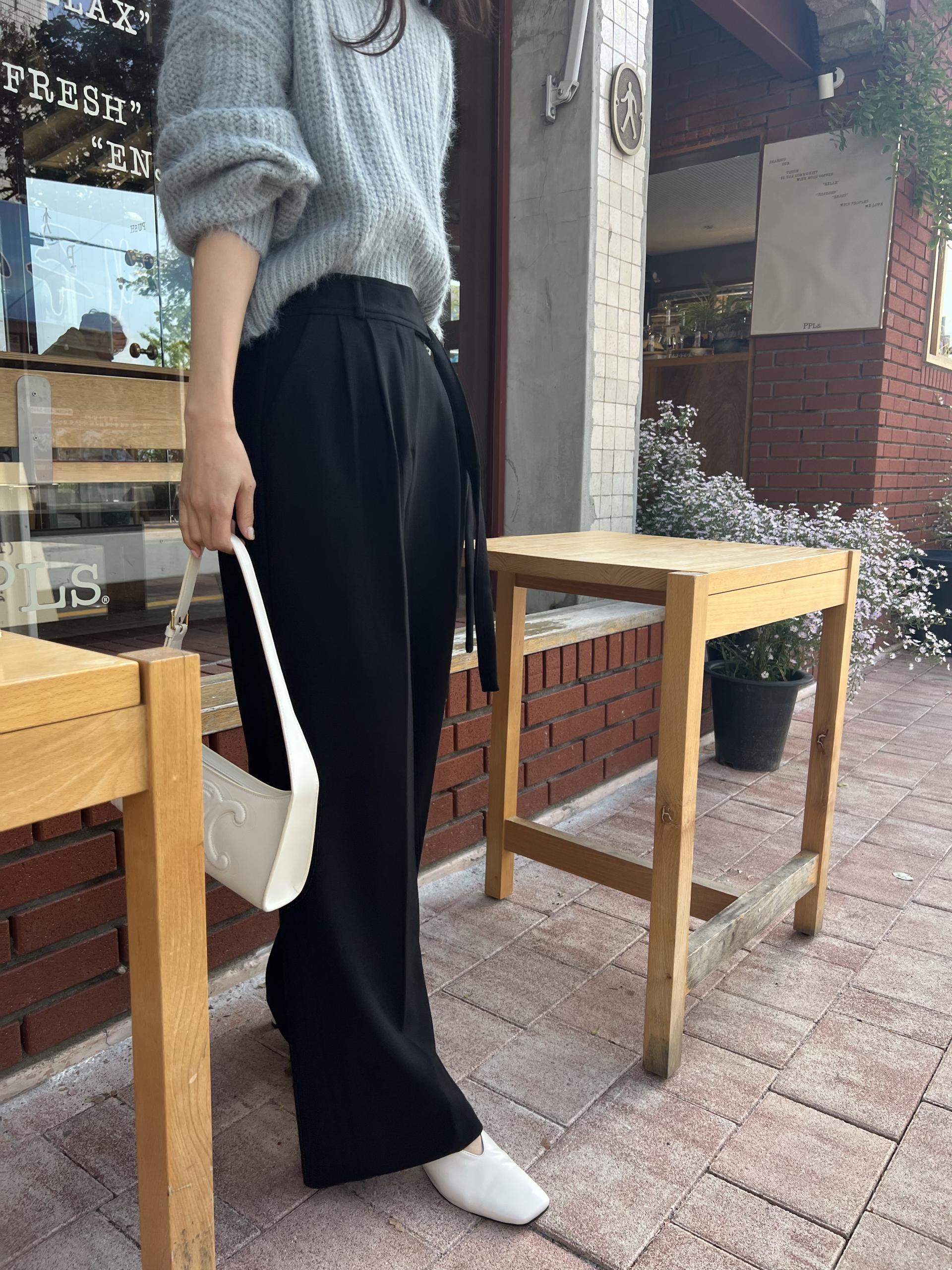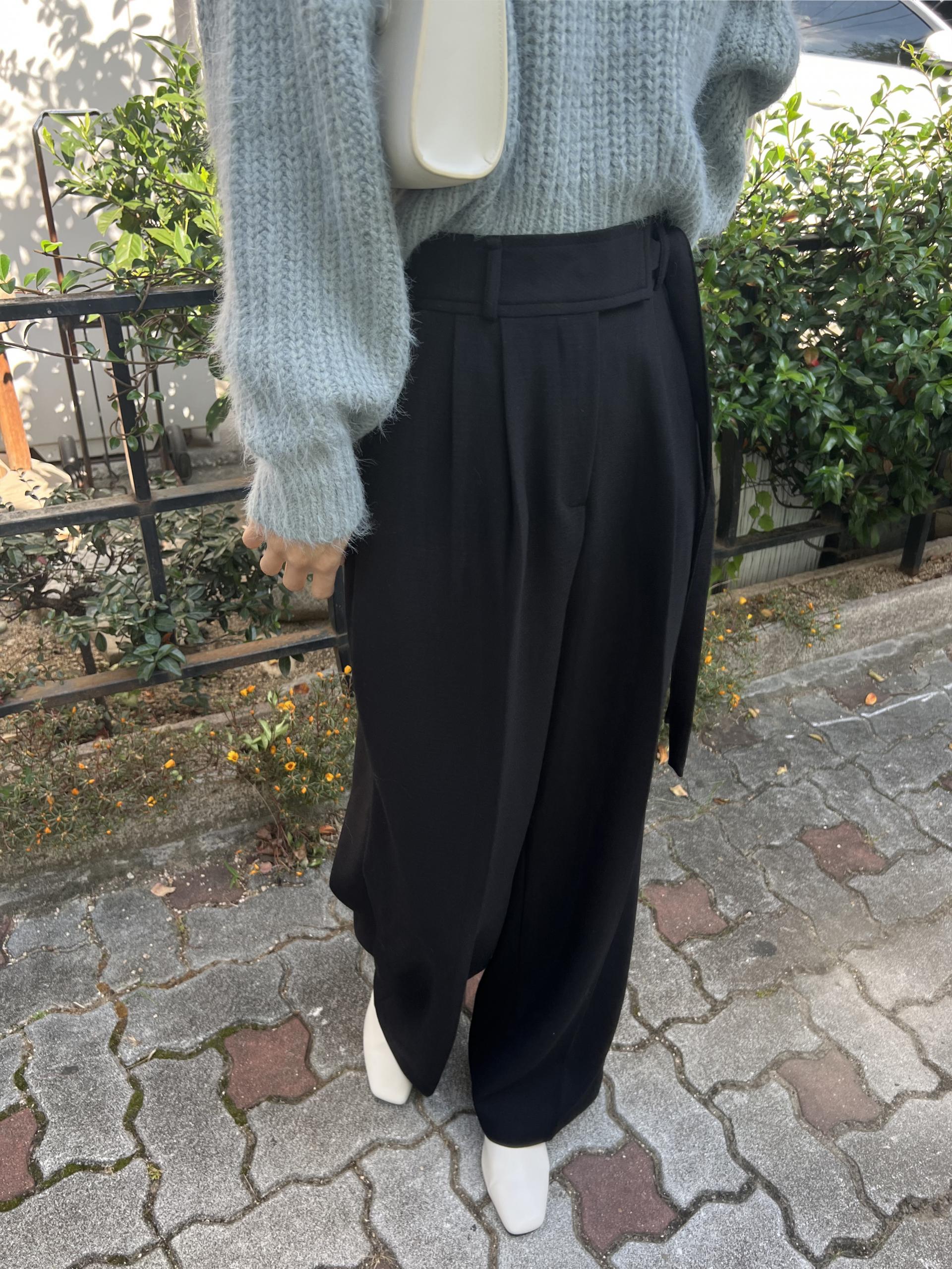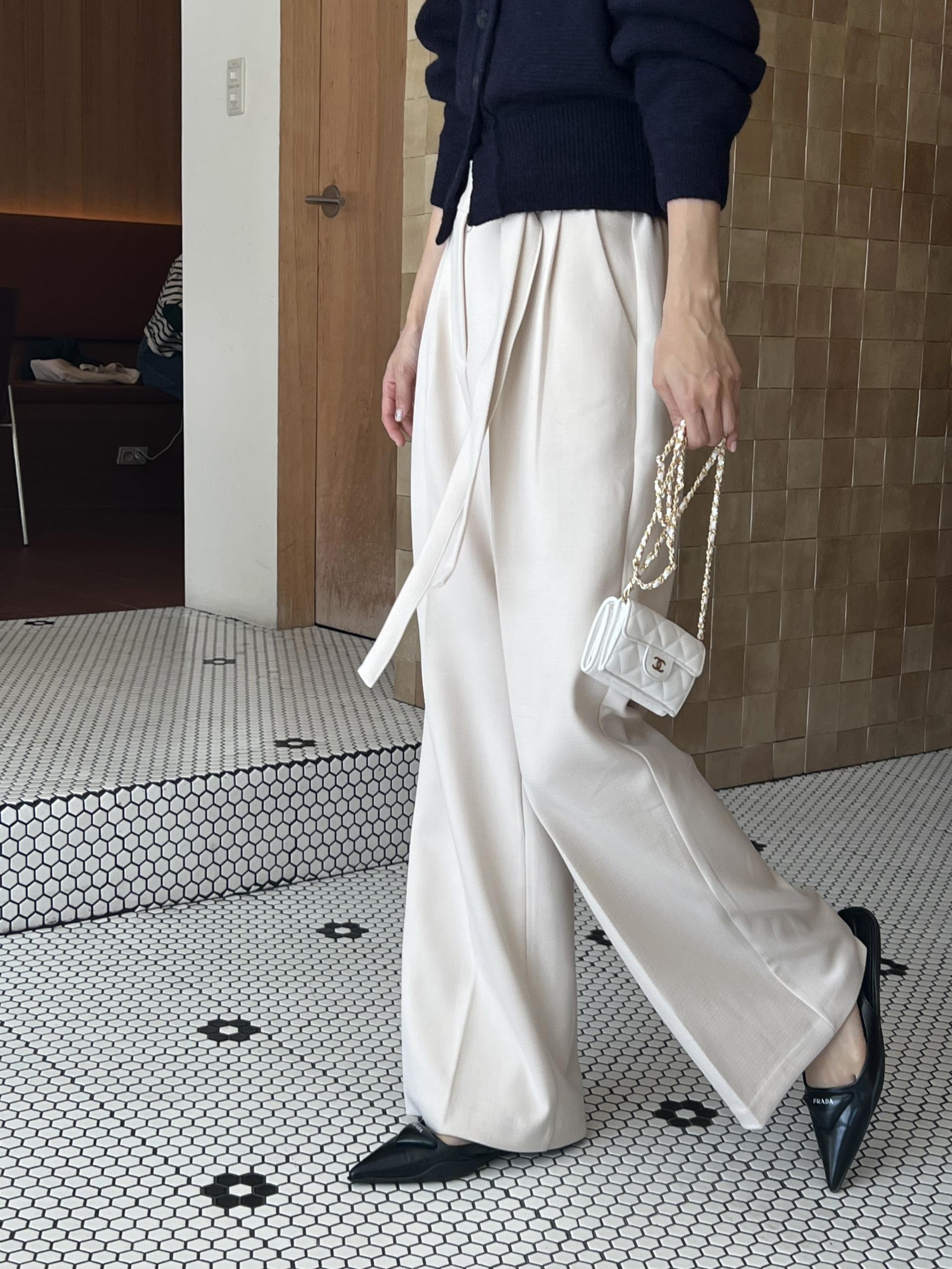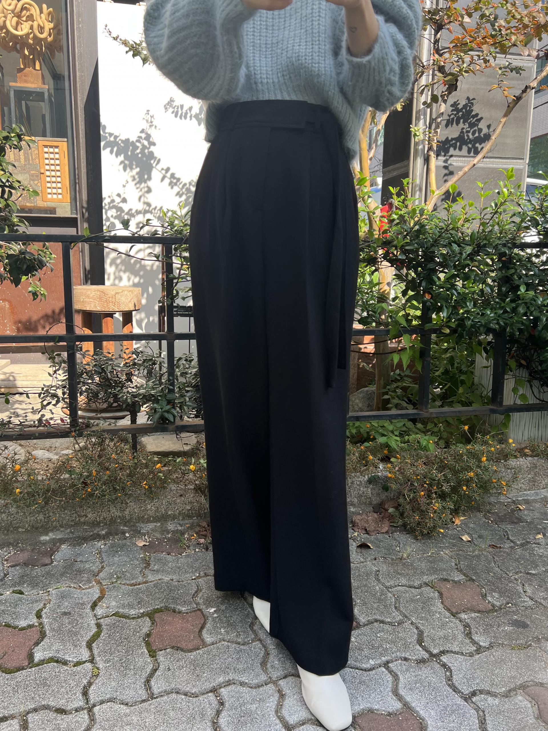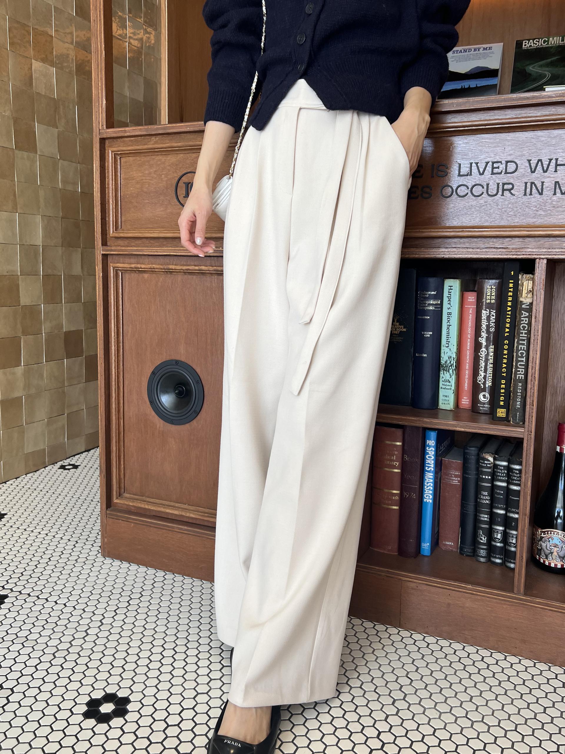웨이스트 밴드의 디테일이 특히 예쁜 팬츠에요. 사이드에 스트랩을 묶을 수 있는 디테일이 있어 심플한 상의를 착용해도 센스 있는 코디가 되는 것 같아 좋았어요.