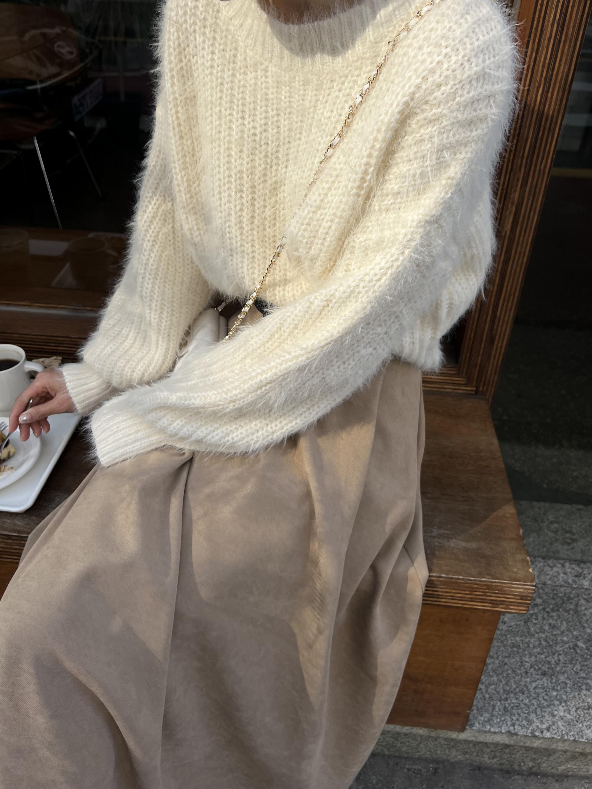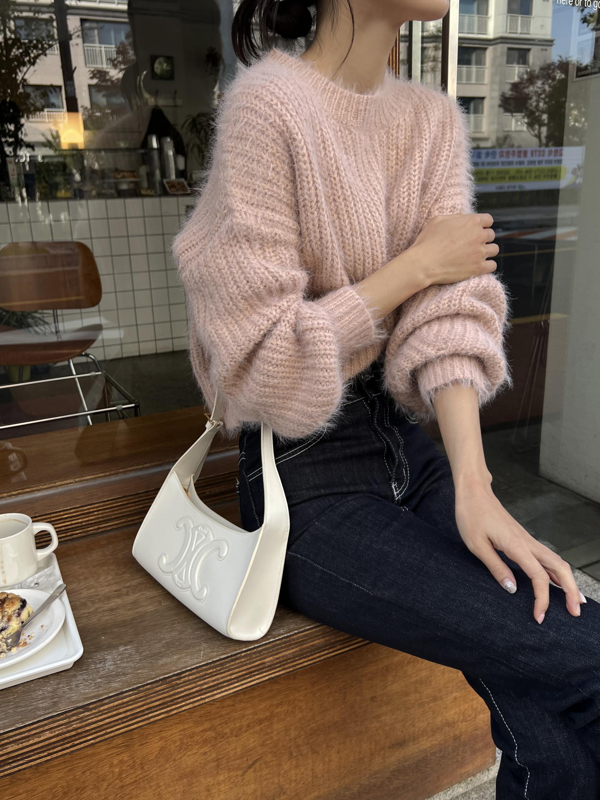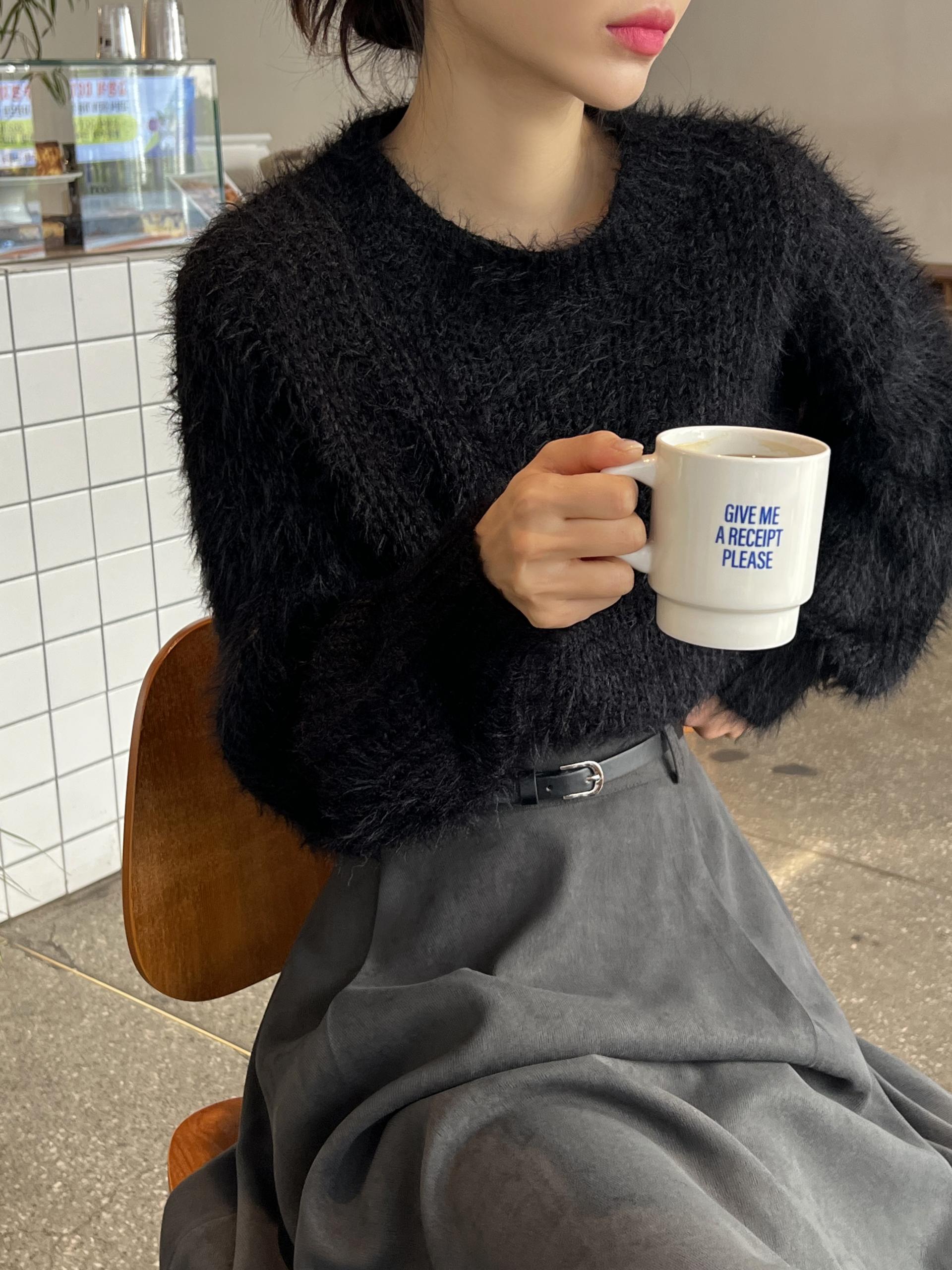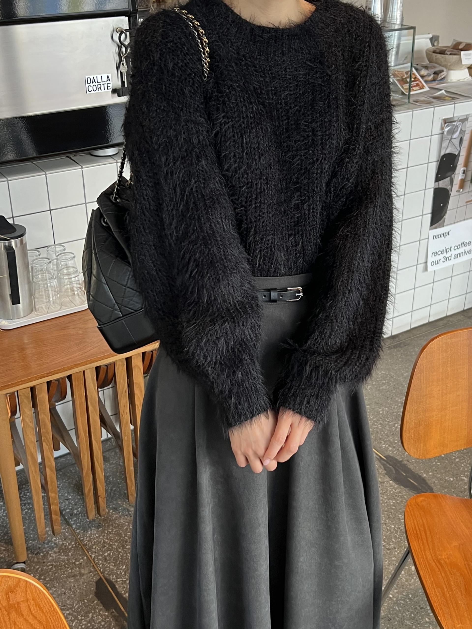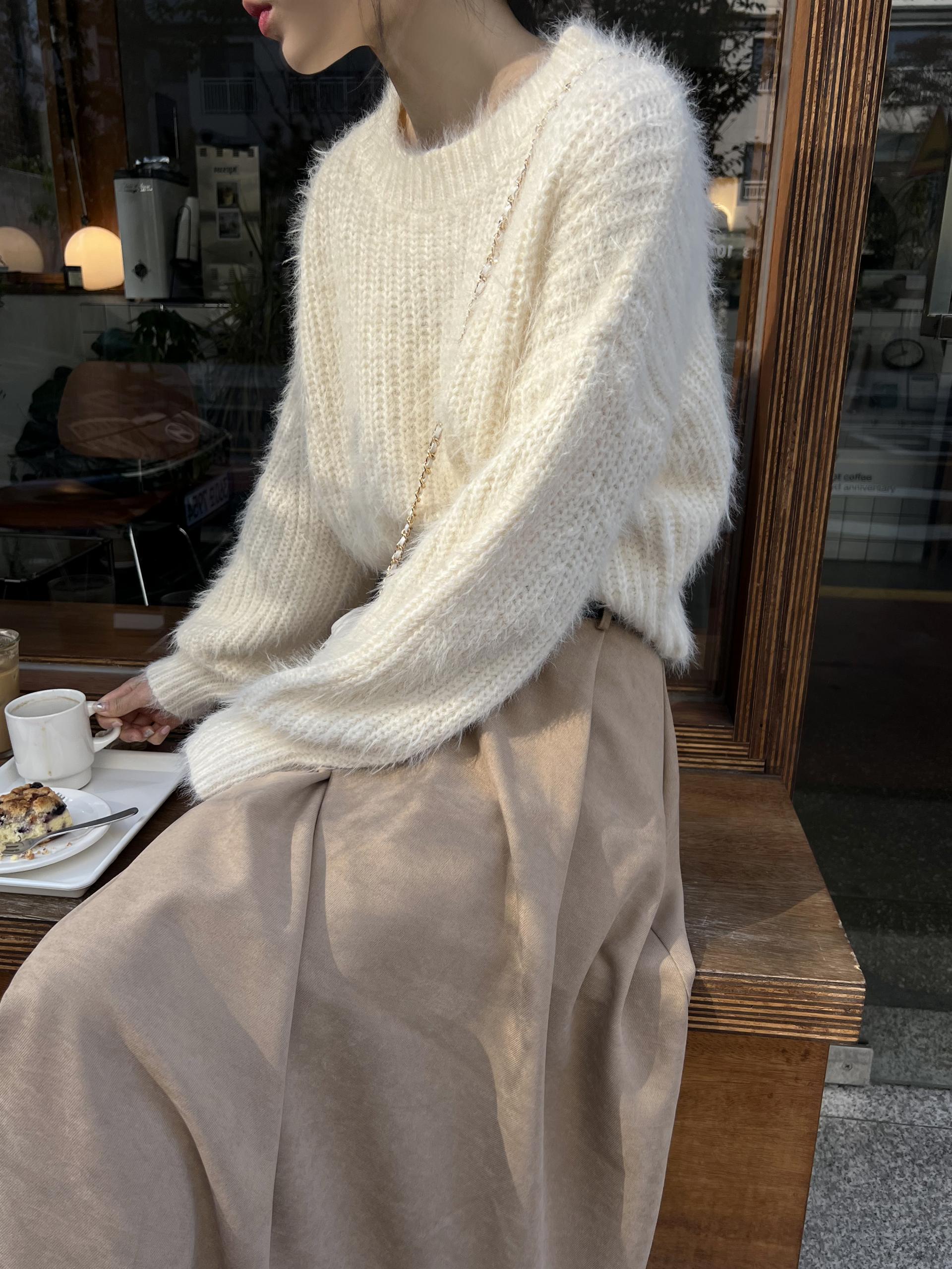 드롭 어깨 라인으로 여리여리한 핏의 퍼 니트 티셔츠입니다.