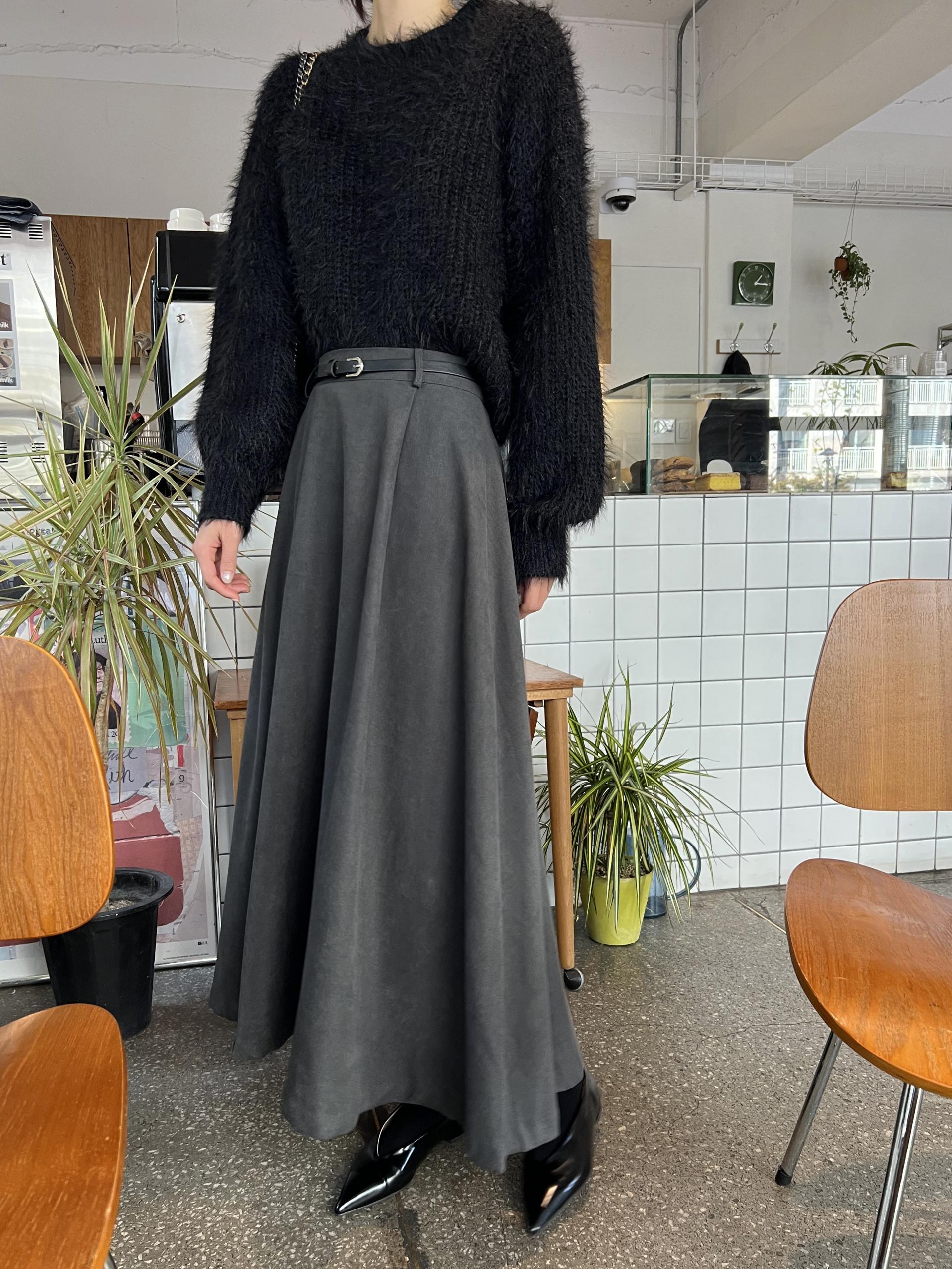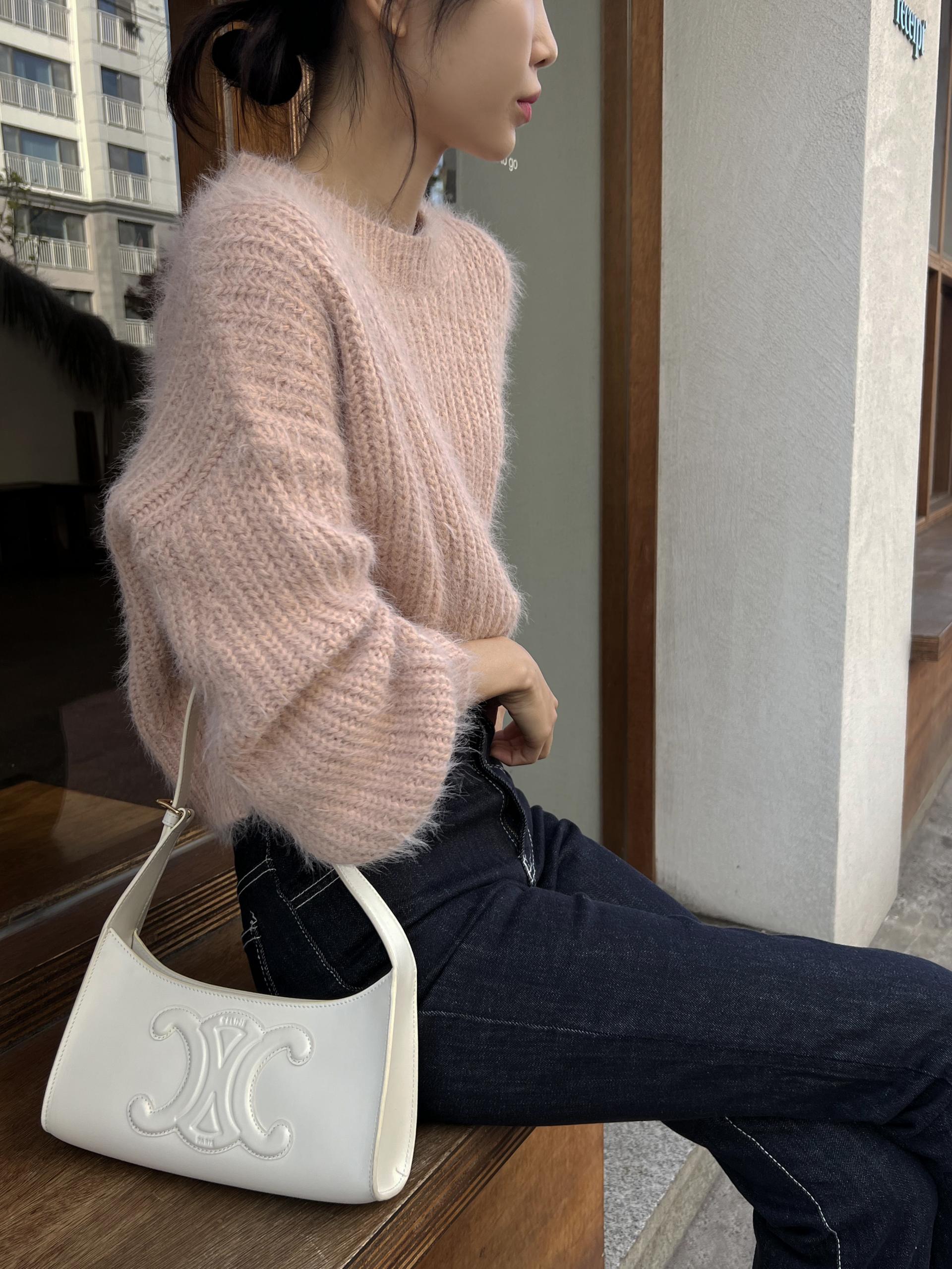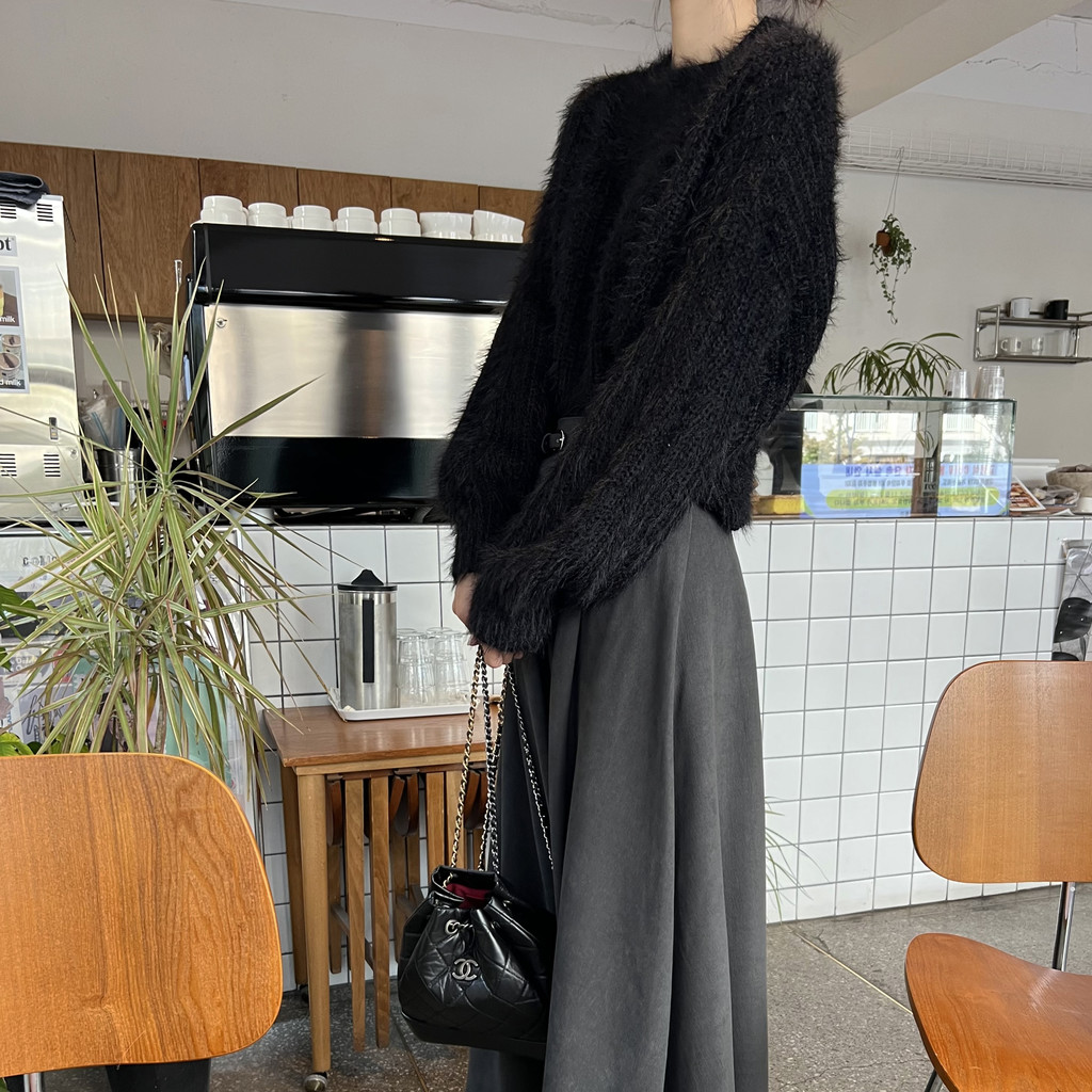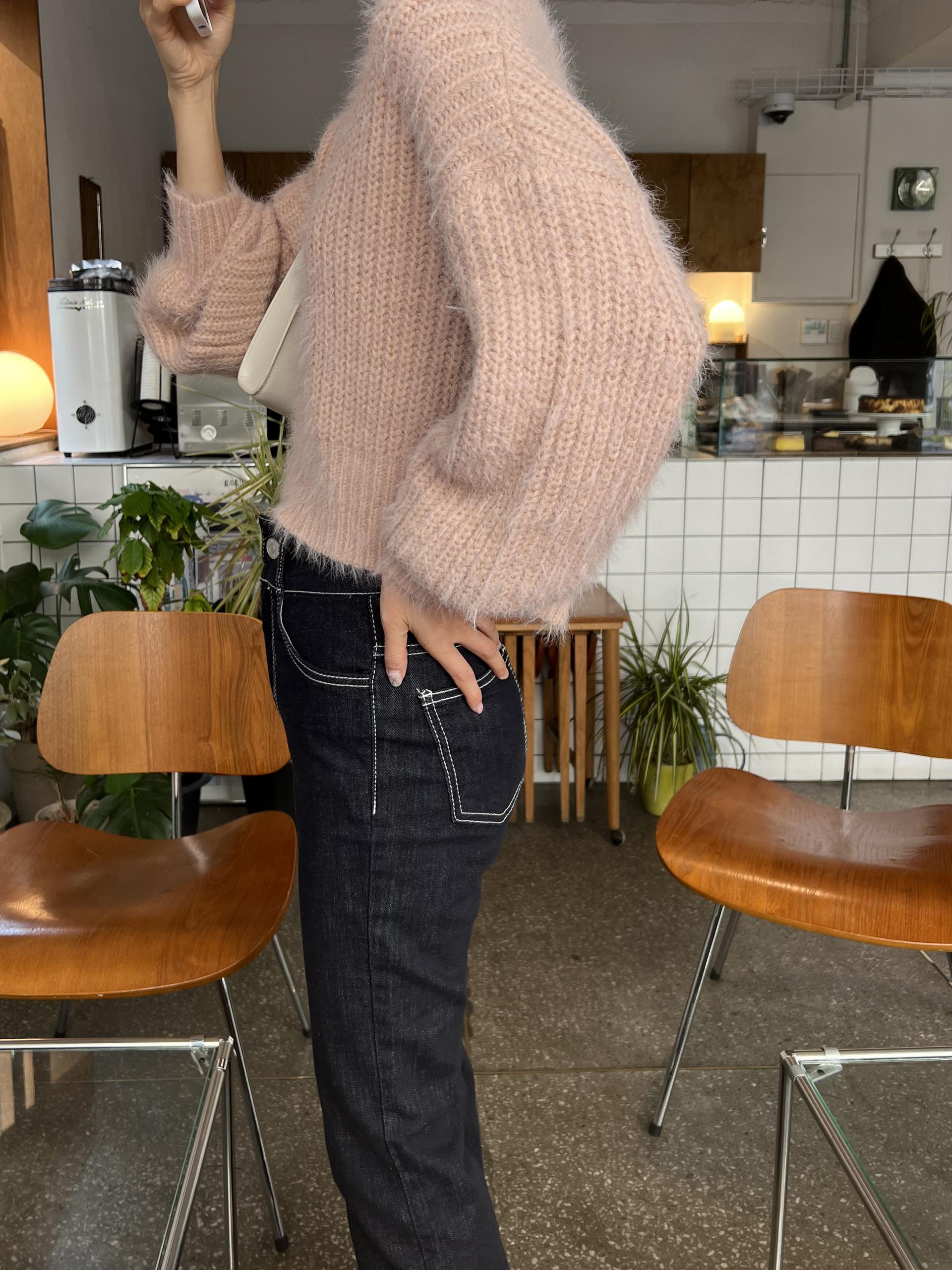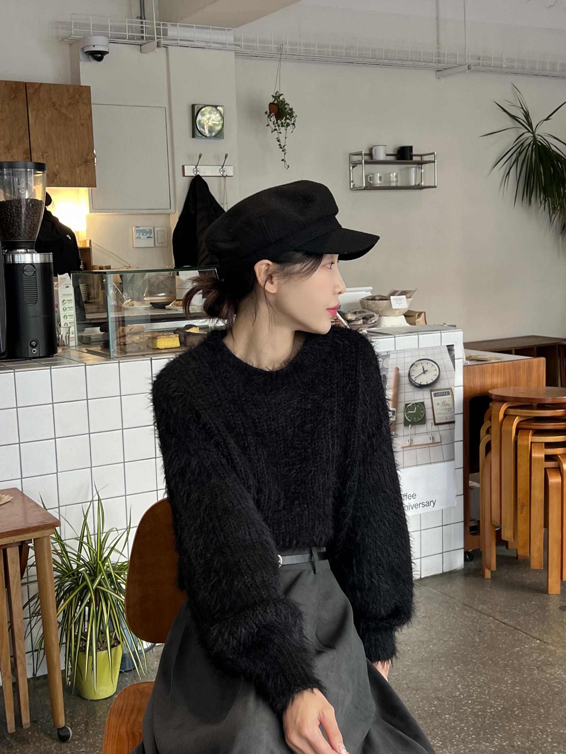 드롭 어깨 라인으로 여리여리한 핏의 퍼 니트 티셔츠입니다.