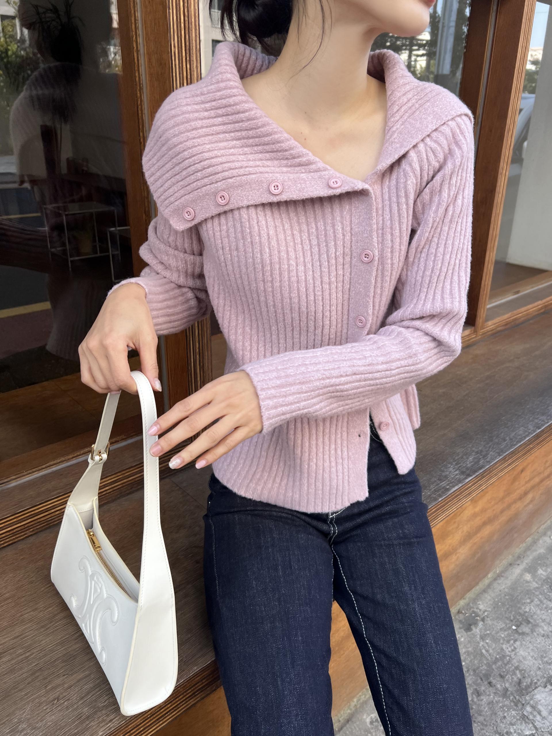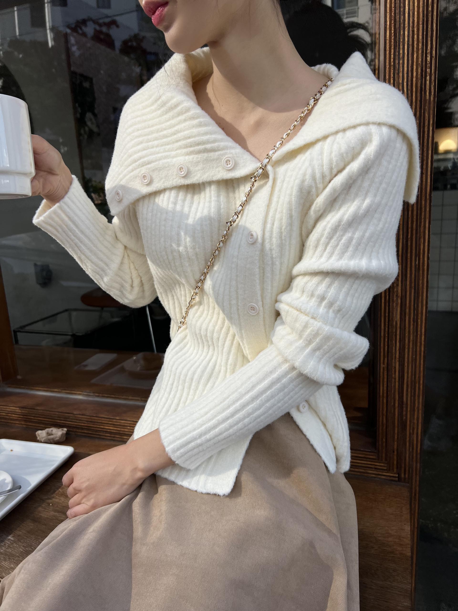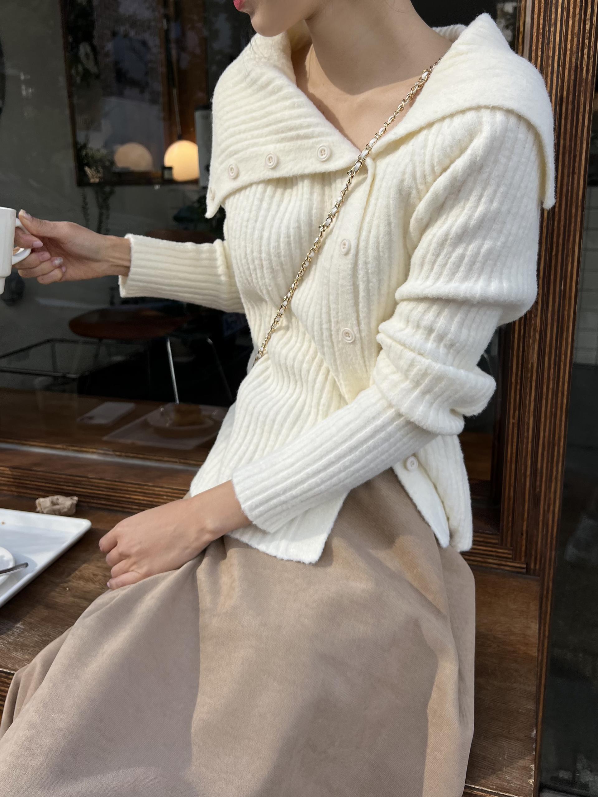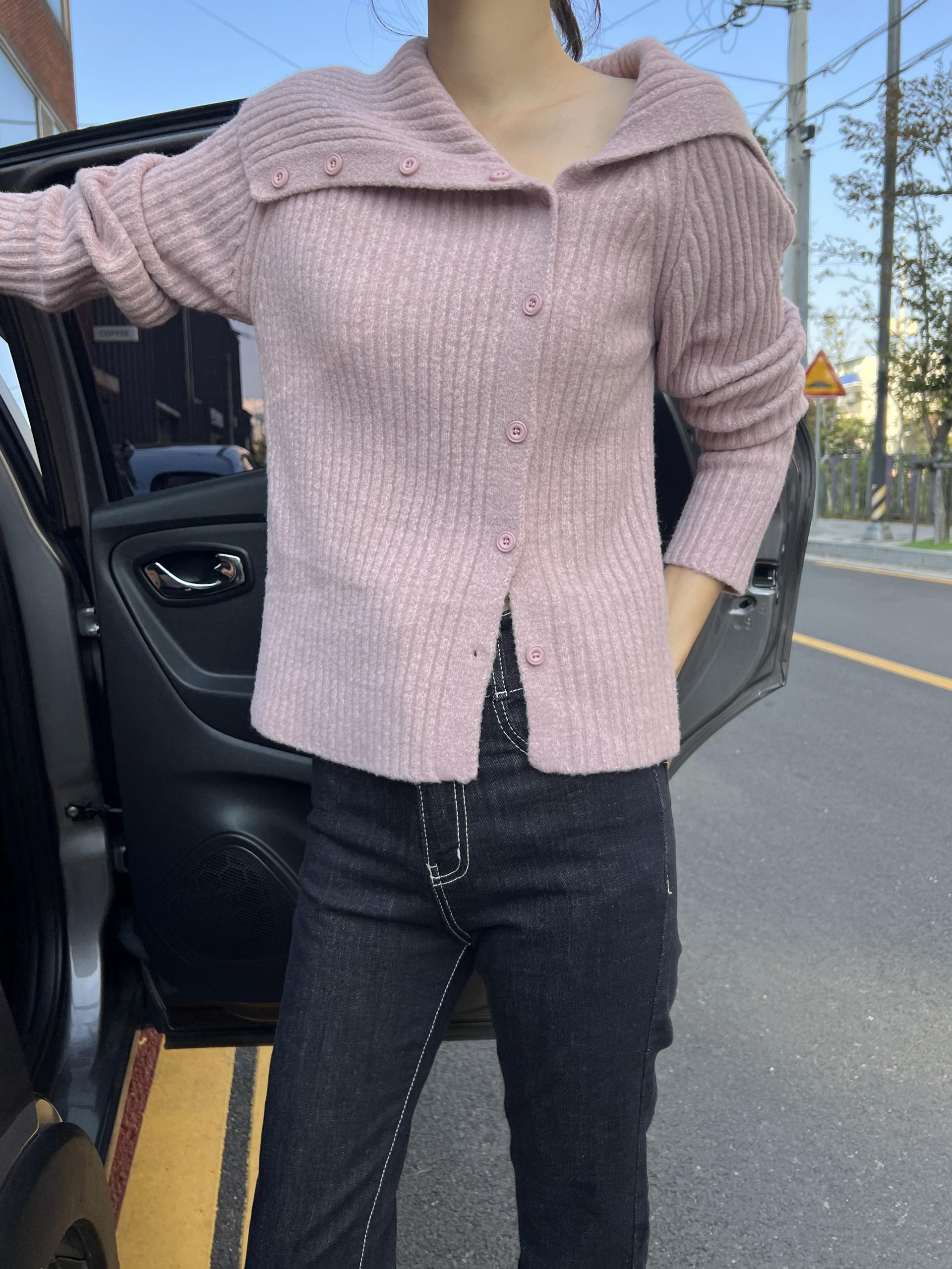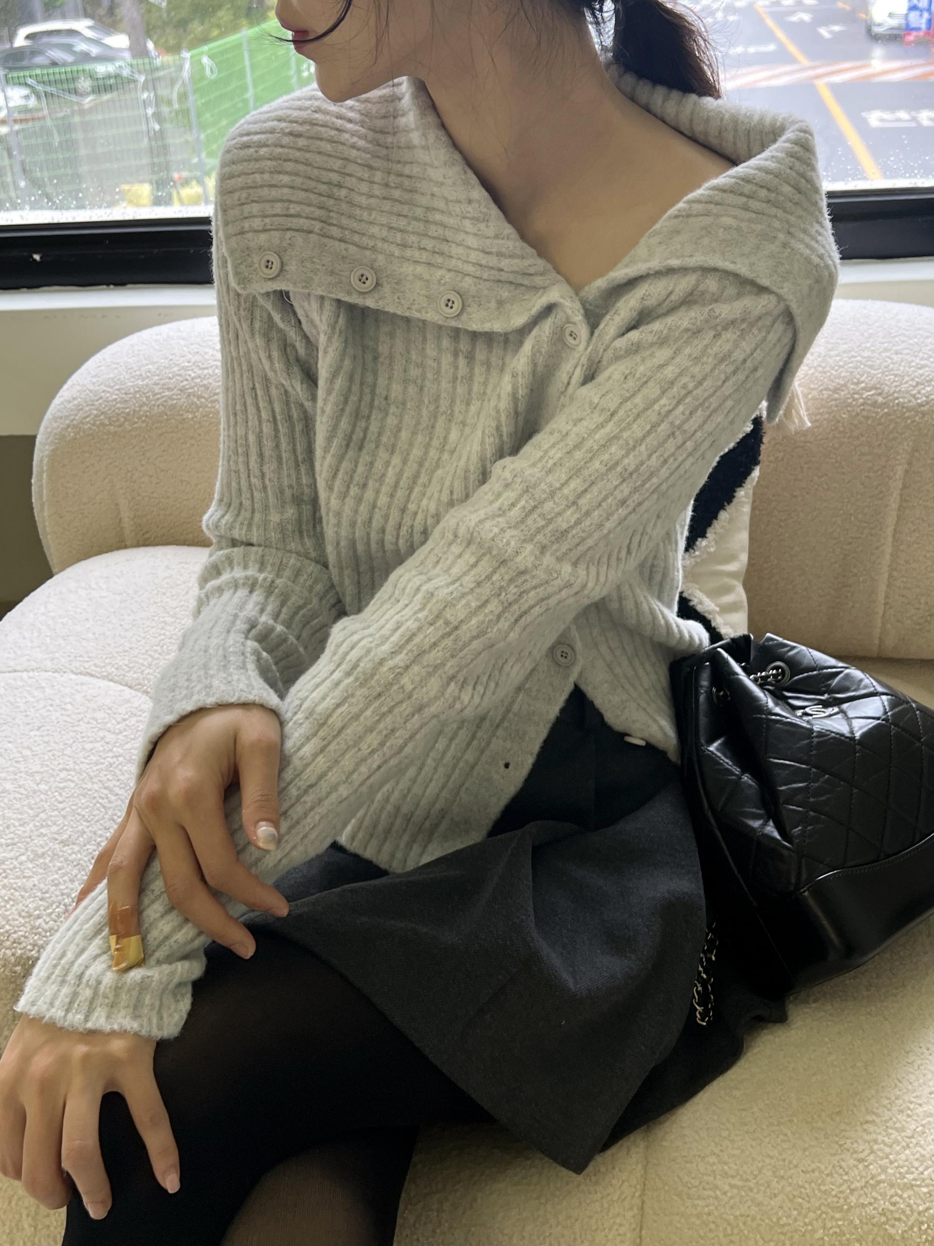 사선으로 떨어지는 브이넥이 흔하지 않은 디자인이며, 넥 부분까지 이어지는 단추 디자인도 눈길이 많이 갔던 것 같아요. 쫀쫀한 골지 니트인데, 너무 딱 붙게 슬림 하기보다는 약간 여유가 있으면서 날씬하게 떨어져 더 만족스러웠어요.