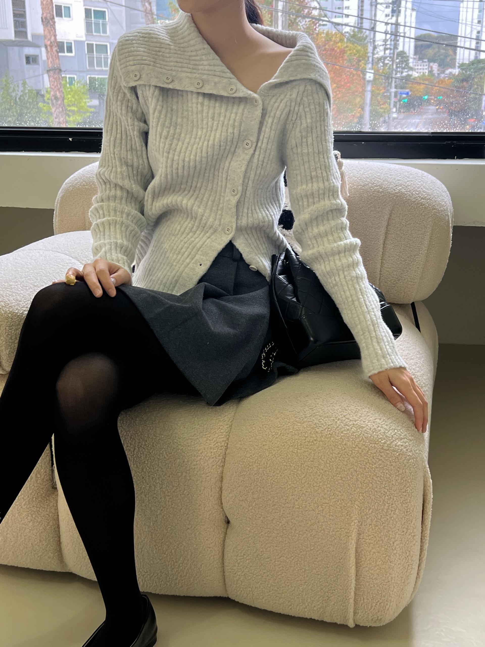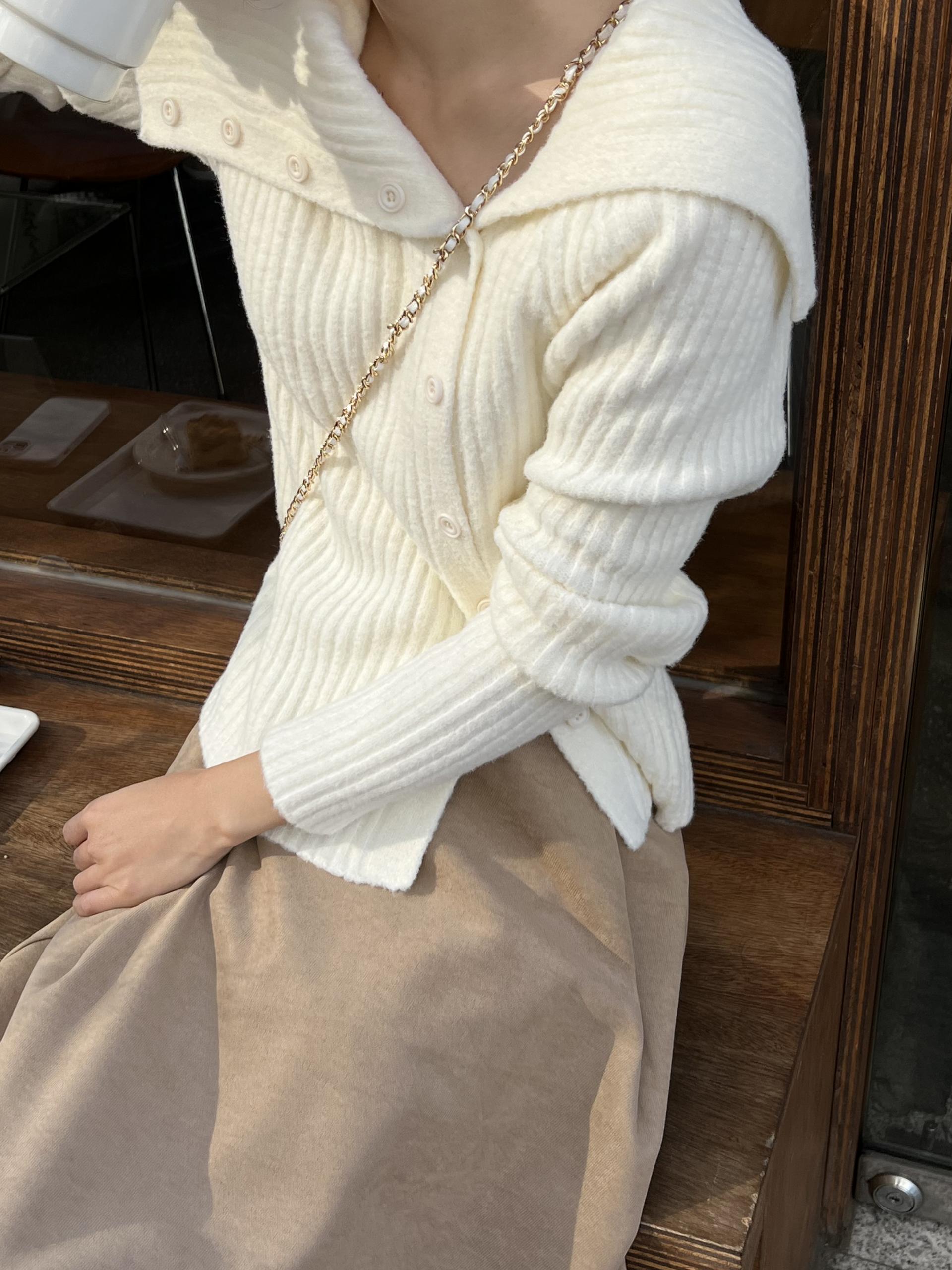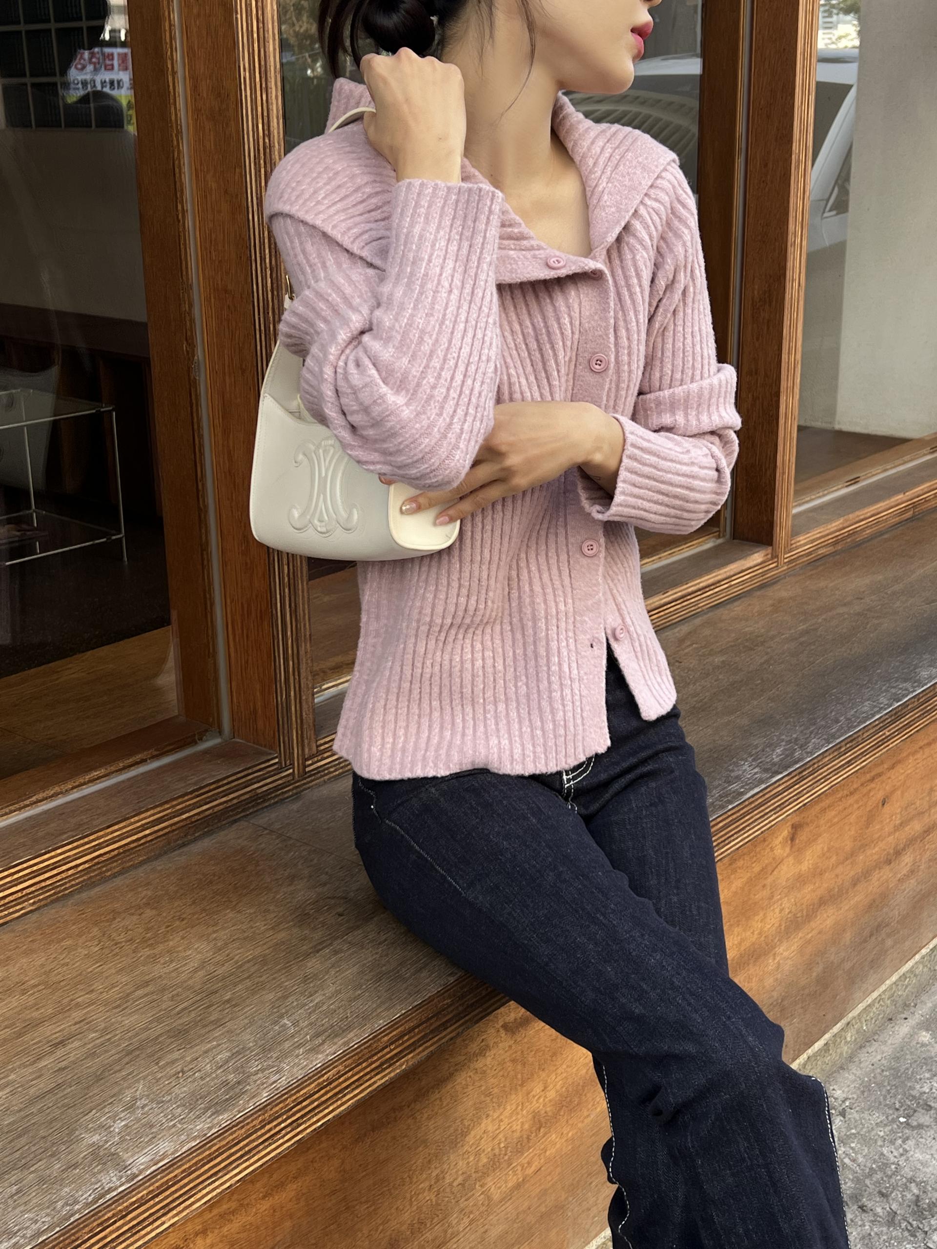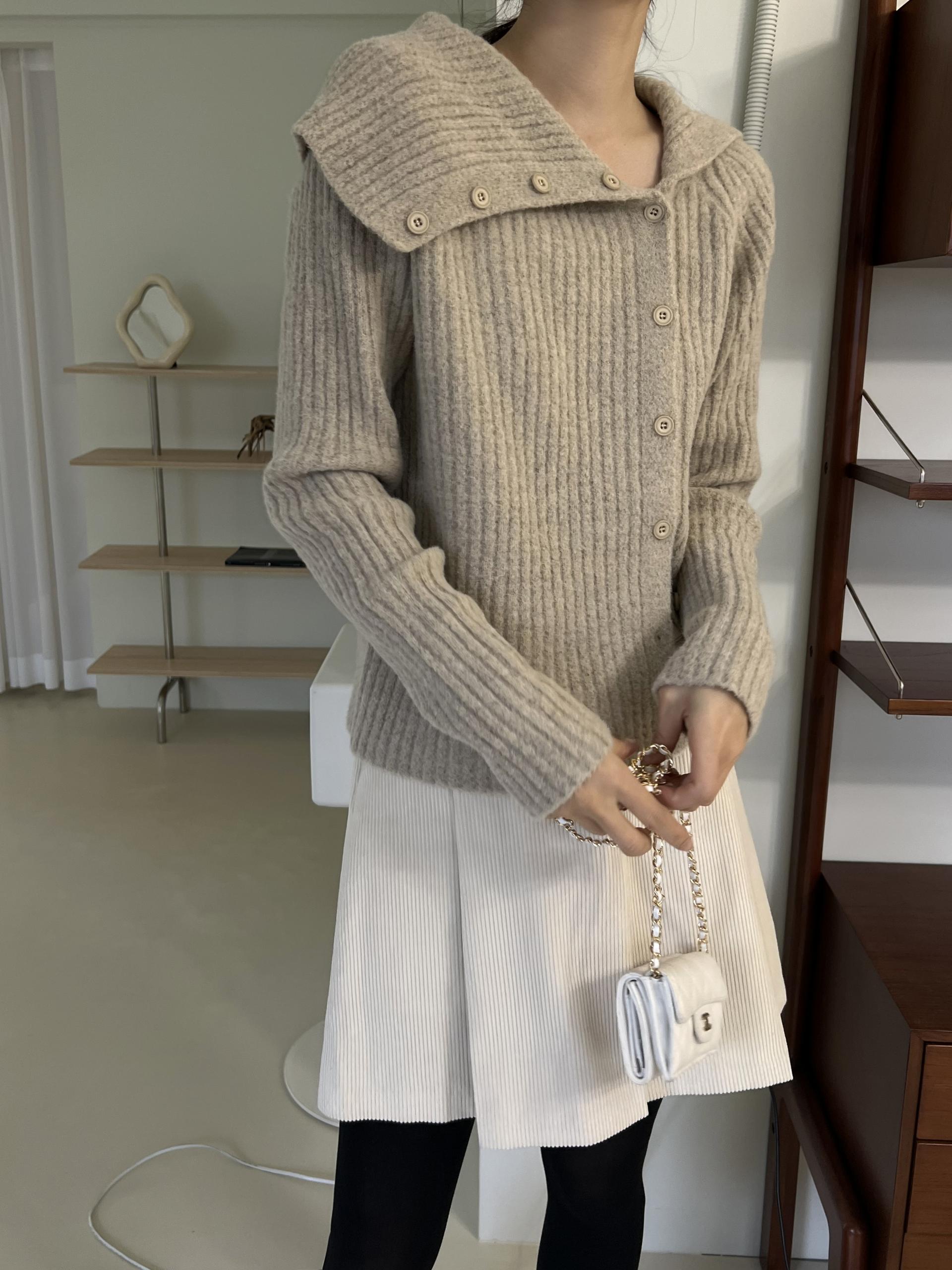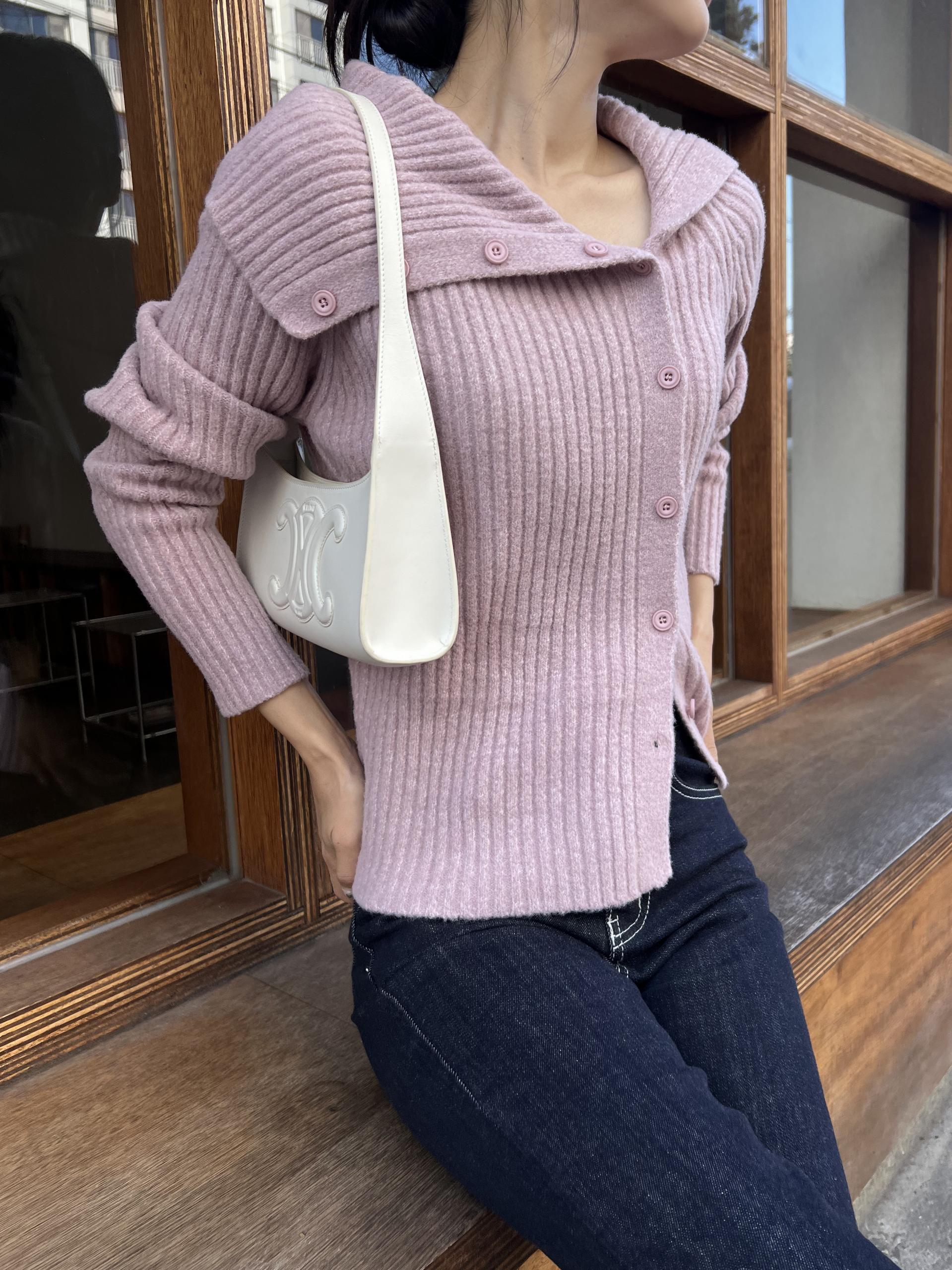 사선으로 떨어지는 브이넥이 흔하지 않은 디자인이며, 넥 부분까지 이어지는 단추 디자인도 눈길이 많이 갔던 것 같아요. 쫀쫀한 골지 니트인데, 너무 딱 붙게 슬림 하기보다는 약간 여유가 있으면서 날씬하게 떨어져 더 만족스러웠어요.