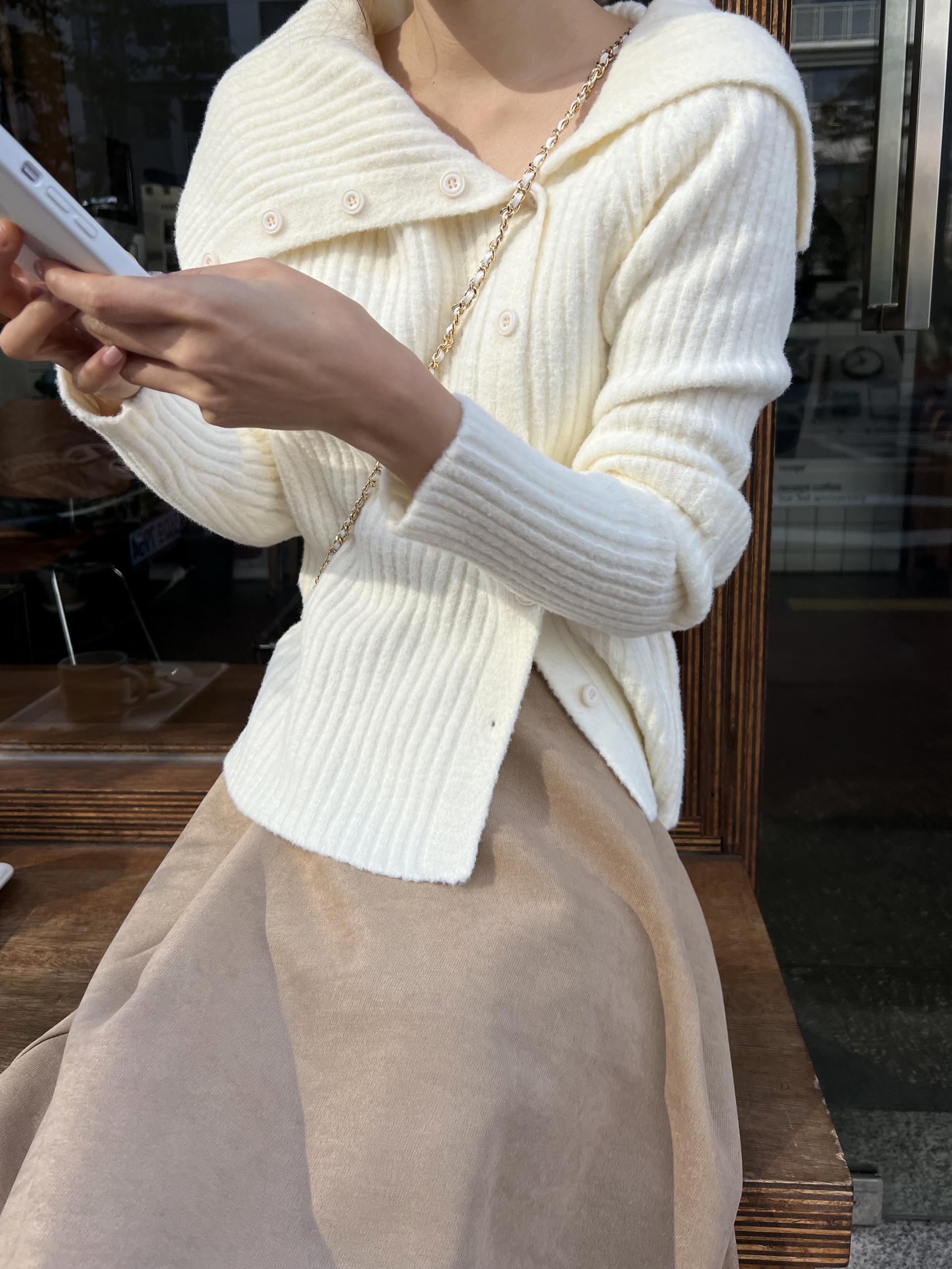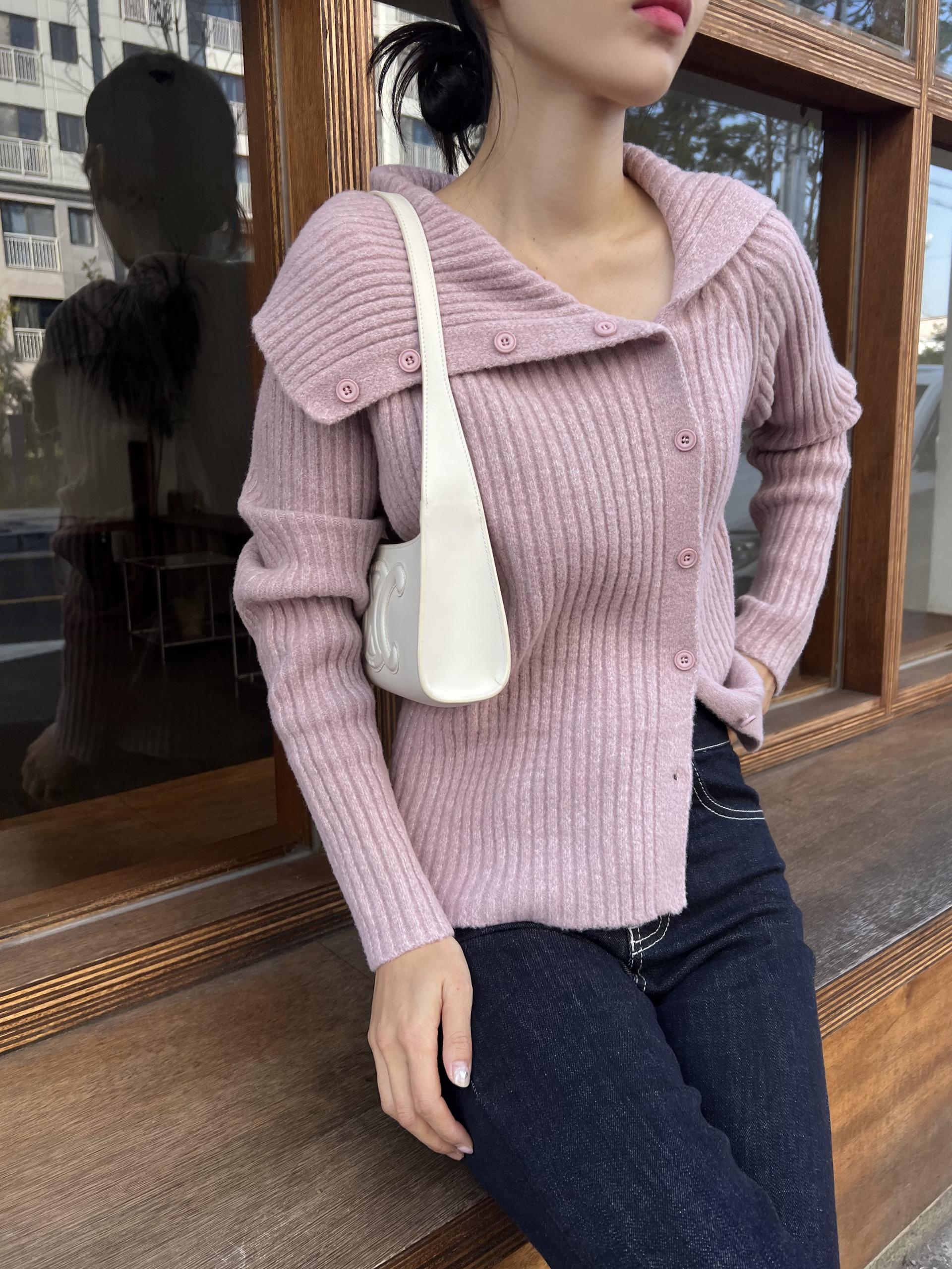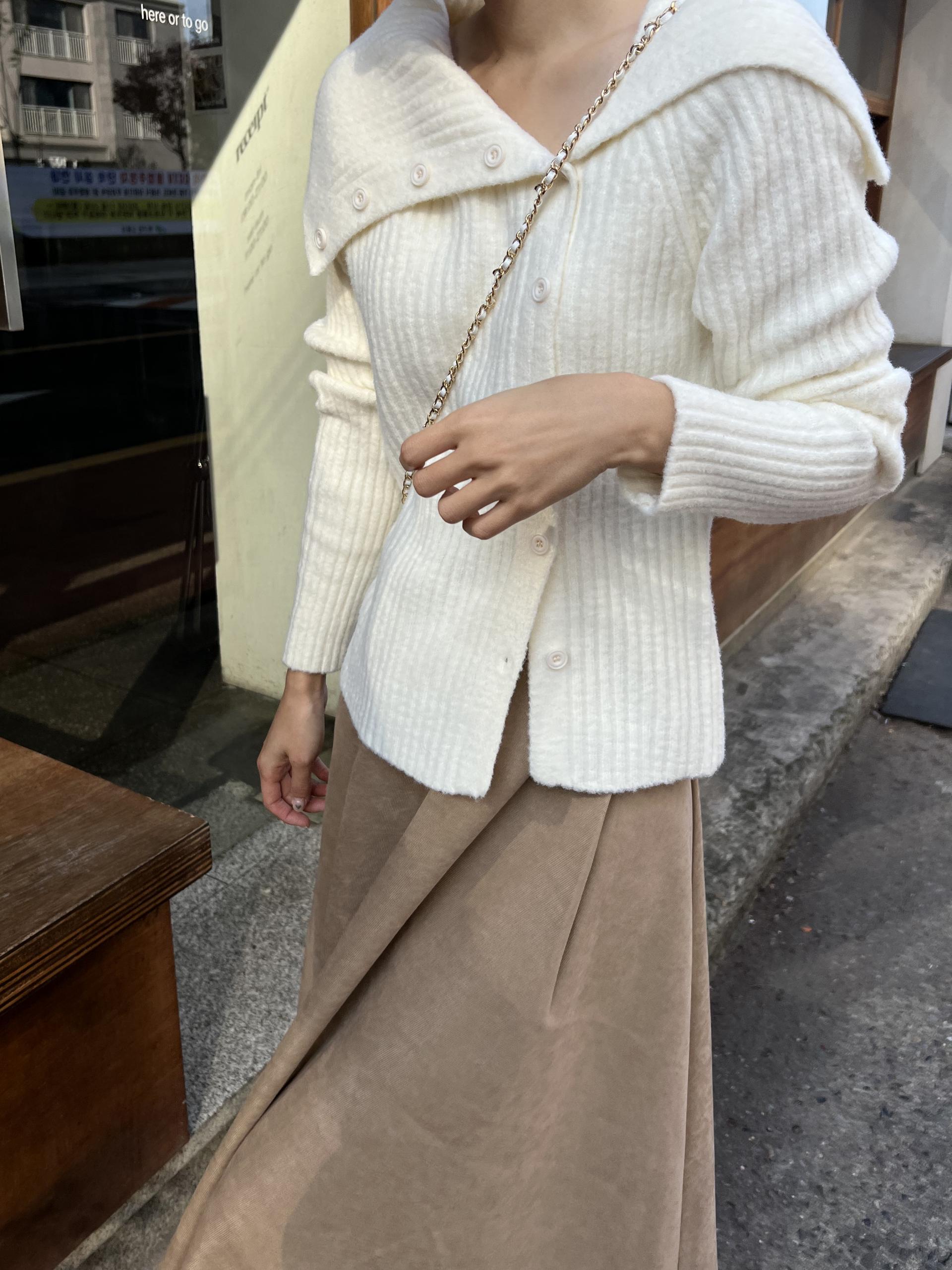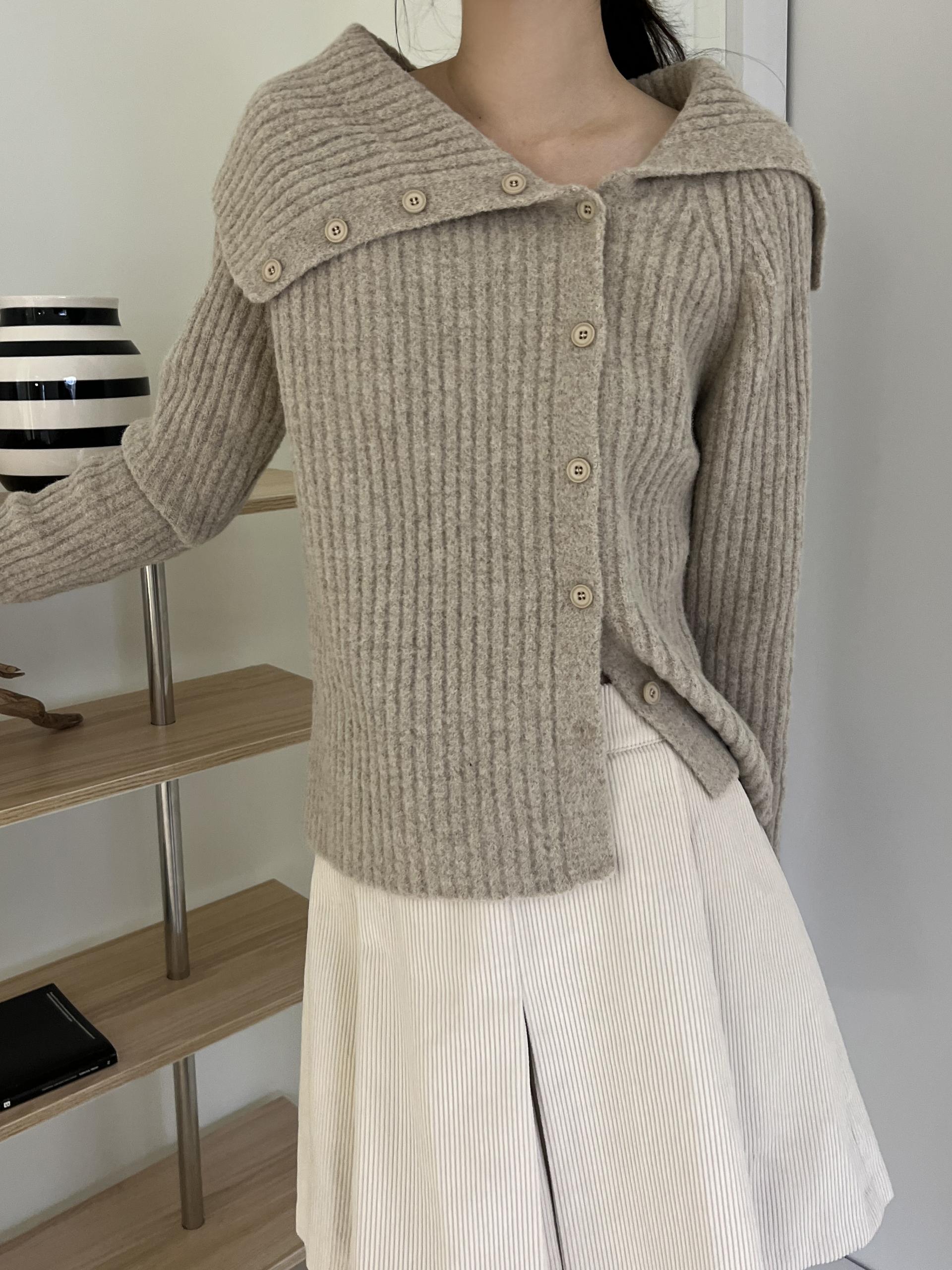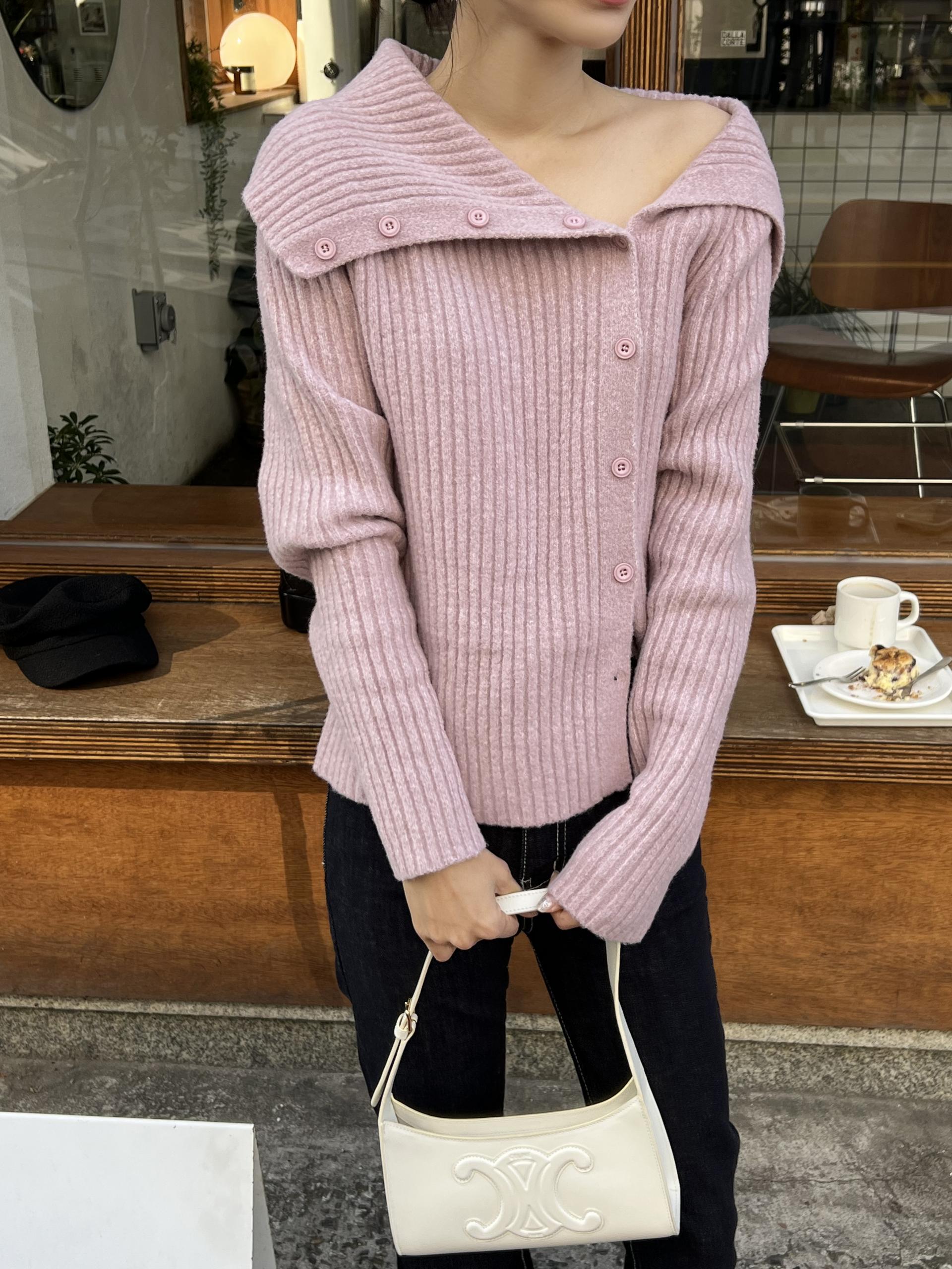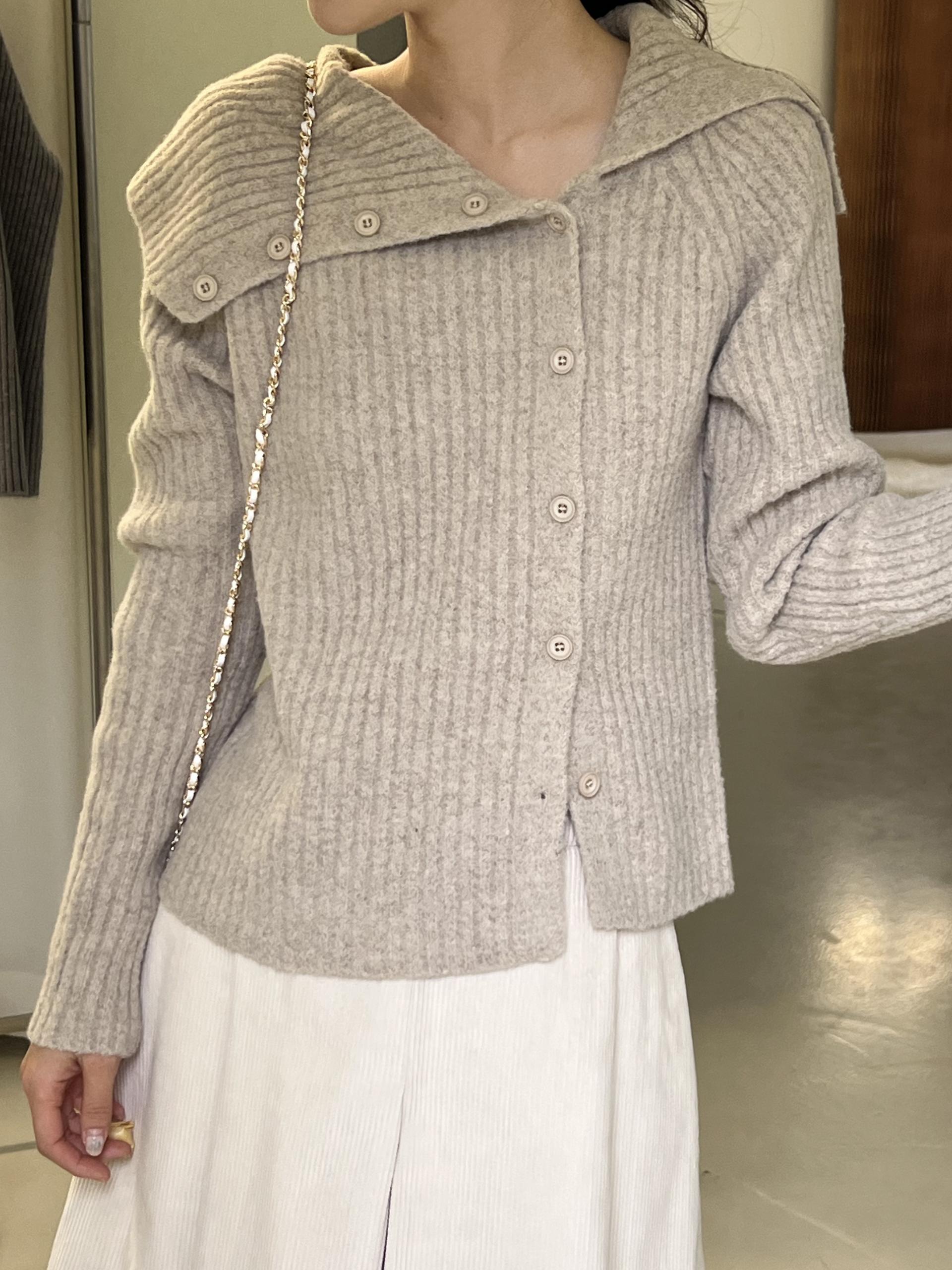 사선으로 떨어지는 브이넥이 흔하지 않은 디자인이며, 넥 부분까지 이어지는 단추 디자인도 눈길이 많이 갔던 것 같아요. 쫀쫀한 골지 니트인데, 너무 딱 붙게 슬림 하기보다는 약간 여유가 있으면서 날씬하게 떨어져 더 만족스러웠어요.