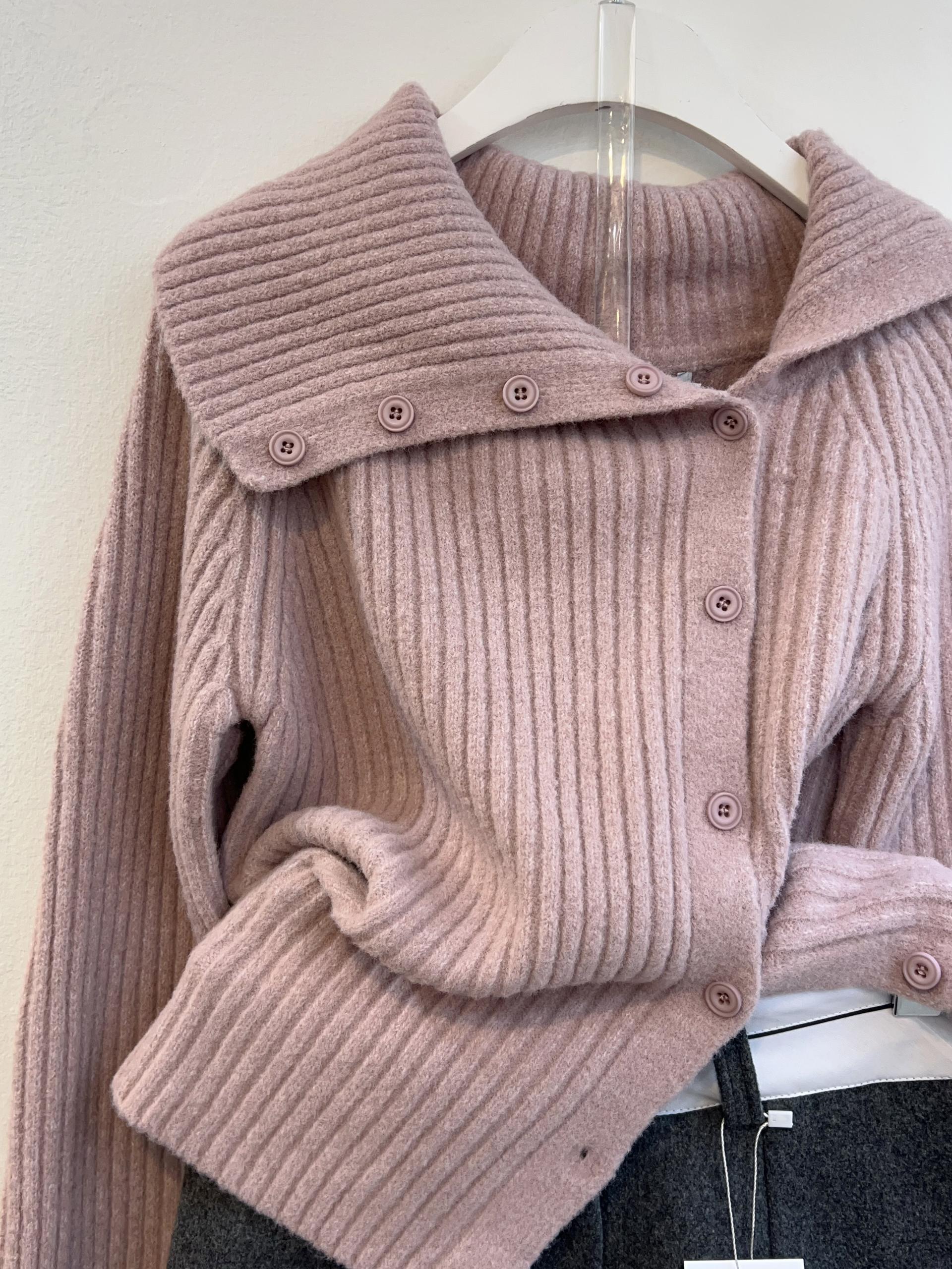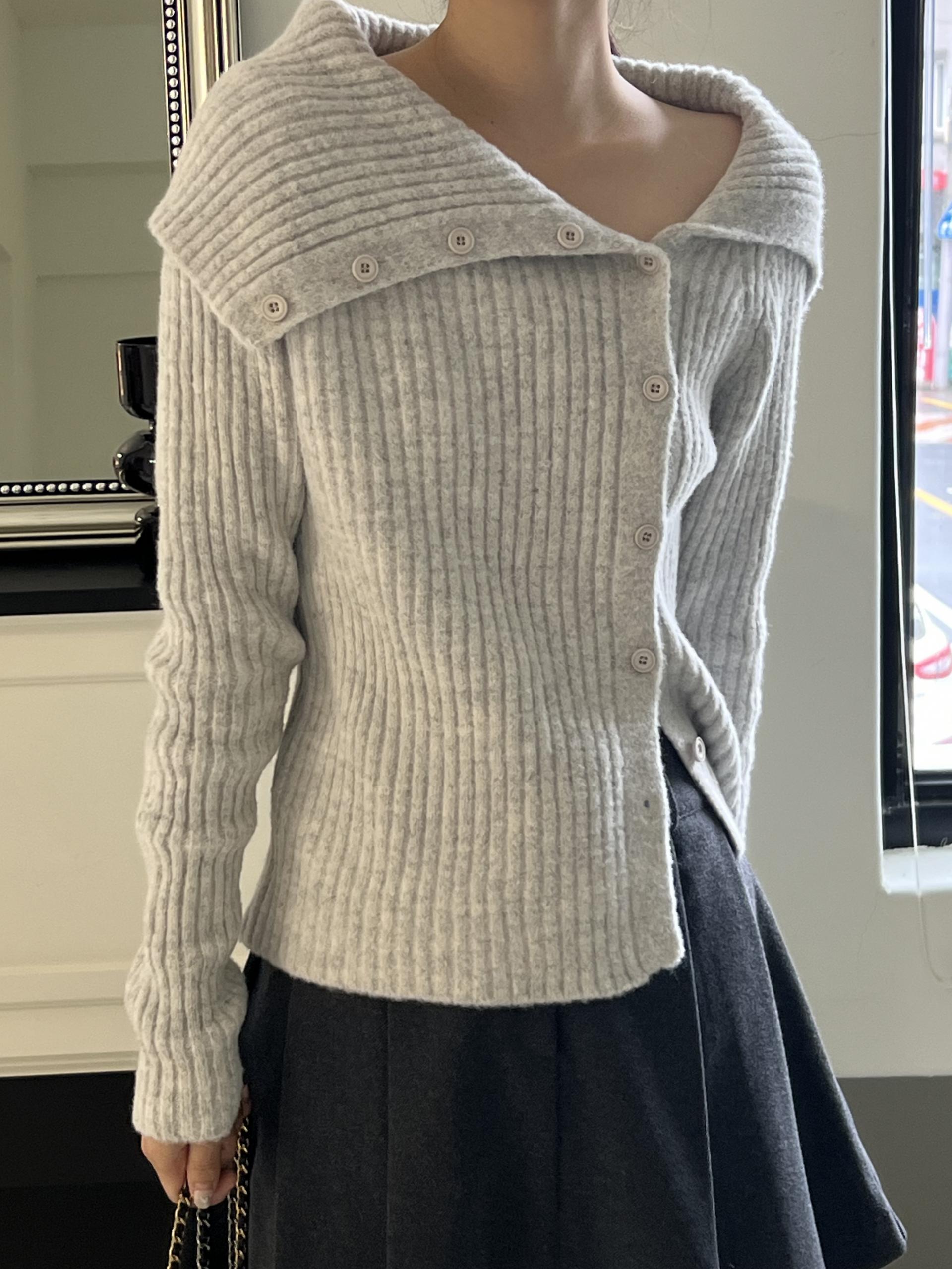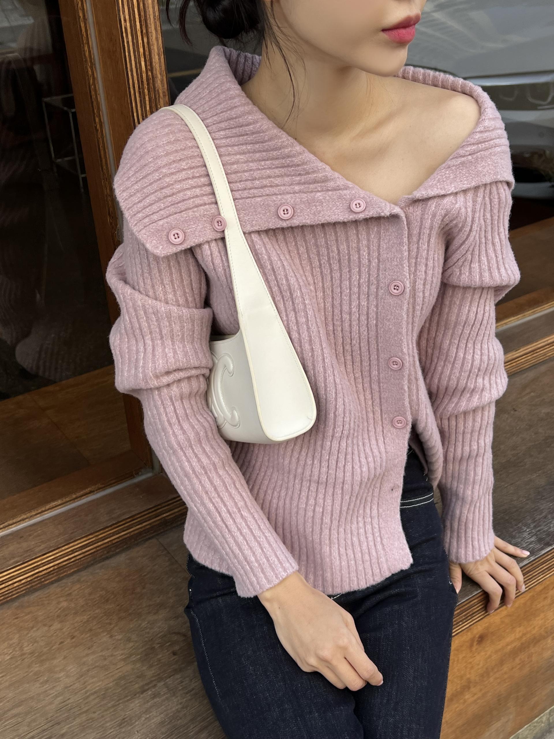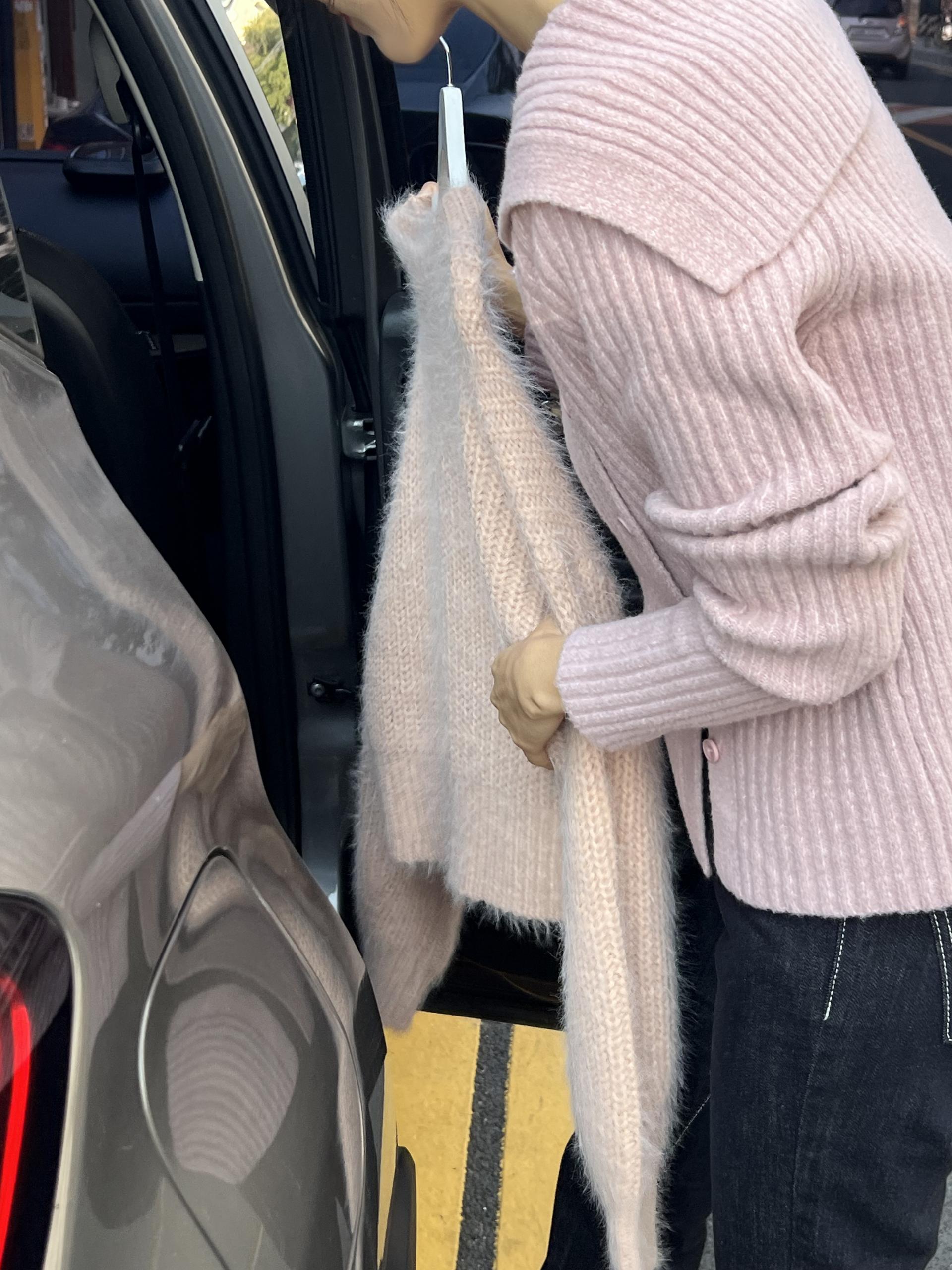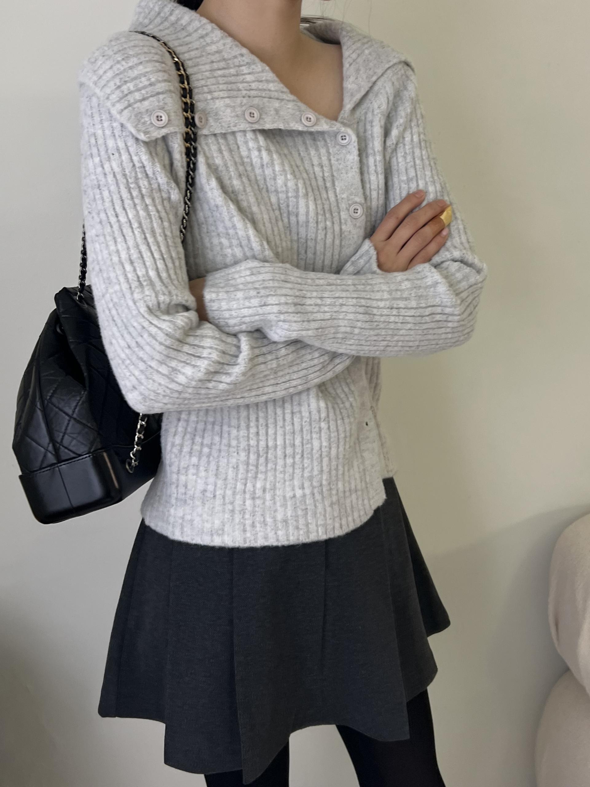 사선으로 떨어지는 브이넥이 흔하지 않은 디자인이며, 넥 부분까지 이어지는 단추 디자인도 눈길이 많이 갔던 것 같아요. 쫀쫀한 골지 니트인데, 너무 딱 붙게 슬림 하기보다는 약간 여유가 있으면서 날씬하게 떨어져 더 만족스러웠어요.