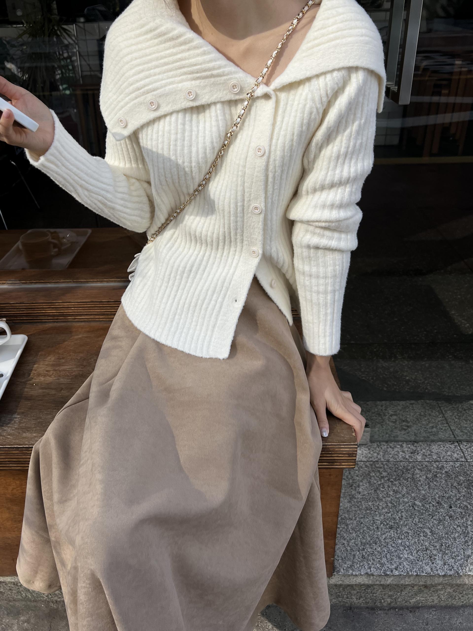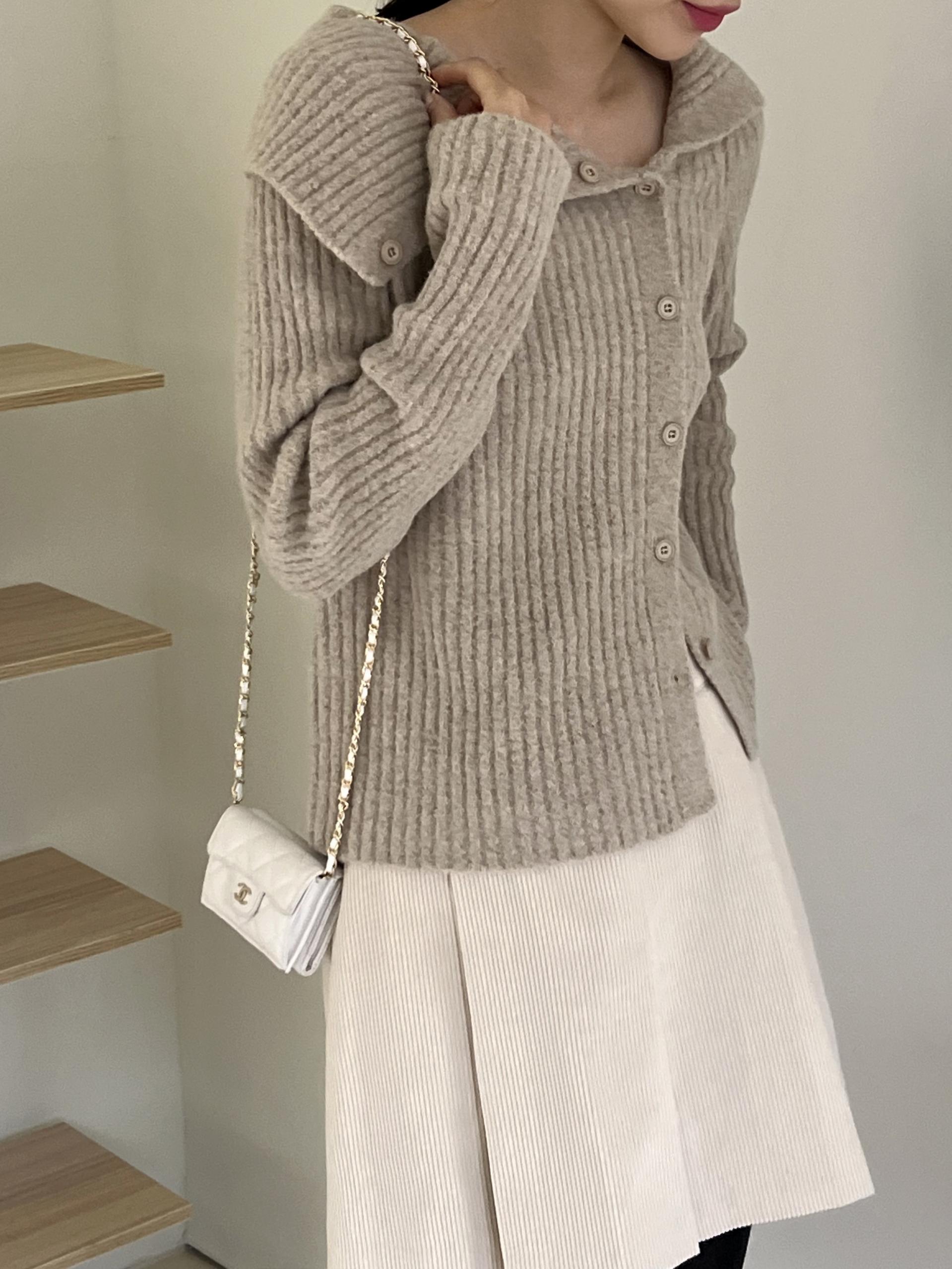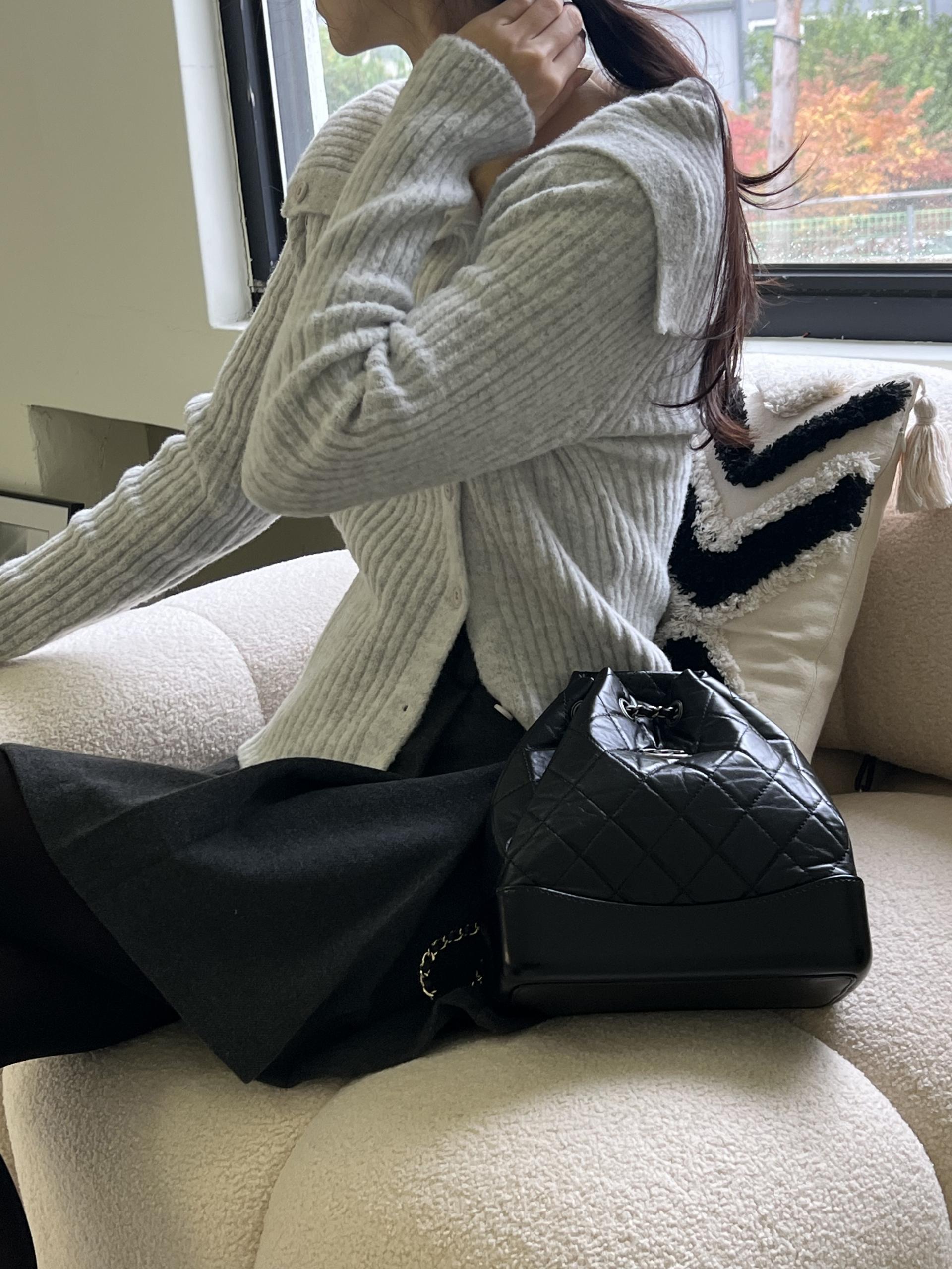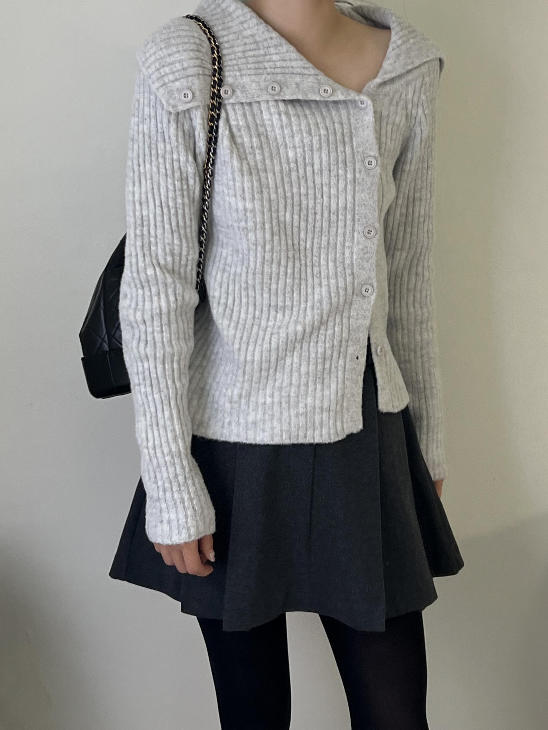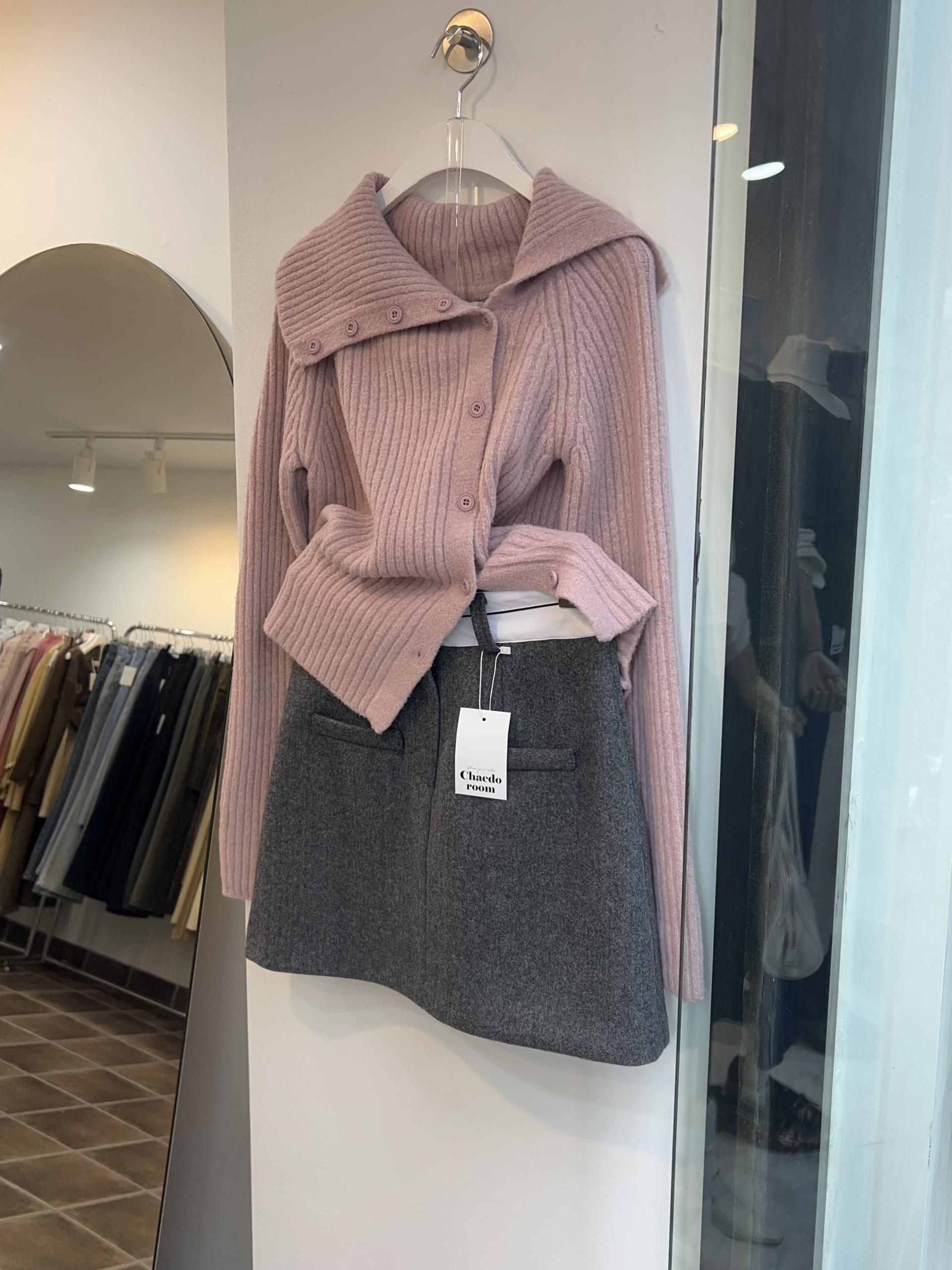 사선으로 떨어지는 브이넥이 흔하지 않은 디자인이며, 넥 부분까지 이어지는 단추 디자인도 눈길이 많이 갔던 것 같아요. 쫀쫀한 골지 니트인데, 너무 딱 붙게 슬림 하기보다는 약간 여유가 있으면서 날씬하게 떨어져 더 만족스러웠어요.