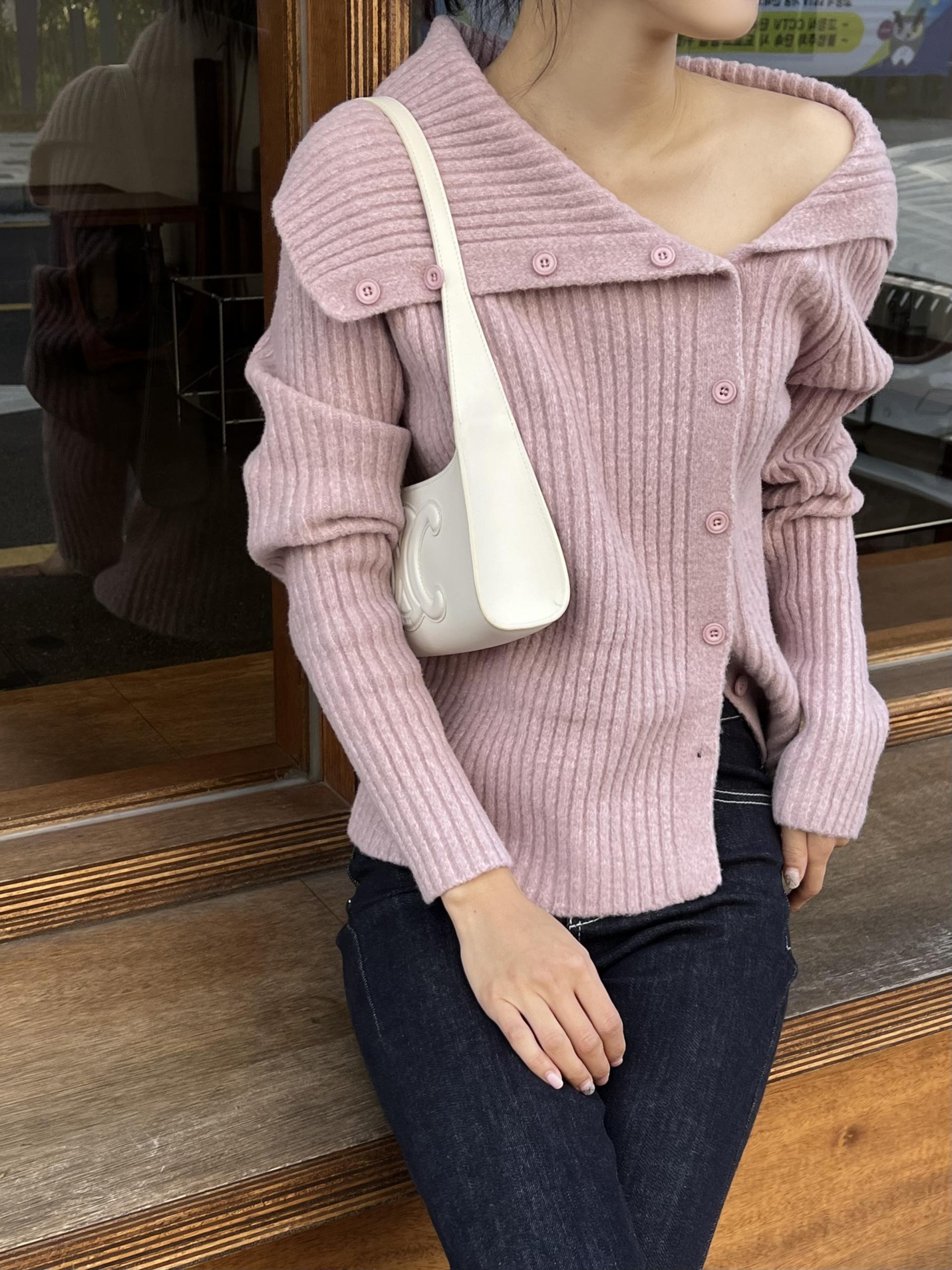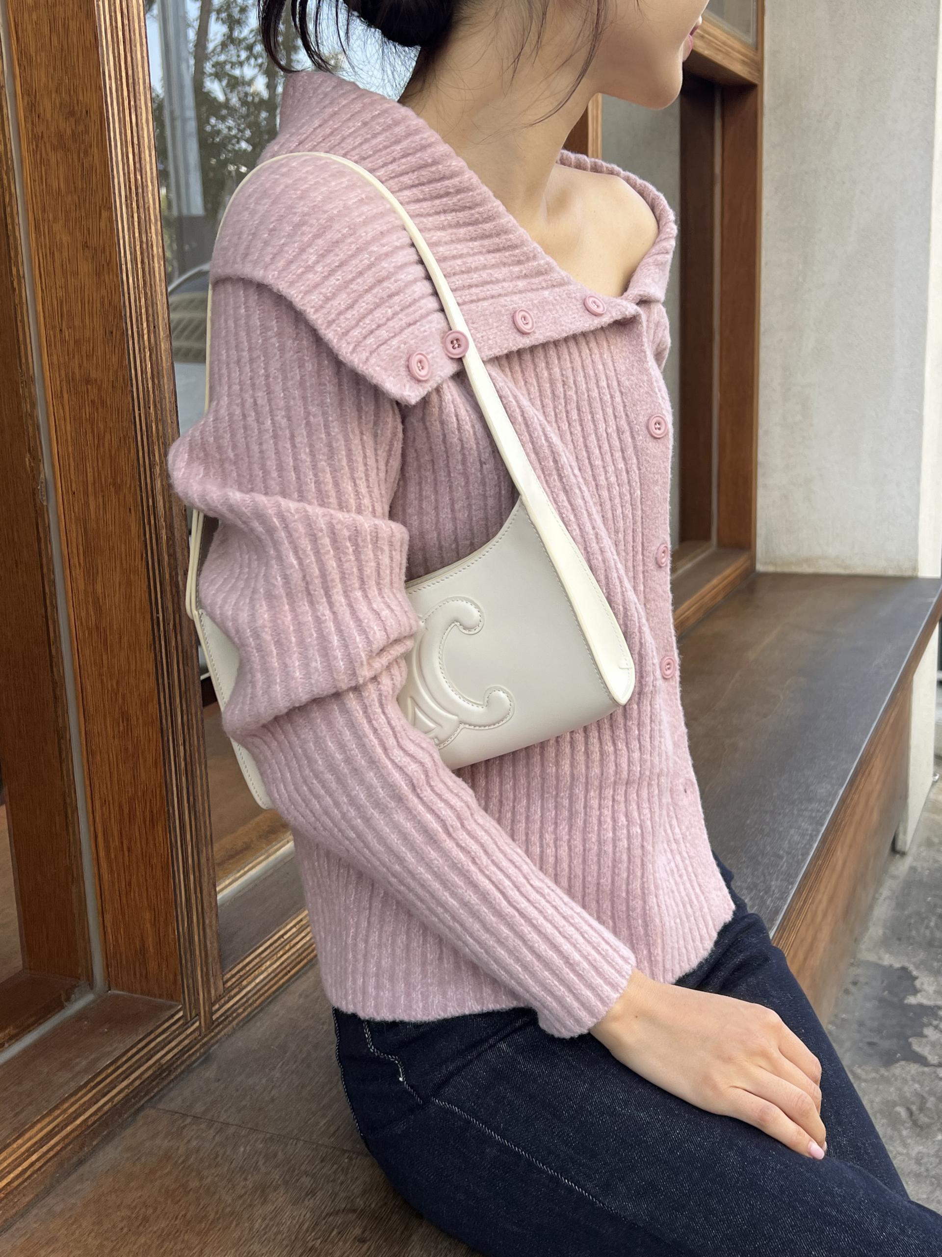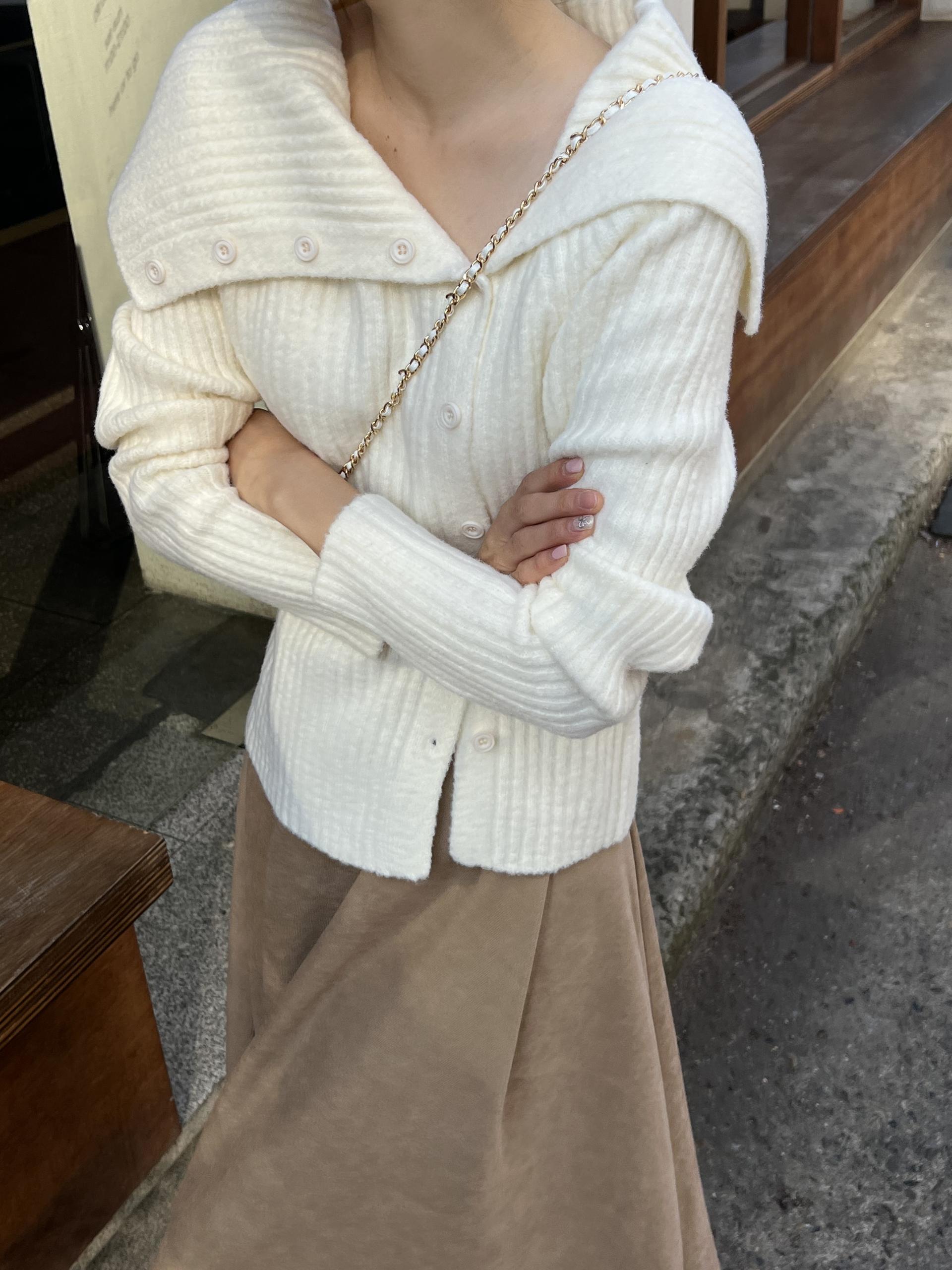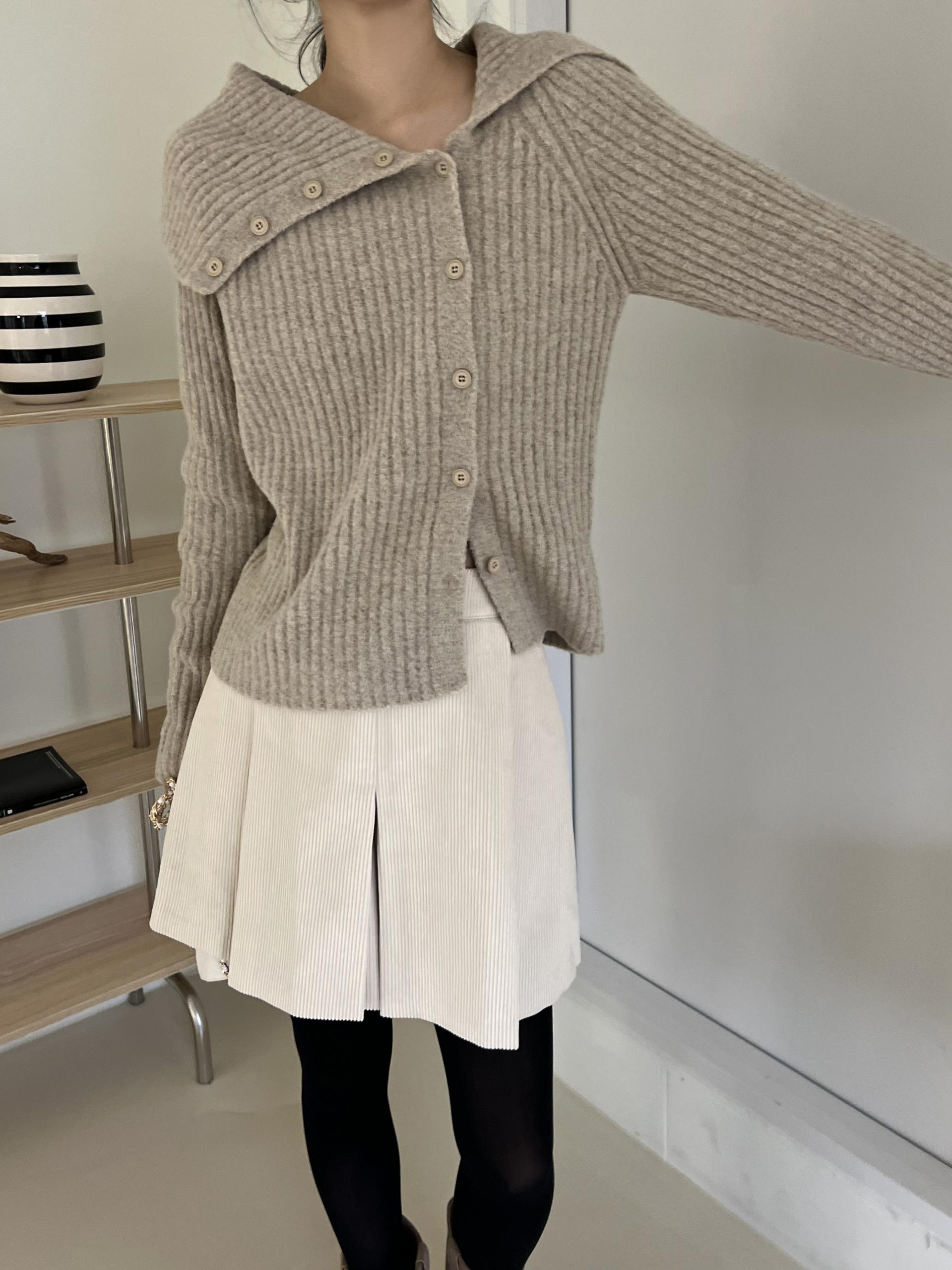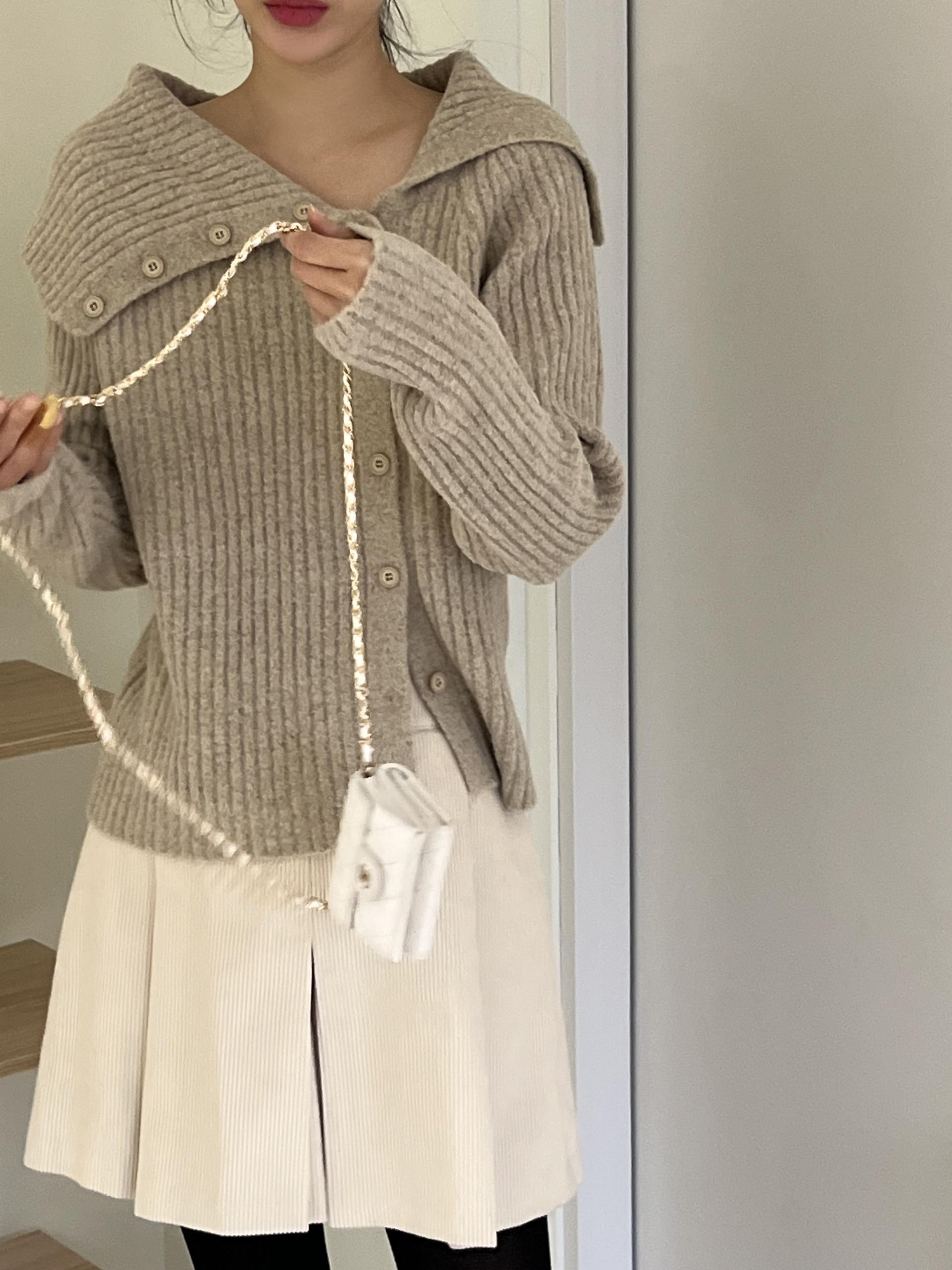 사선으로 떨어지는 브이넥이 흔하지 않은 디자인이며, 넥 부분까지 이어지는 단추 디자인도 눈길이 많이 갔던 것 같아요. 쫀쫀한 골지 니트인데, 너무 딱 붙게 슬림 하기보다는 약간 여유가 있으면서 날씬하게 떨어져 더 만족스러웠어요.