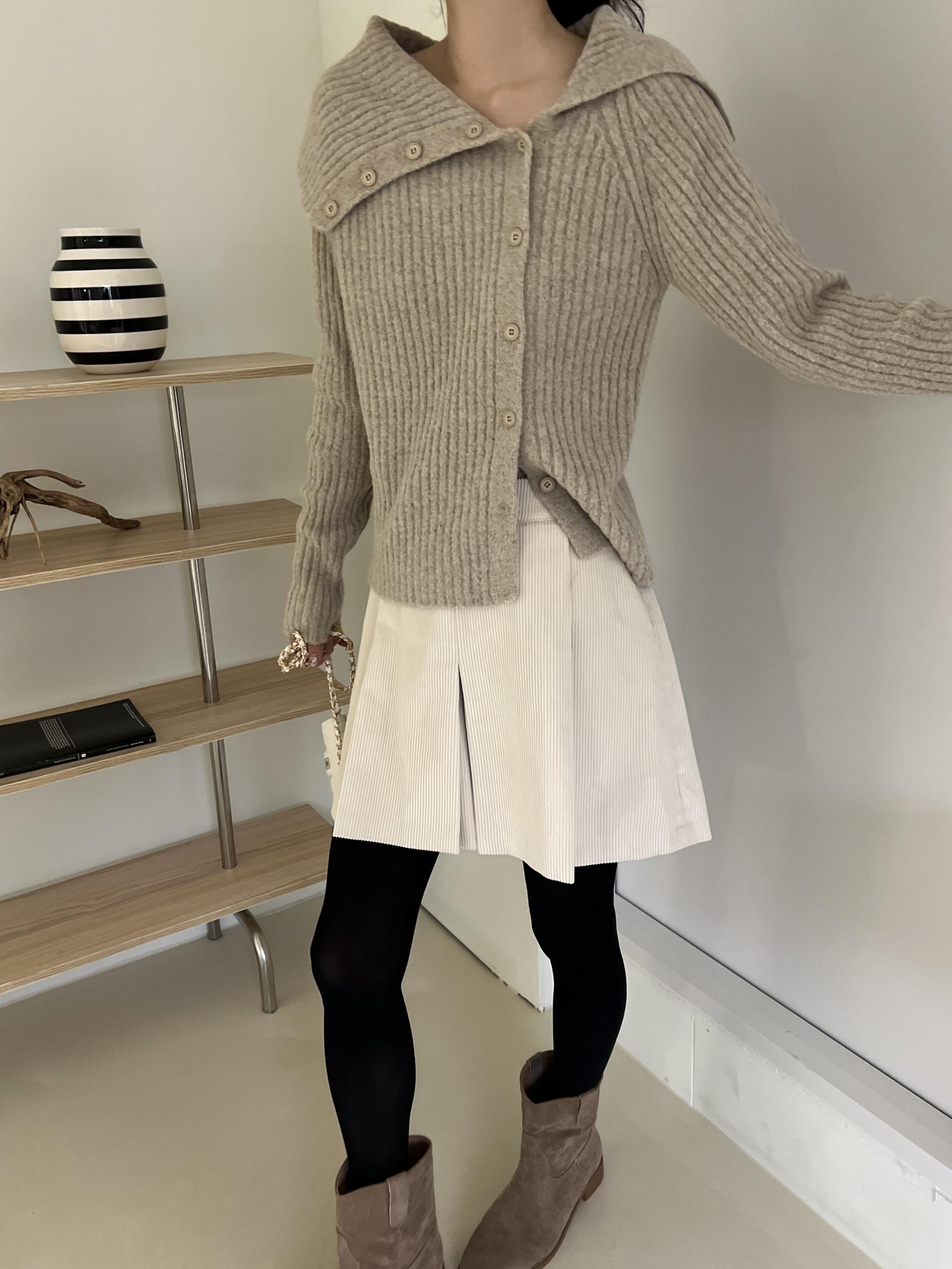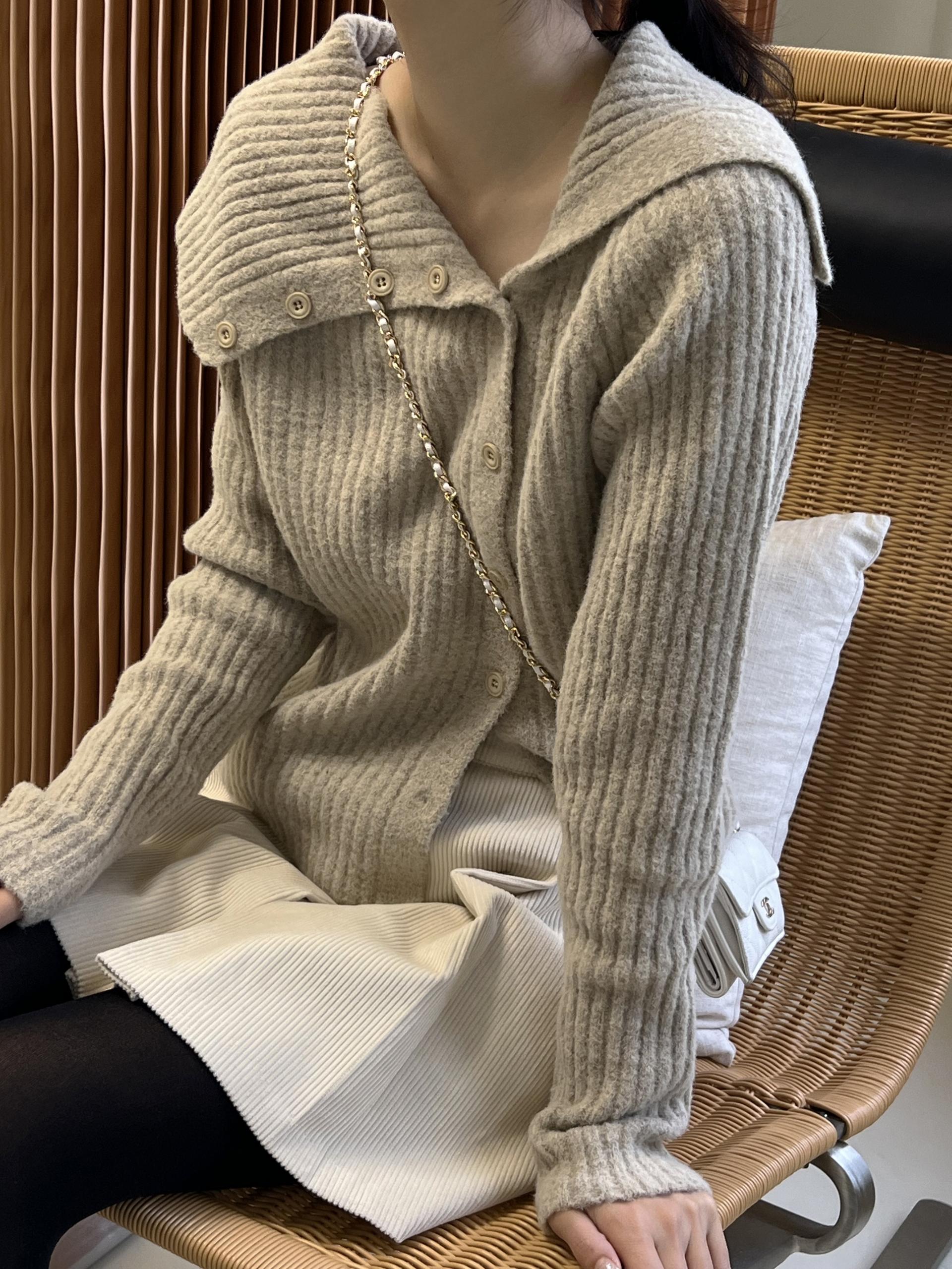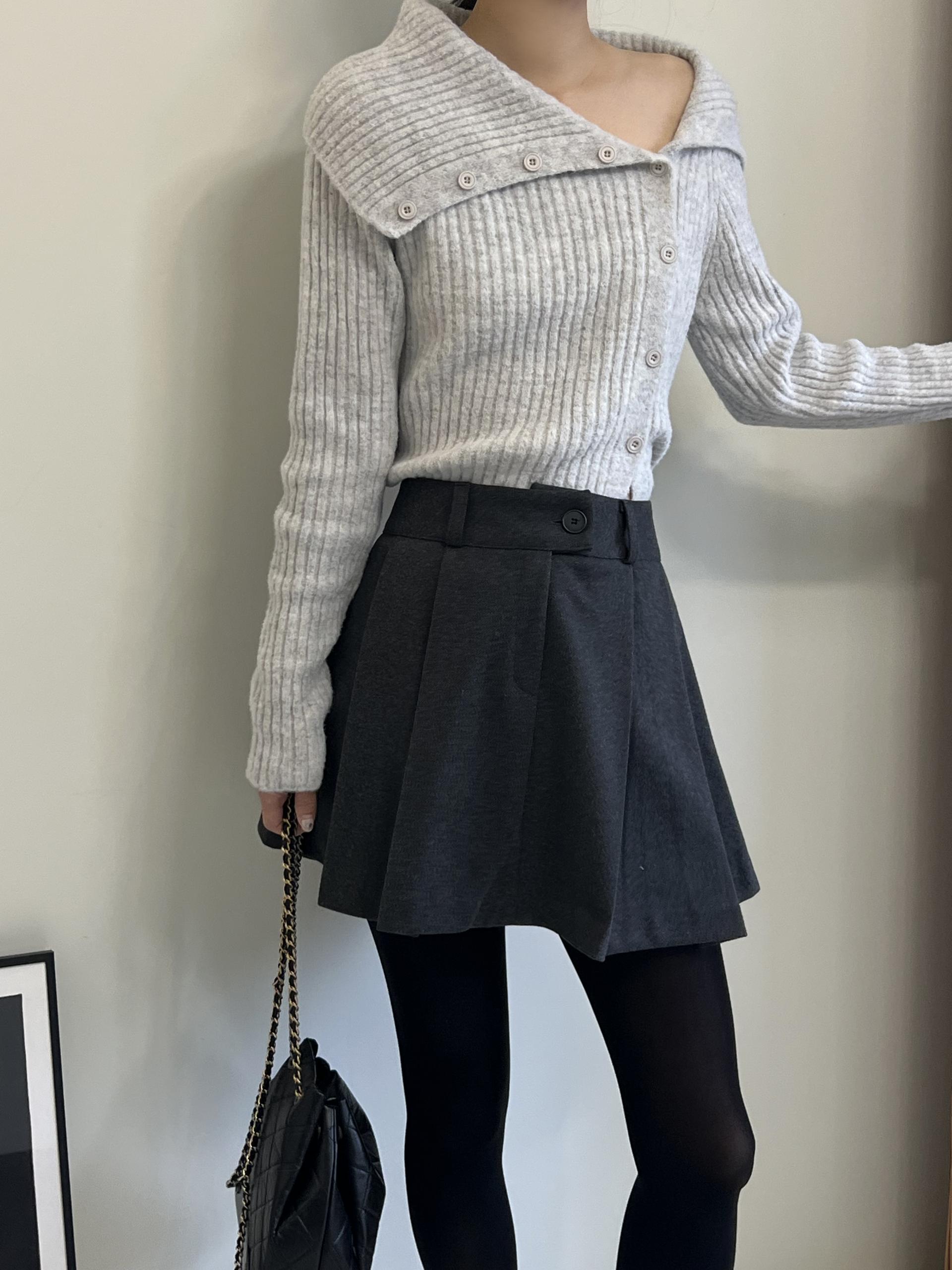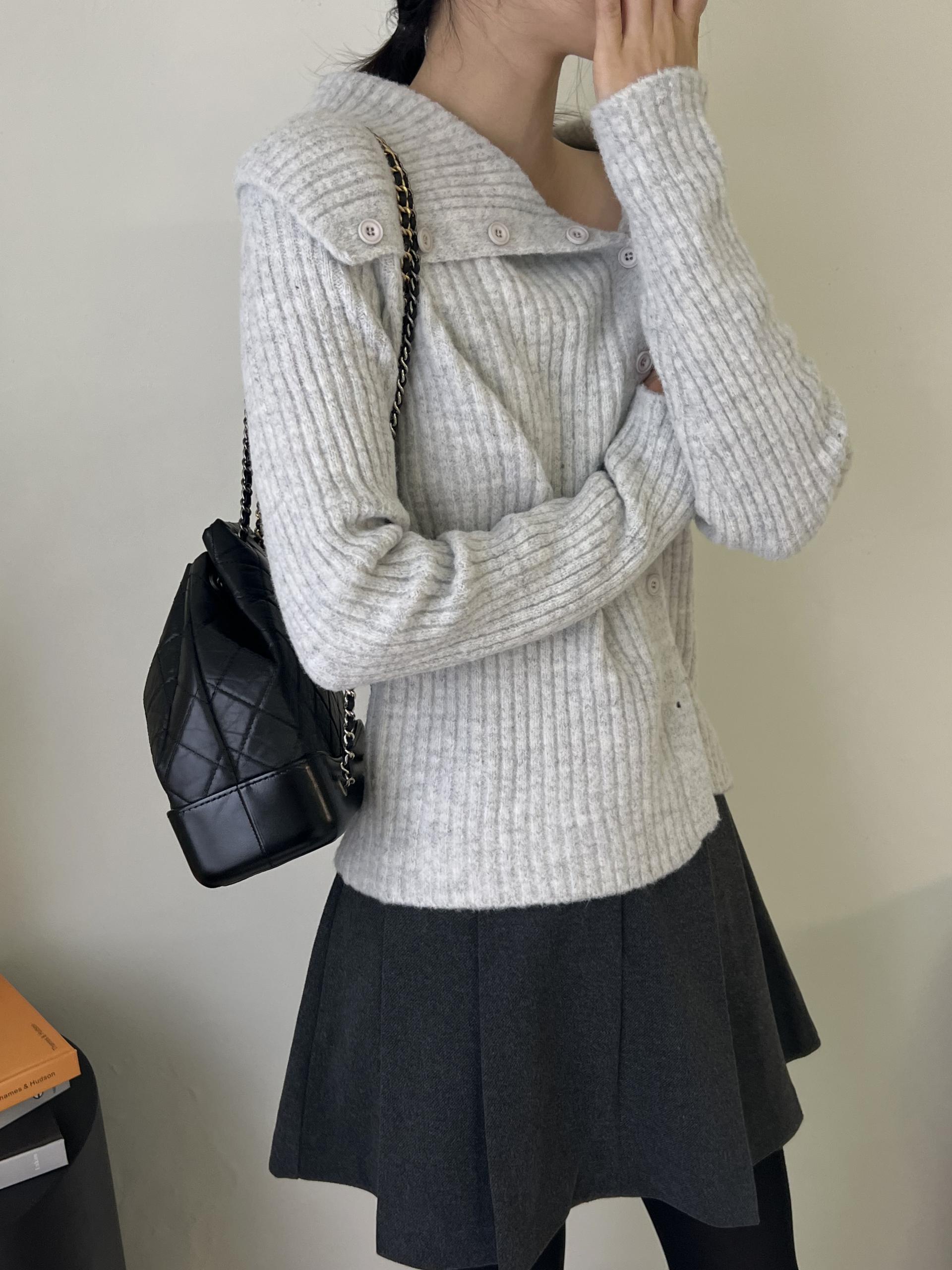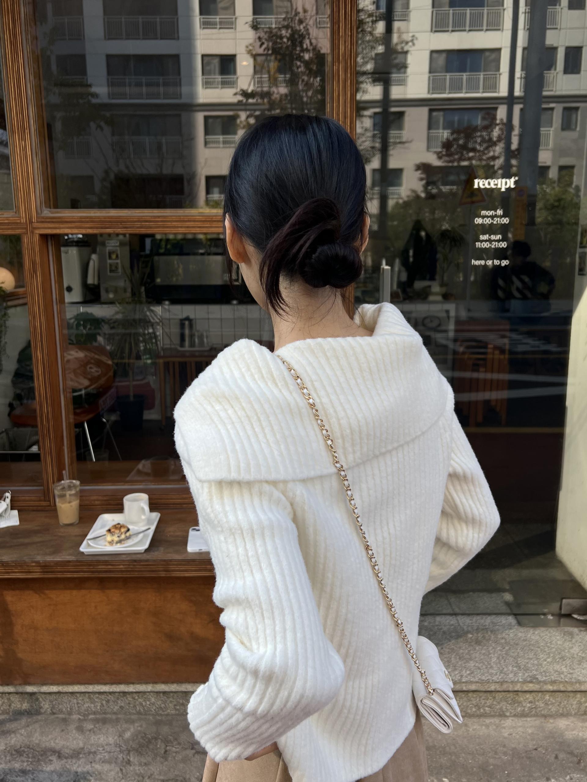사선으로 떨어지는 브이넥이 흔하지 않은 디자인이며, 넥 부분까지 이어지는 단추 디자인도 눈길이 많이 갔던 것 같아요. 쫀쫀한 골지 니트인데, 너무 딱 붙게 슬림 하기보다는 약간 여유가 있으면서 날씬하게 떨어져 더 만족스러웠어요.