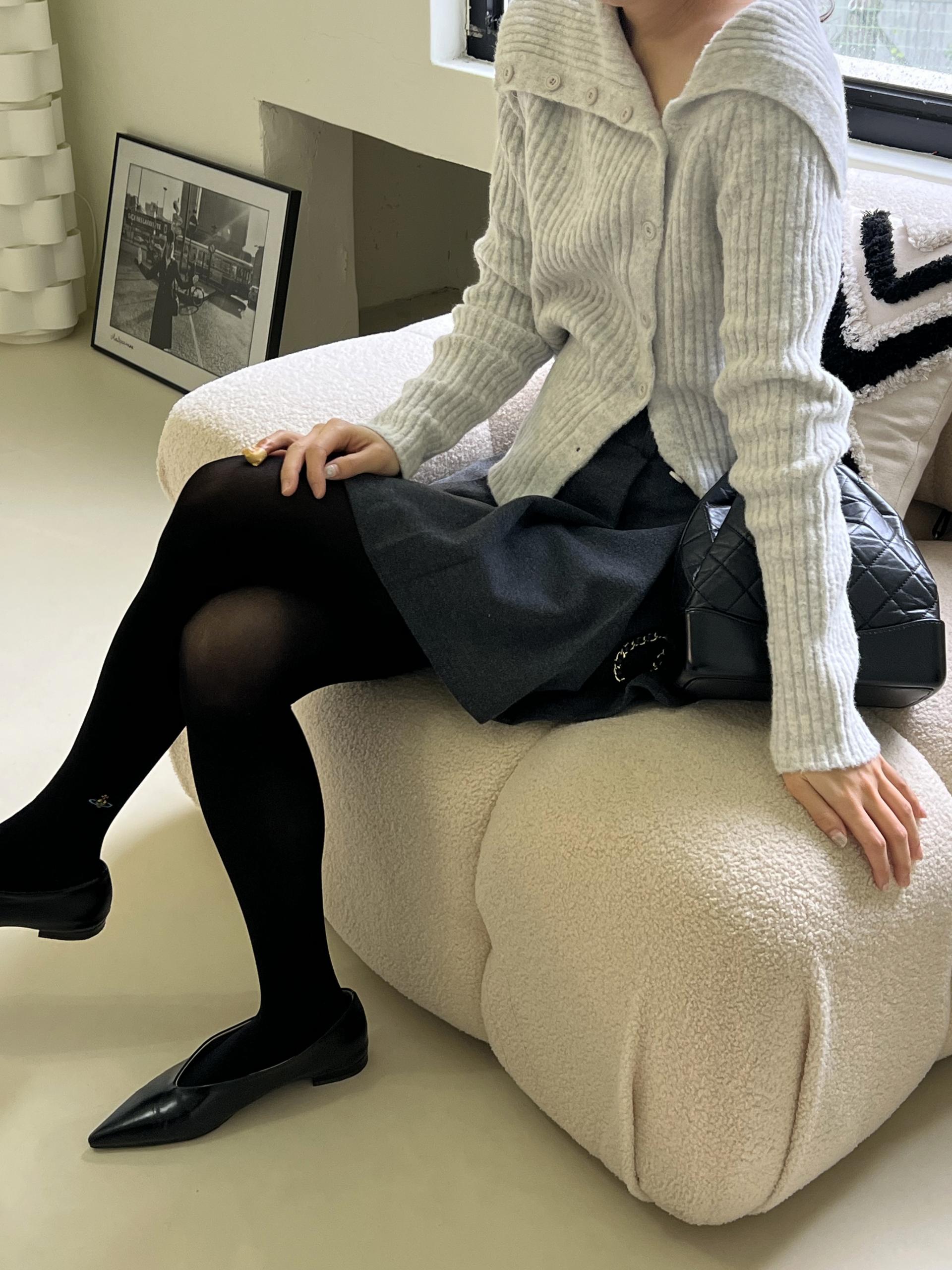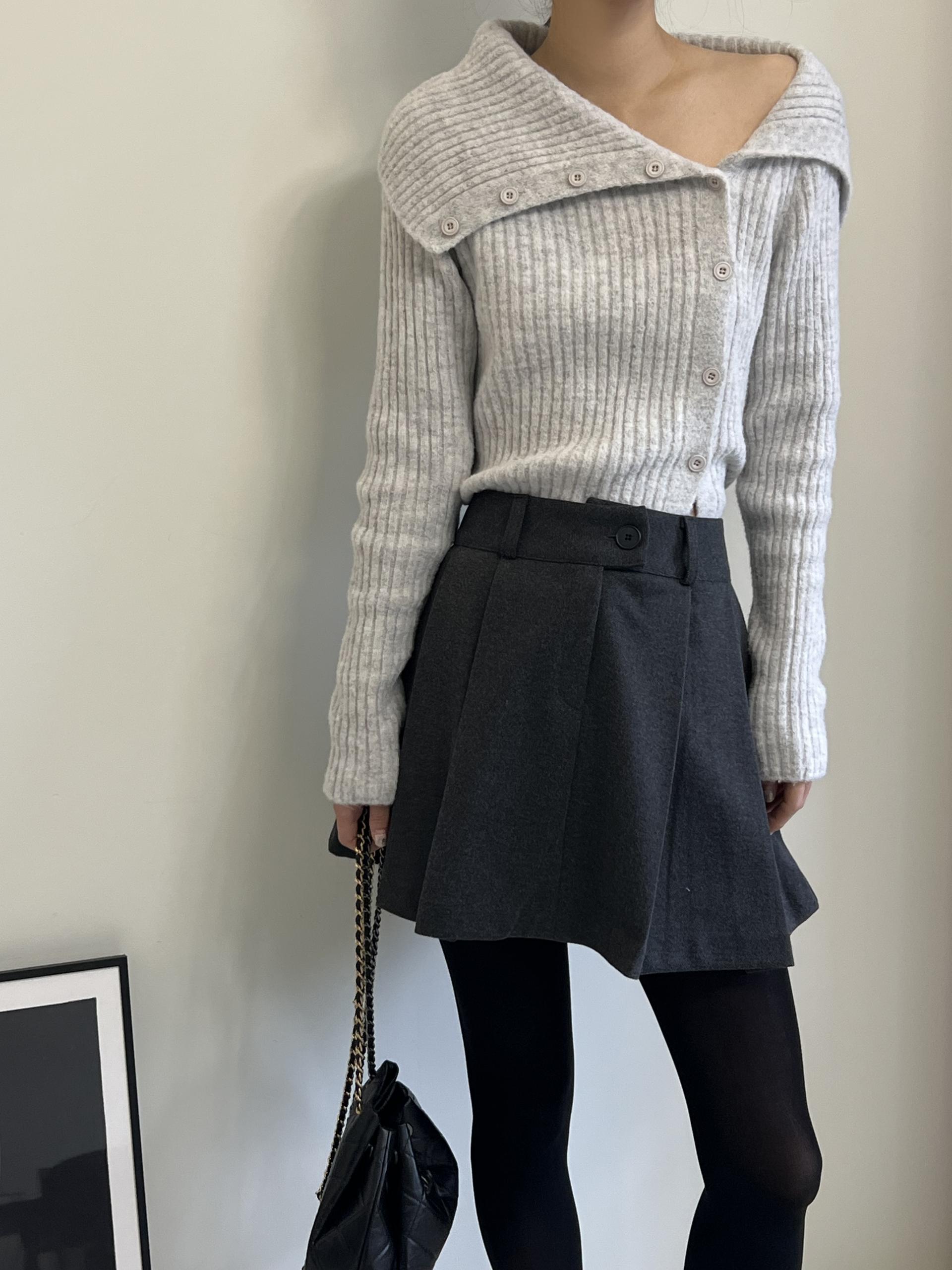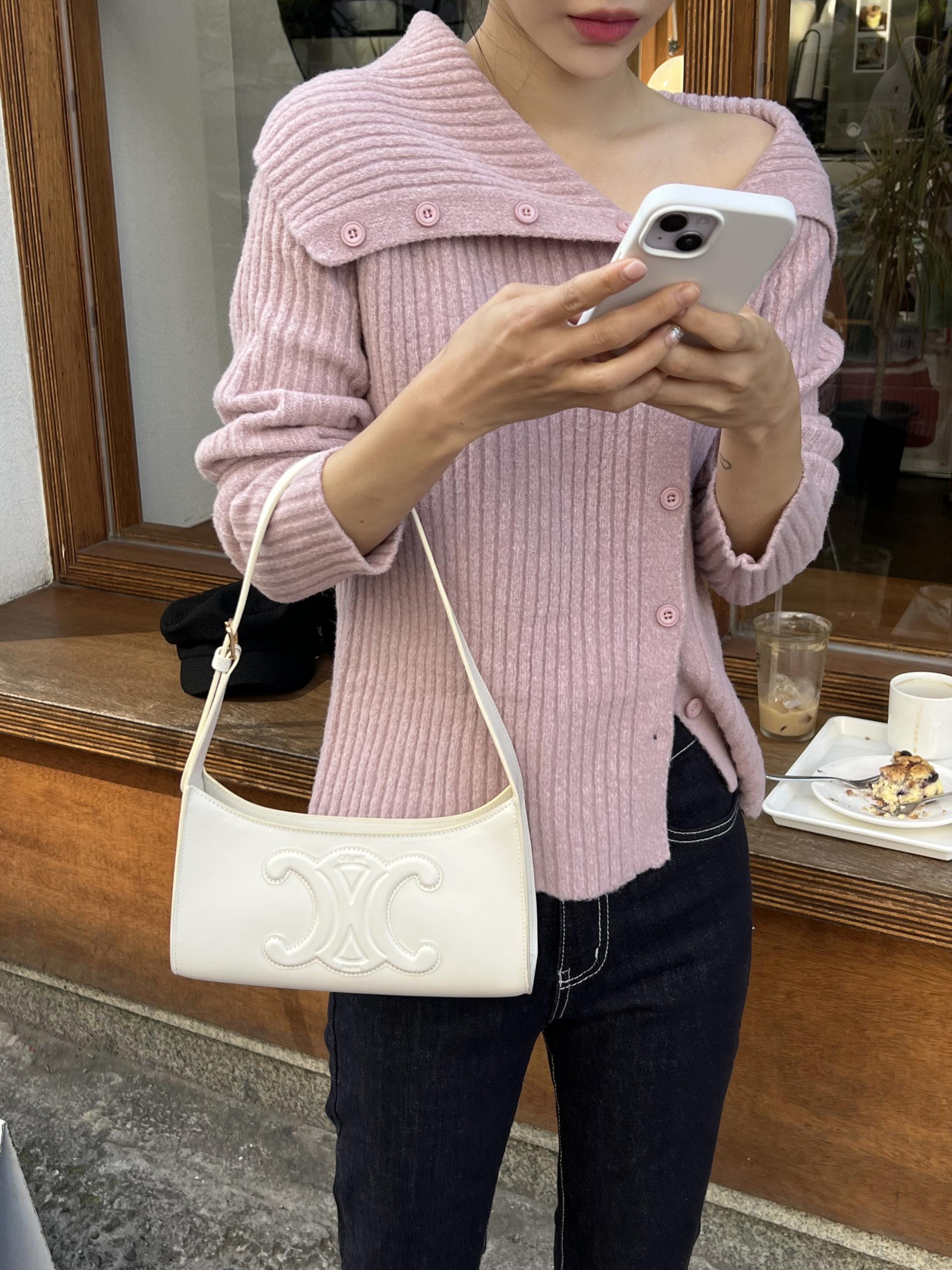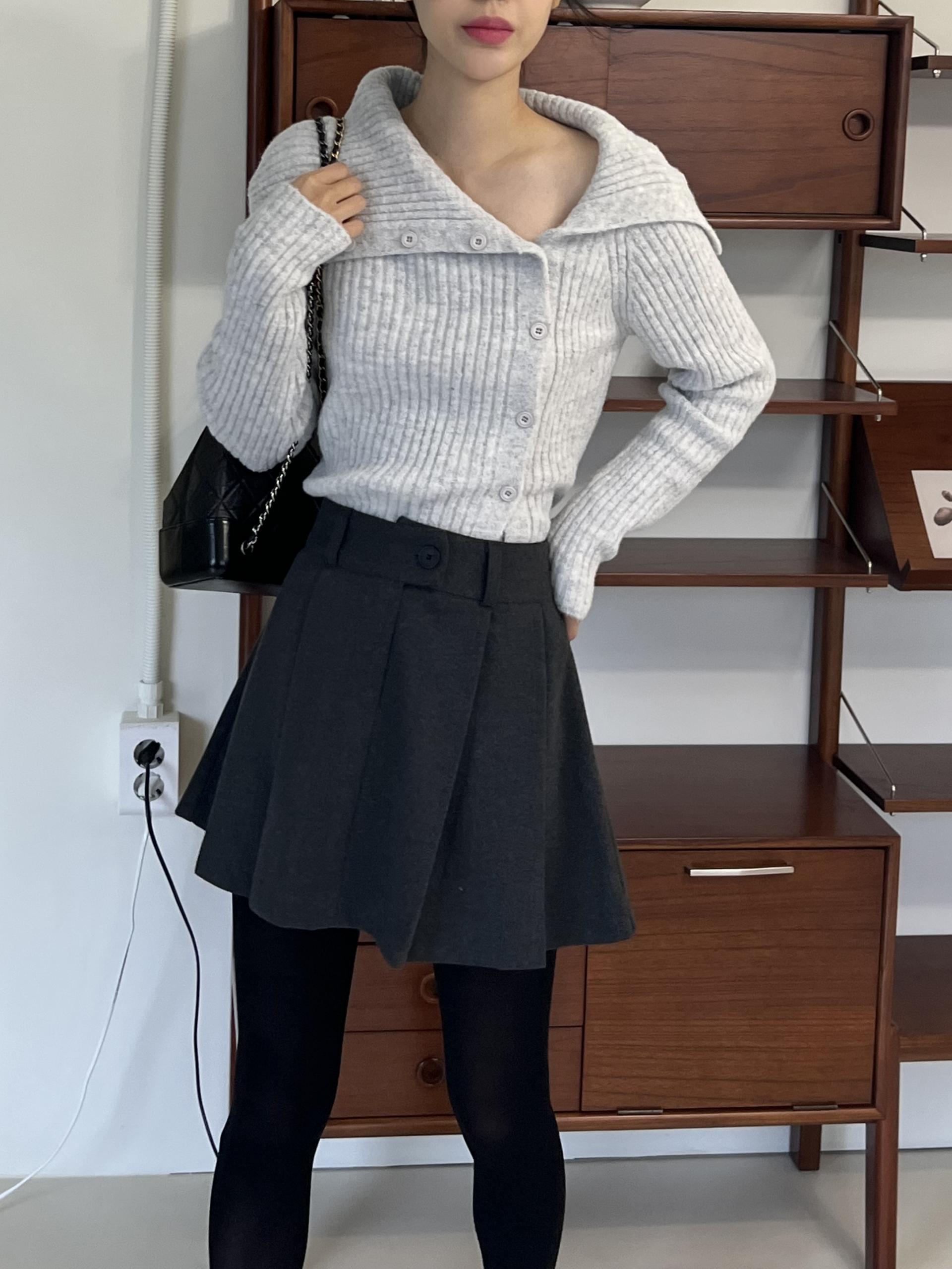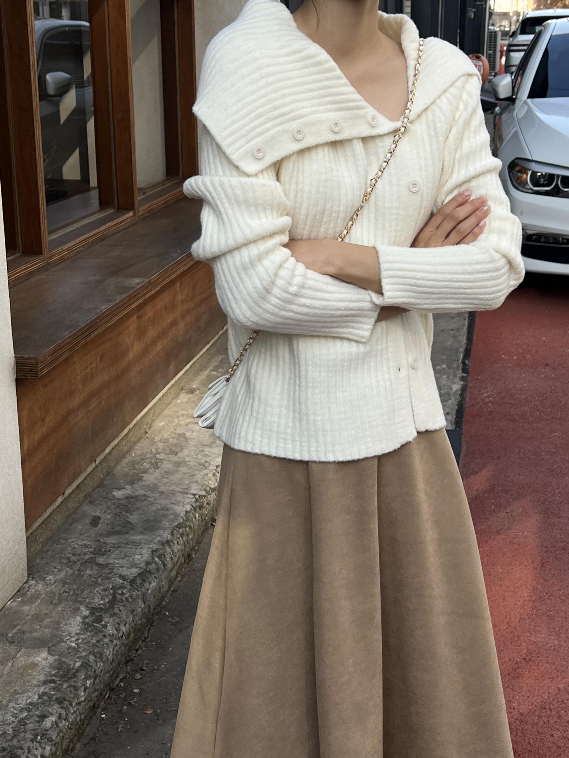사선으로 떨어지는 브이넥이 흔하지 않은 디자인이며, 넥 부분까지 이어지는 단추 디자인도 눈길이 많이 갔던 것 같아요. 쫀쫀한 골지 니트인데, 너무 딱 붙게 슬림 하기보다는 약간 여유가 있으면서 날씬하게 떨어져 더 만족스러웠어요.