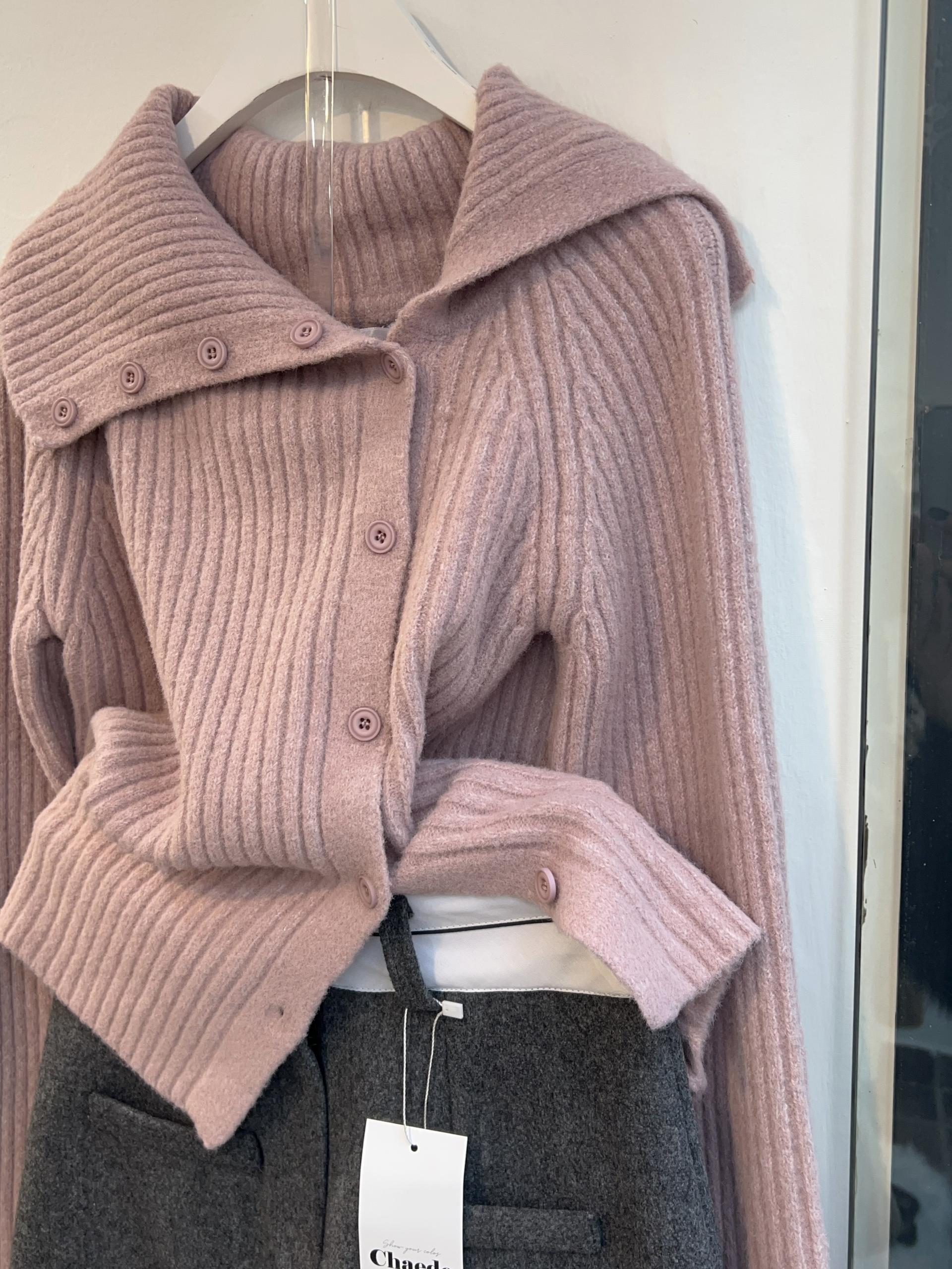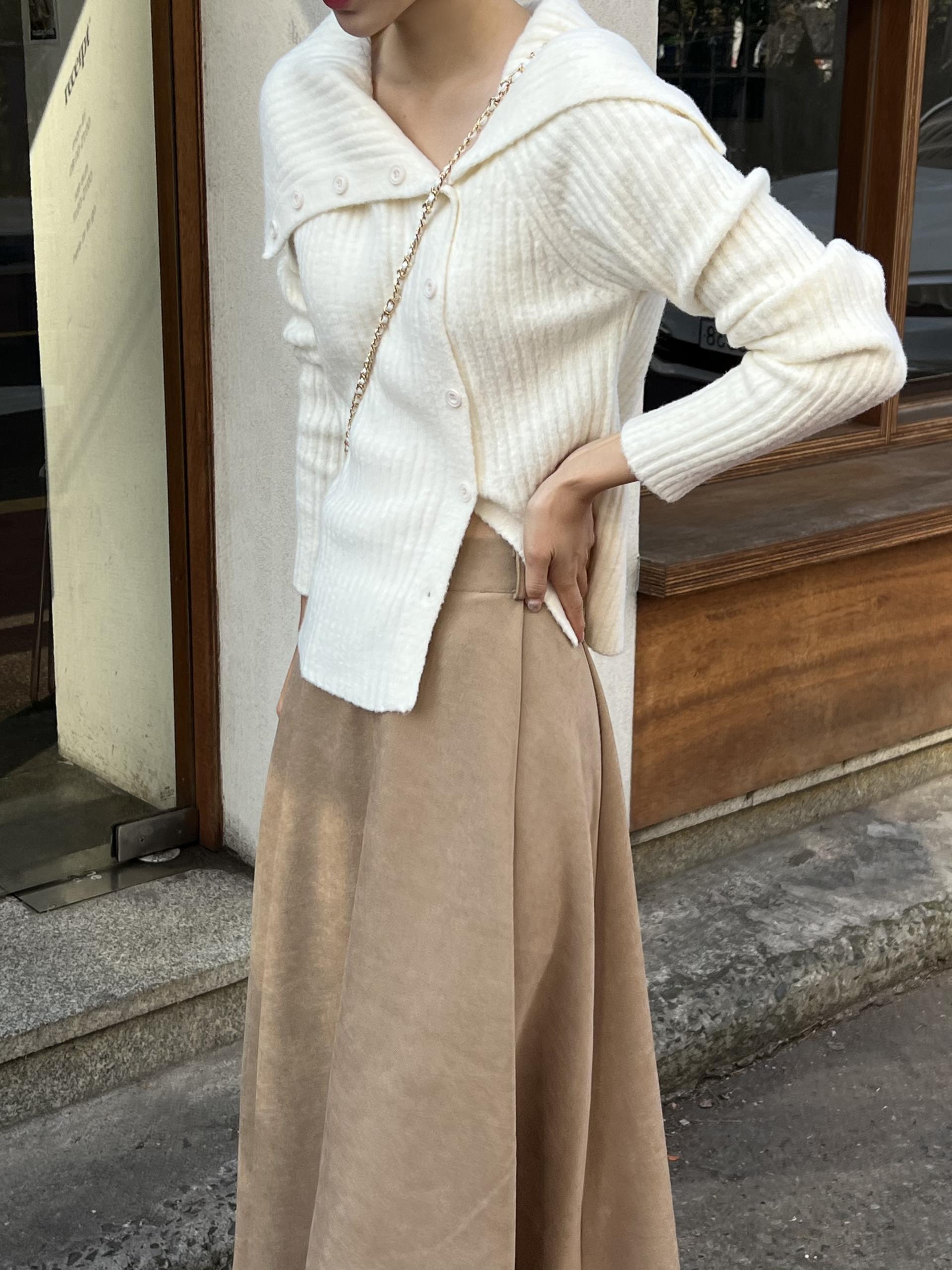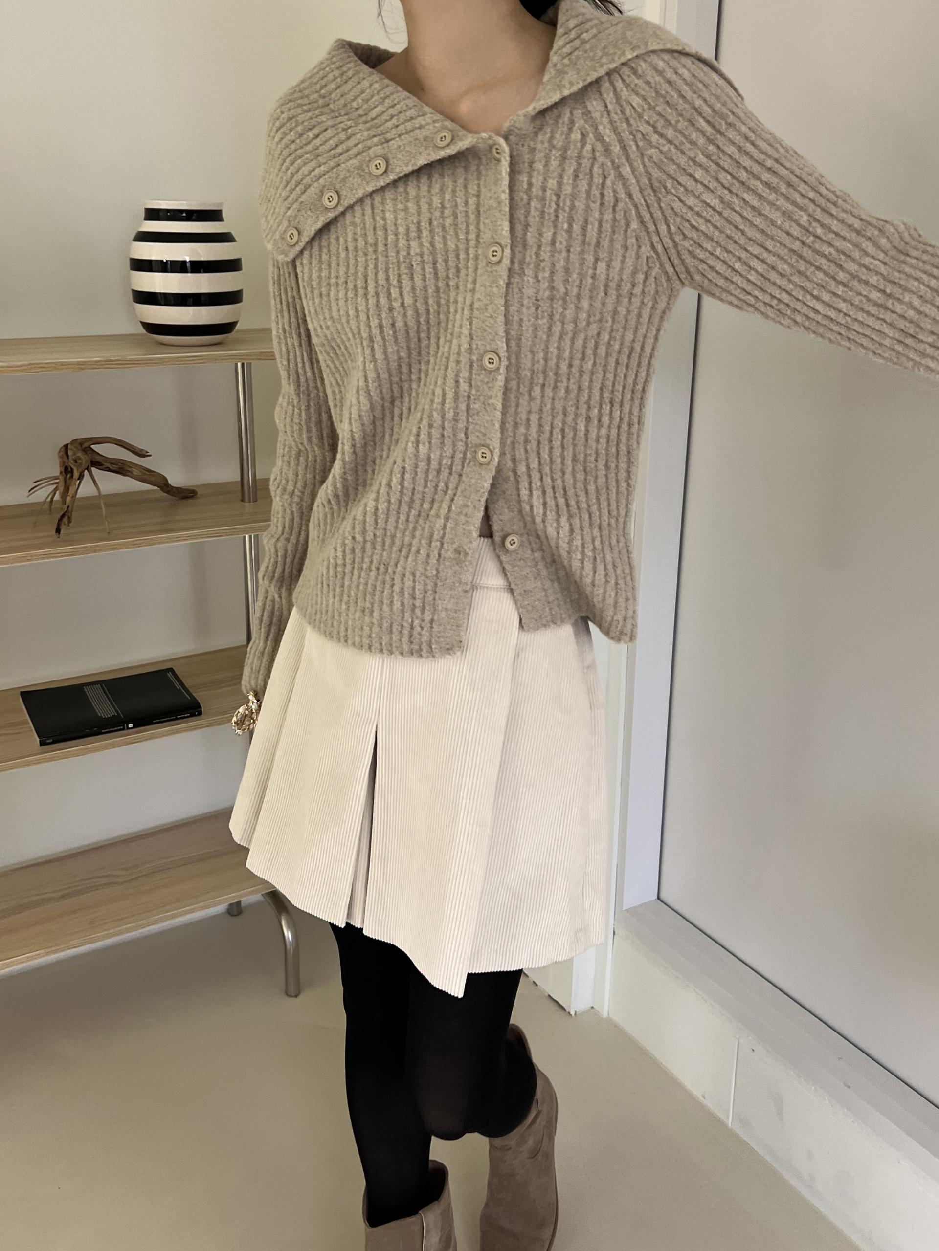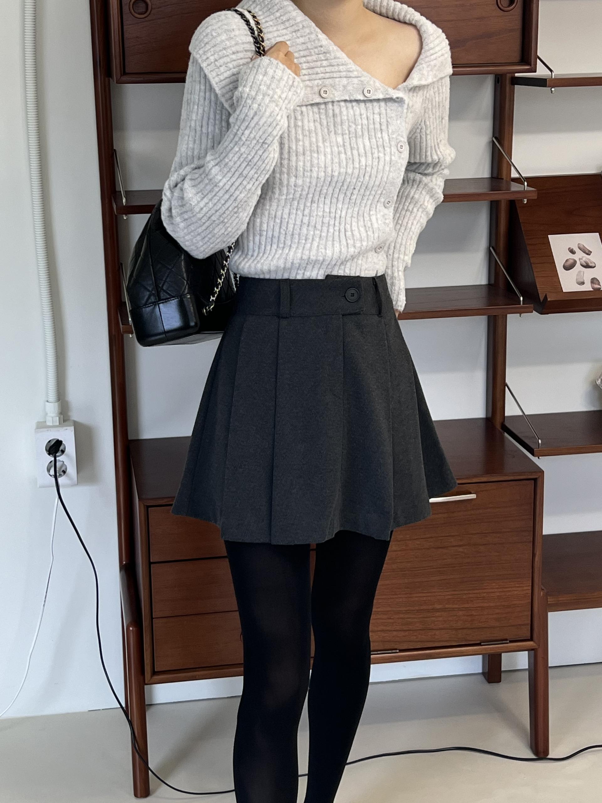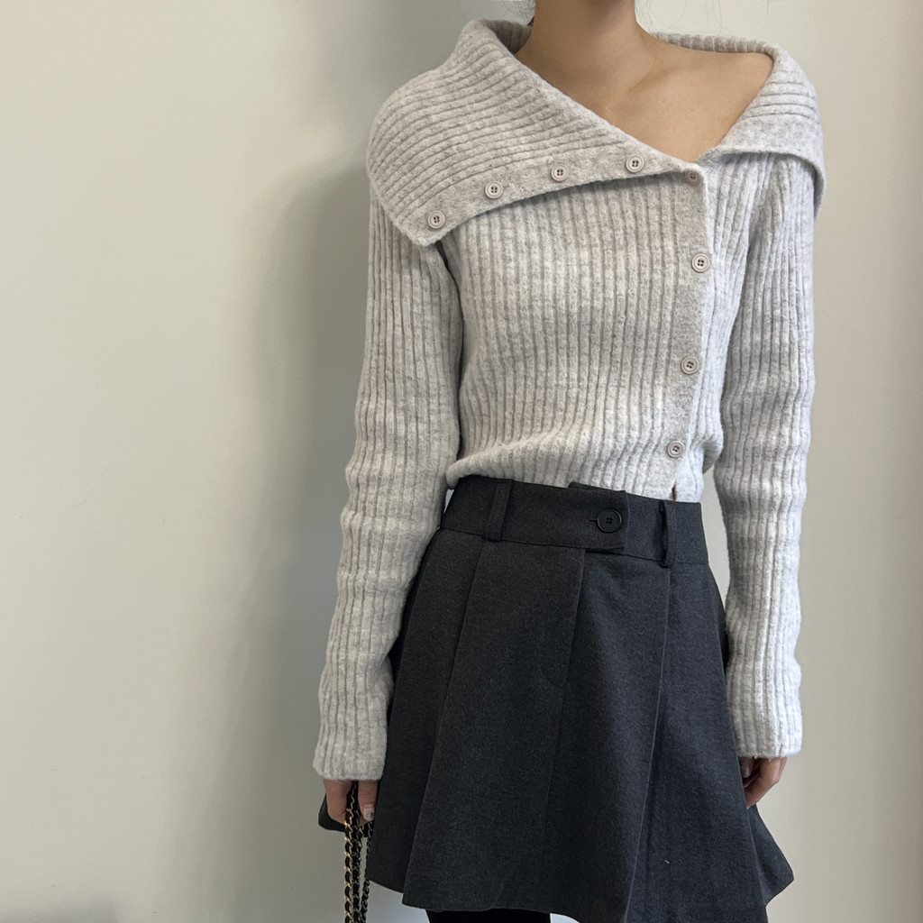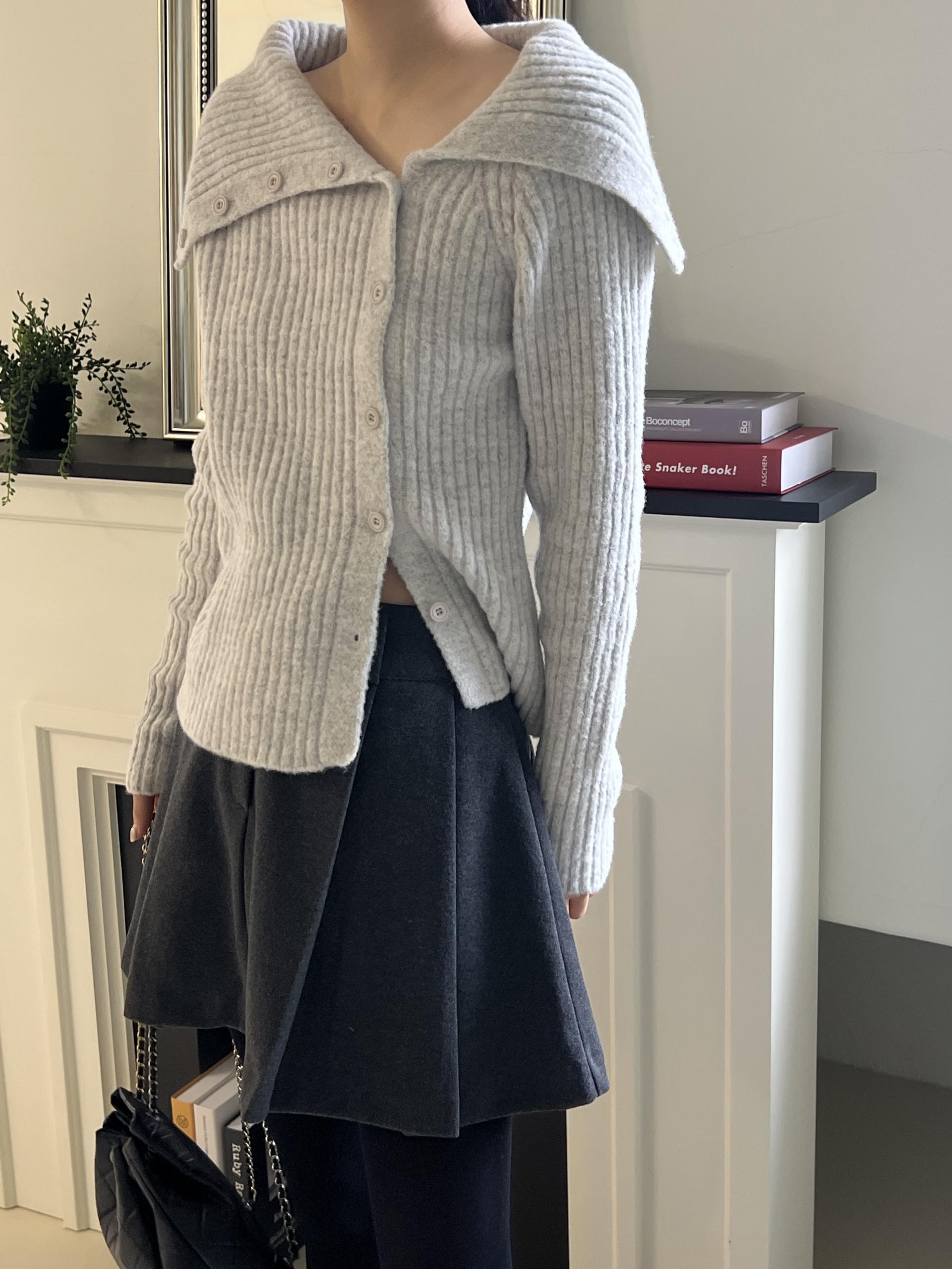 사선으로 떨어지는 브이넥이 흔하지 않은 디자인이며, 넥 부분까지 이어지는 단추 디자인도 눈길이 많이 갔던 것 같아요. 쫀쫀한 골지 니트인데, 너무 딱 붙게 슬림 하기보다는 약간 여유가 있으면서 날씬하게 떨어져 더 만족스러웠어요.