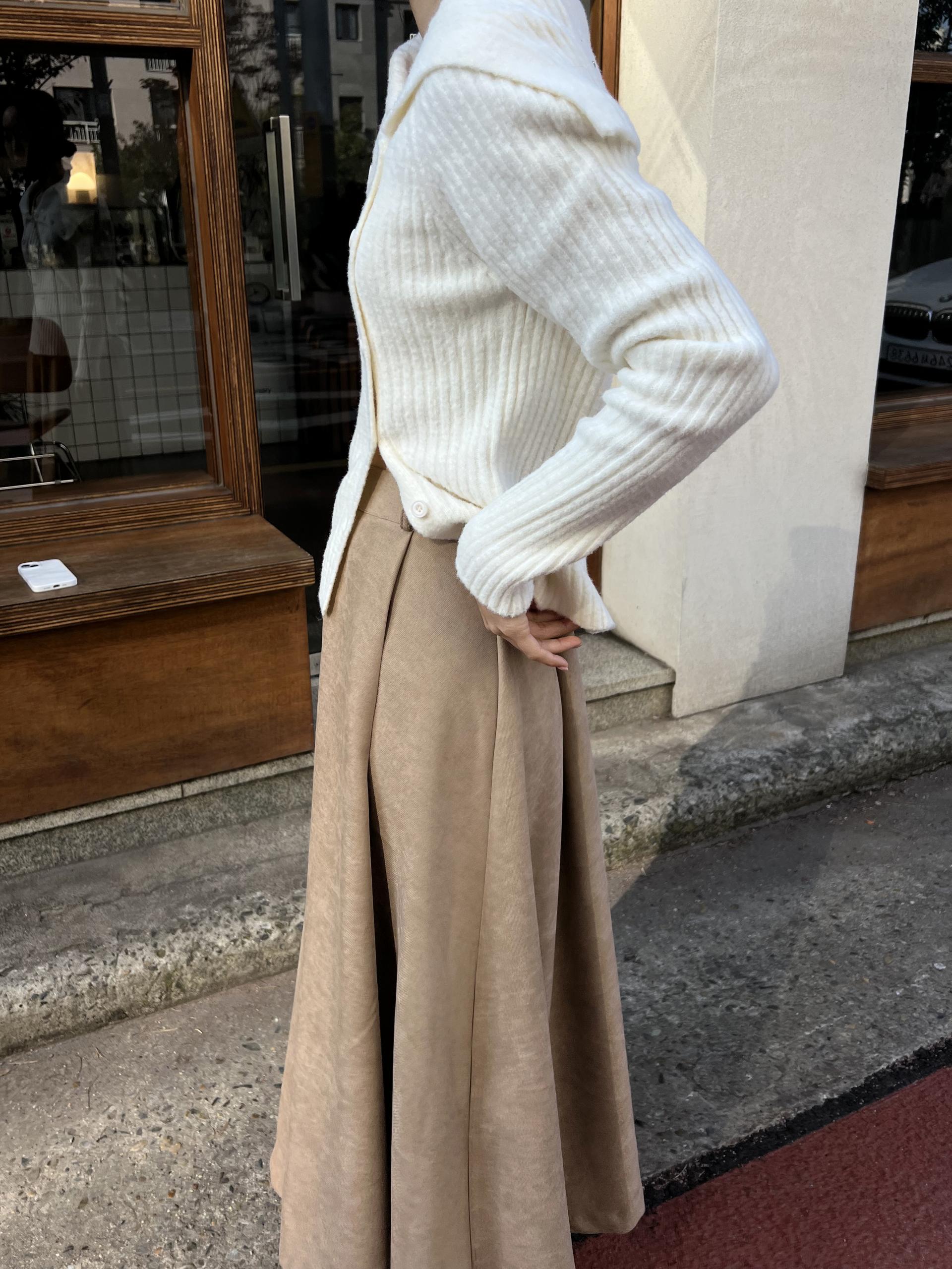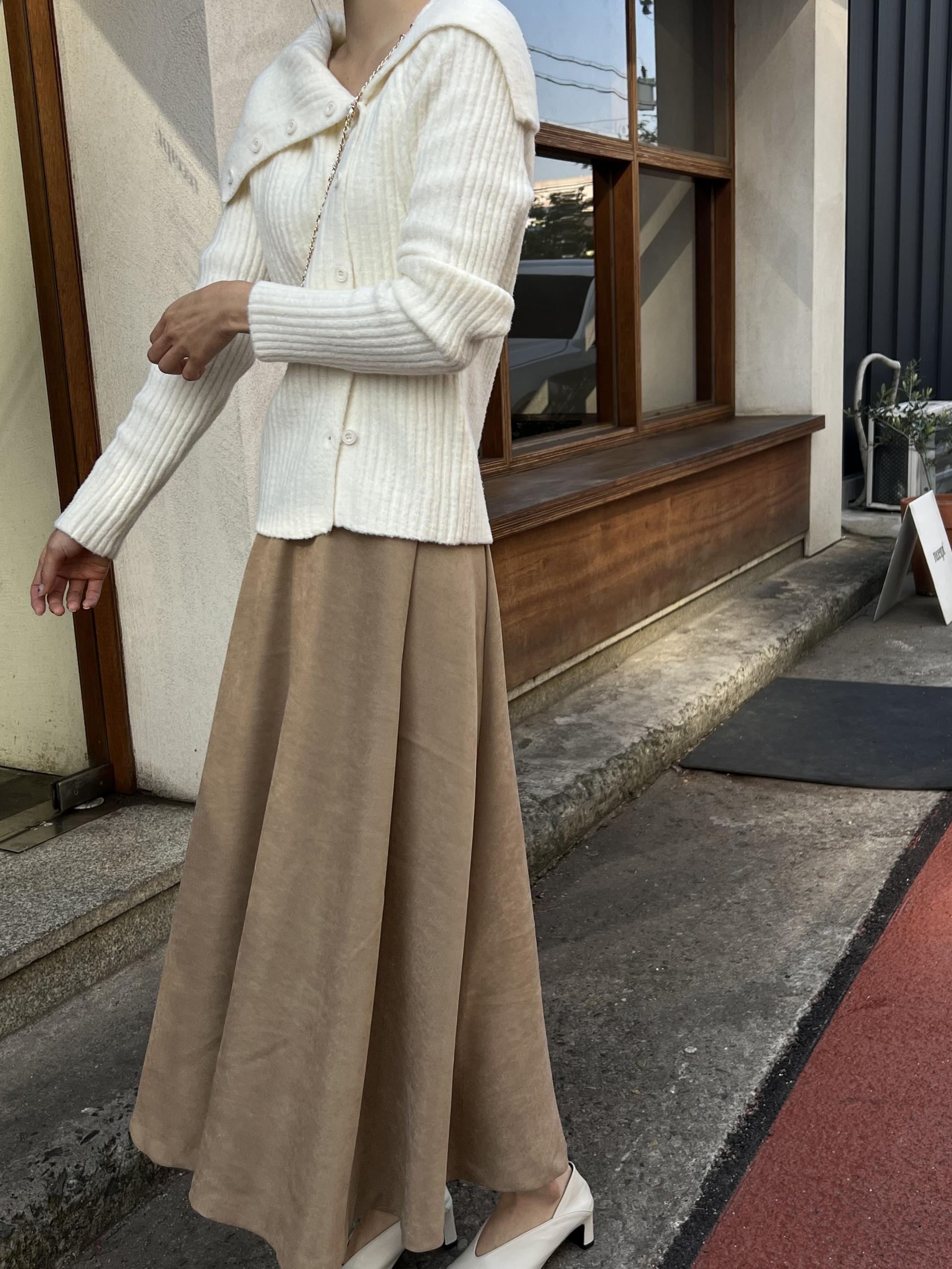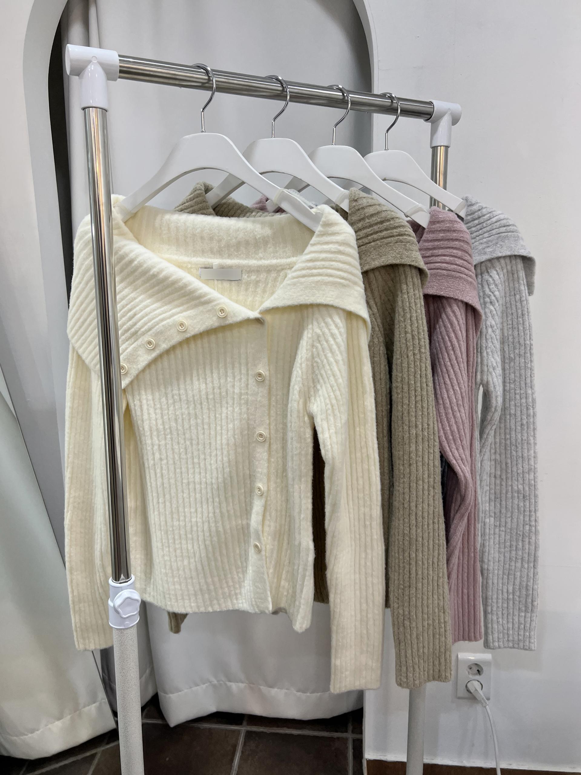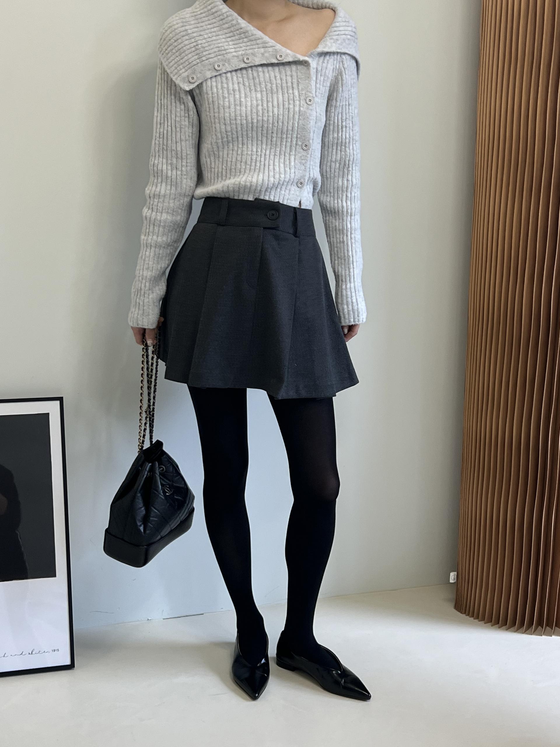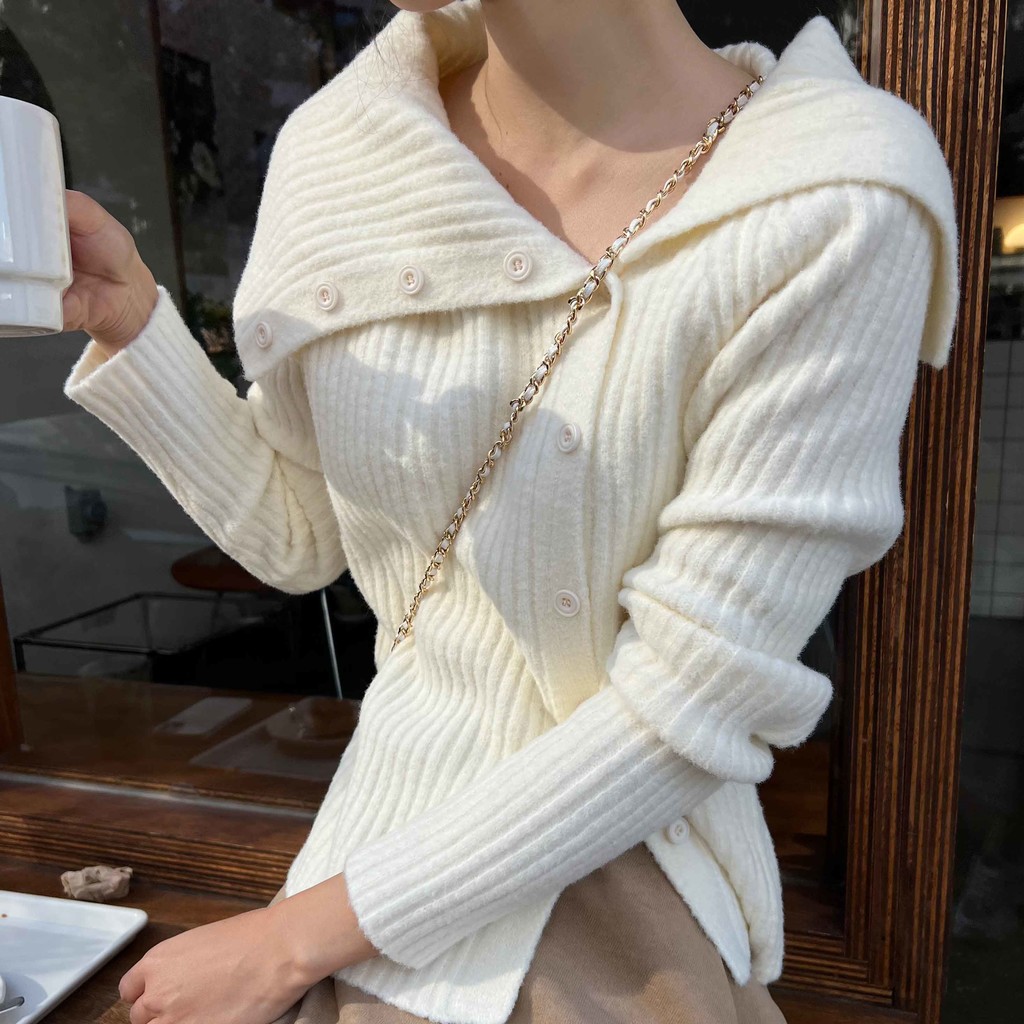 사선으로 떨어지는 브이넥이 흔하지 않은 디자인이며, 넥 부분까지 이어지는 단추 디자인도 눈길이 많이 갔던 것 같아요. 쫀쫀한 골지 니트인데, 너무 딱 붙게 슬림 하기보다는 약간 여유가 있으면서 날씬하게 떨어져 더 만족스러웠어요.