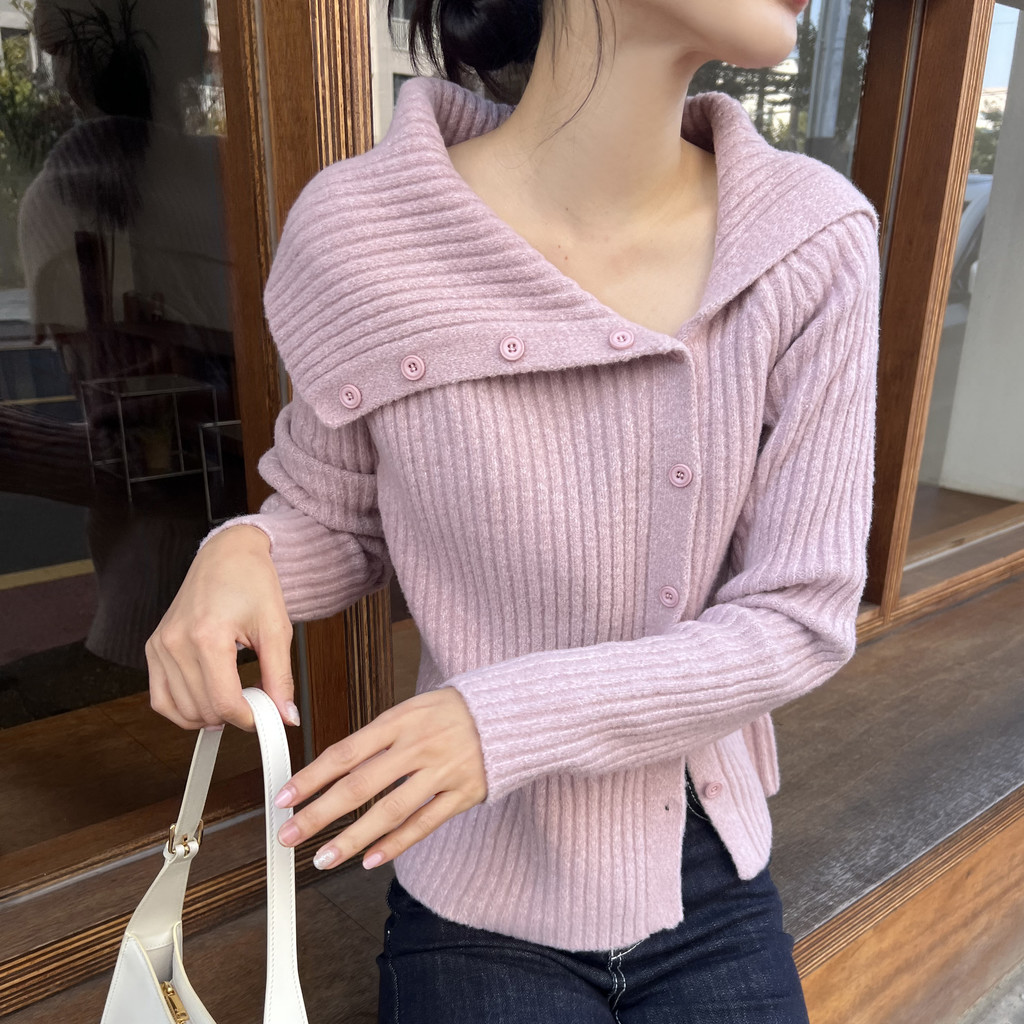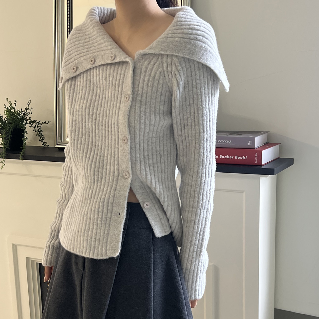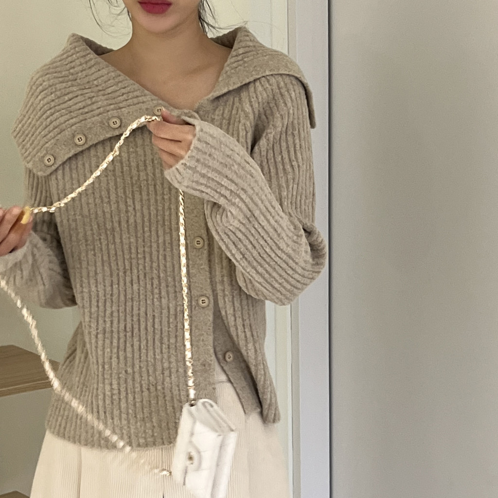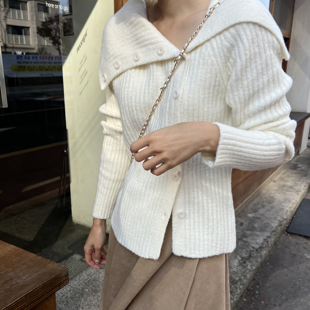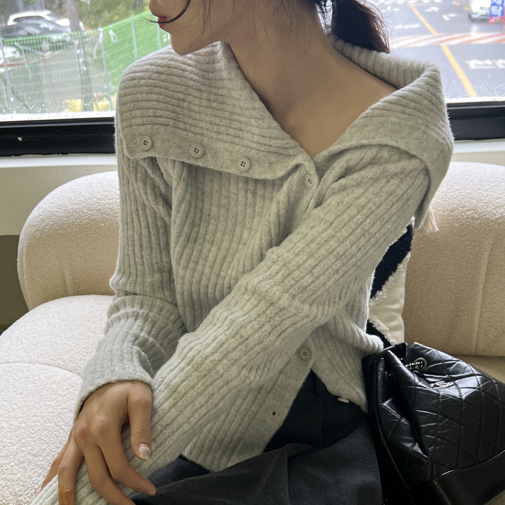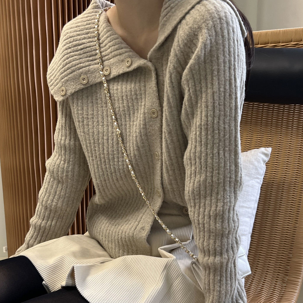 사선으로 떨어지는 브이넥이 흔하지 않은 디자인이며, 넥 부분까지 이어지는 단추 디자인도 눈길이 많이 갔던 것 같아요. 쫀쫀한 골지 니트인데, 너무 딱 붙게 슬림 하기보다는 약간 여유가 있으면서 날씬하게 떨어져 더 만족스러웠어요.