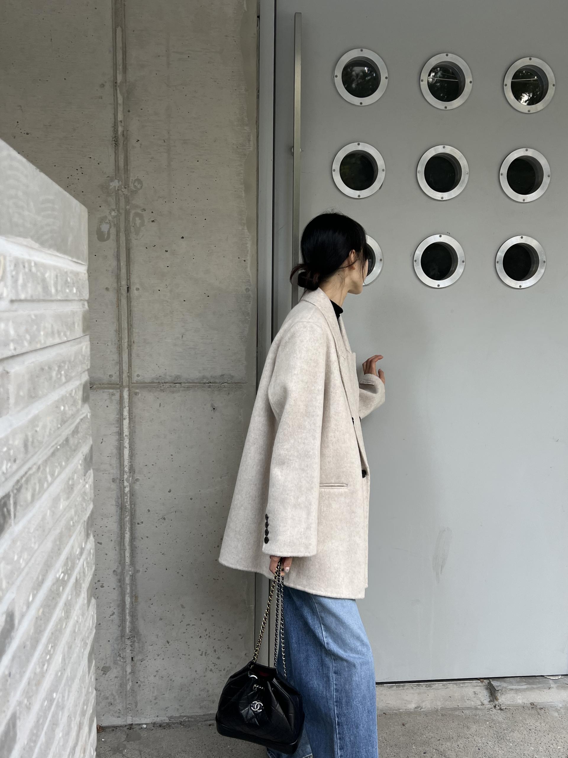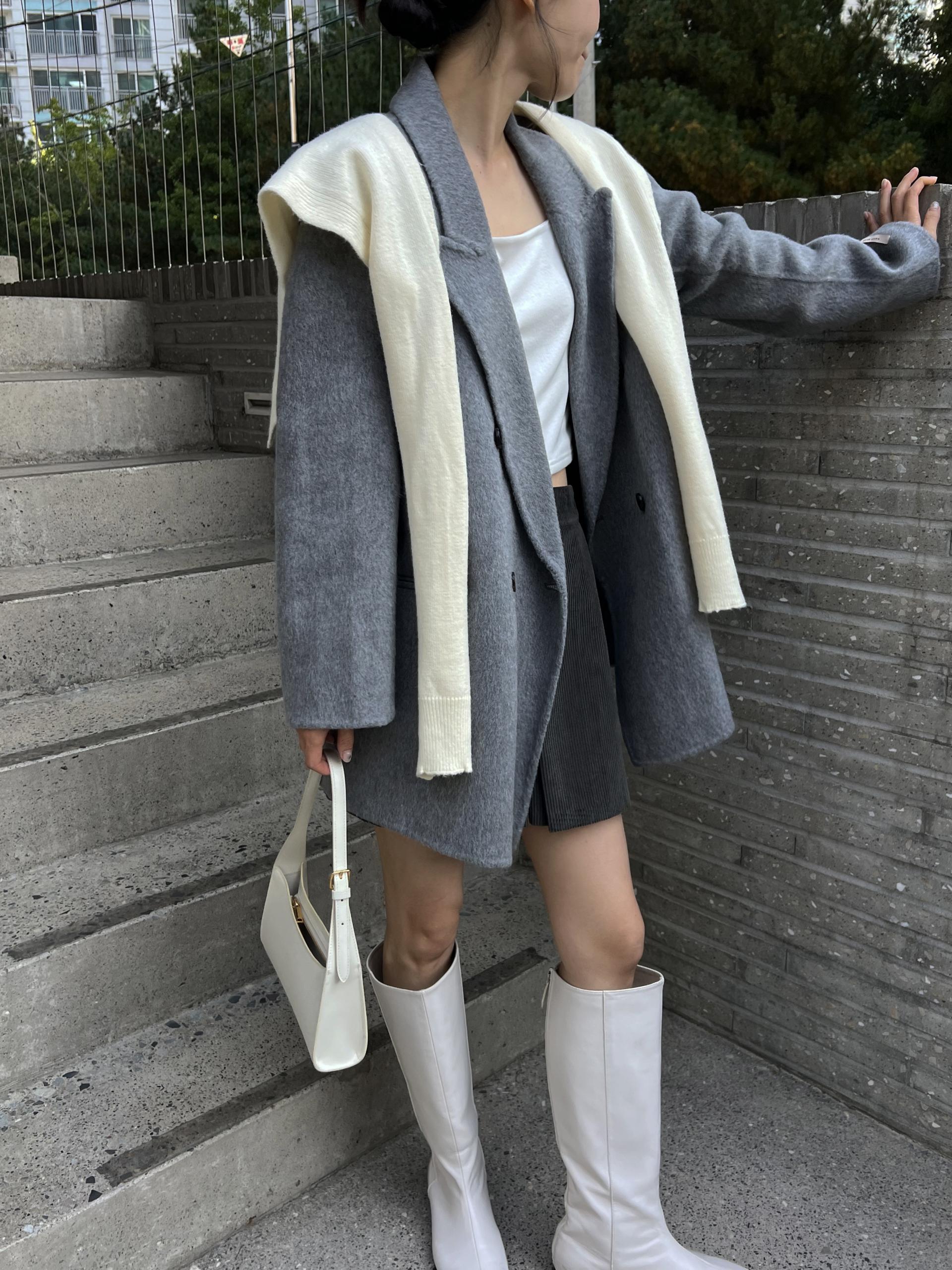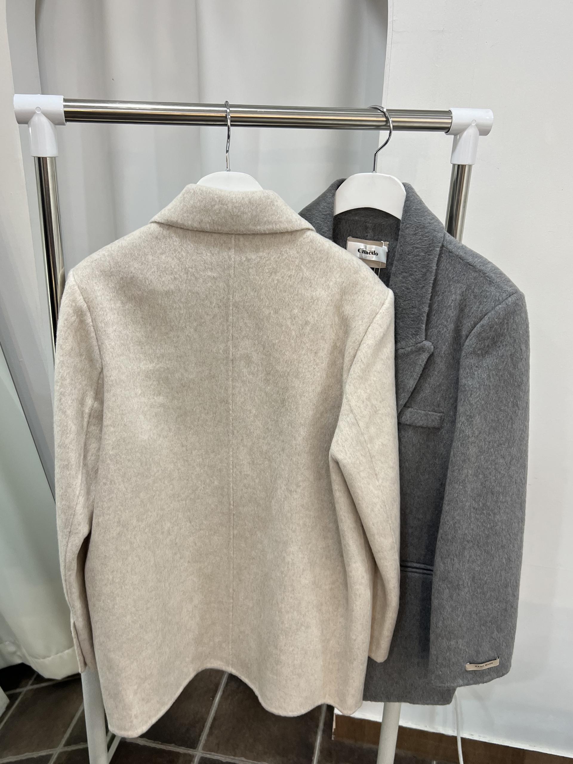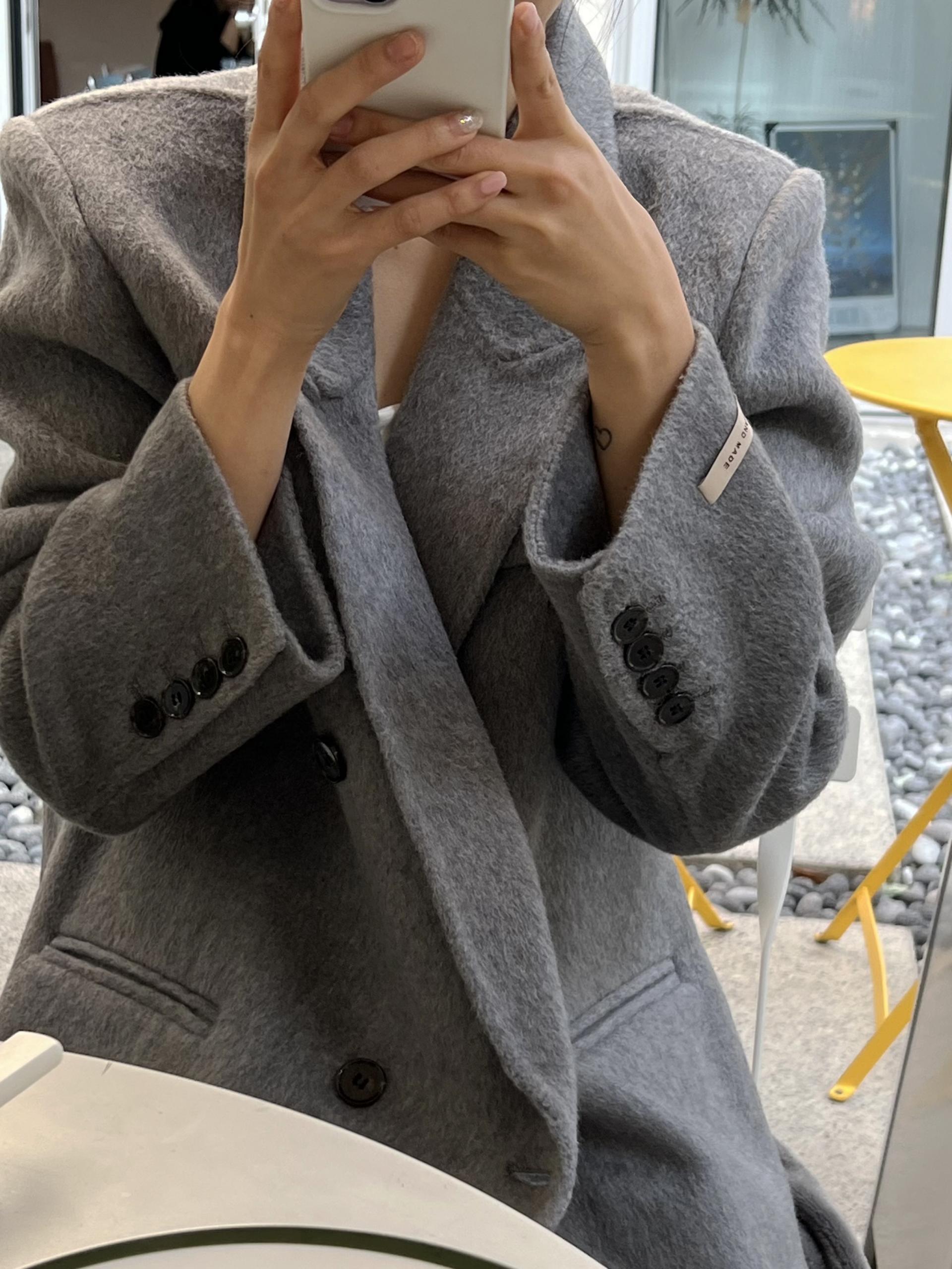 더블 버튼과 각 잡힌 어깨 라인으로 더욱 클래식한 디자인의 하프 자켓이며, 루즈한 실루엣과 엉덩이를 덮는 기장감으로 겨울 시즌 활용도가 높은 아우터입니다.