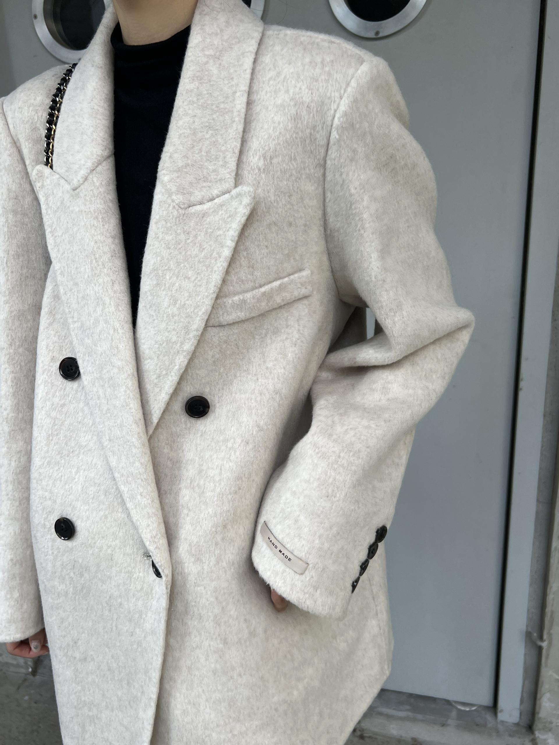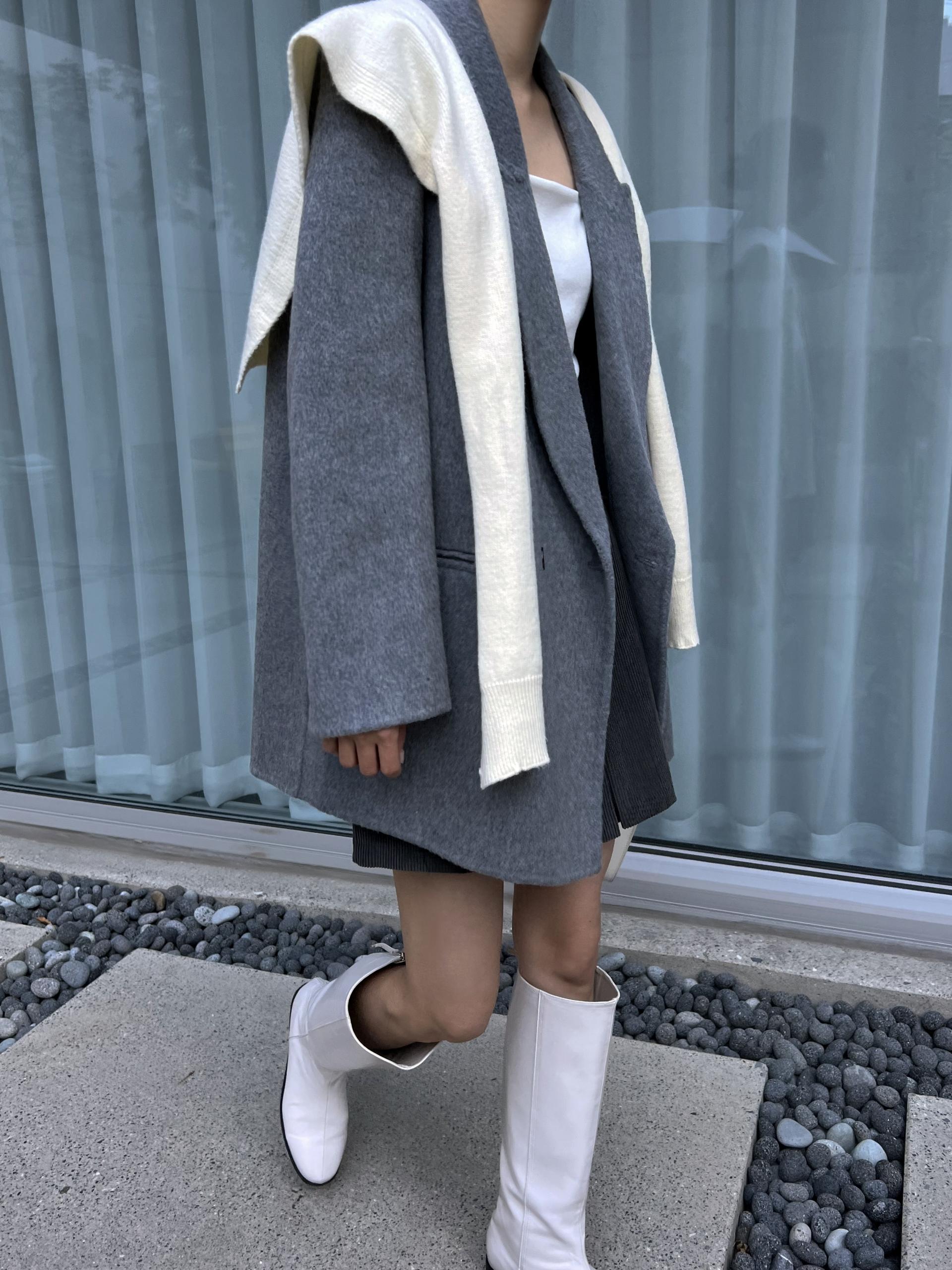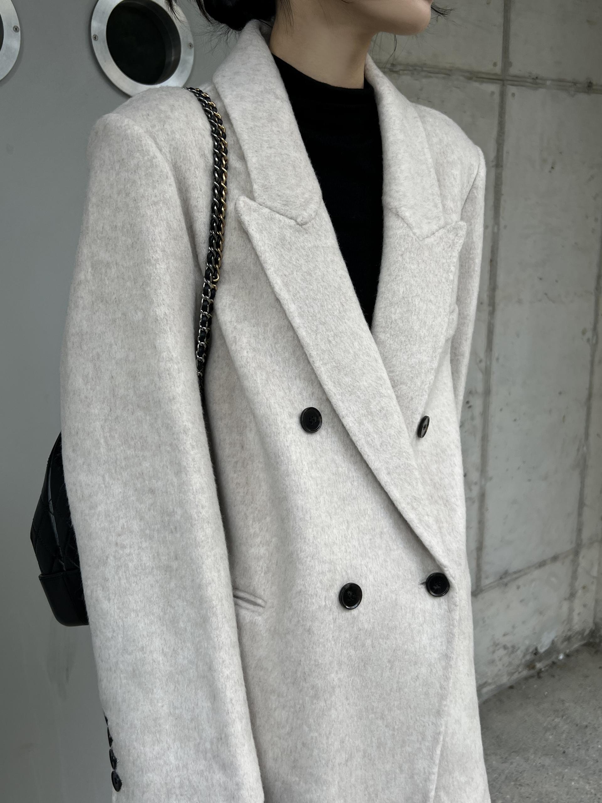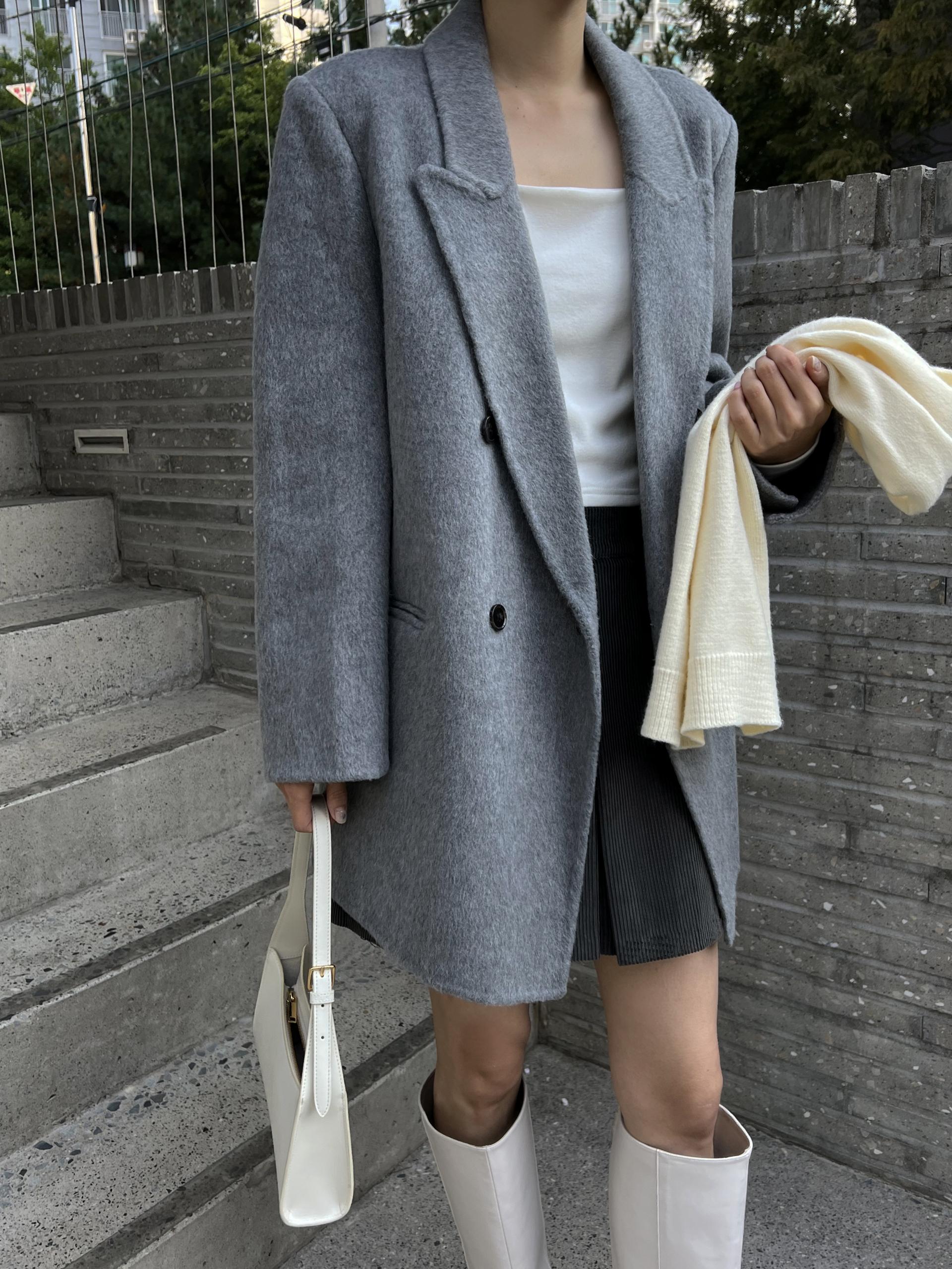 더블 버튼과 각 잡힌 어깨 라인으로 더욱 클래식한 디자인의 하프 자켓이며, 루즈한 실루엣과 엉덩이를 덮는 기장감으로 겨울 시즌 활용도가 높은 아우터입니다.