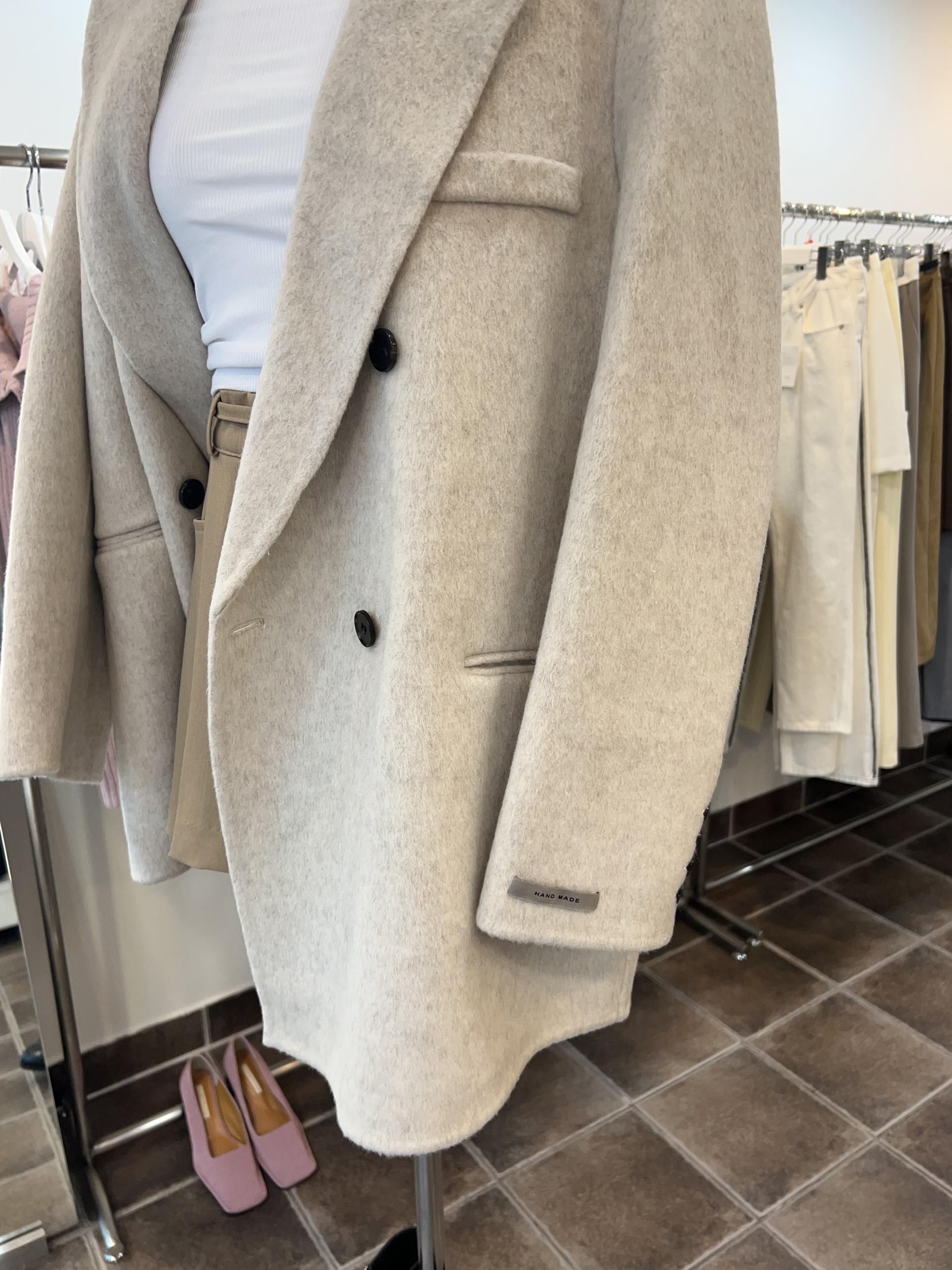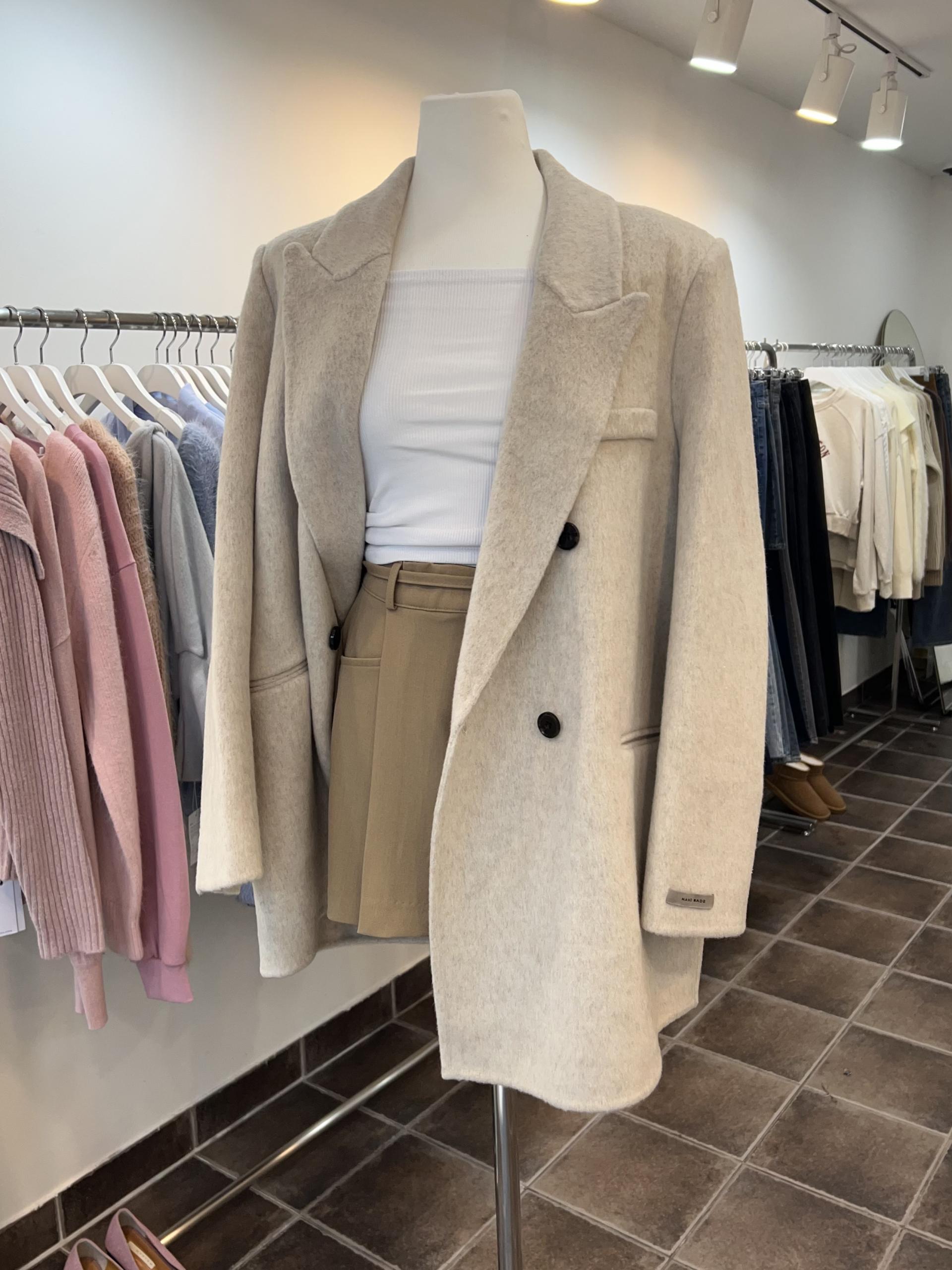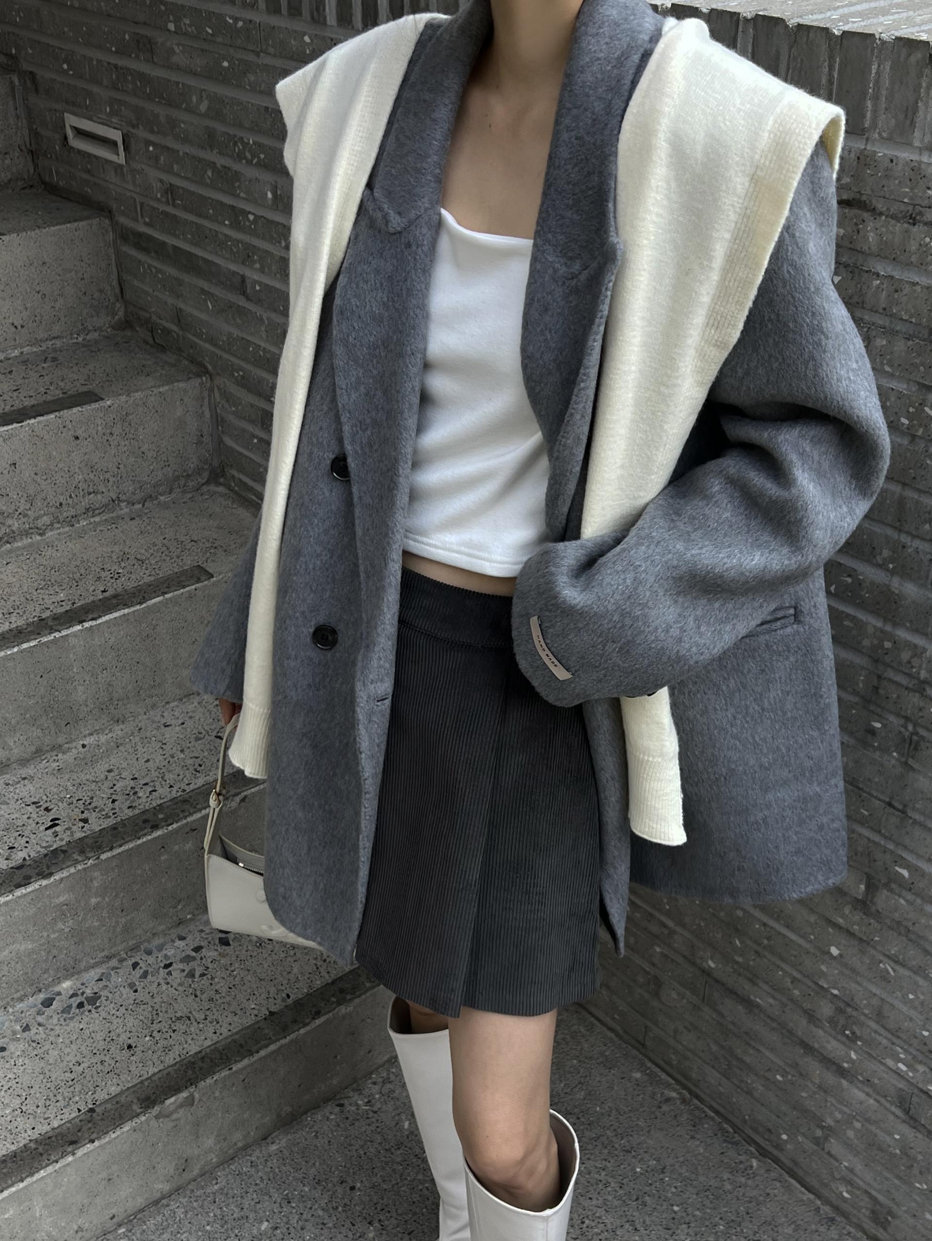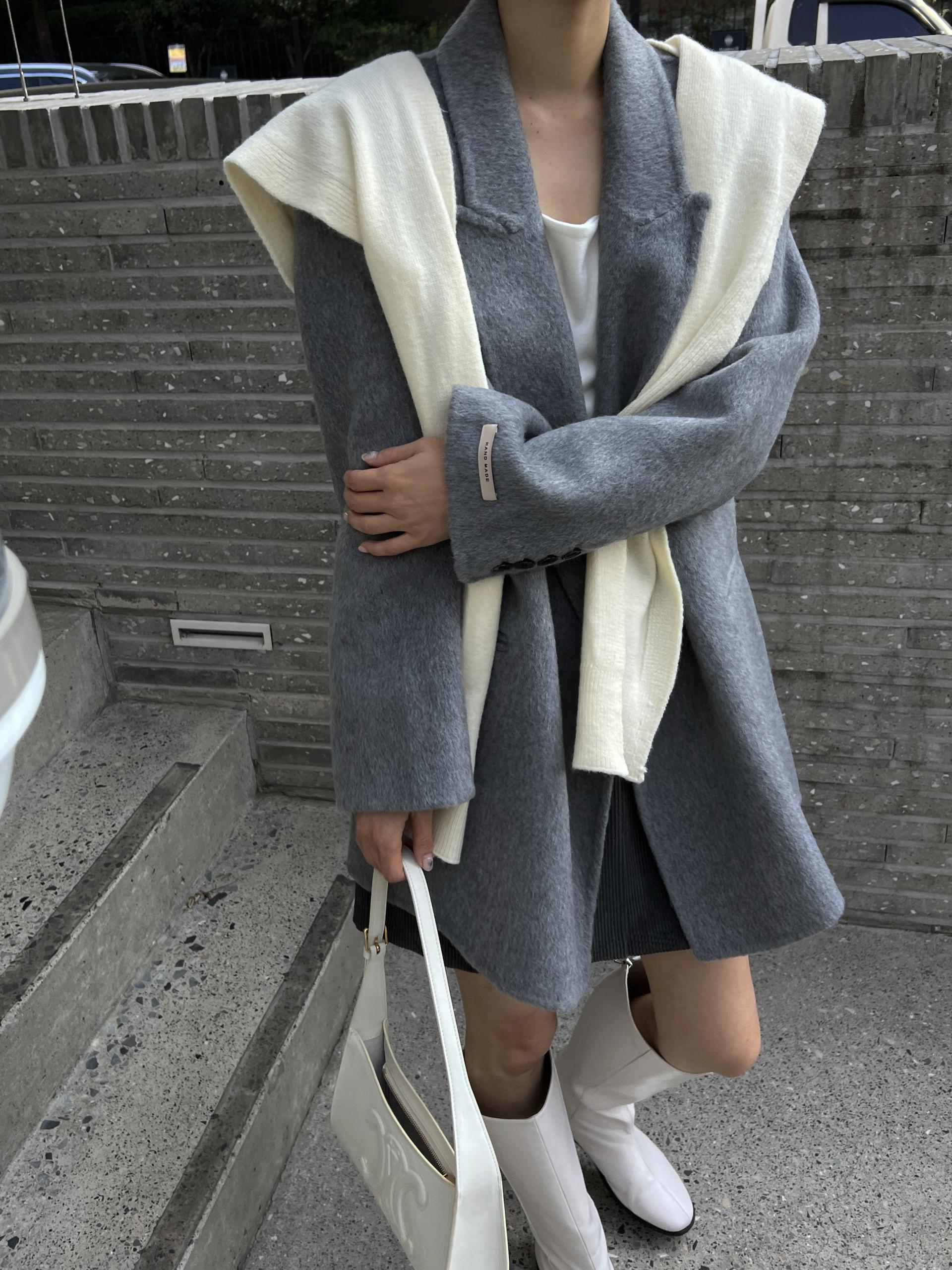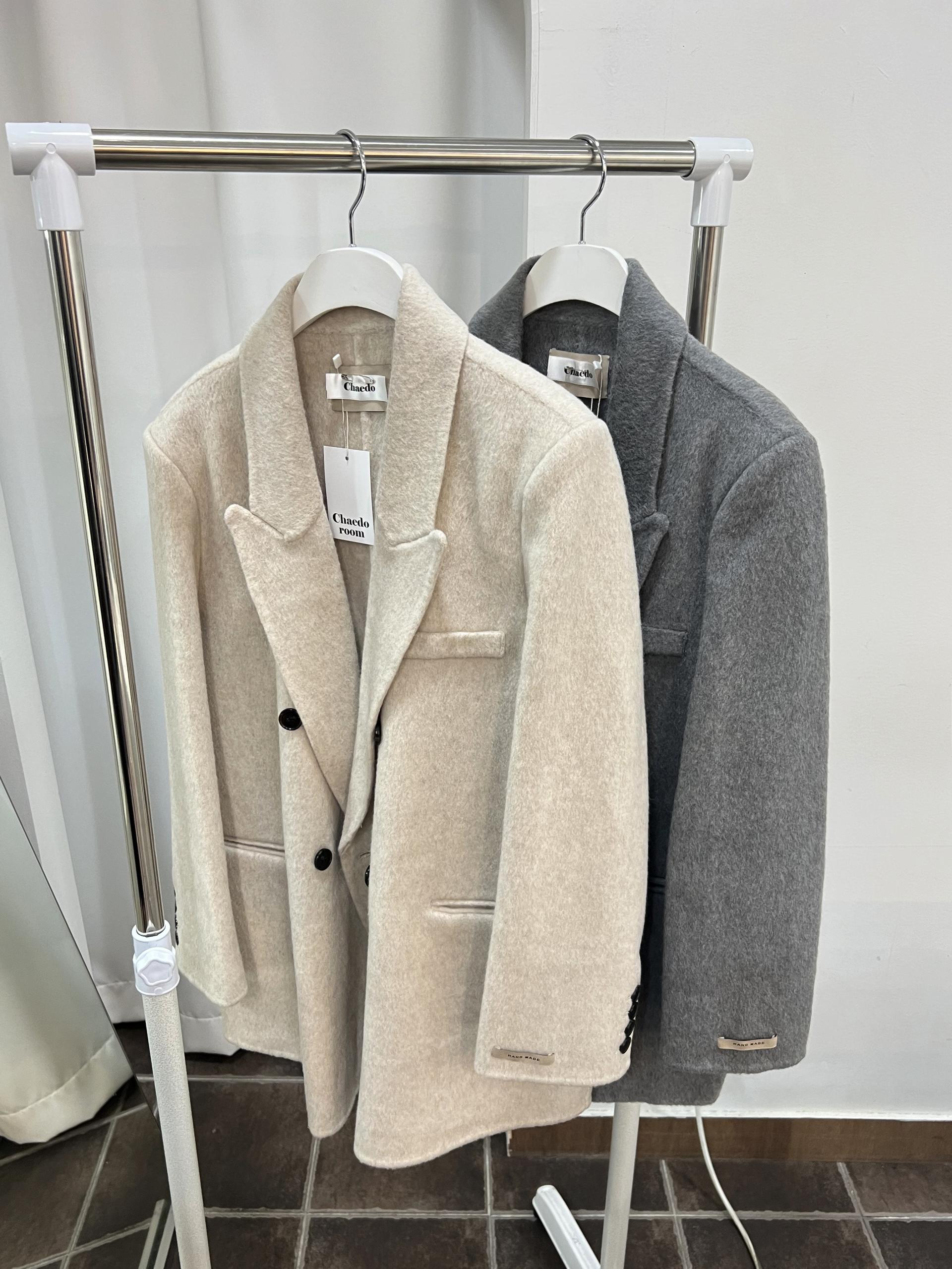 더블 버튼과 각 잡힌 어깨 라인으로 더욱 클래식한 디자인의 하프 자켓이며, 루즈한 실루엣과 엉덩이를 덮는 기장감으로 겨울 시즌 활용도가 높은 아우터입니다.