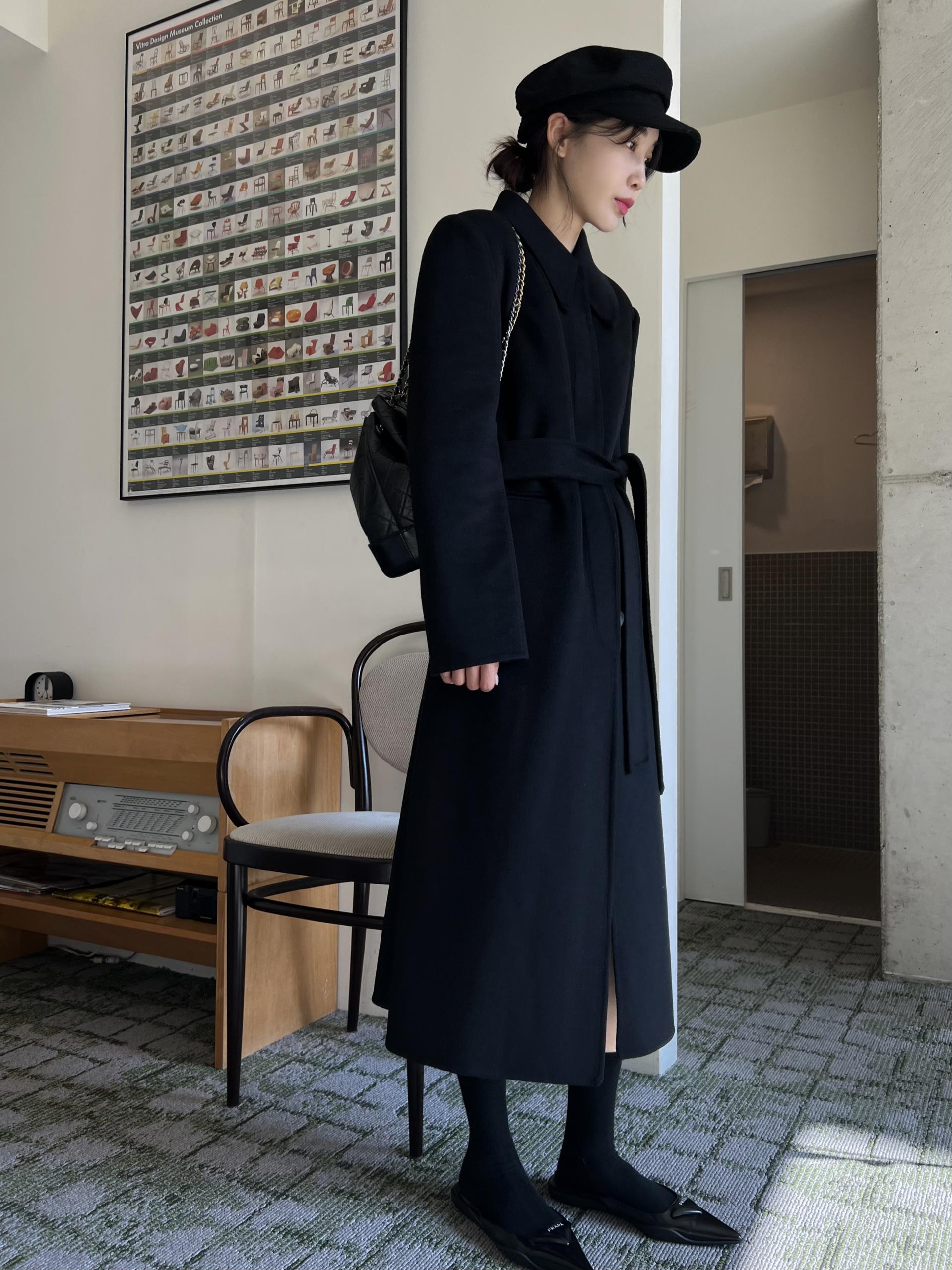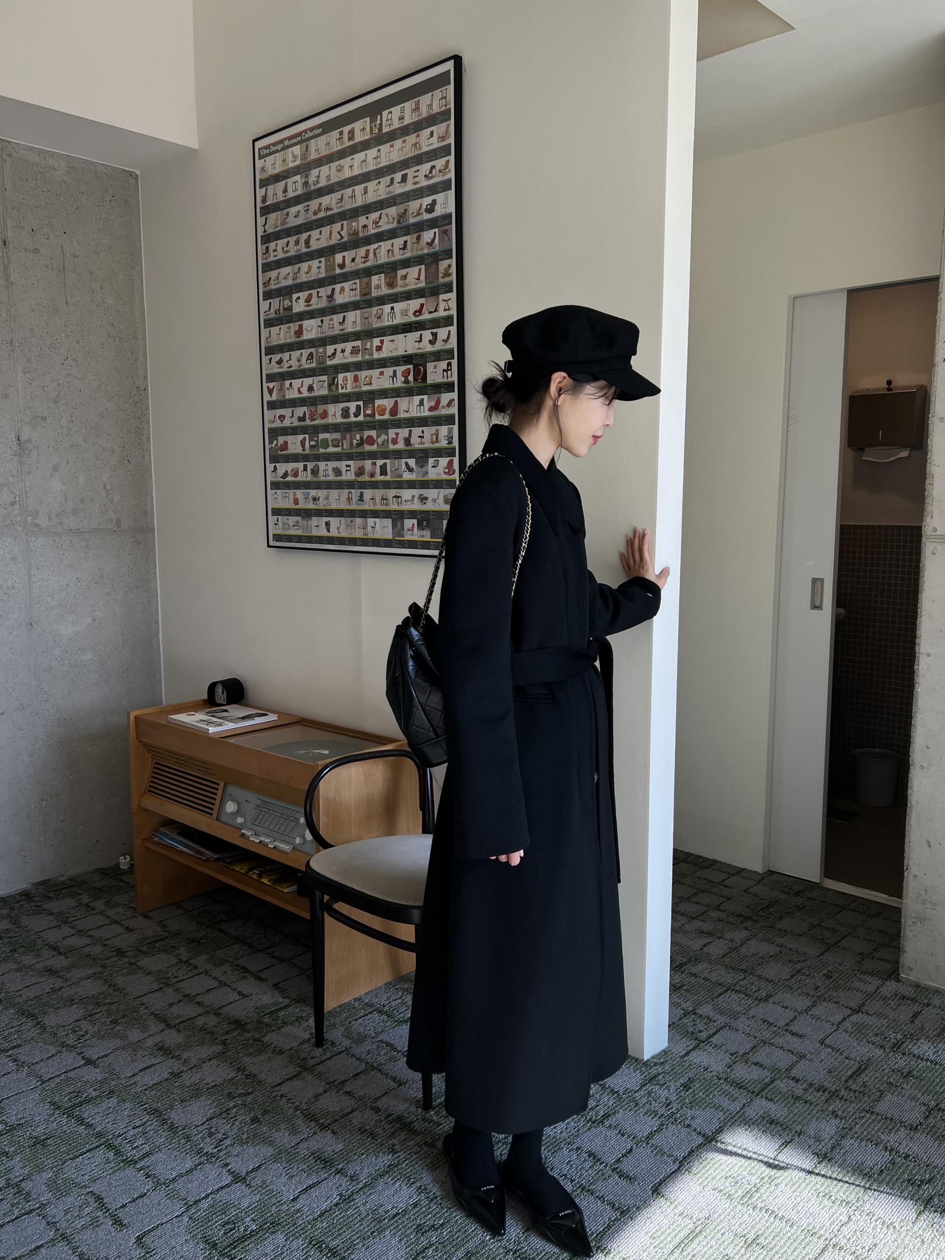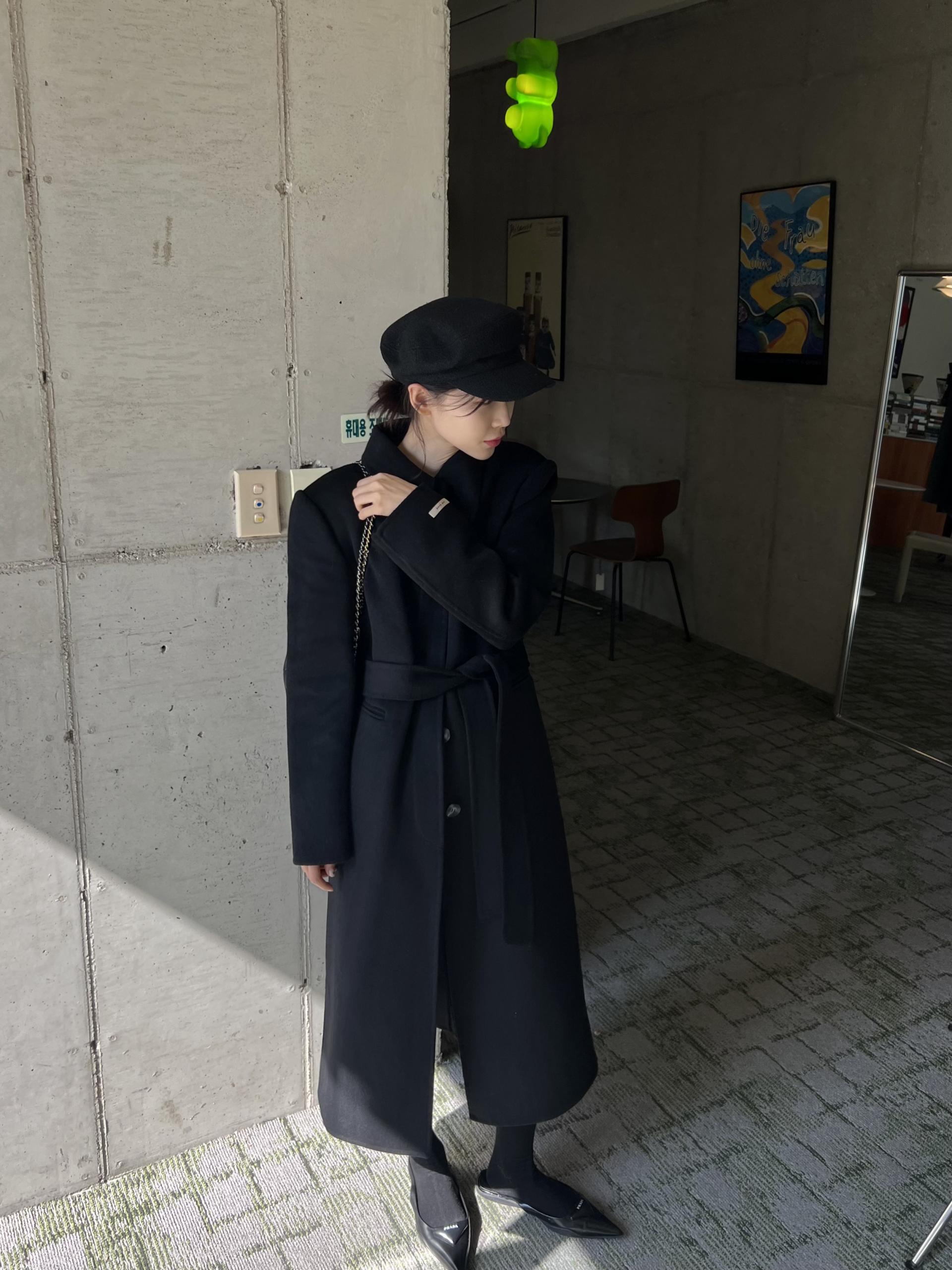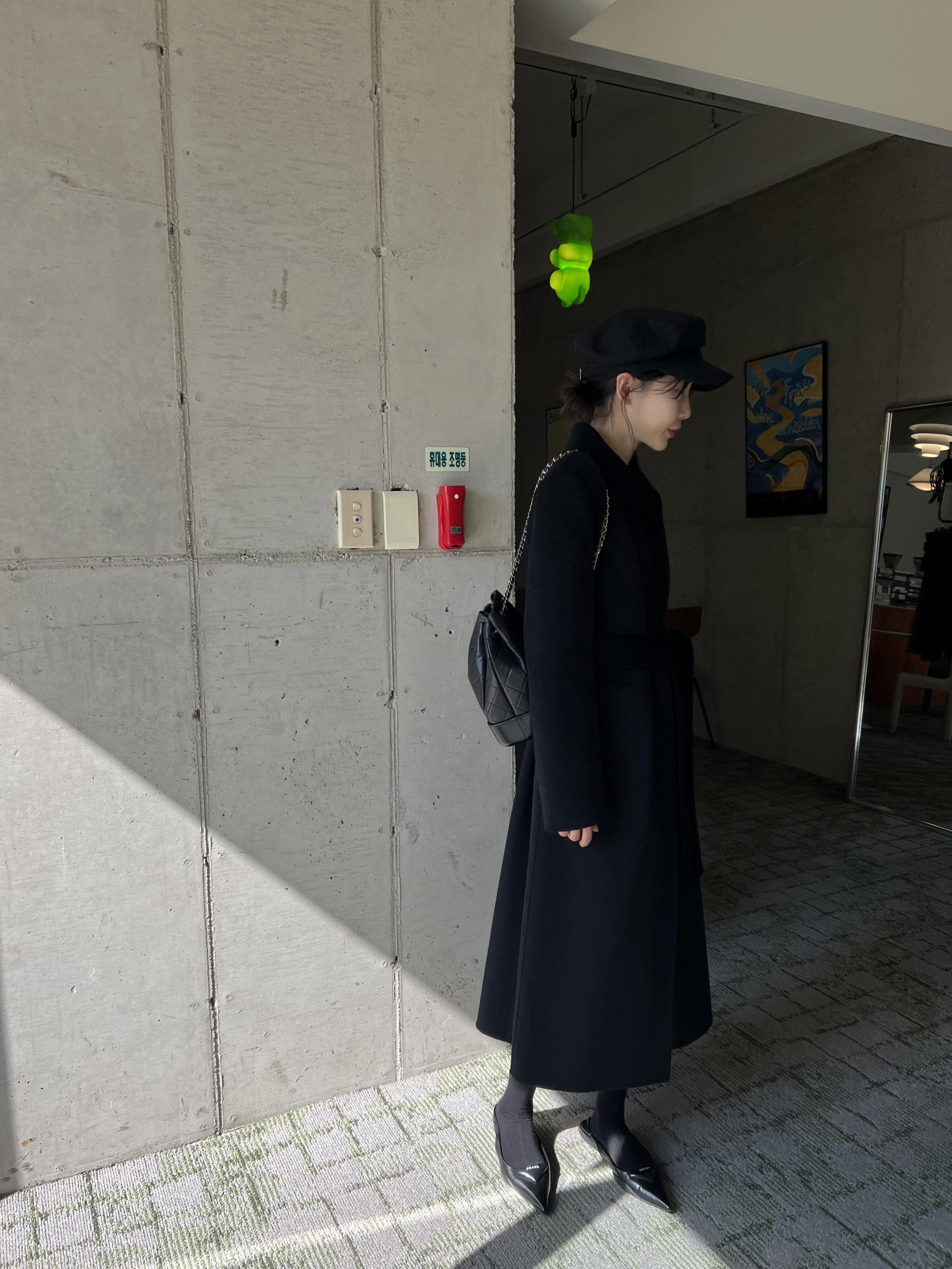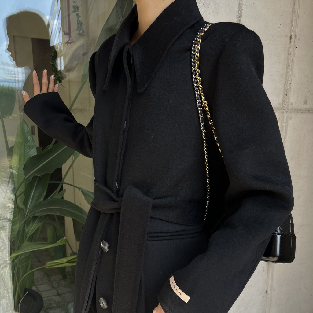 뾰족한 카라 디자인으로 얼굴이 작아 보이며, 단추 전체를 클로징 해 스트랩까지 묶었을 때 특히 멋스러웠던 것 같아요.