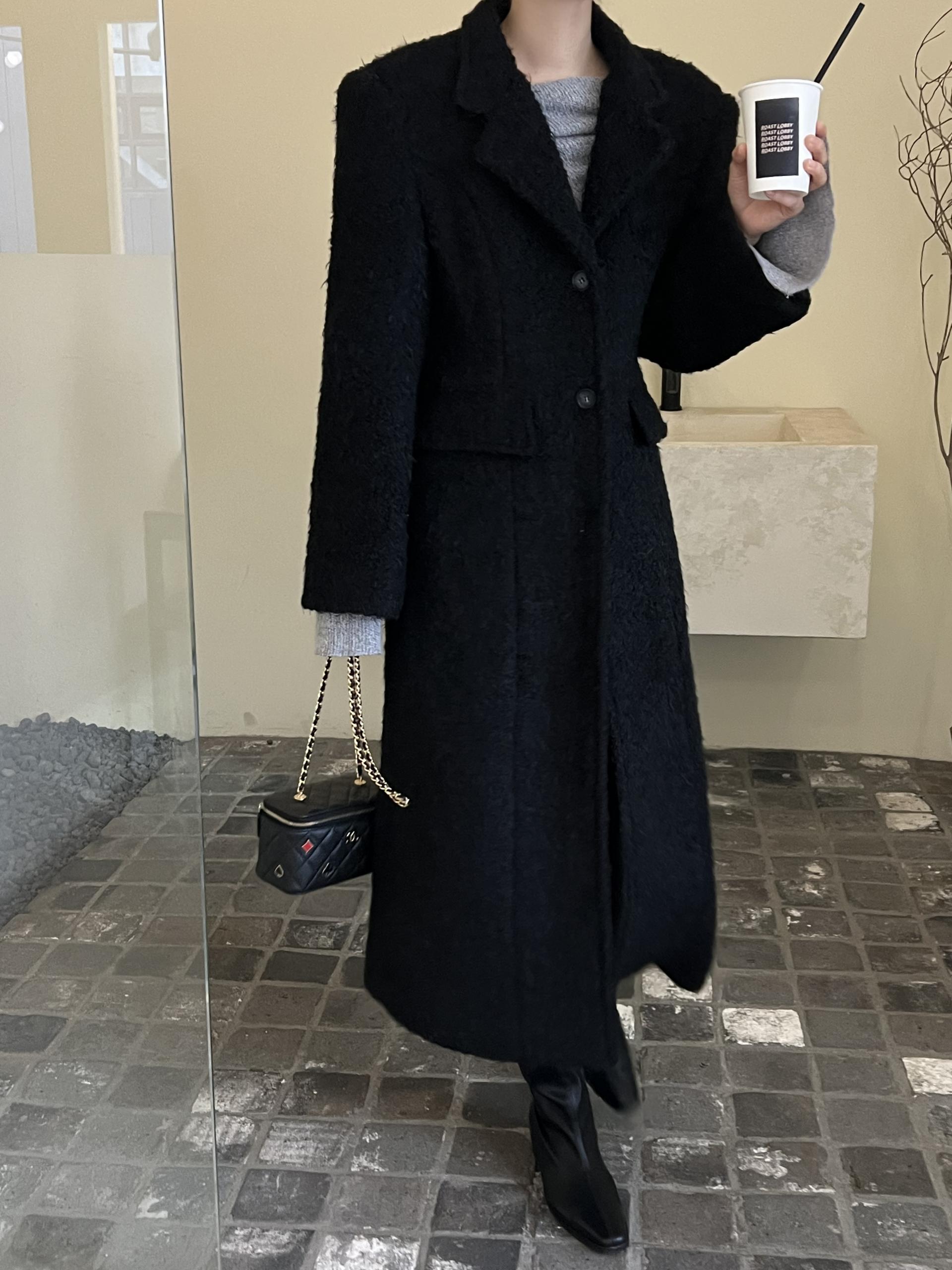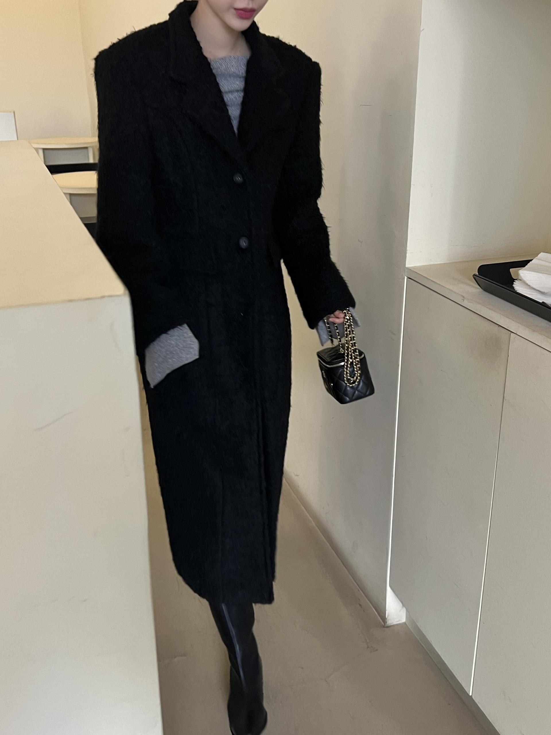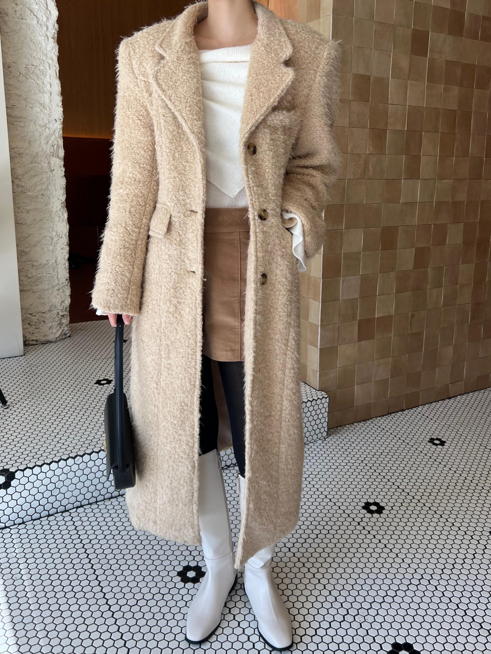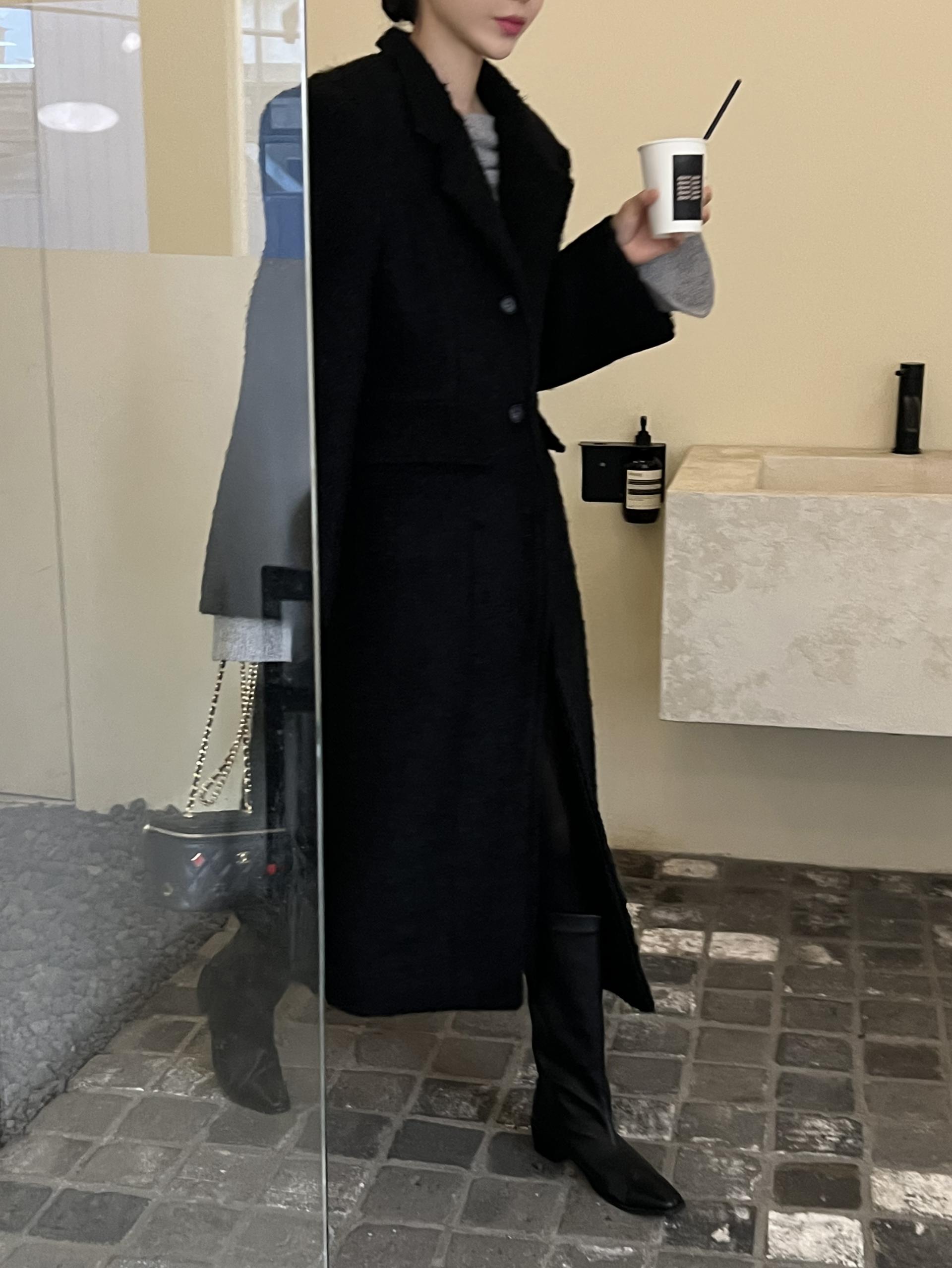 허리가 잡히는 늘씬한 실루엣으로 세련된 분위기의 맥시 롱 코트입니다.