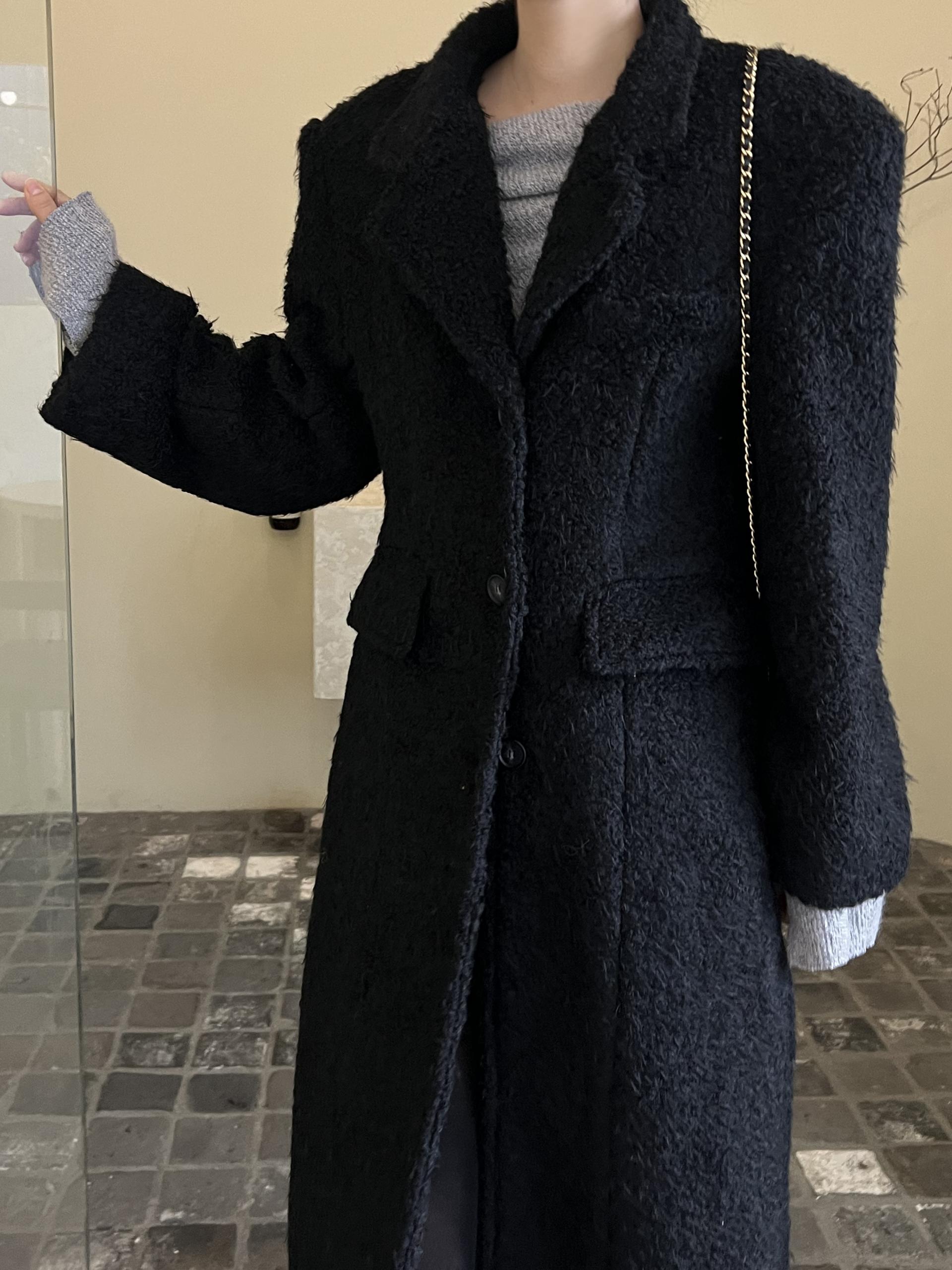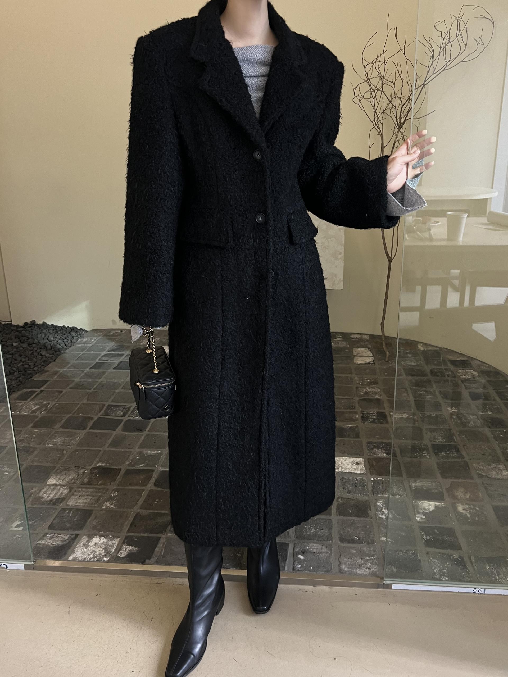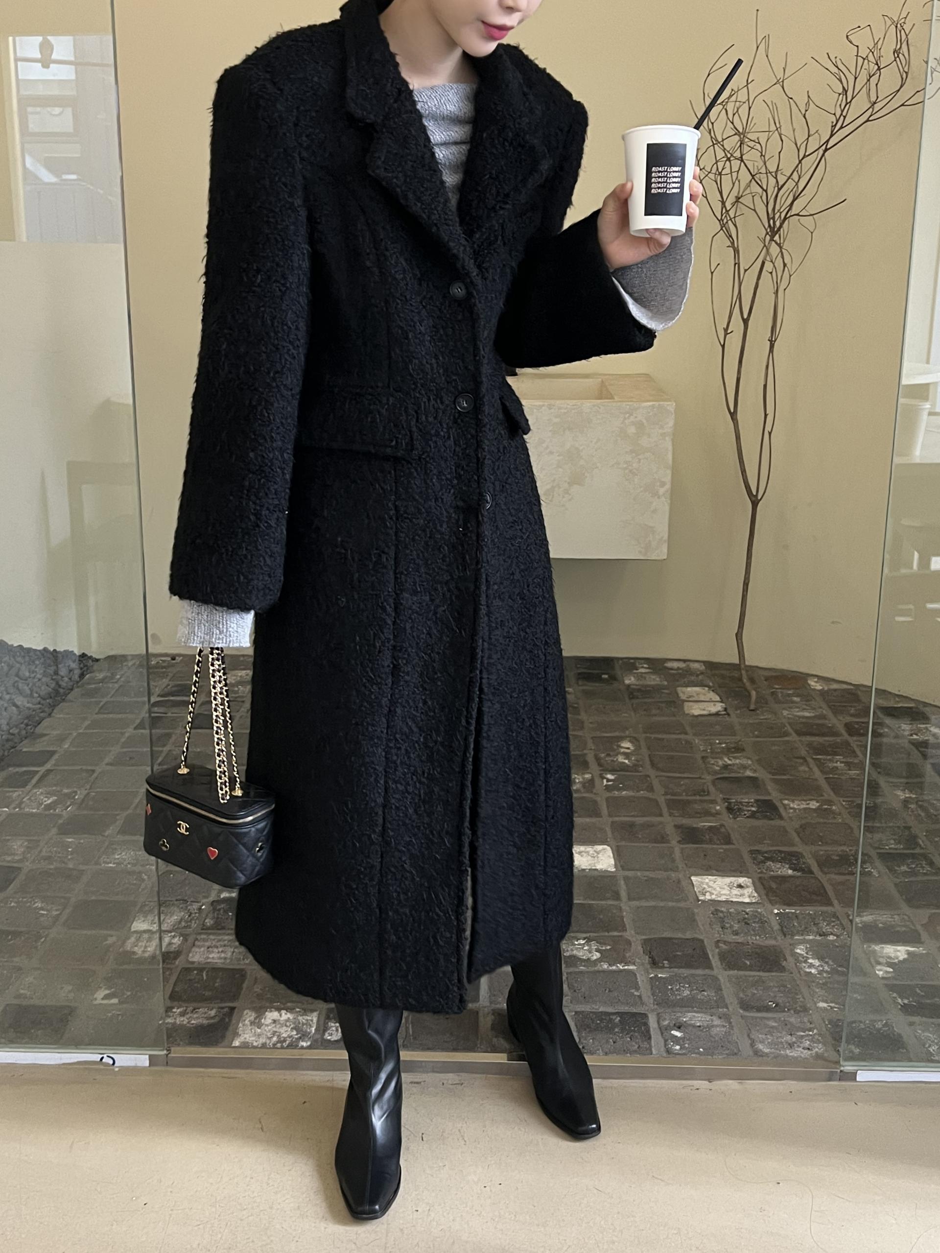 허리가 잡히는 늘씬한 실루엣으로 세련된 분위기의 맥시 롱 코트입니다.