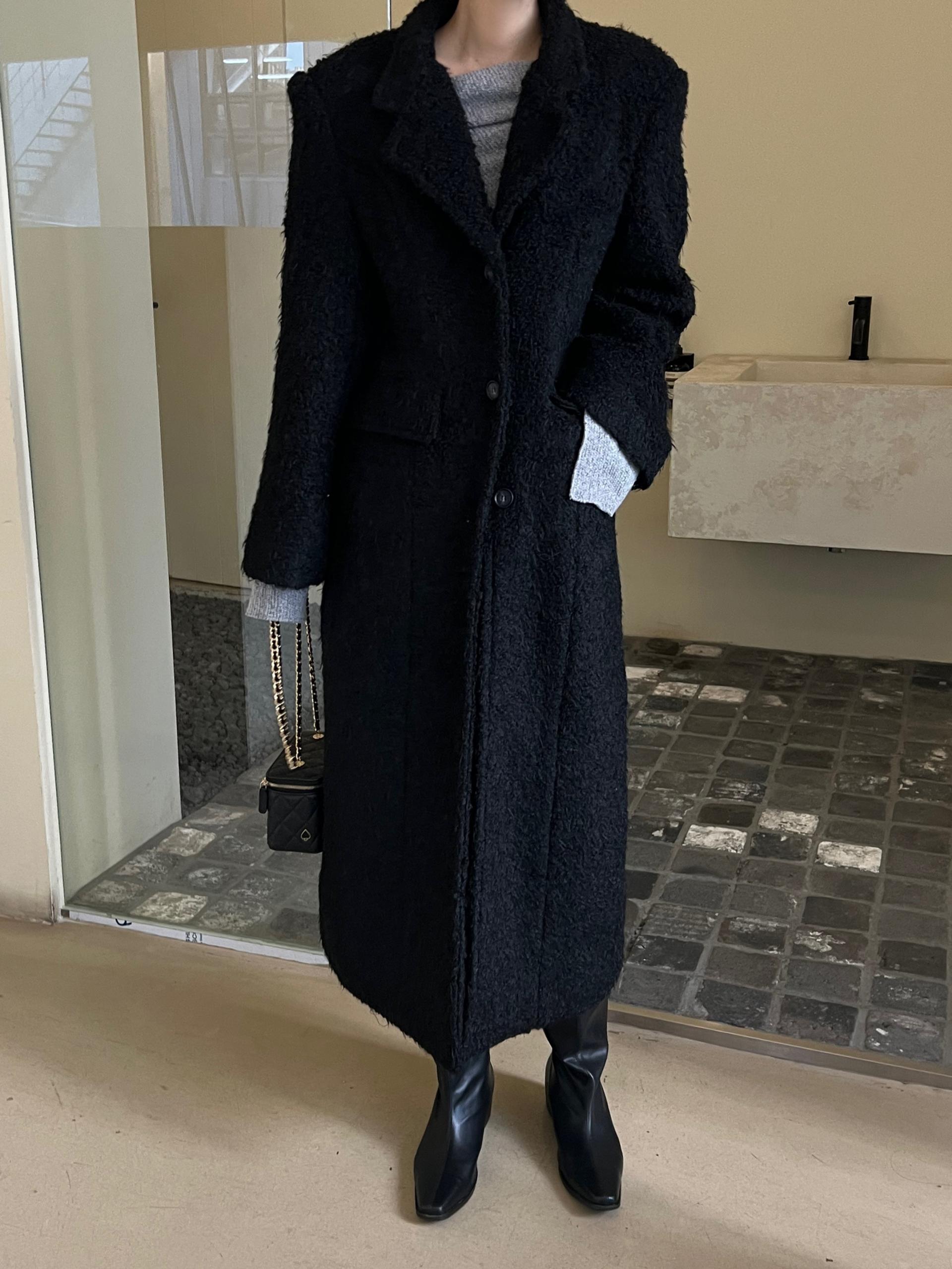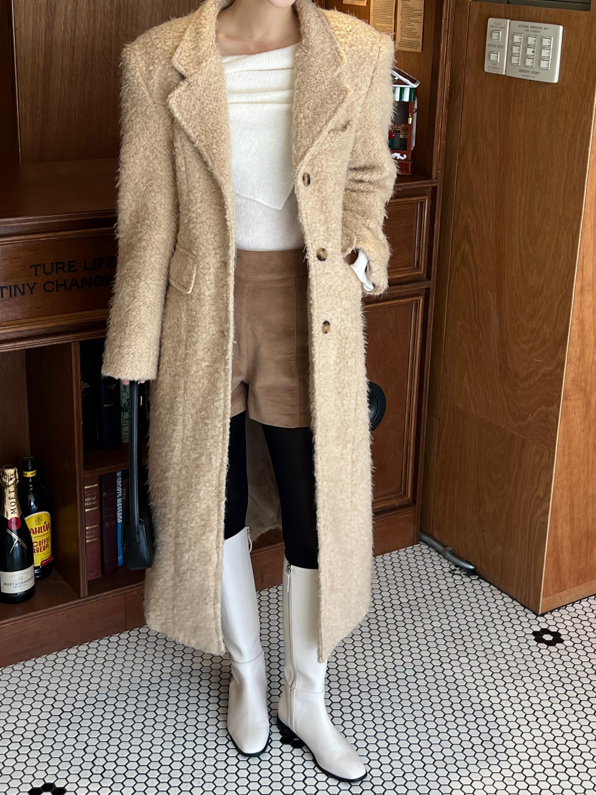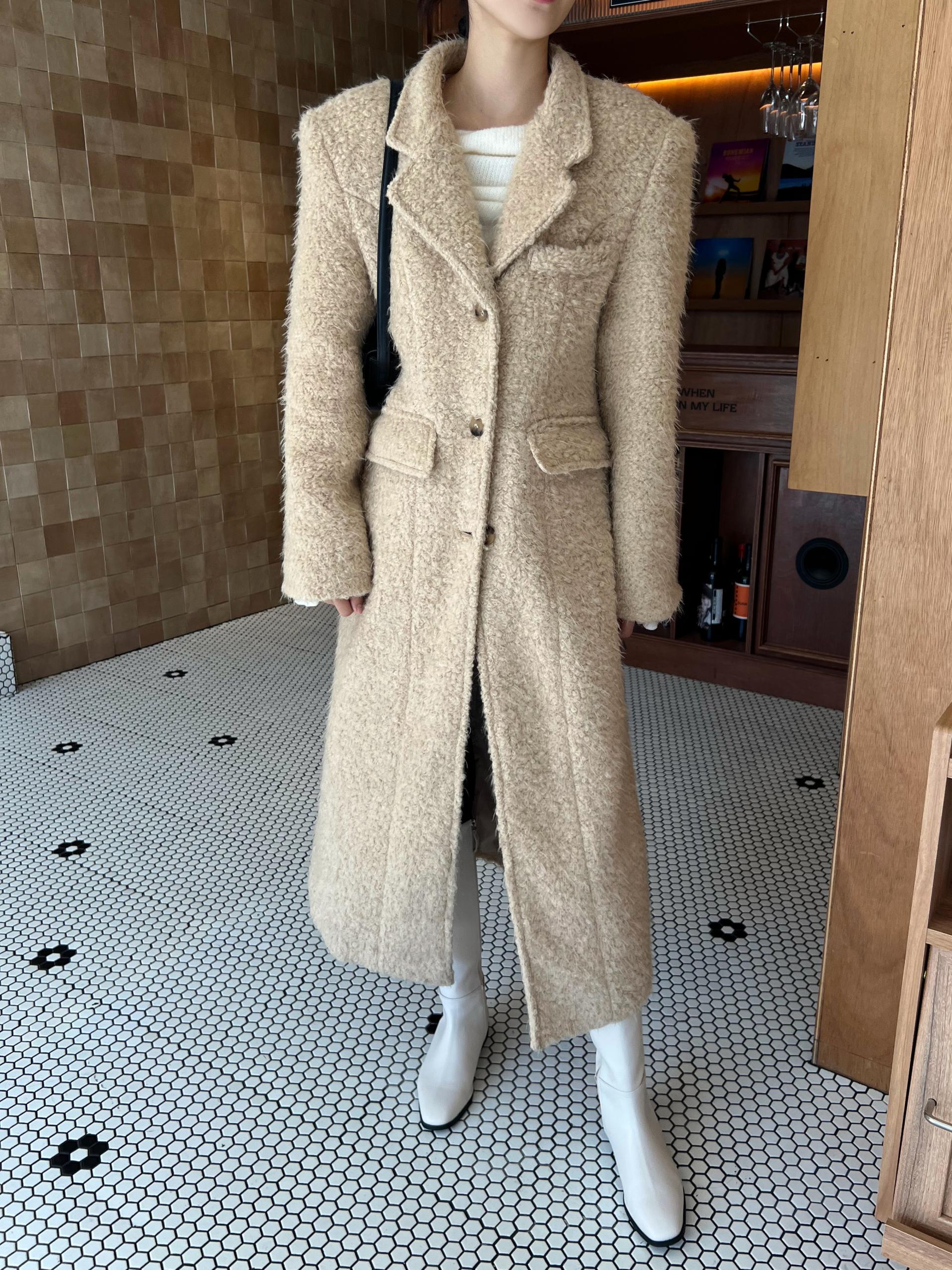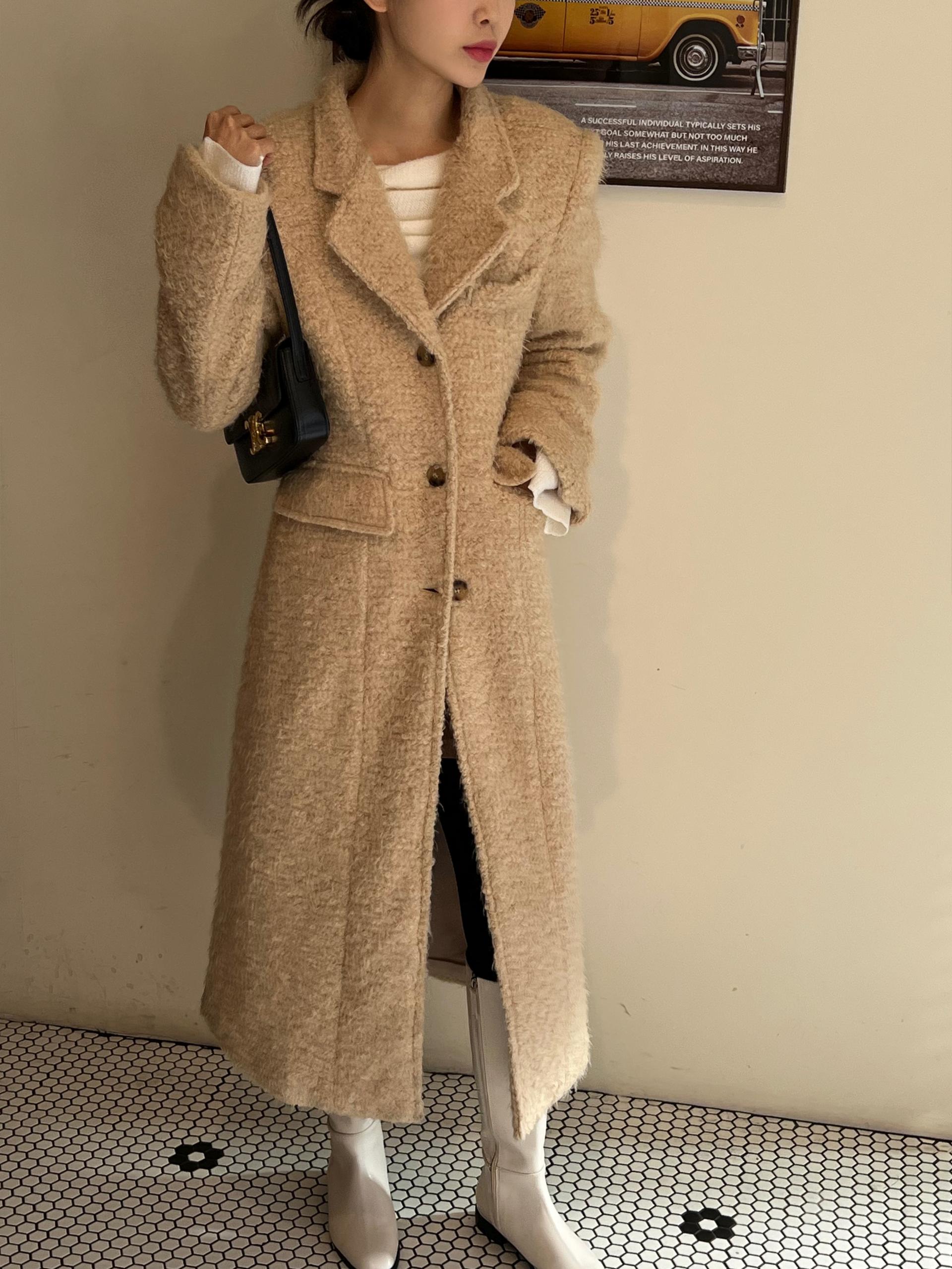 허리가 잡히는 늘씬한 실루엣으로 세련된 분위기의 맥시 롱 코트입니다.