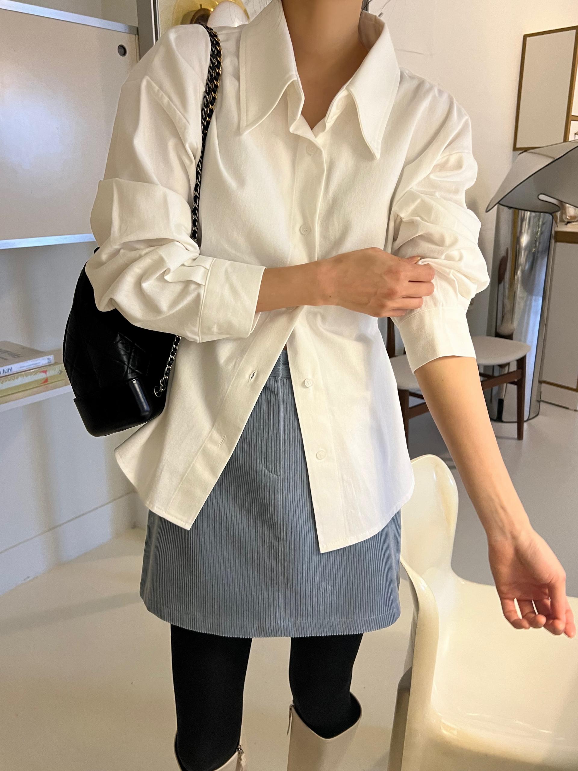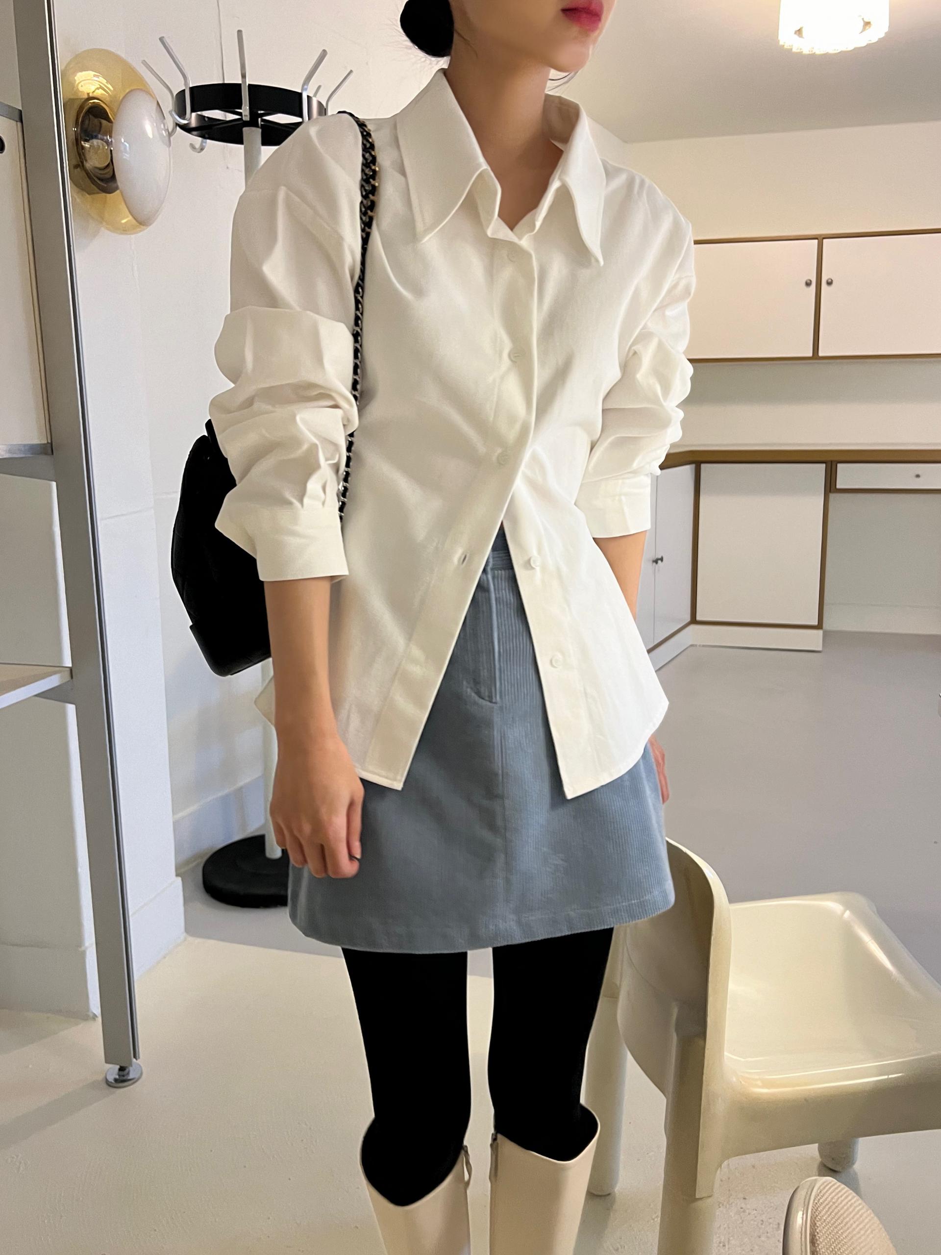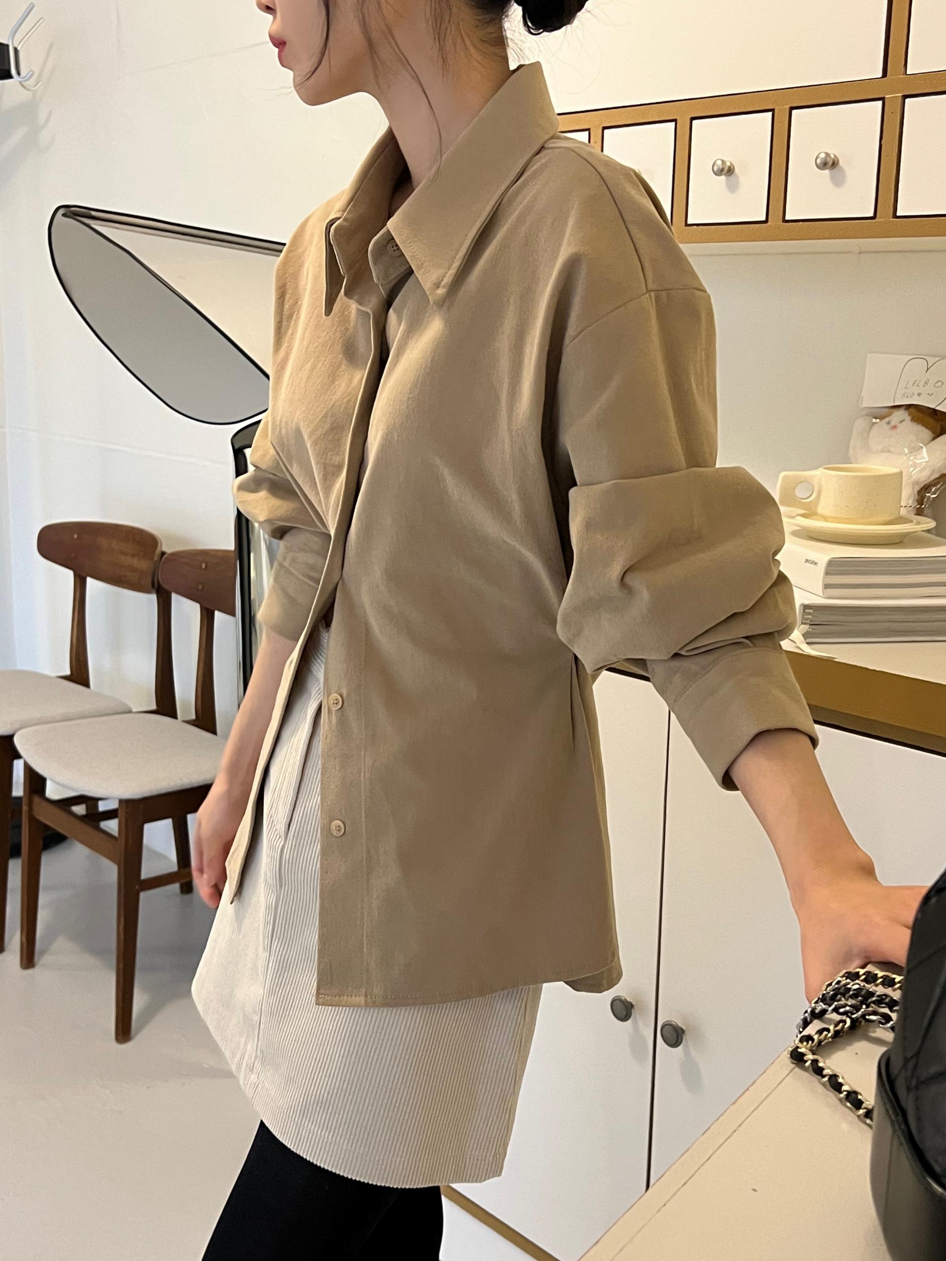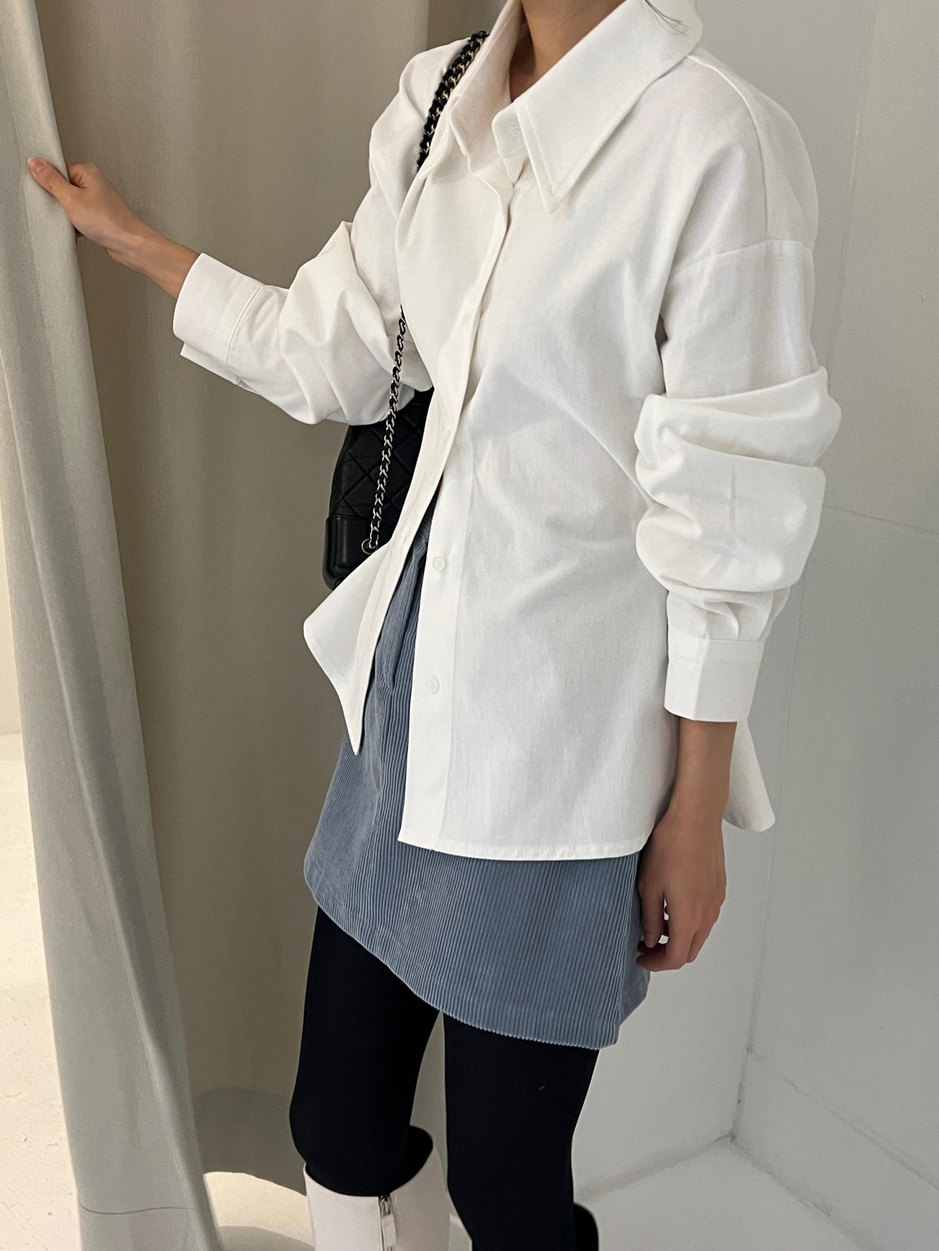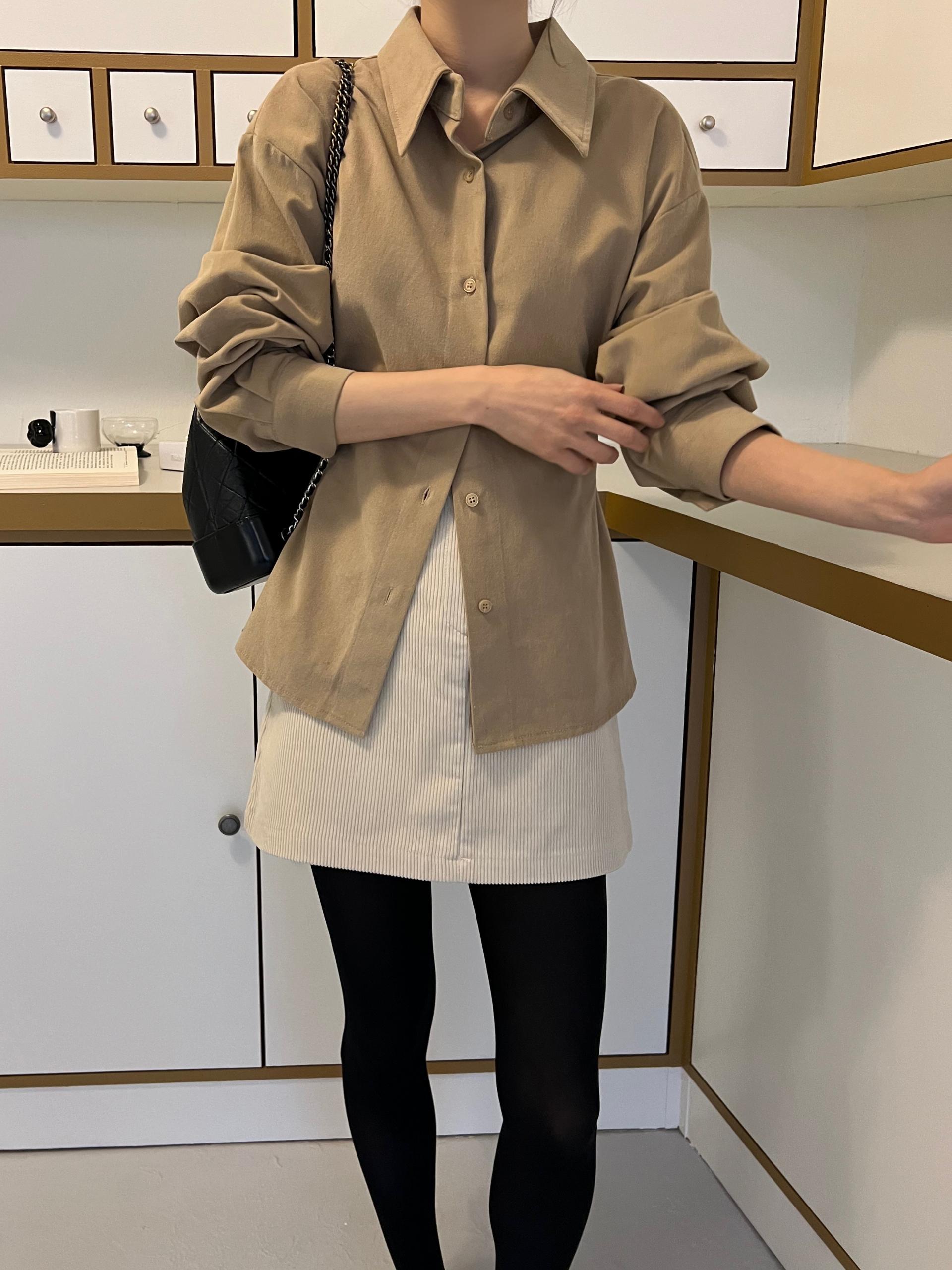 두께감이 있어 핏이 더 예쁘게 잡히고, 비침이 거의 없는 장점이 있습니다. 기모 가공이 된 듯 도톰한 소재로 겨울 내내 착용하기 좋아 데일리 셔츠로 추천드려요.