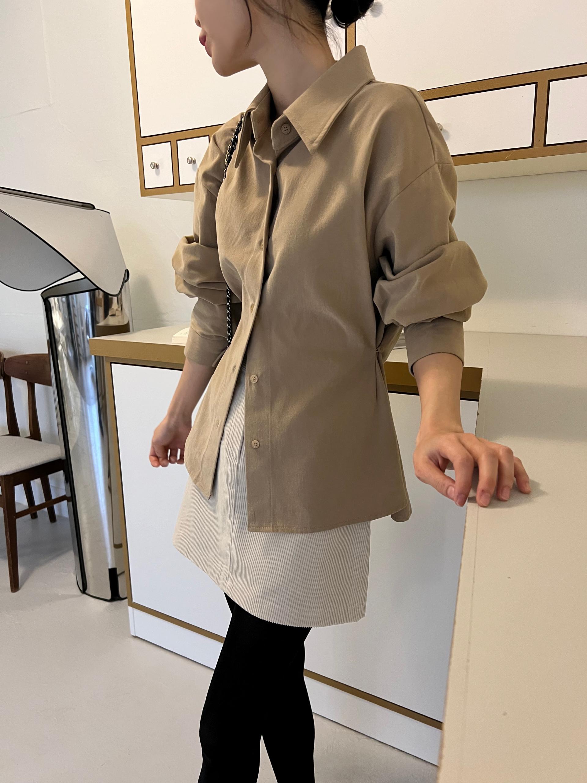 허리 양 쪽에 각 두개 씩의 단추가 있어 라인을 잡아 착용할 수도 있고, 단추를 풀어 루즈핏의 기본 셔츠/남방 스타일로도 연출할 수 있는 투웨이 타입 셔츠입니다.