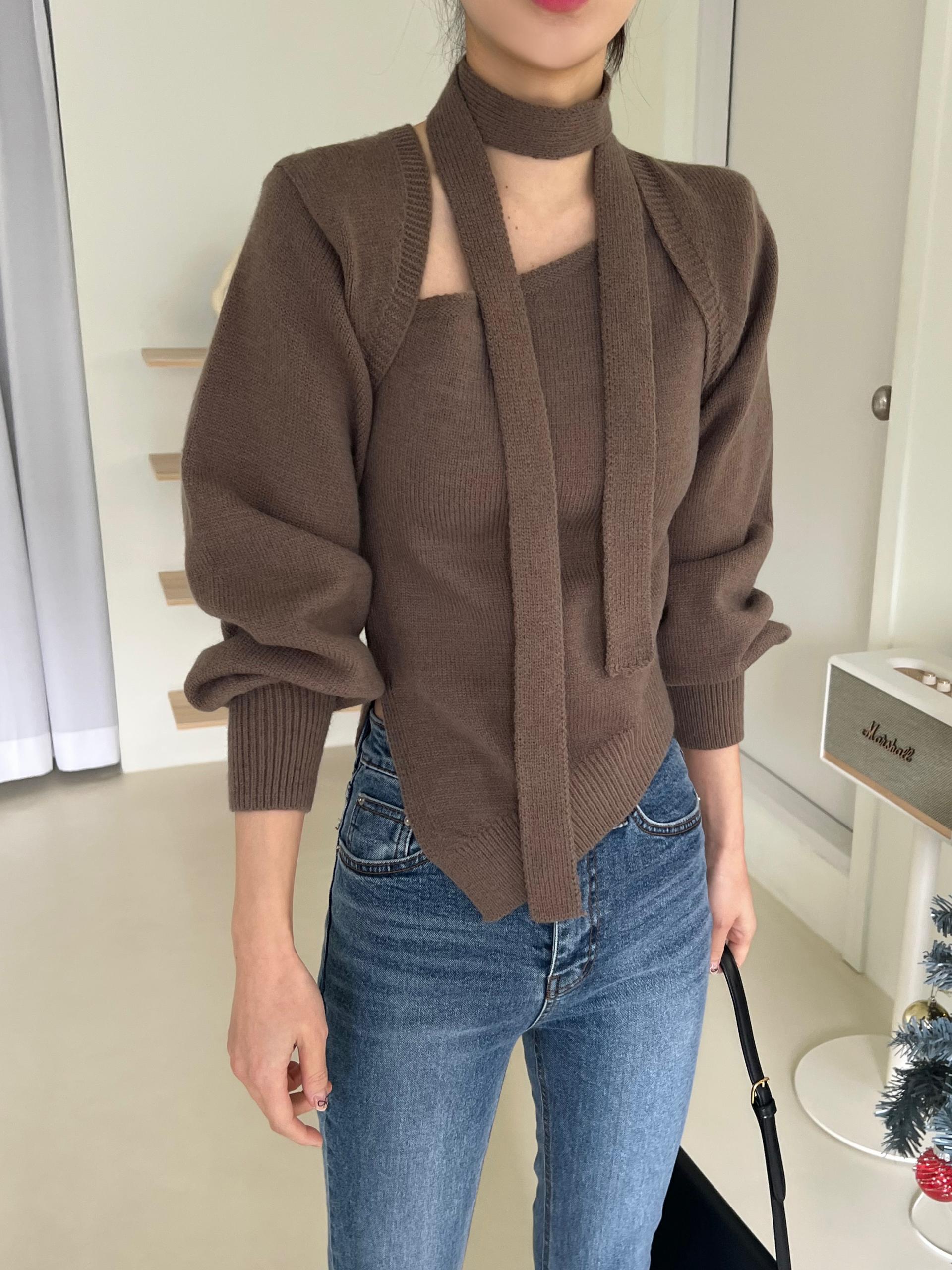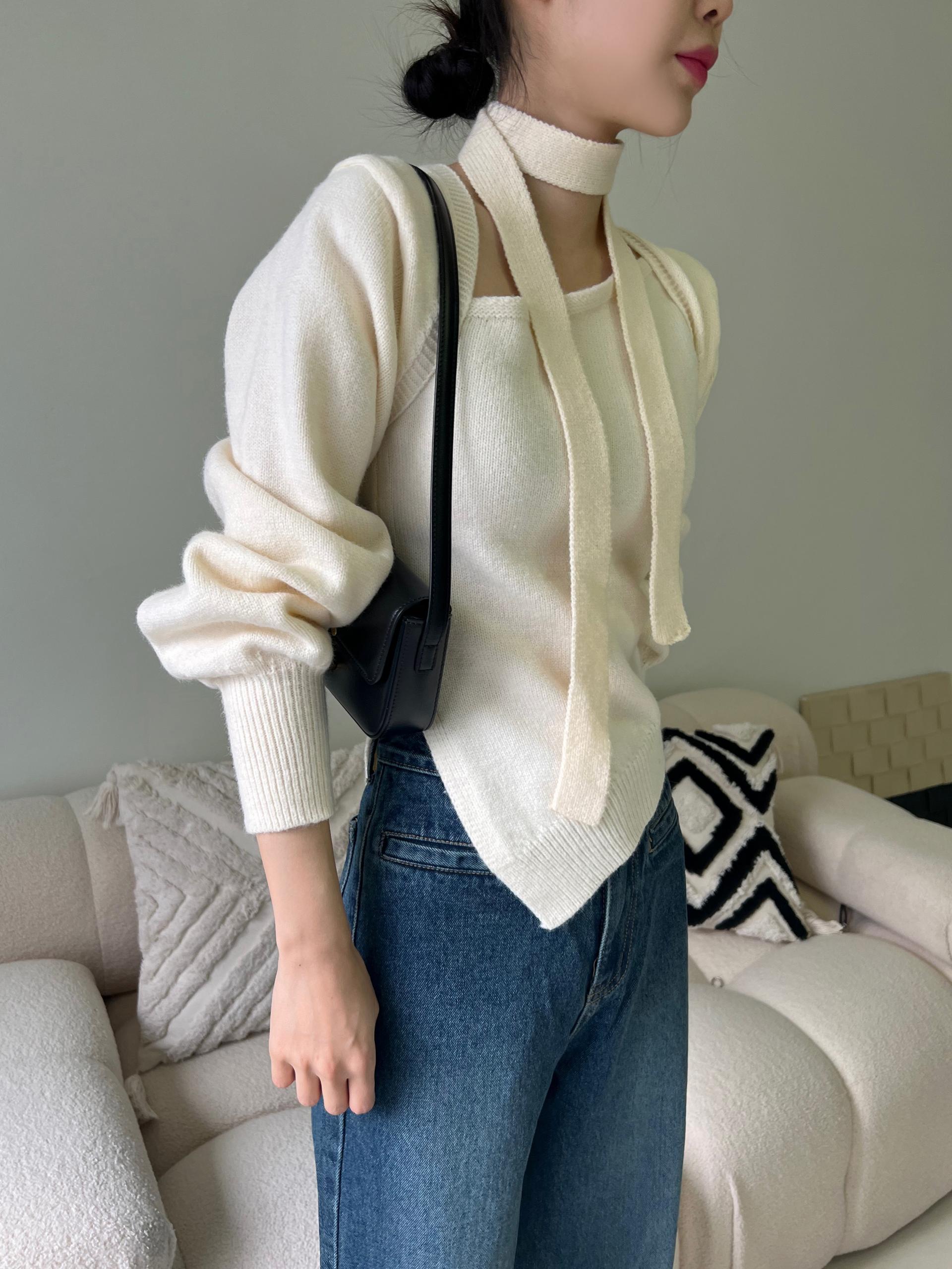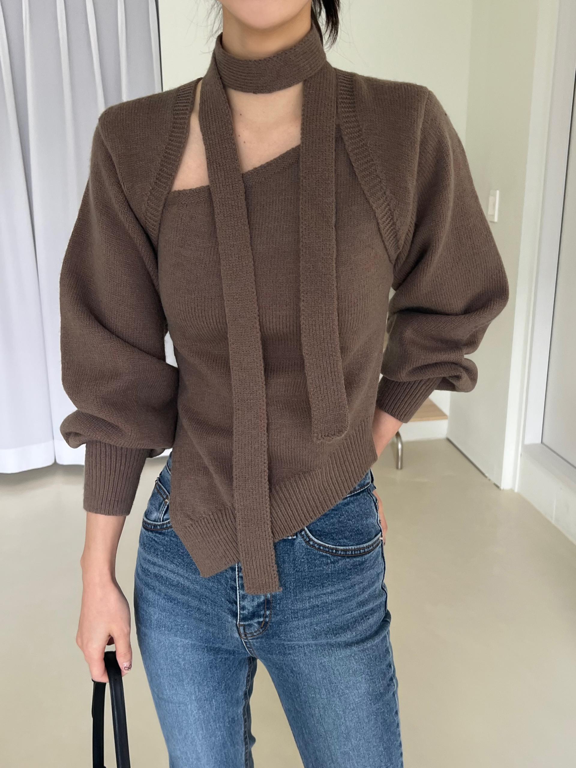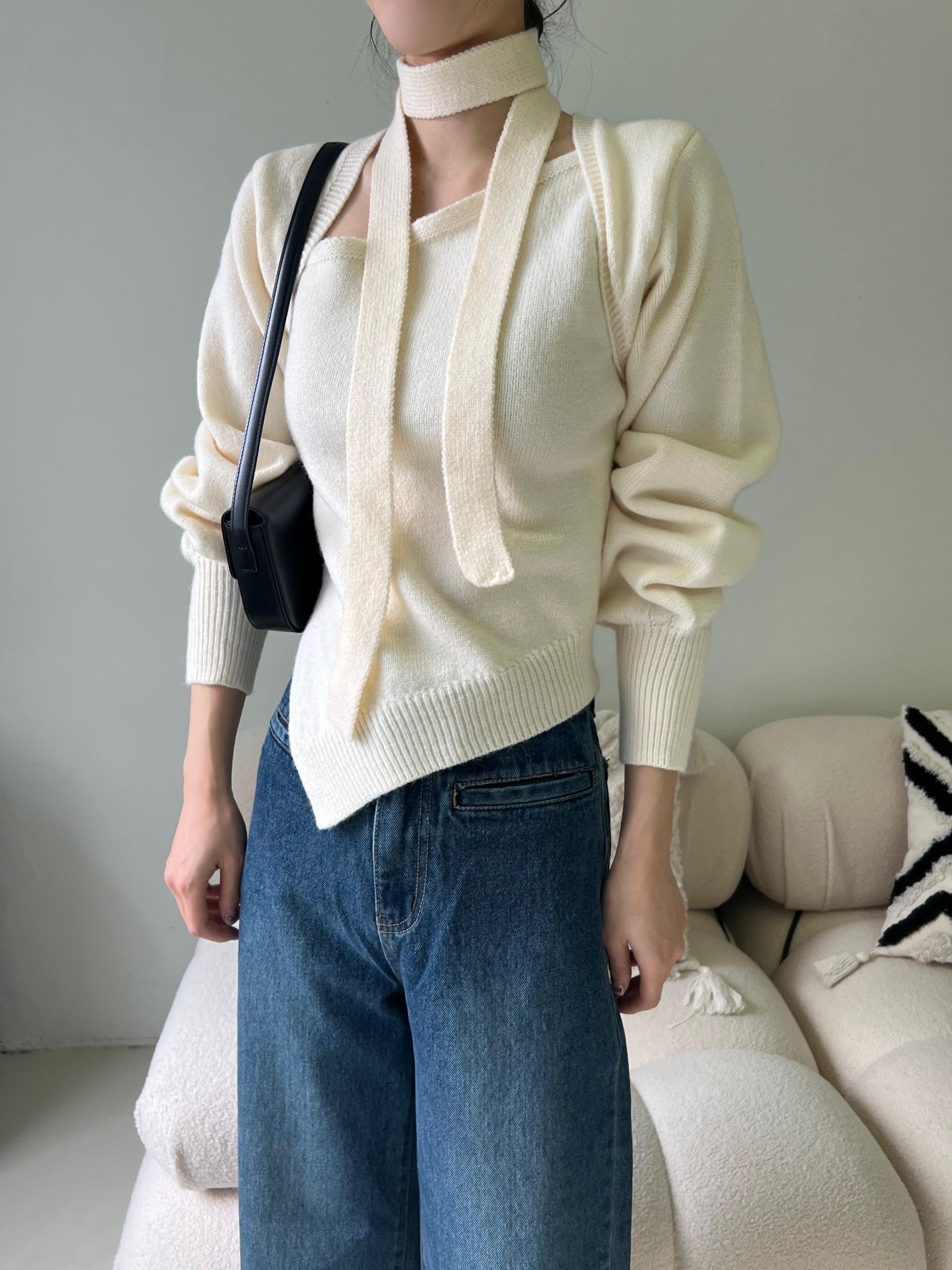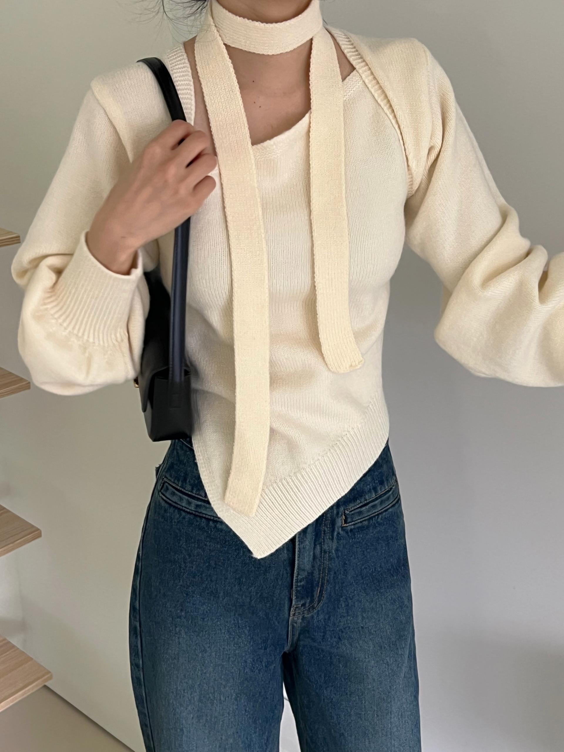 페이크 볼레로 디테일에 타이 머플러가 세트 구성인 니트 티셔츠입니다.