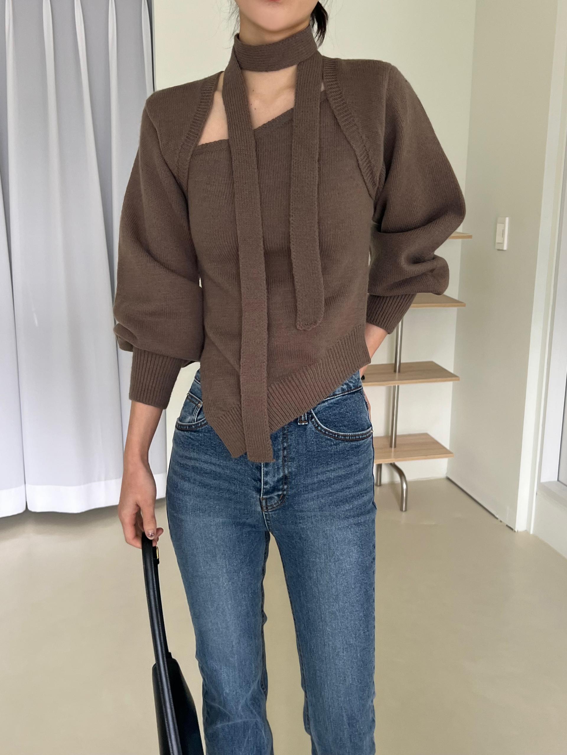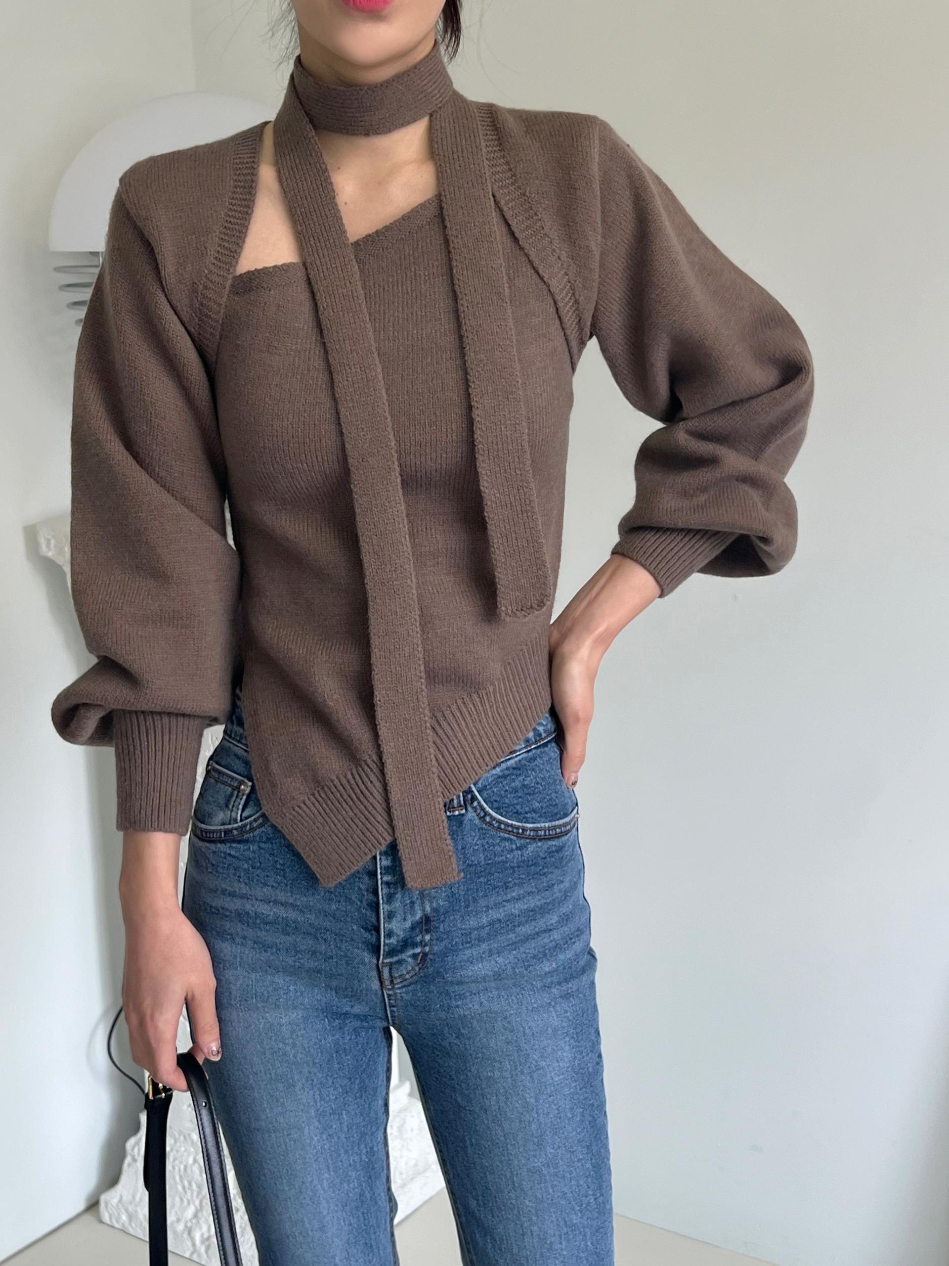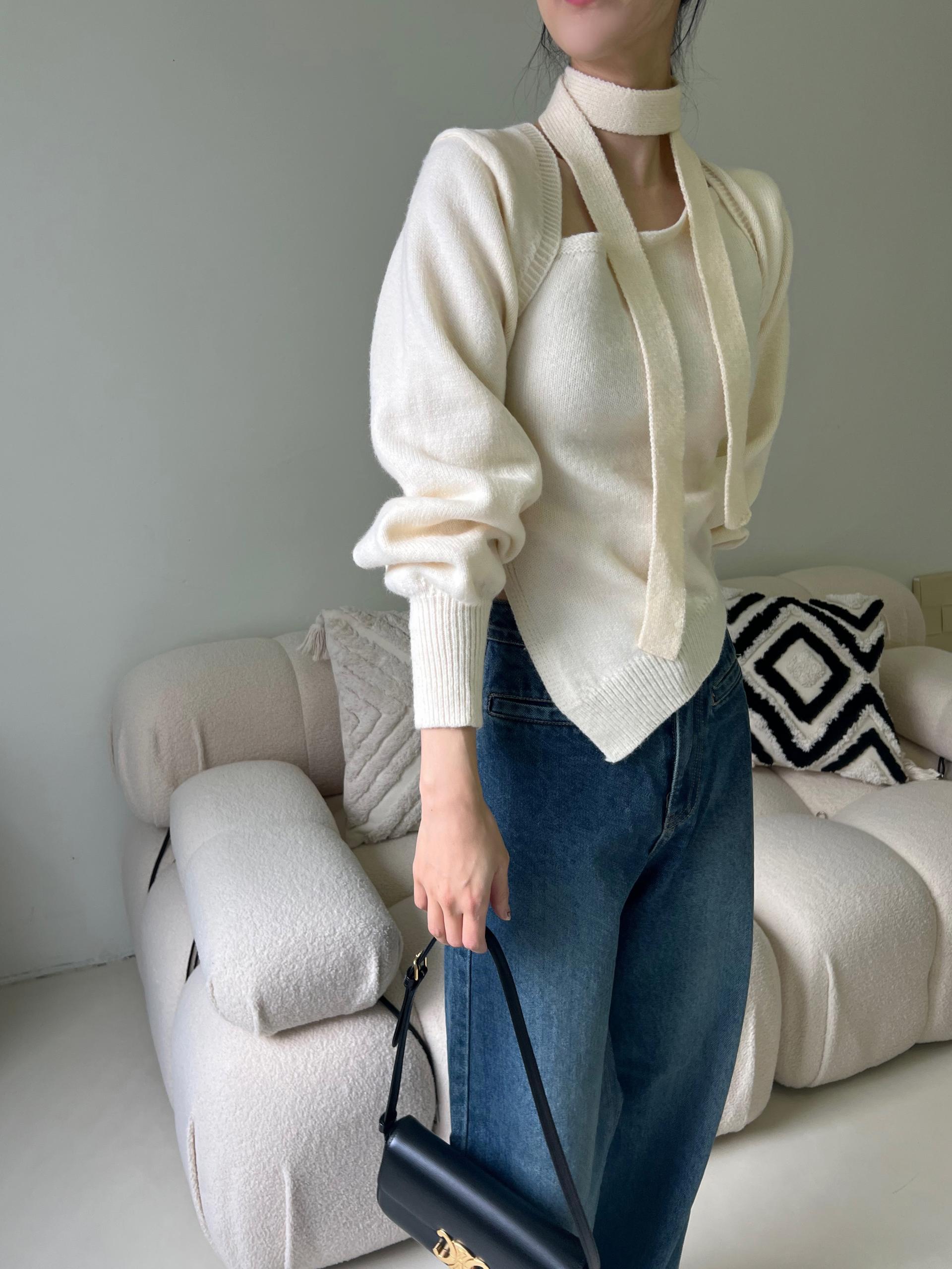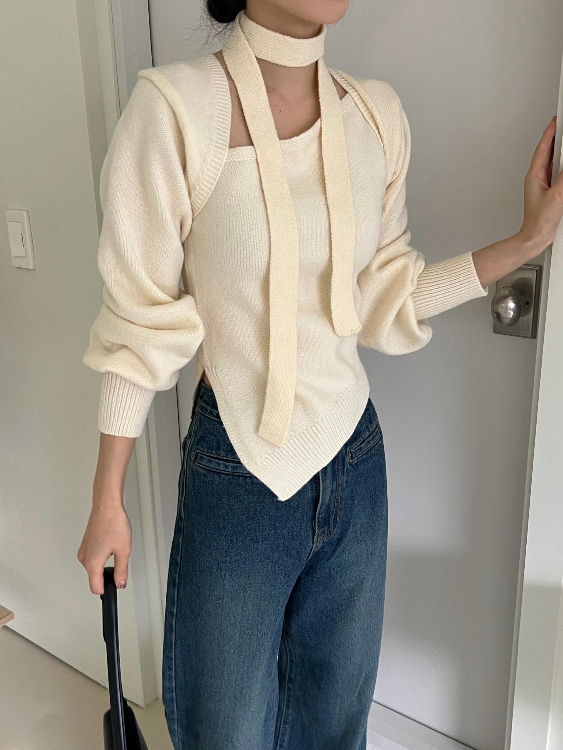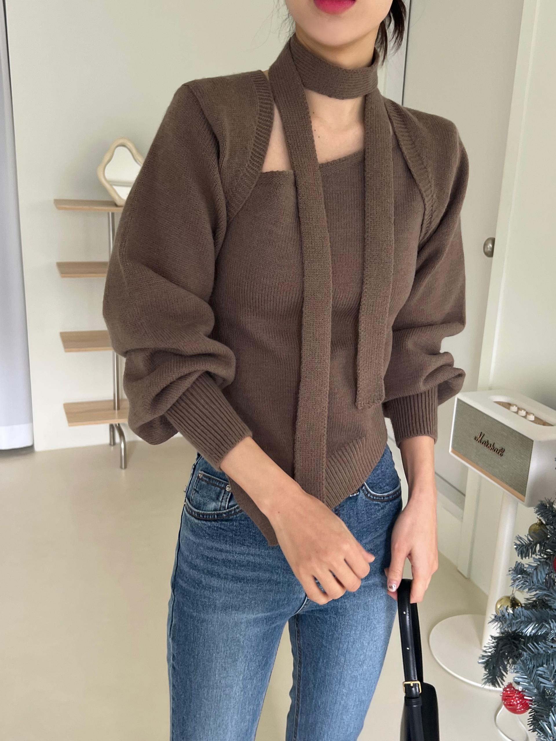페이크 볼레로 디테일에 타이 머플러가 세트 구성인 니트 티셔츠입니다.