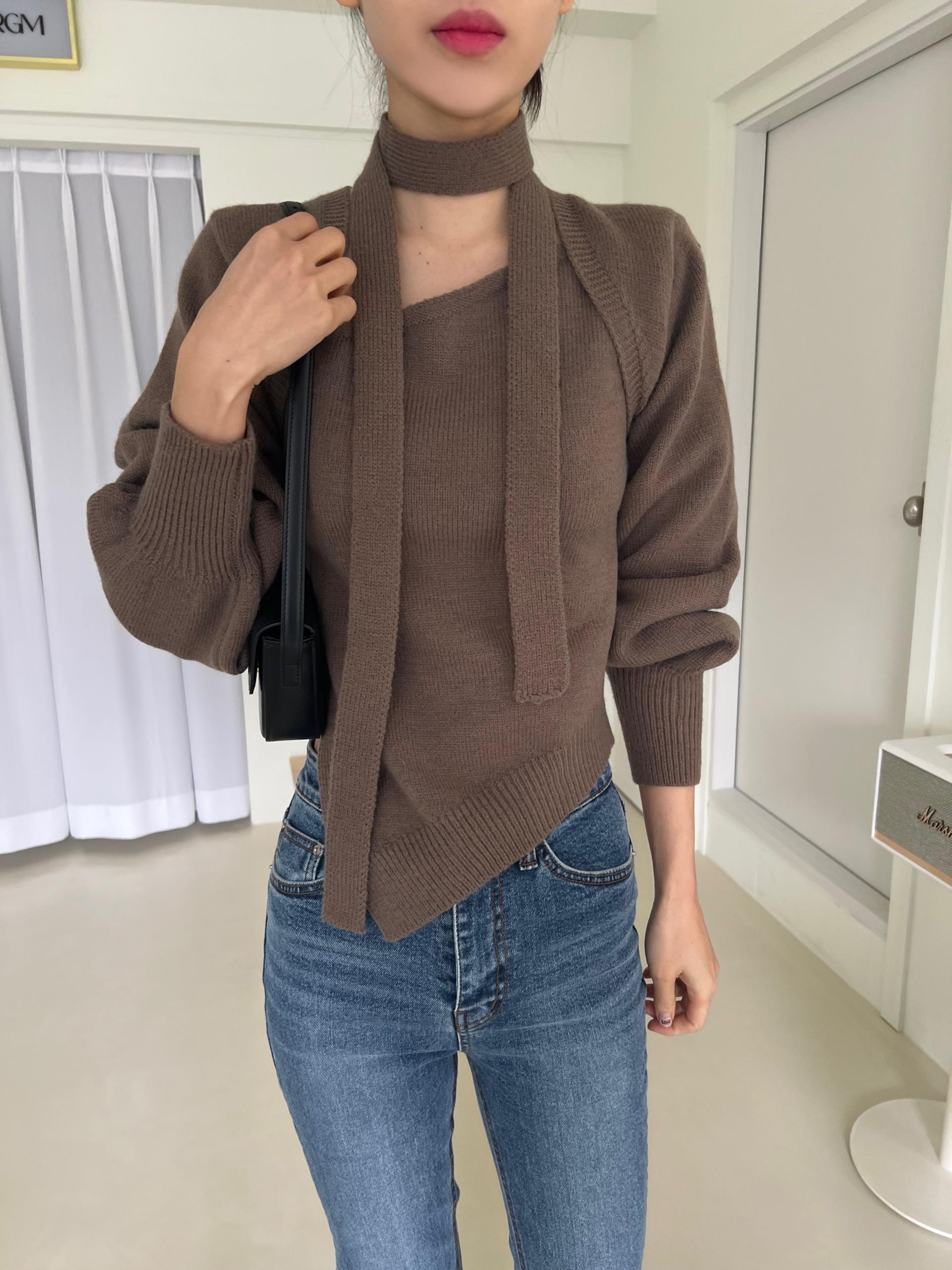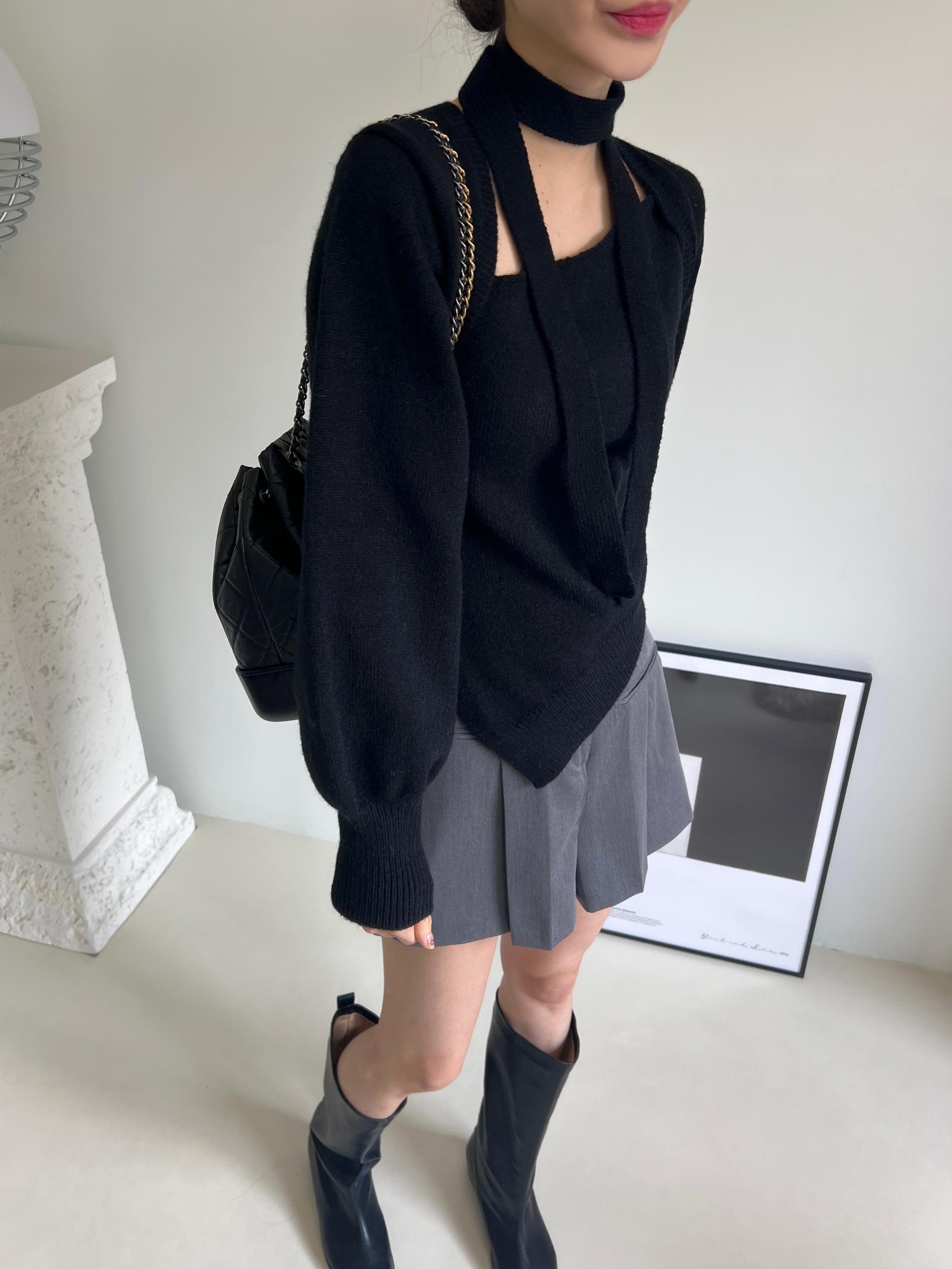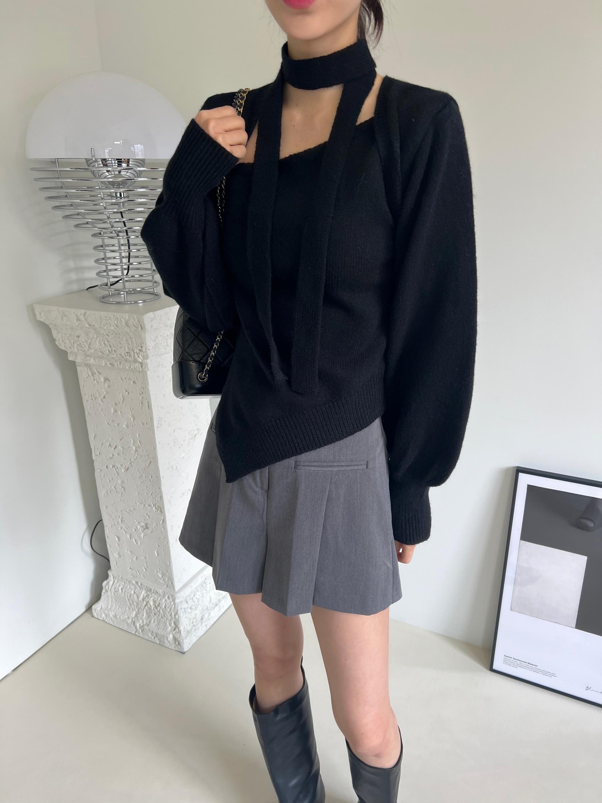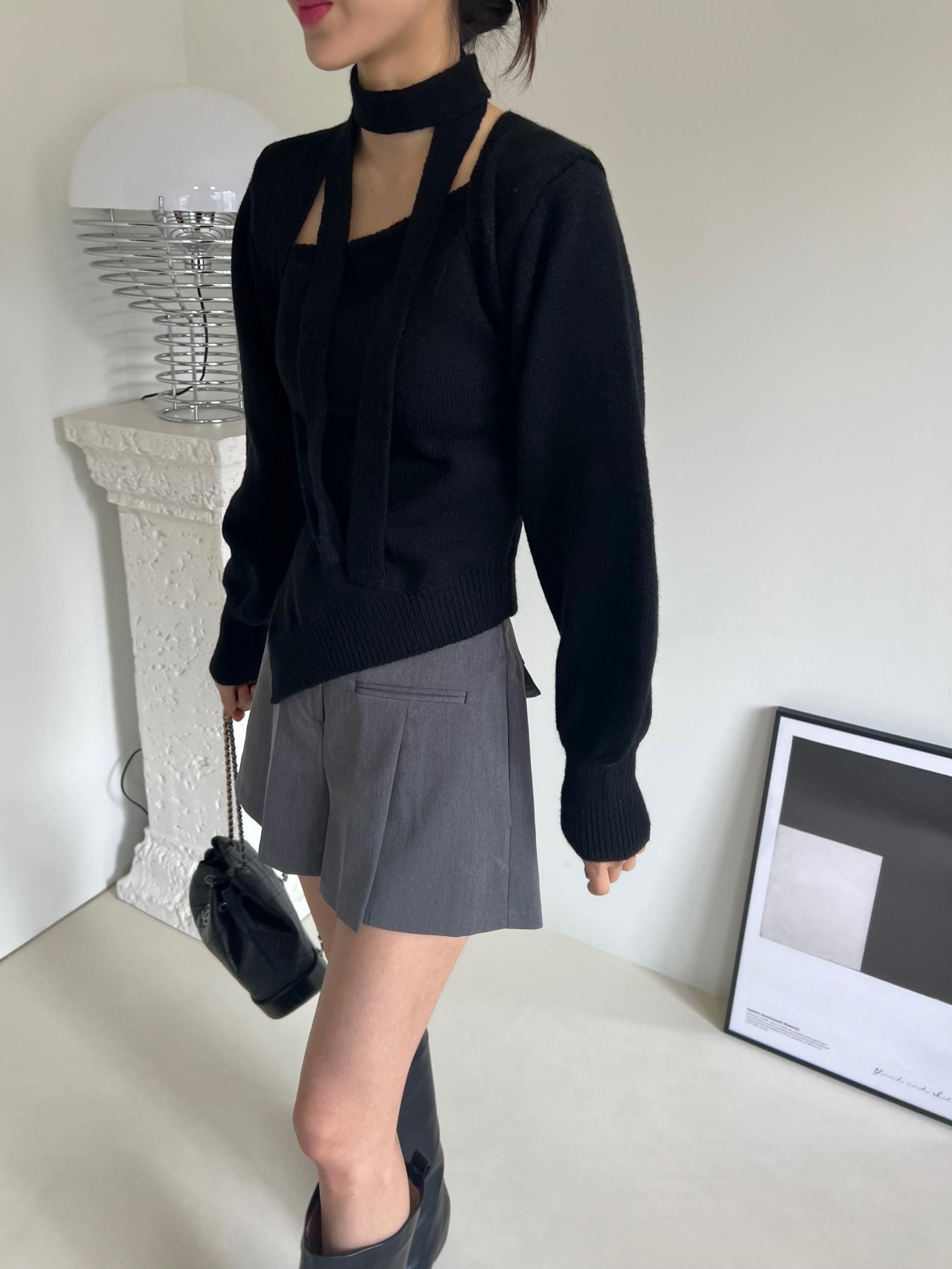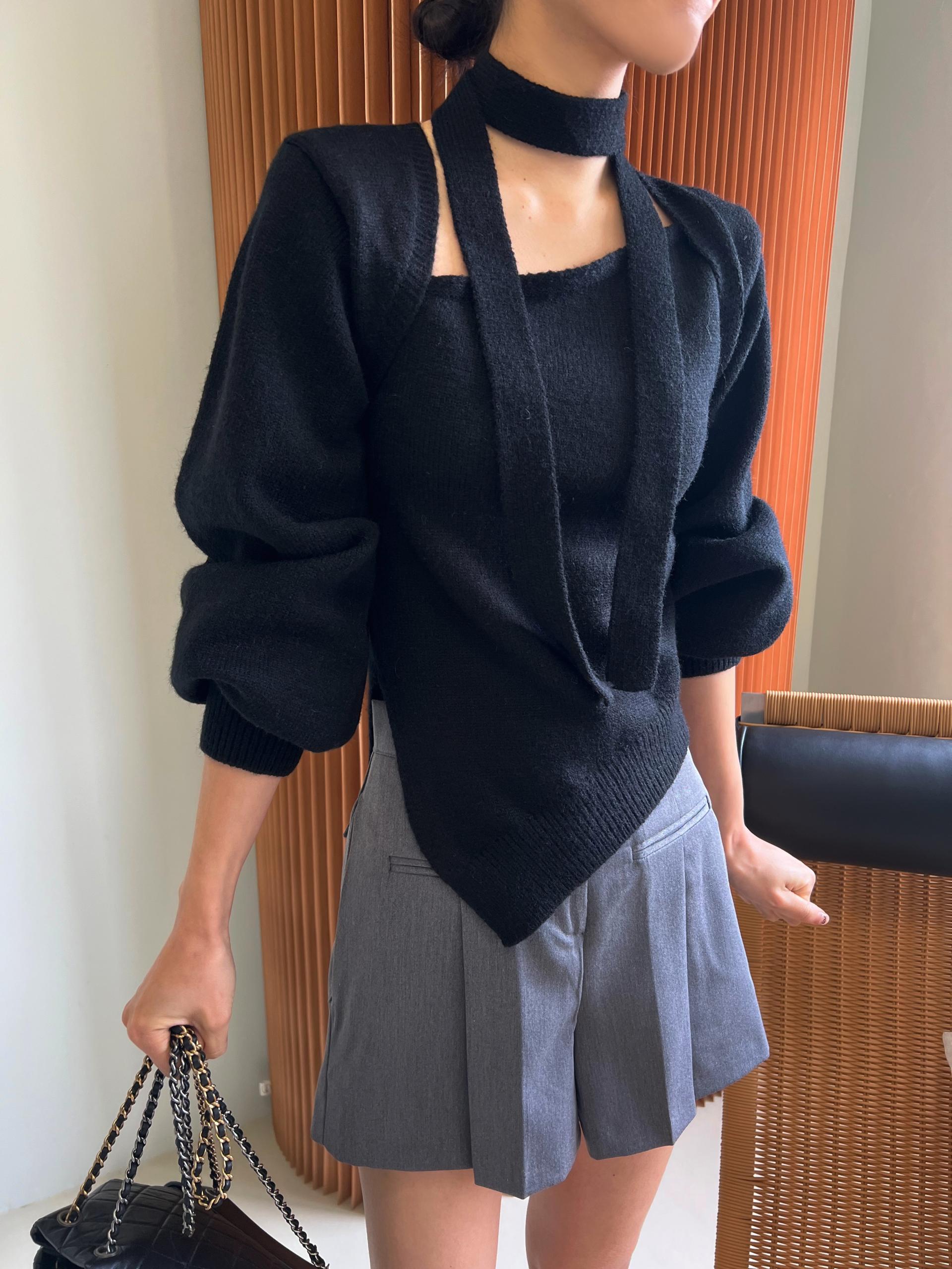 페이크 볼레로 디테일에 타이 머플러가 세트 구성인 니트 티셔츠입니다.