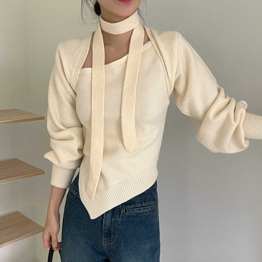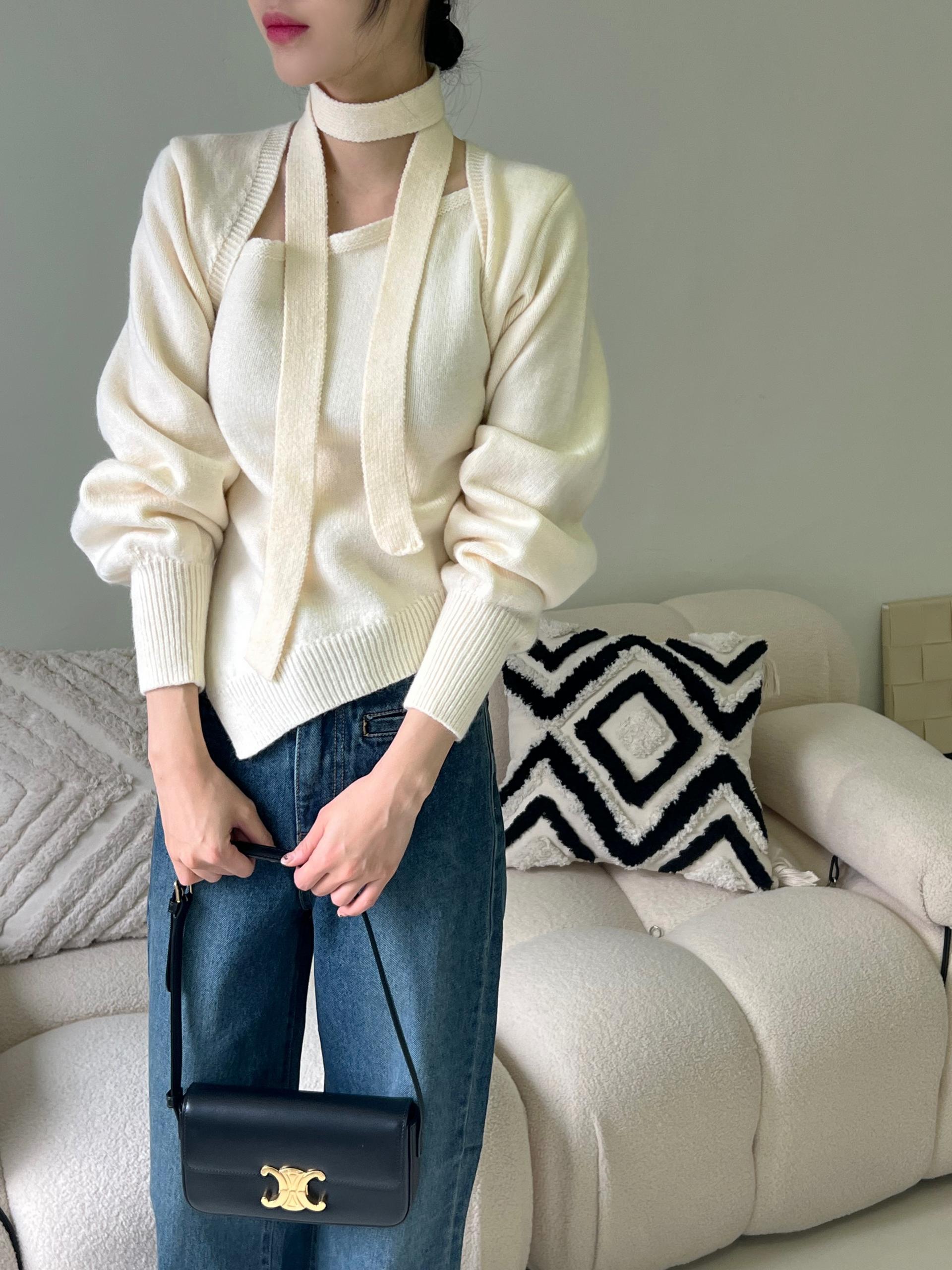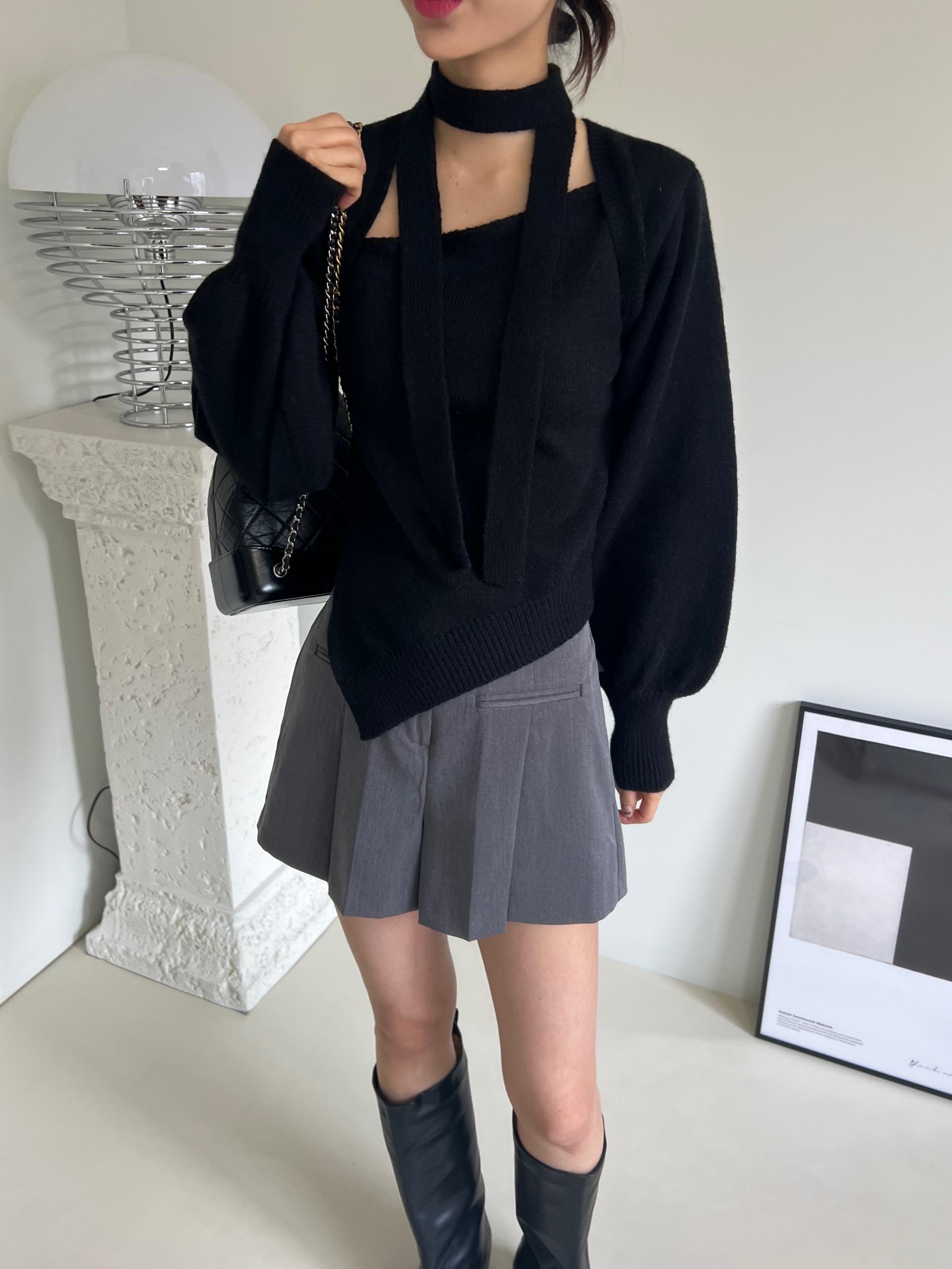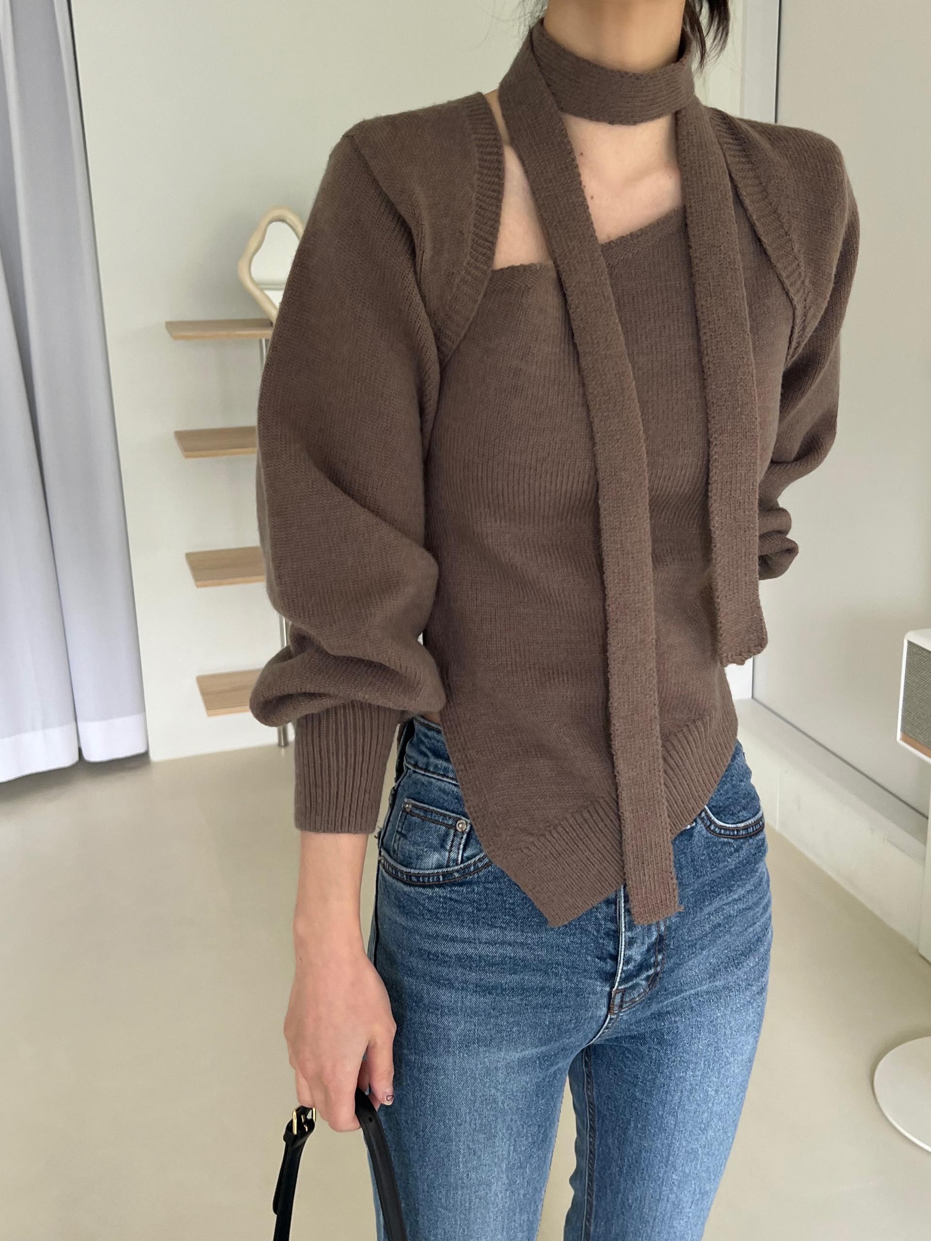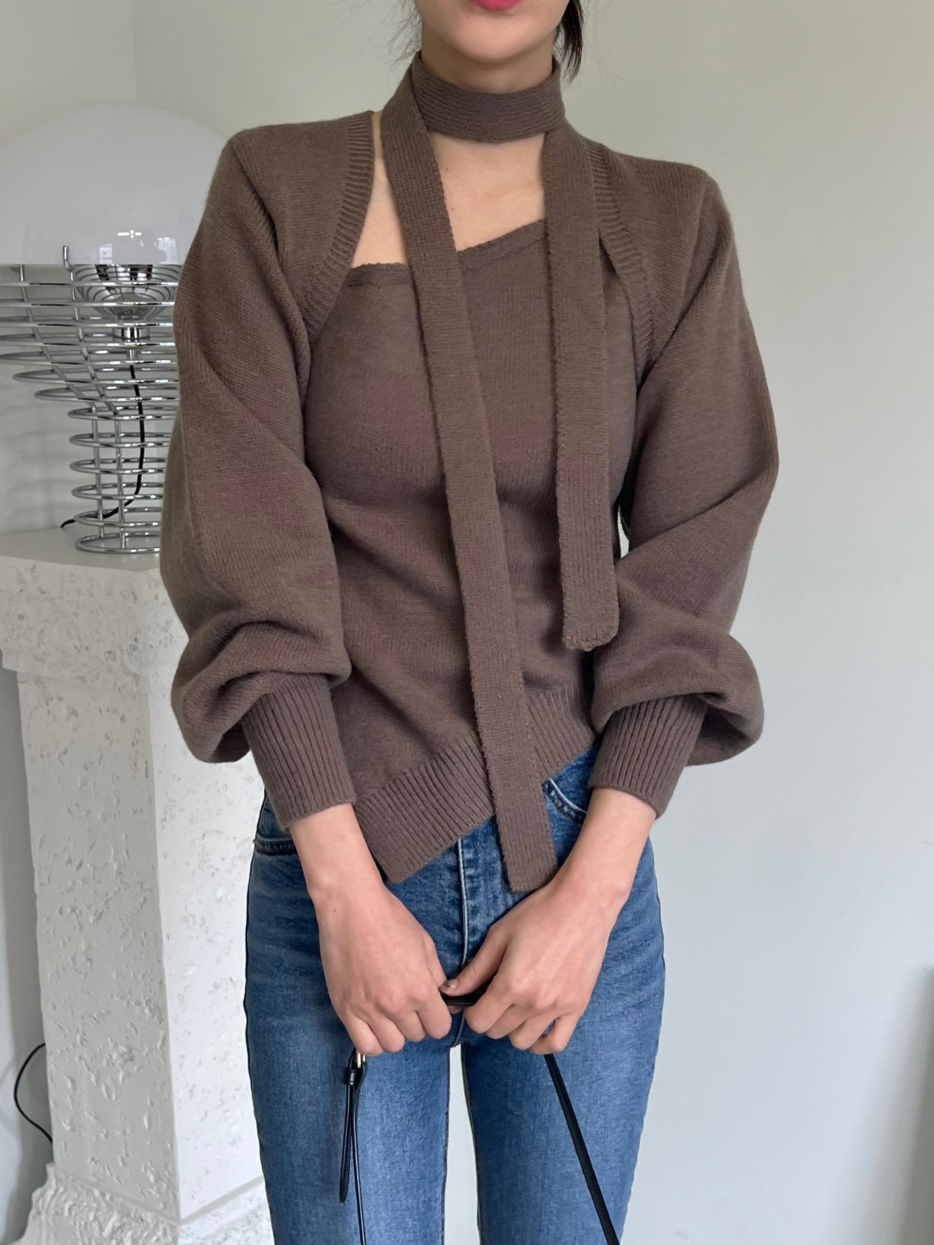 페이크 볼레로 디테일에 타이 머플러가 세트 구성인 니트 티셔츠입니다.