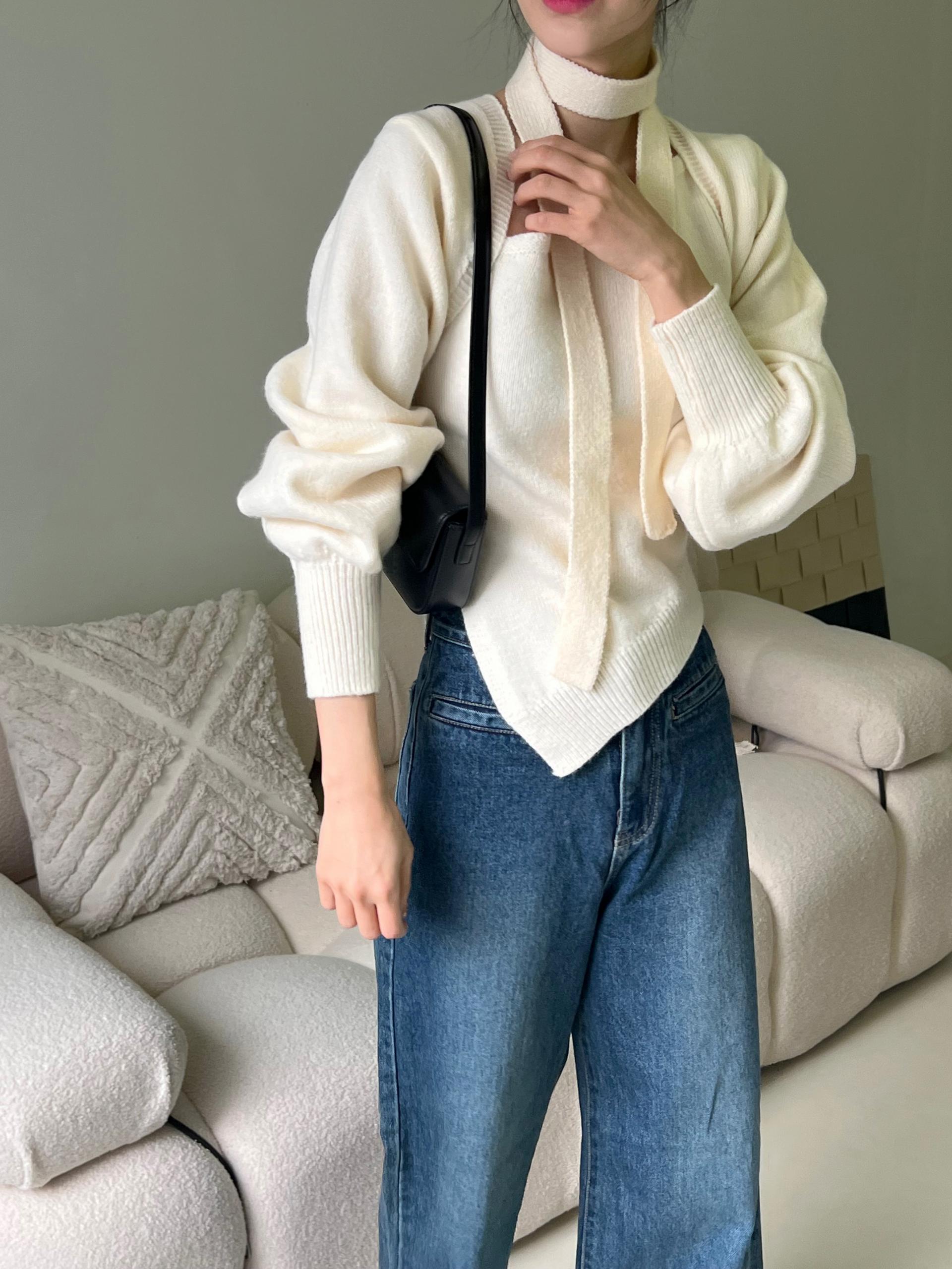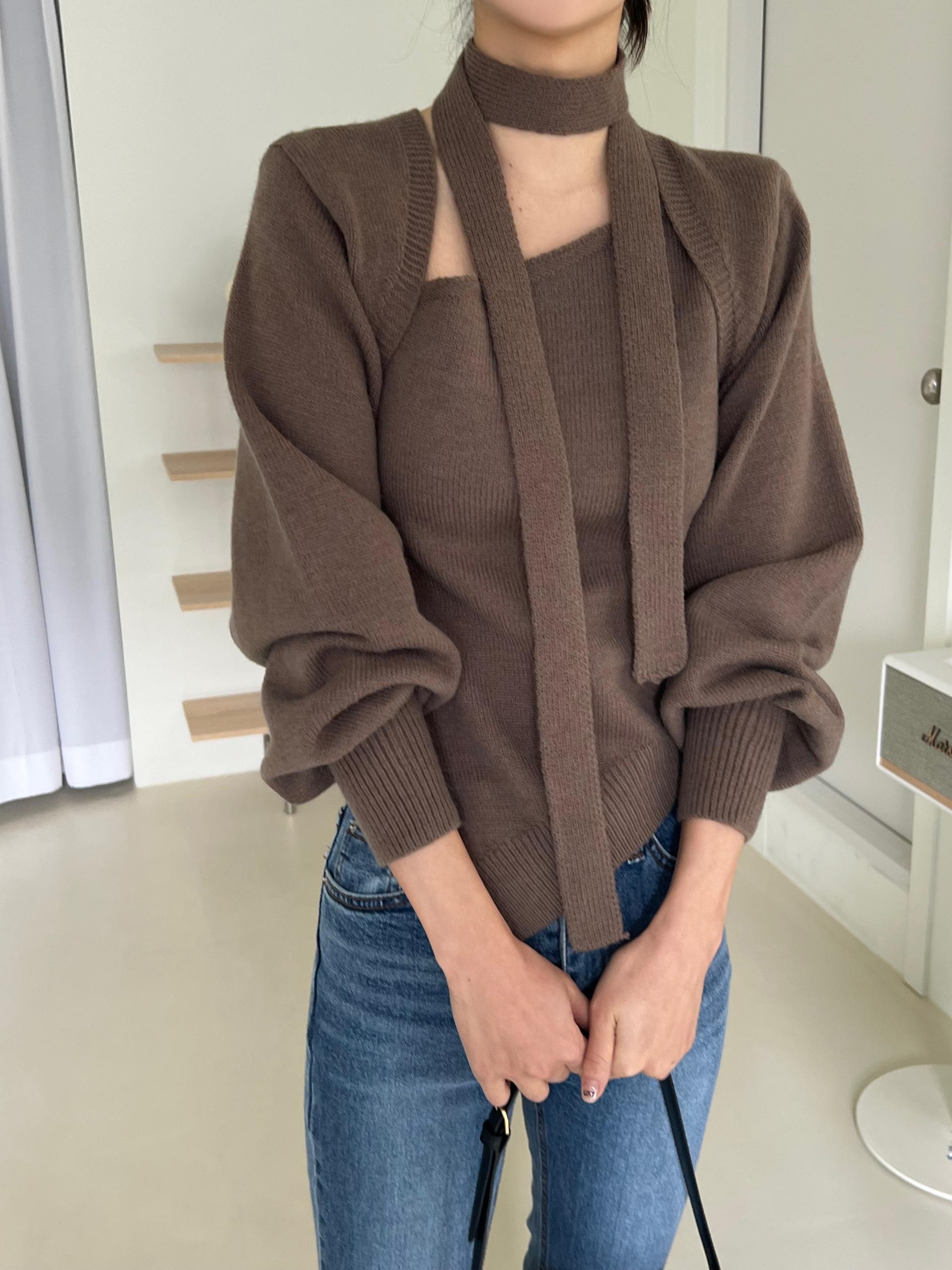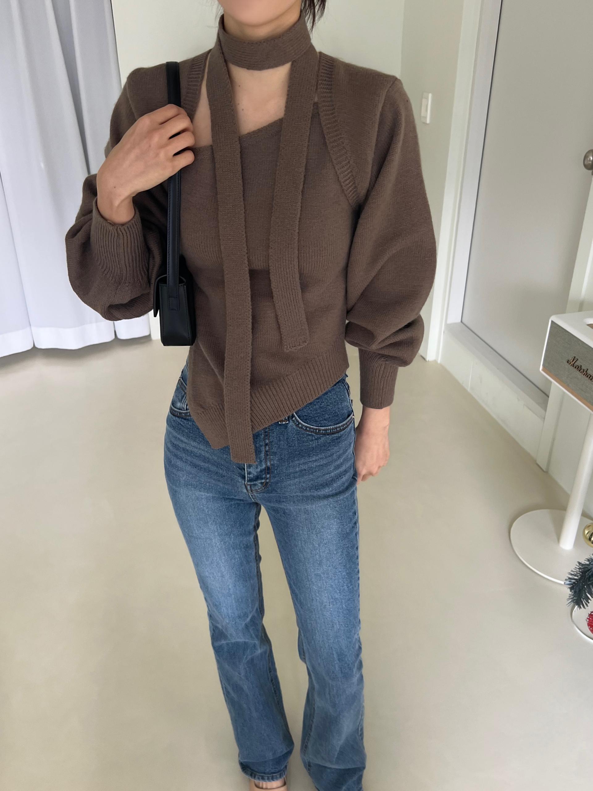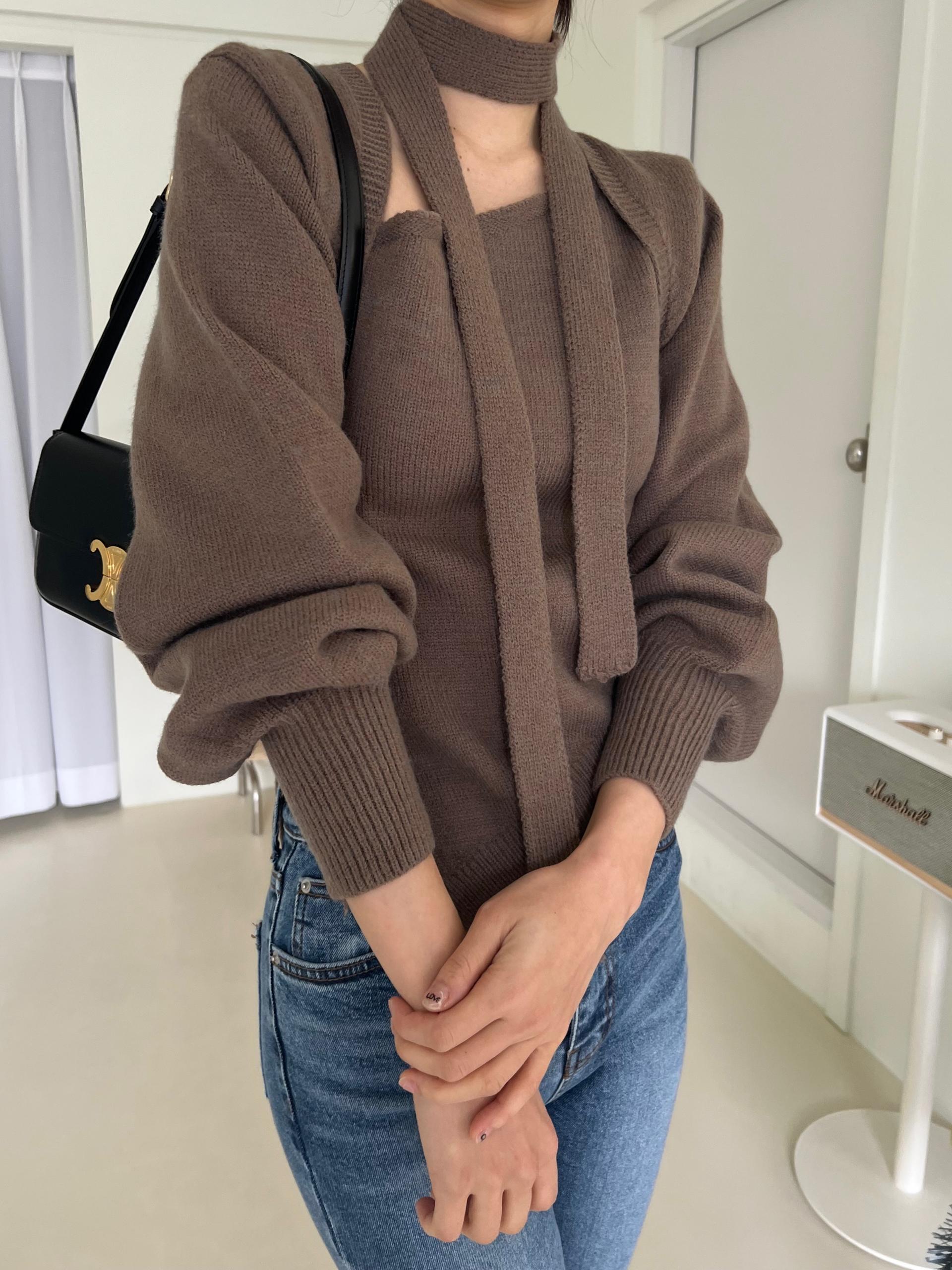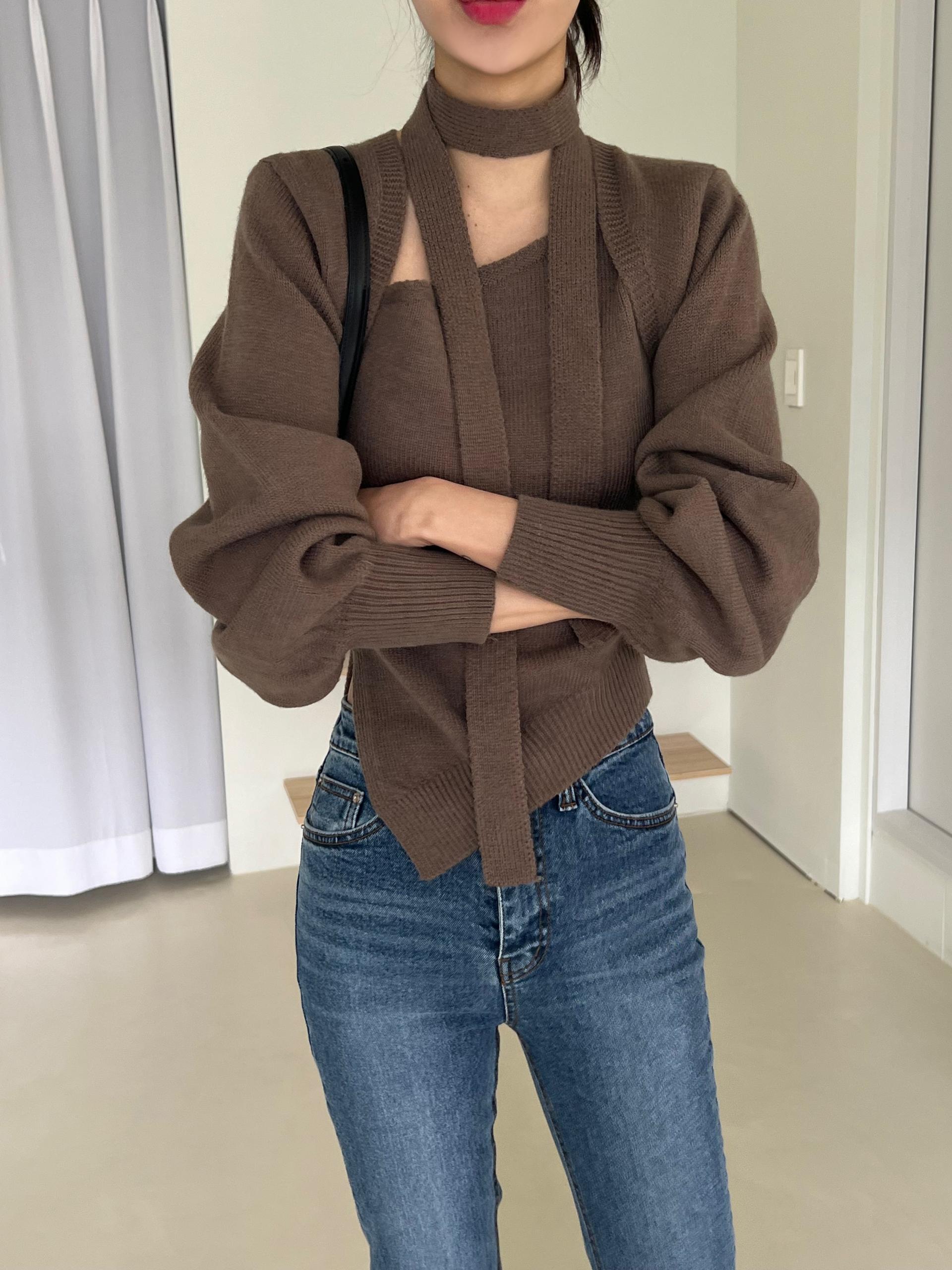 페이크 볼레로 디테일에 타이 머플러가 세트 구성인 니트 티셔츠입니다.