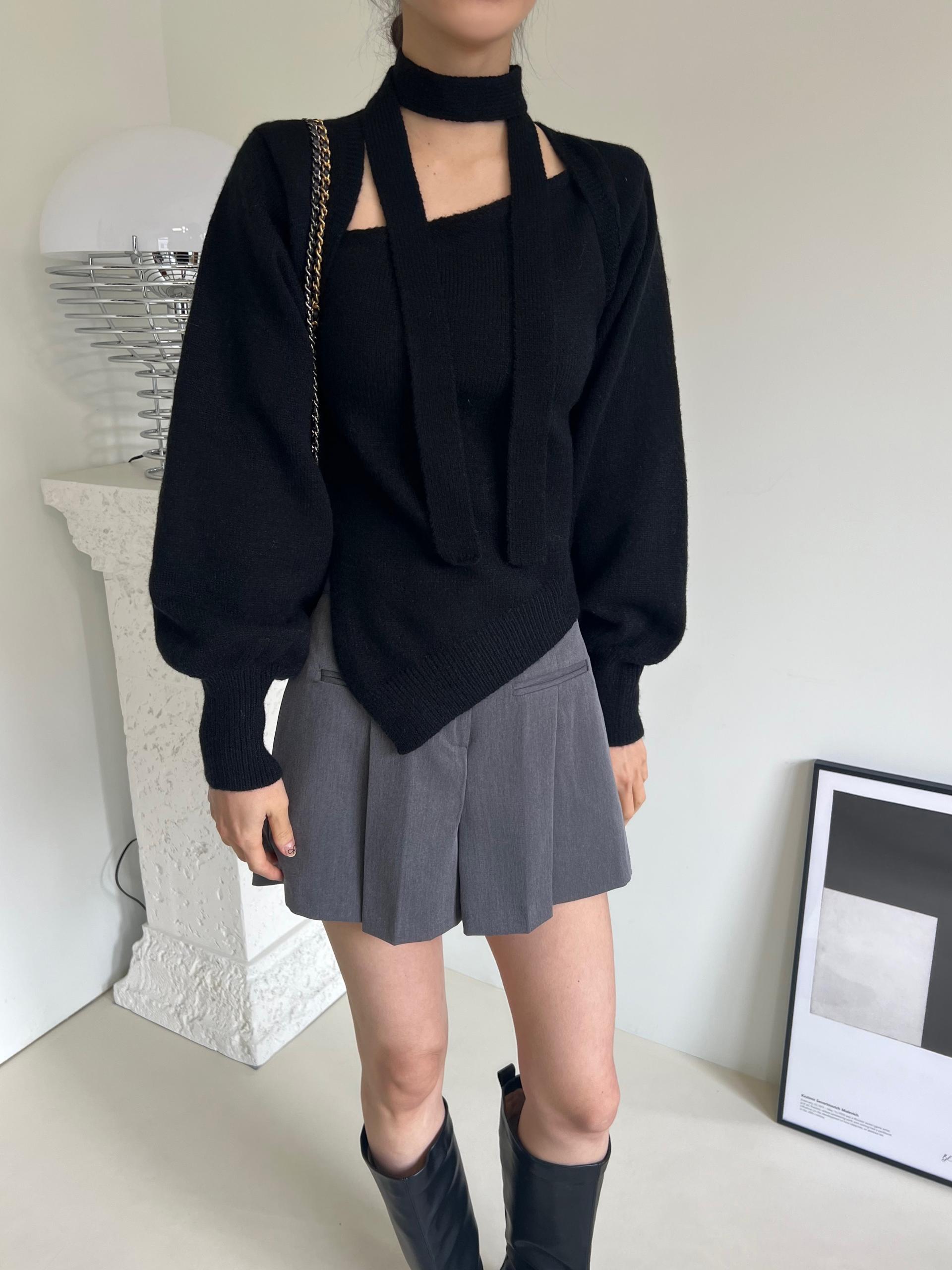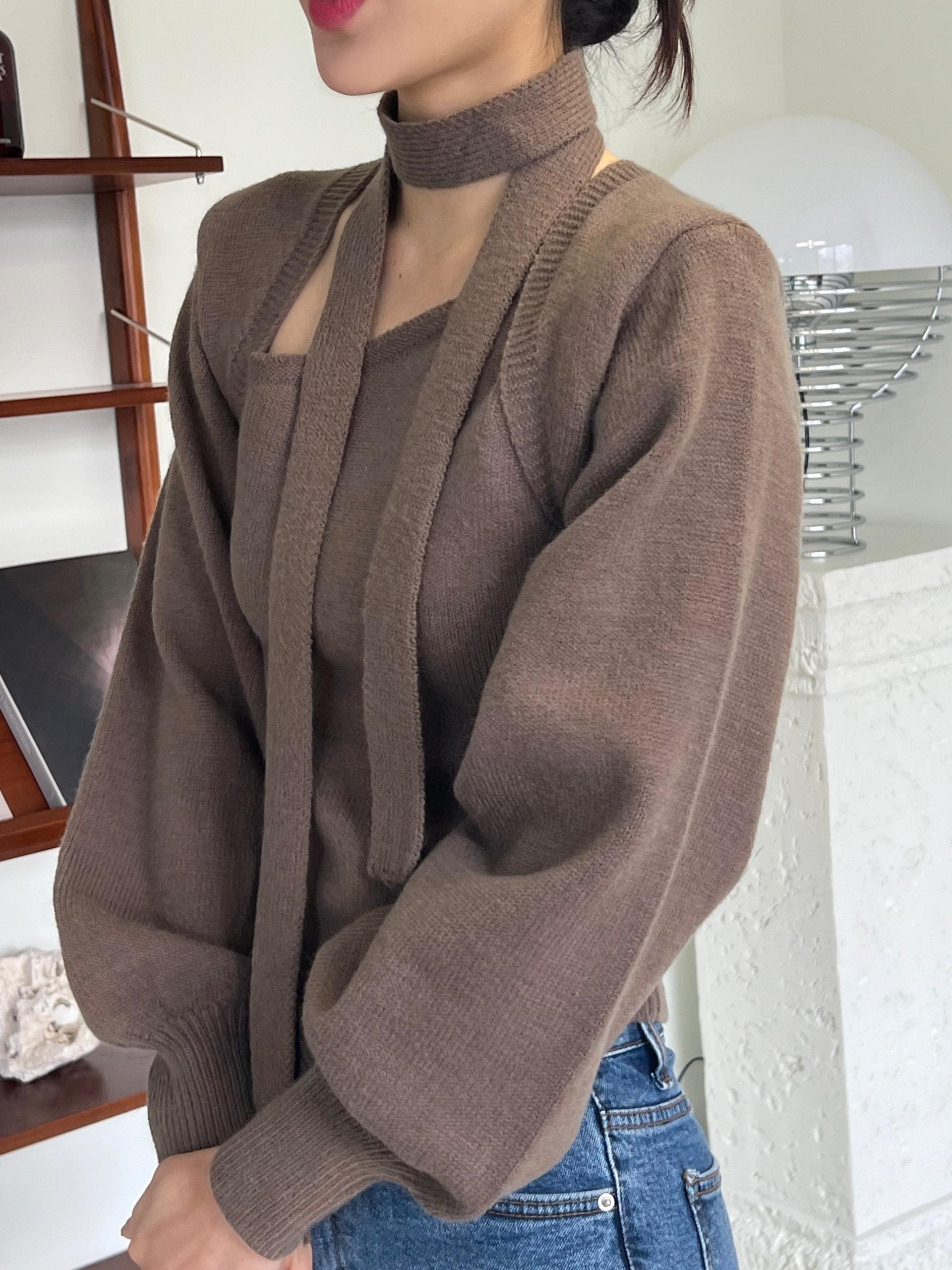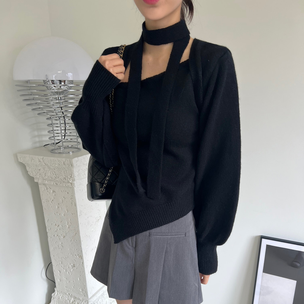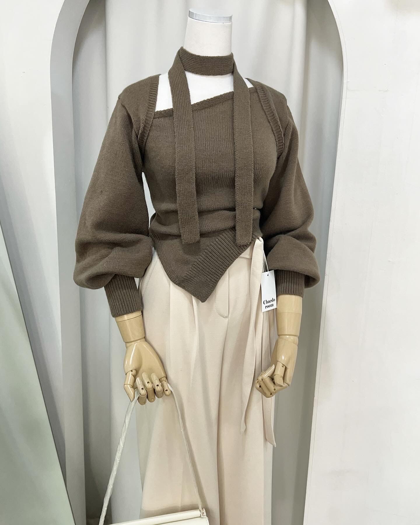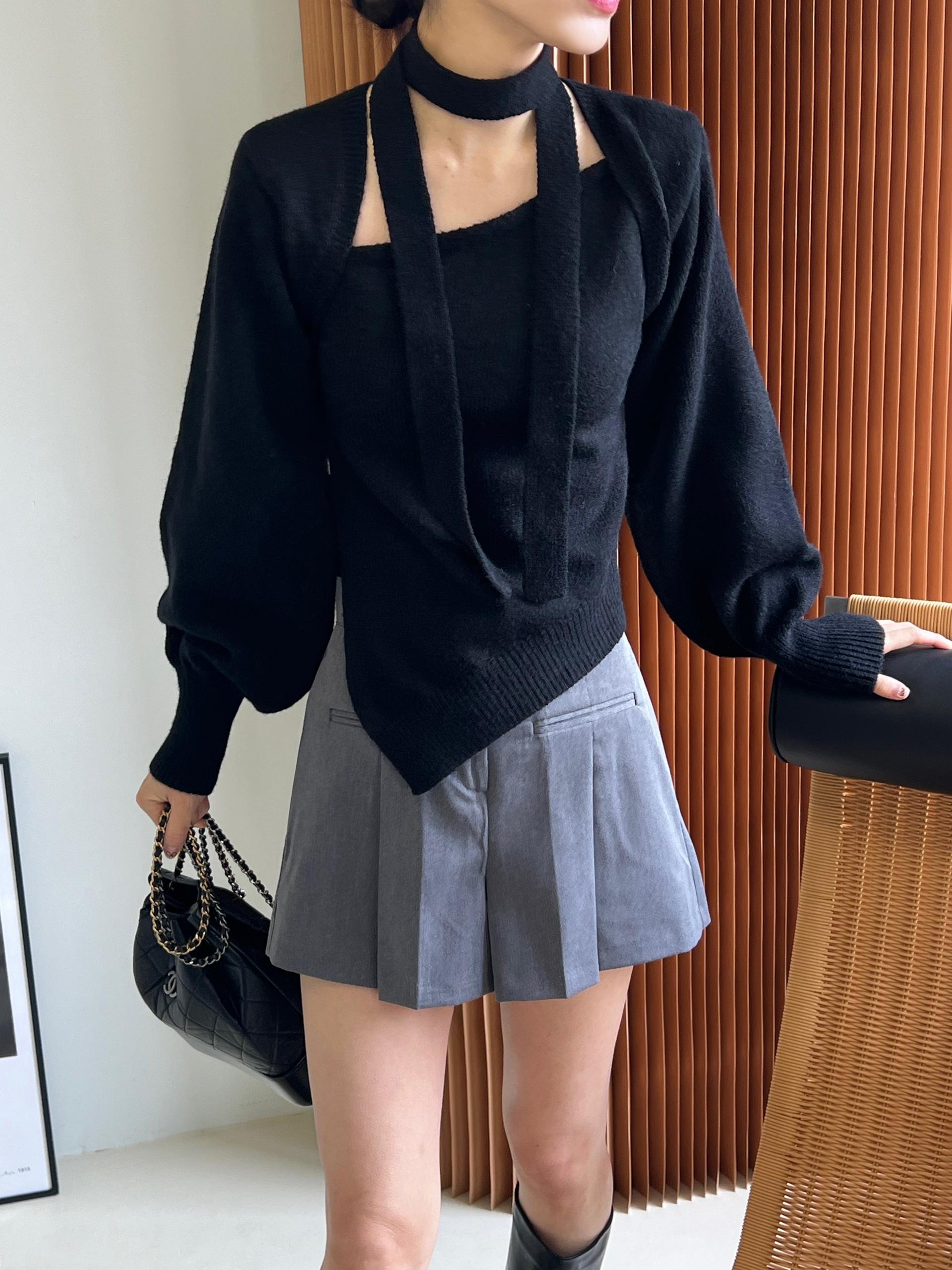 페이크 볼레로 디테일에 타이 머플러가 세트 구성인 니트 티셔츠입니다.