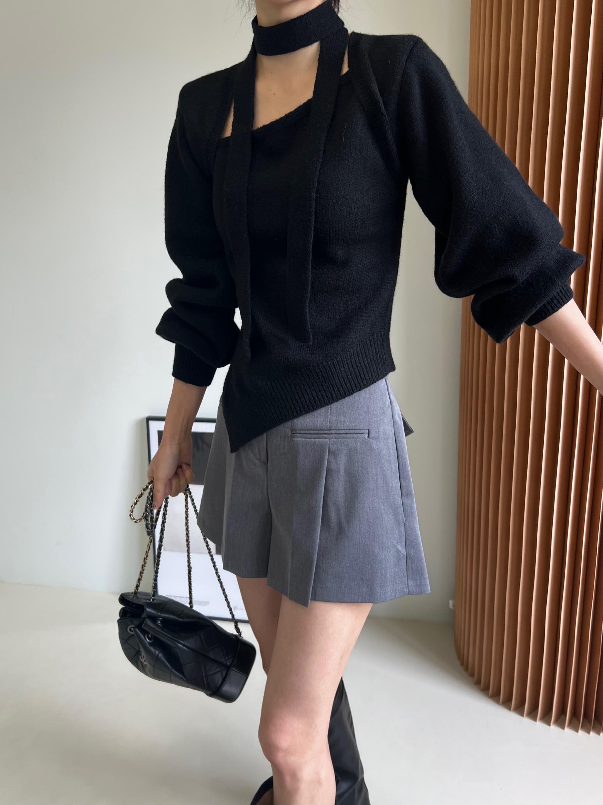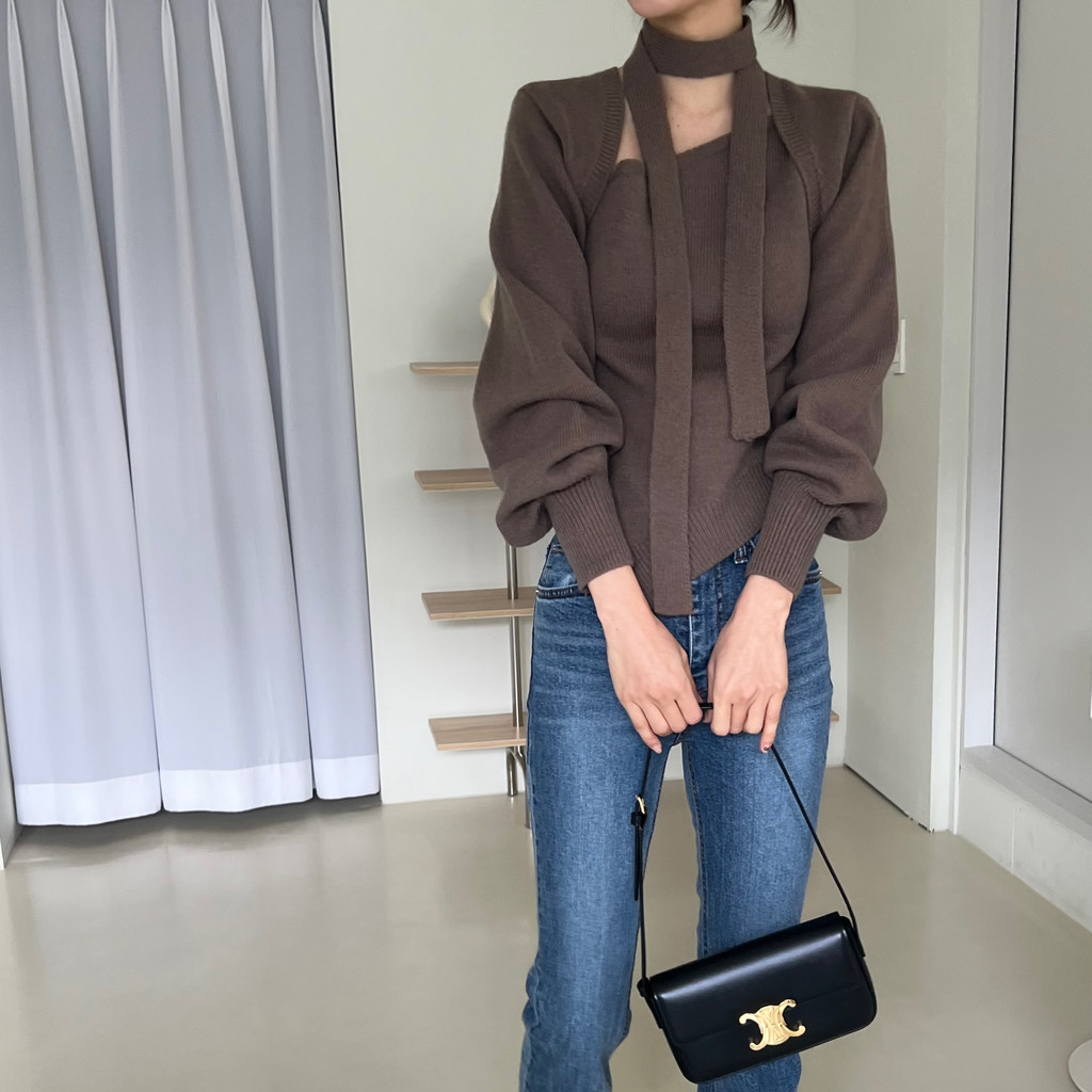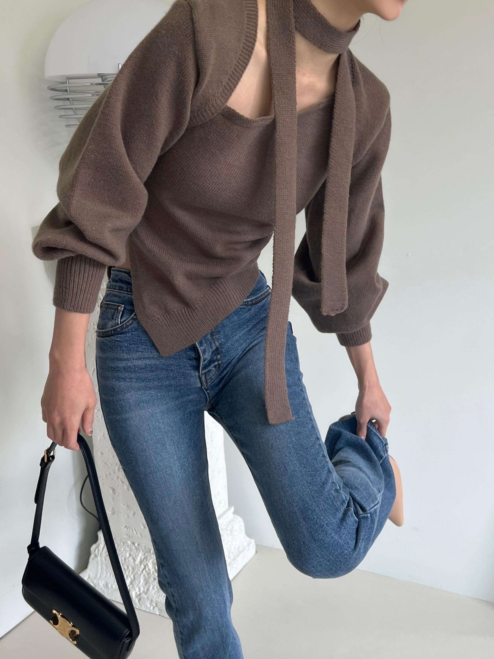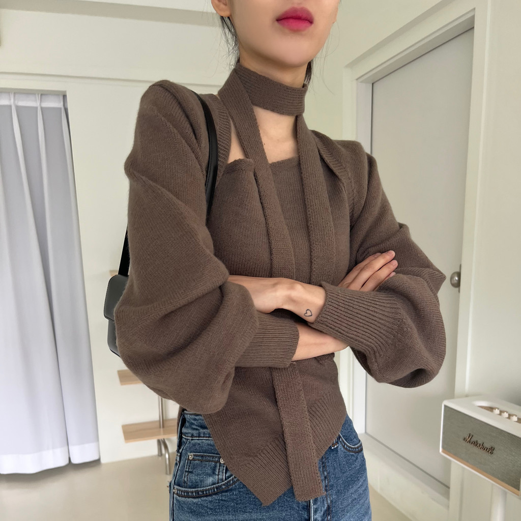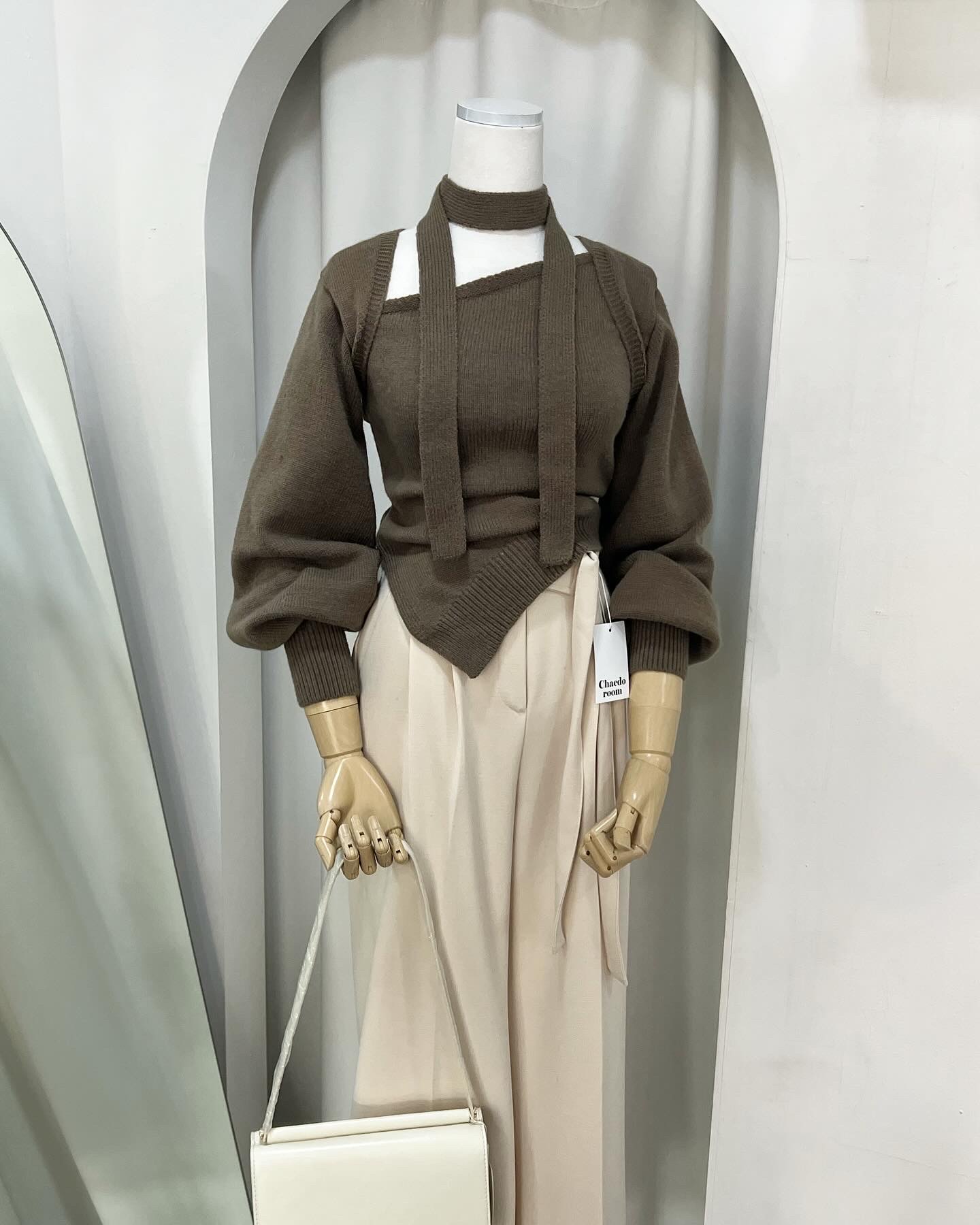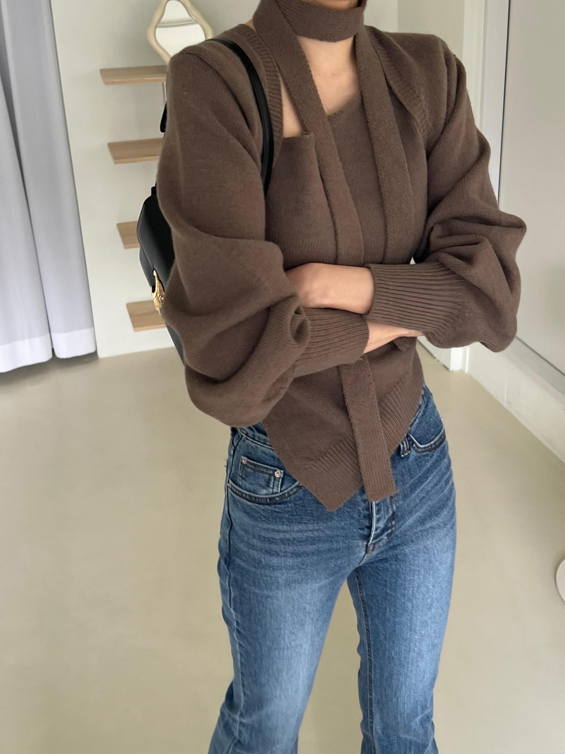 페이크 볼레로 디테일에 타이 머플러가 세트 구성인 니트 티셔츠입니다.