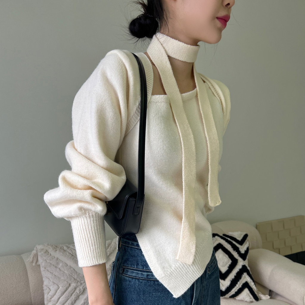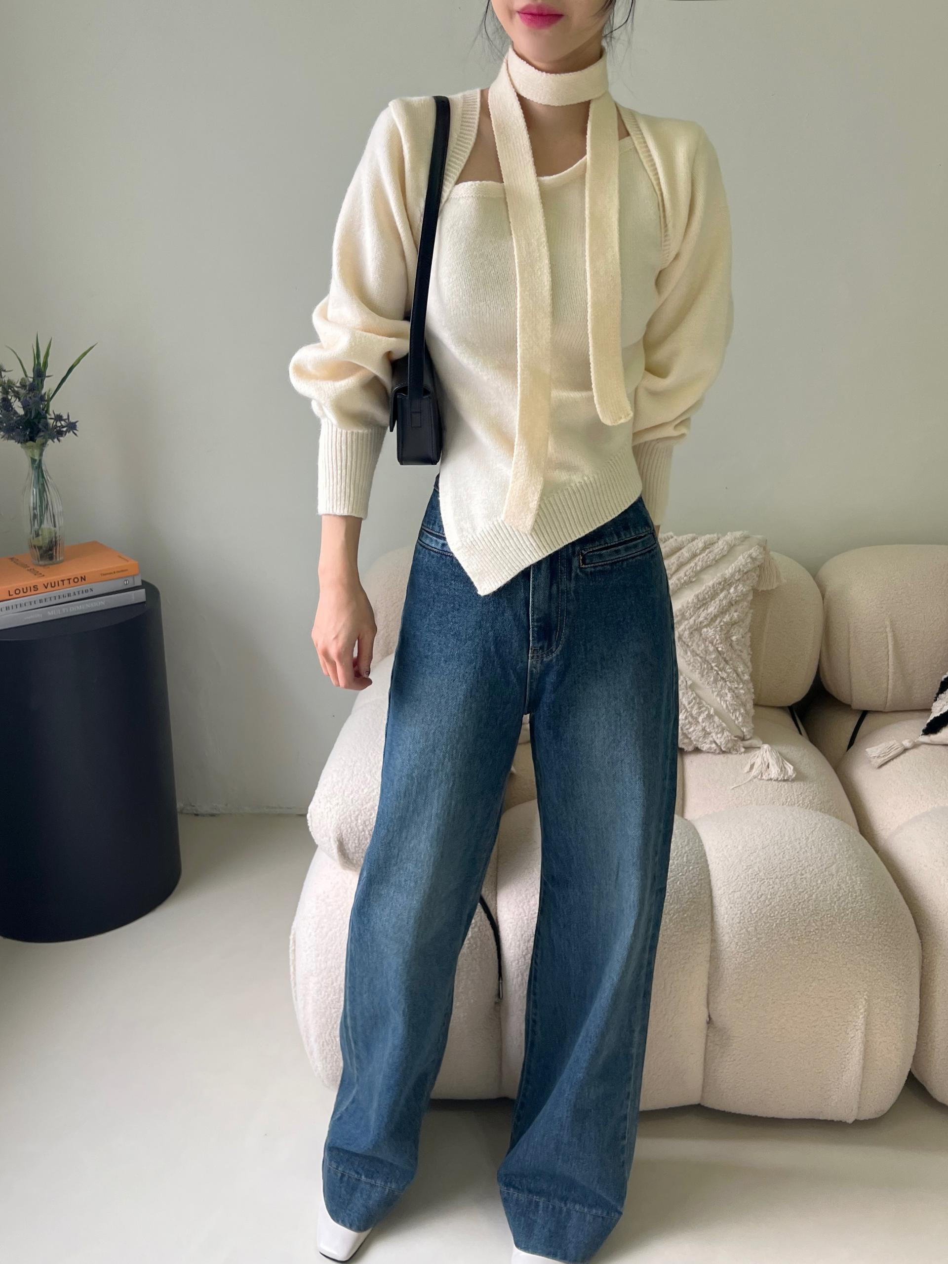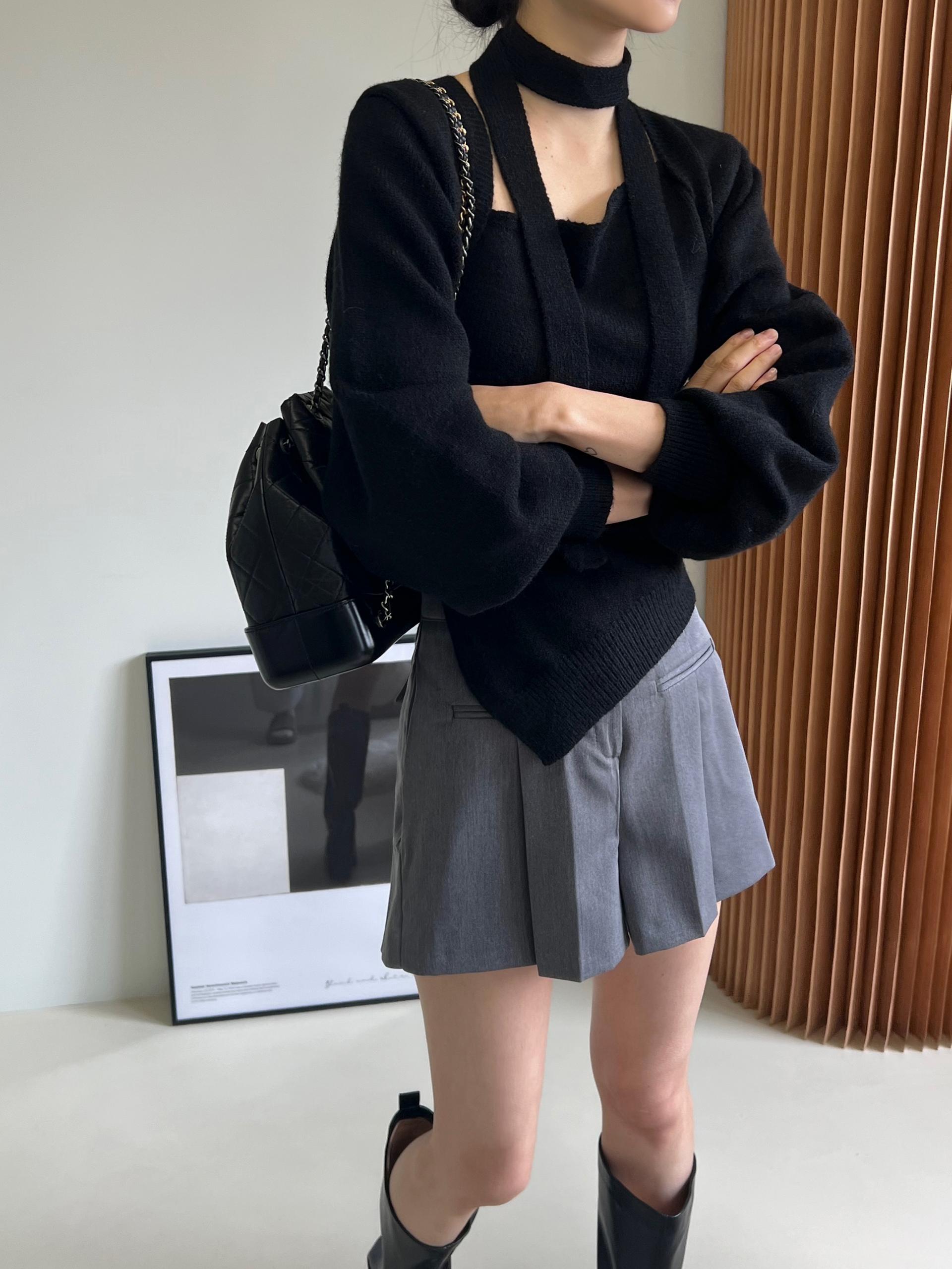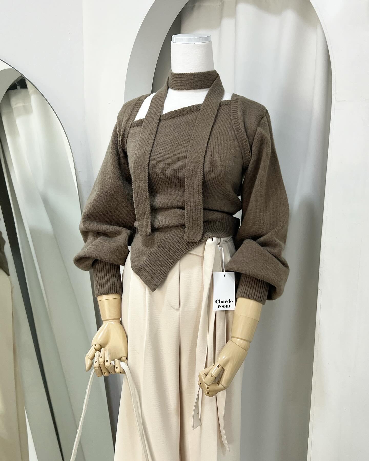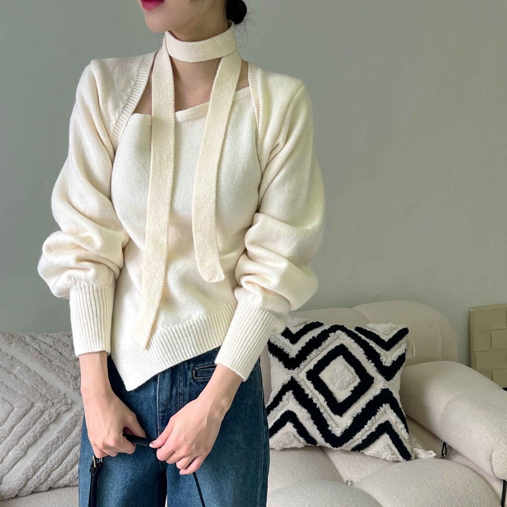 페이크 볼레로 디테일에 타이 머플러가 세트 구성인 니트 티셔츠입니다.