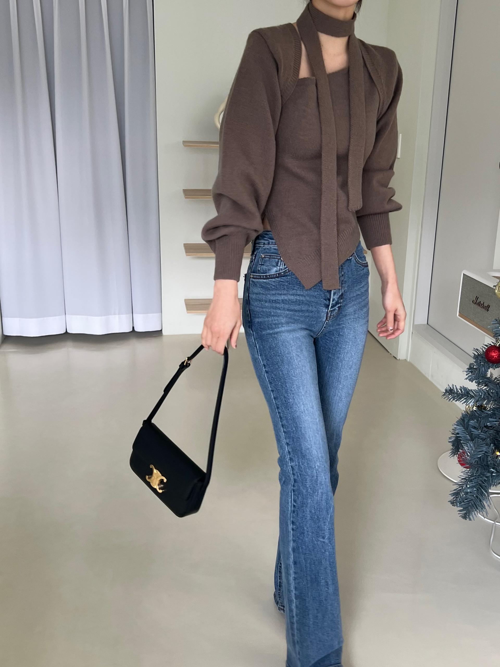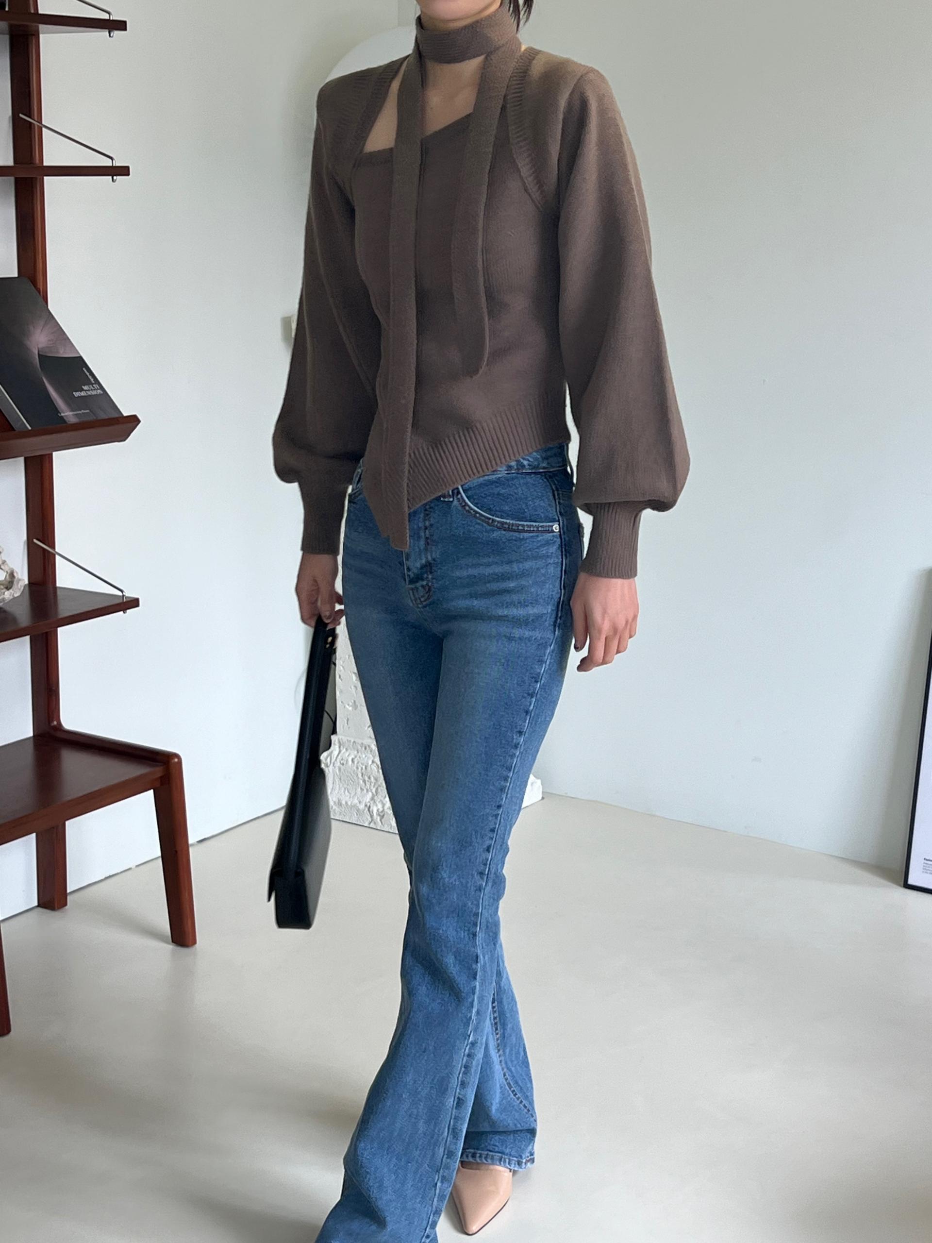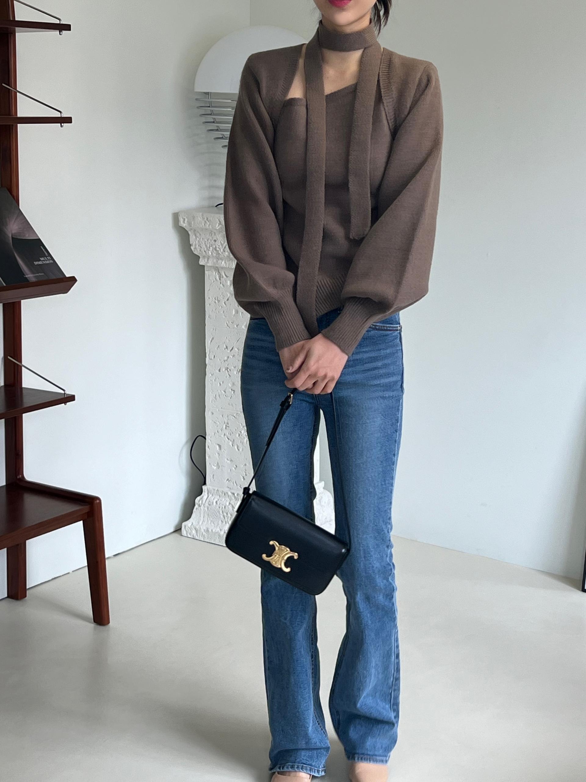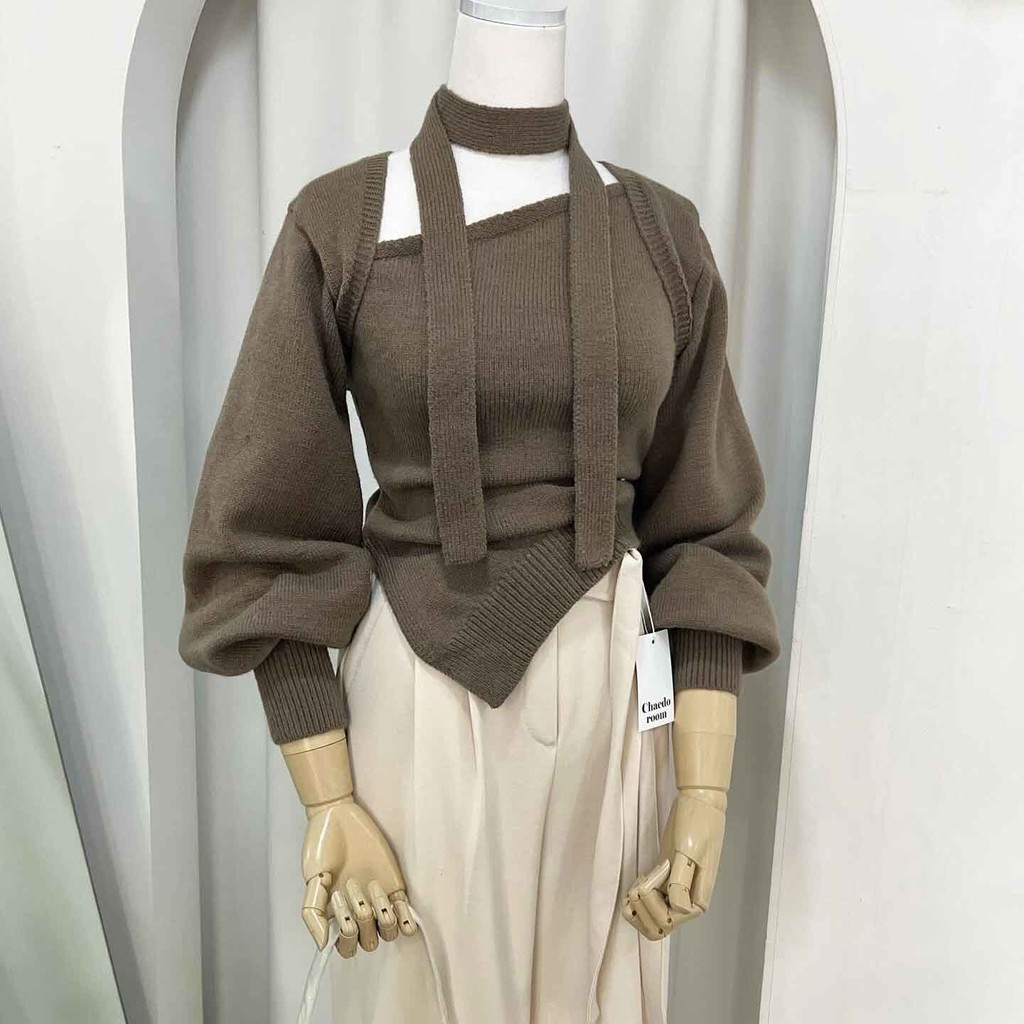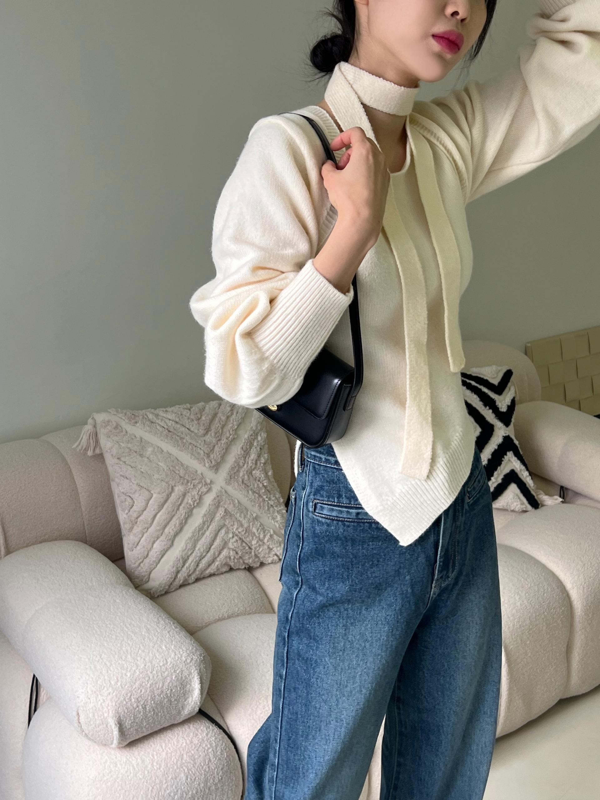 페이크 볼레로 디테일에 타이 머플러가 세트 구성인 니트 티셔츠입니다.