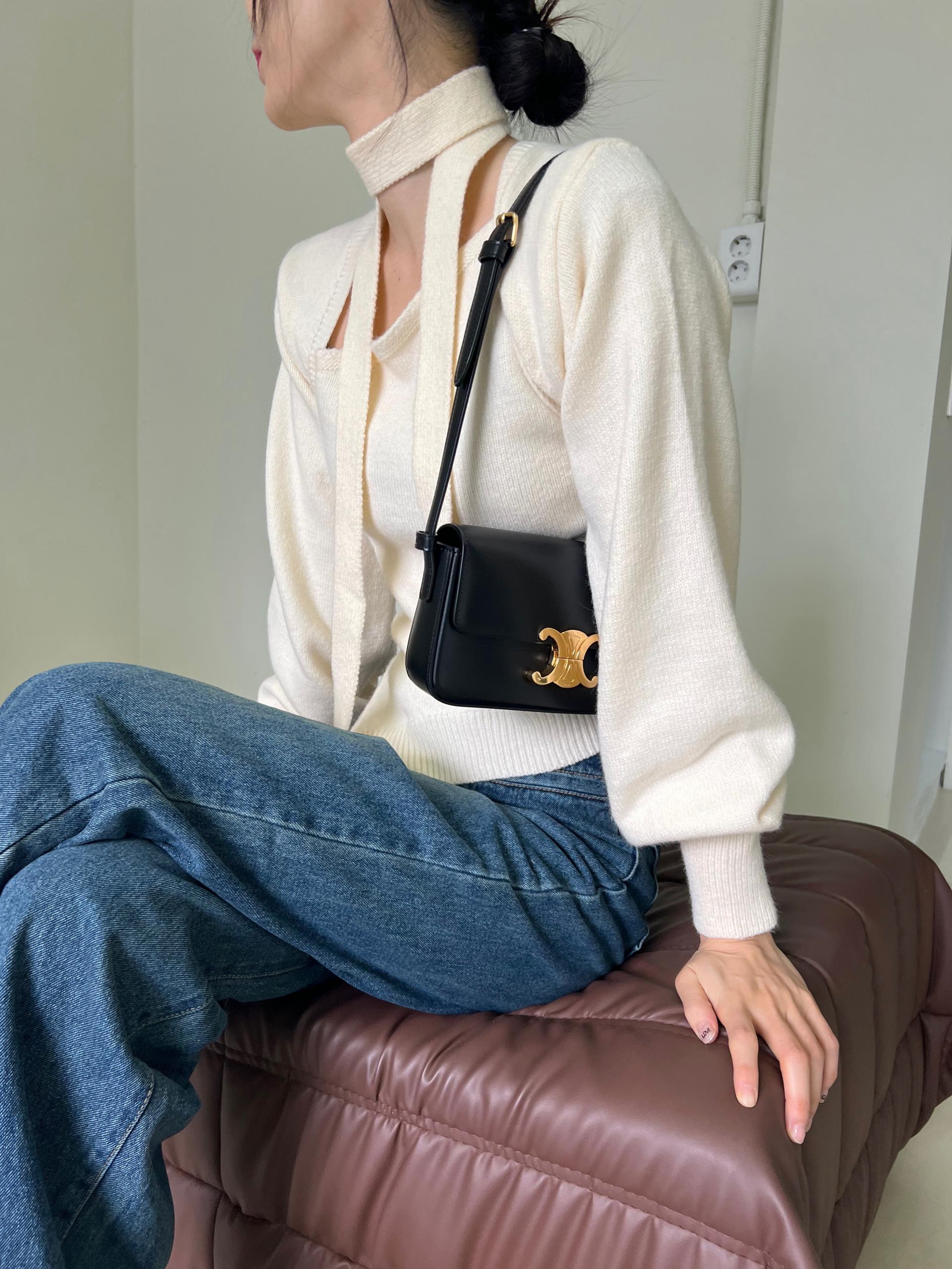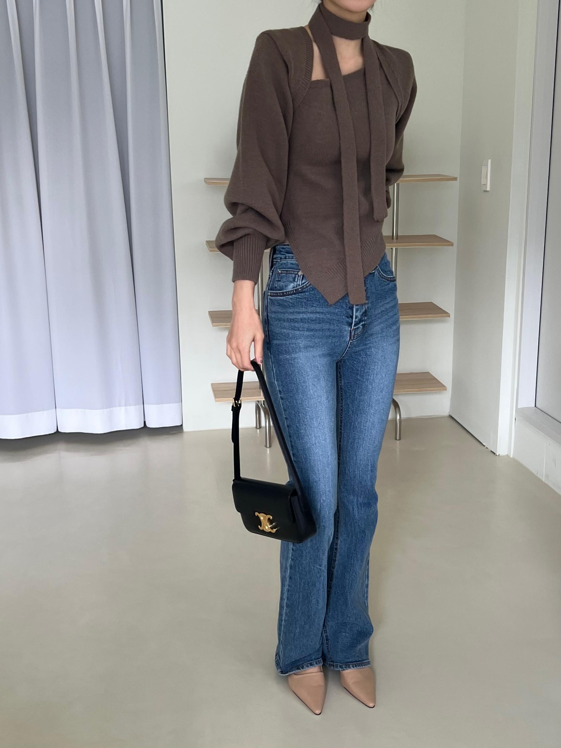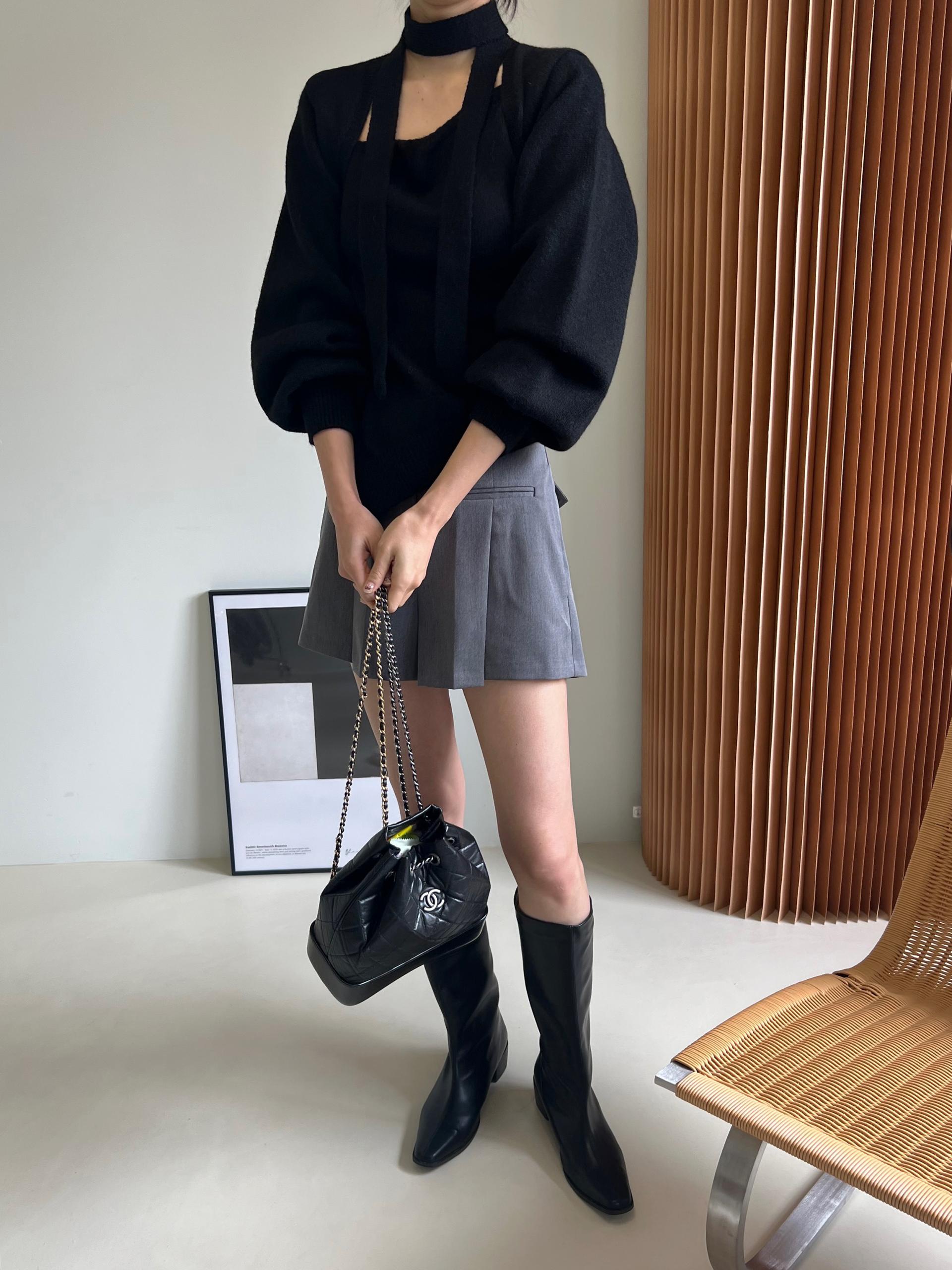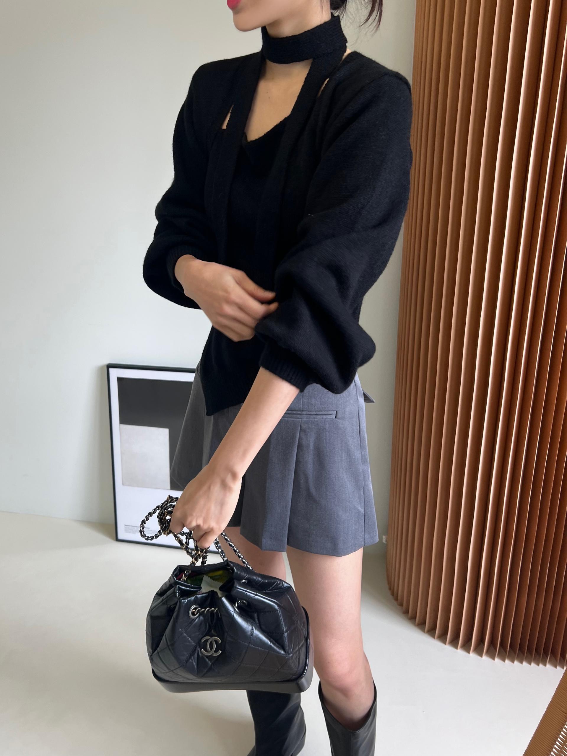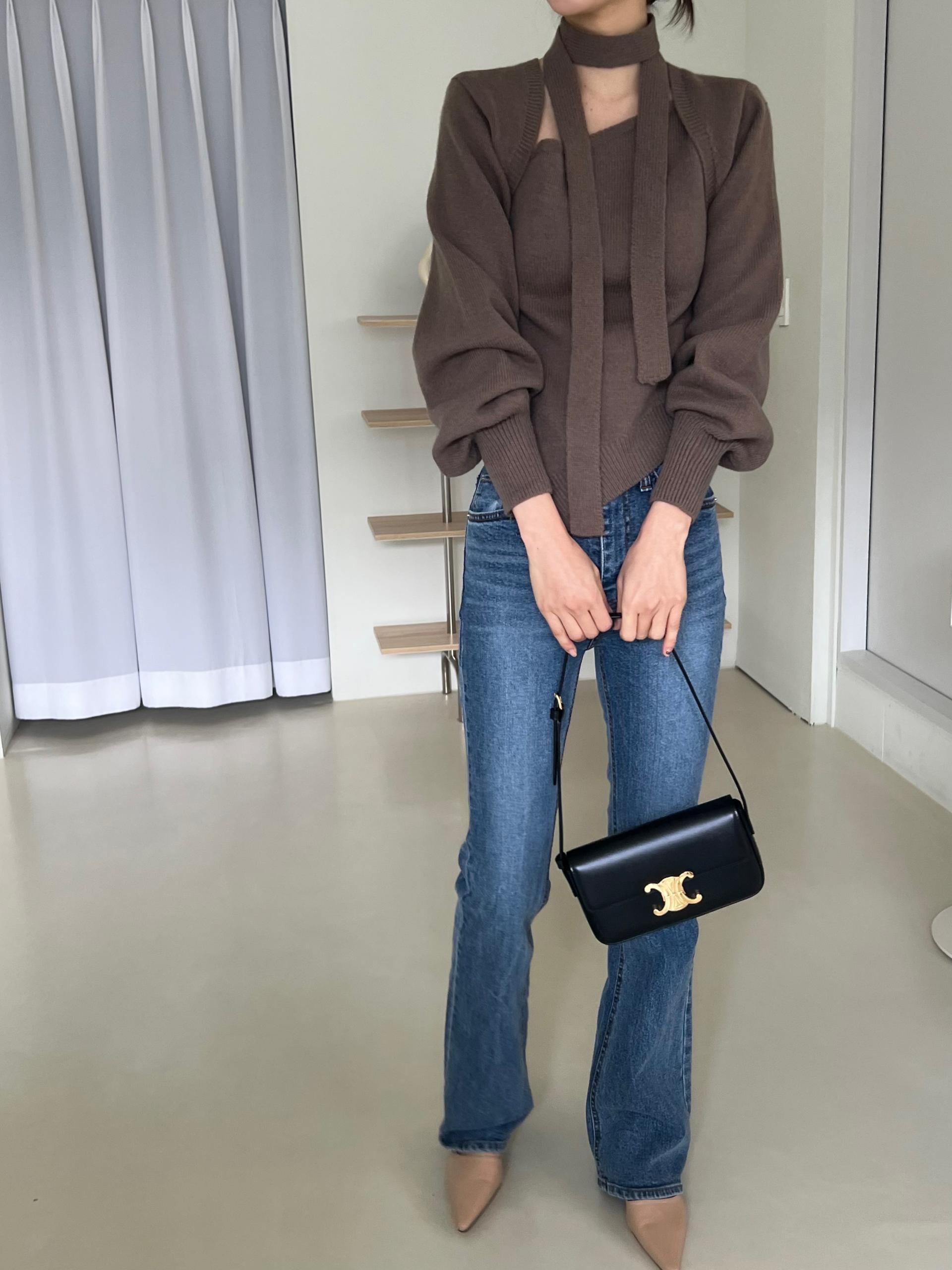 페이크 볼레로 디테일에 타이 머플러가 세트 구성인 니트 티셔츠입니다.