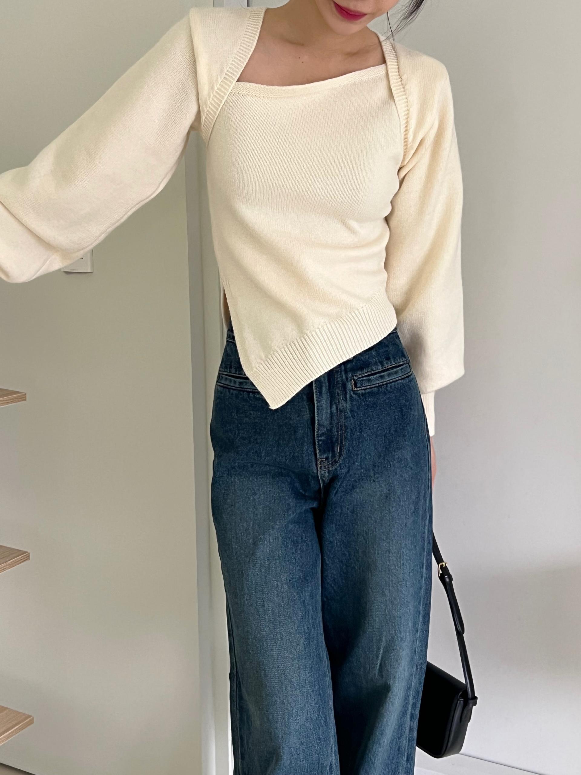 볼레로를 입은 듯한 디자인에 사선으로 이어지는 스퀘어넥으로 노출이 없으면서 아주 여리여리한 느낌입니다. 소매는 여유 있는 벌룬 소매라 팔 부분을 커버해 주고, 바디는 슬림한 핏인데 신축성이 좋아 44-77까지 모두 추천드려요. 언발란스하게 떨어지는 밑단으로 허리가 가늘어 보이는 착시도 있어 핏이 정말 완벽하게 예쁜 니트입니다.