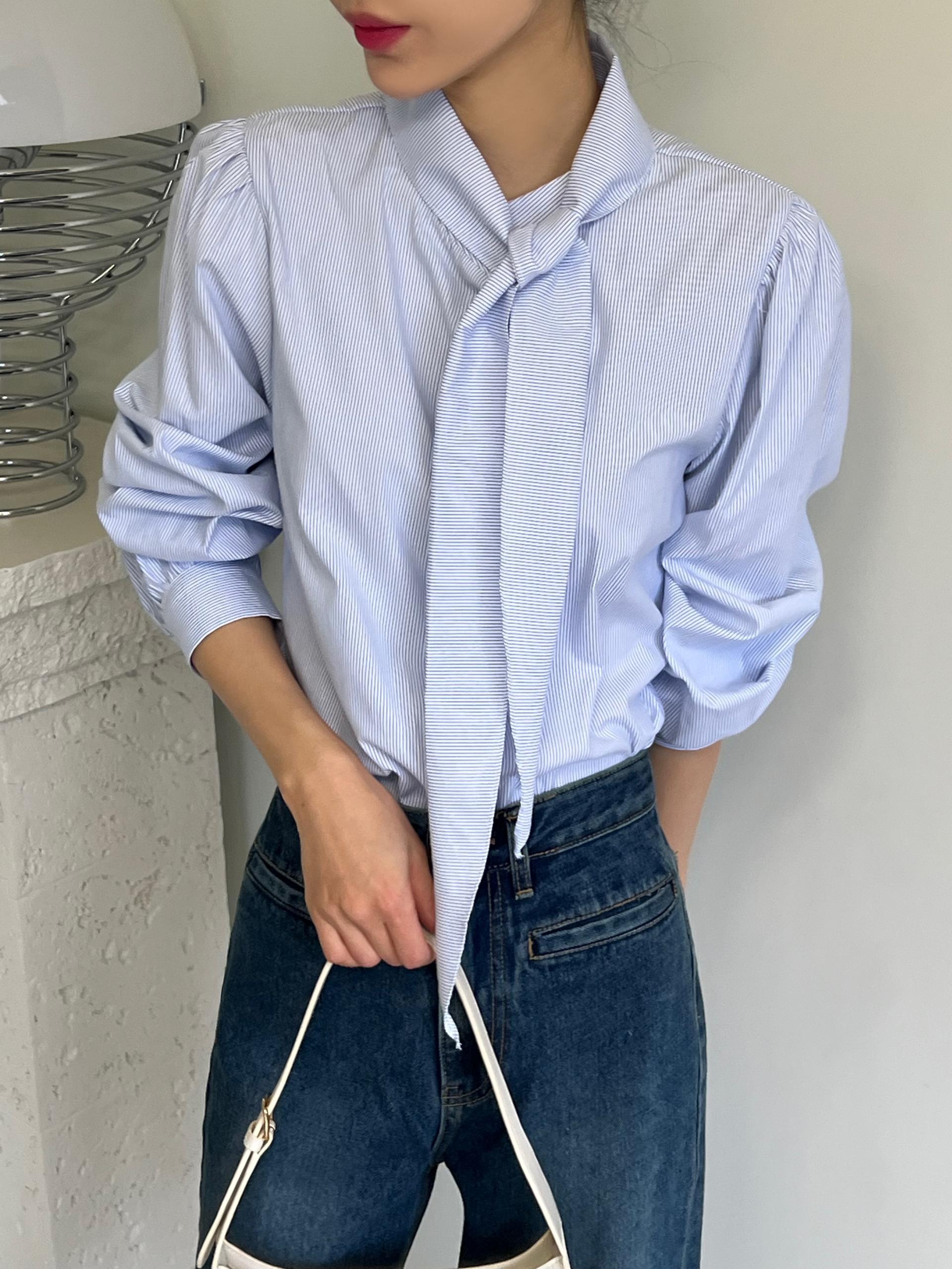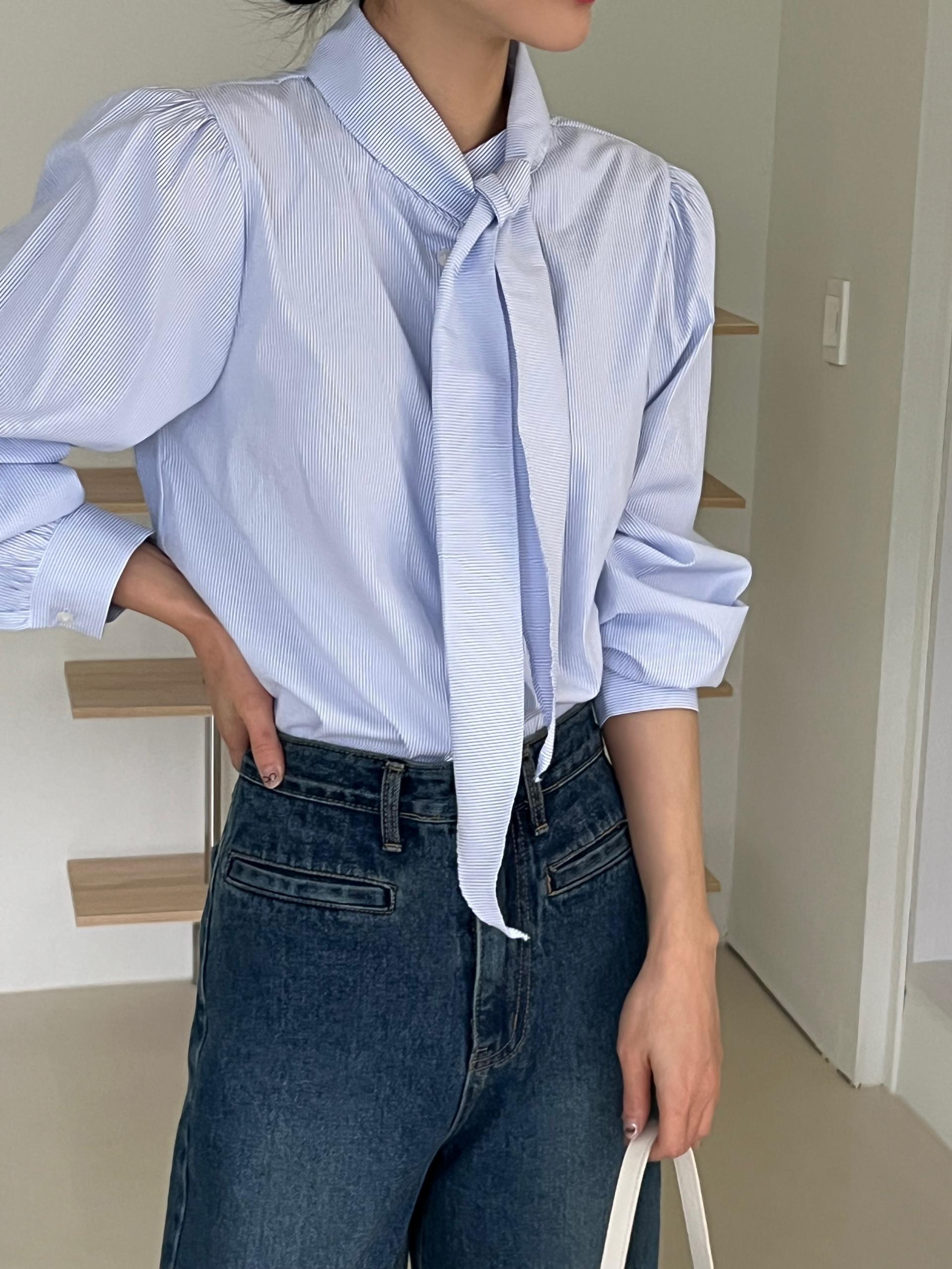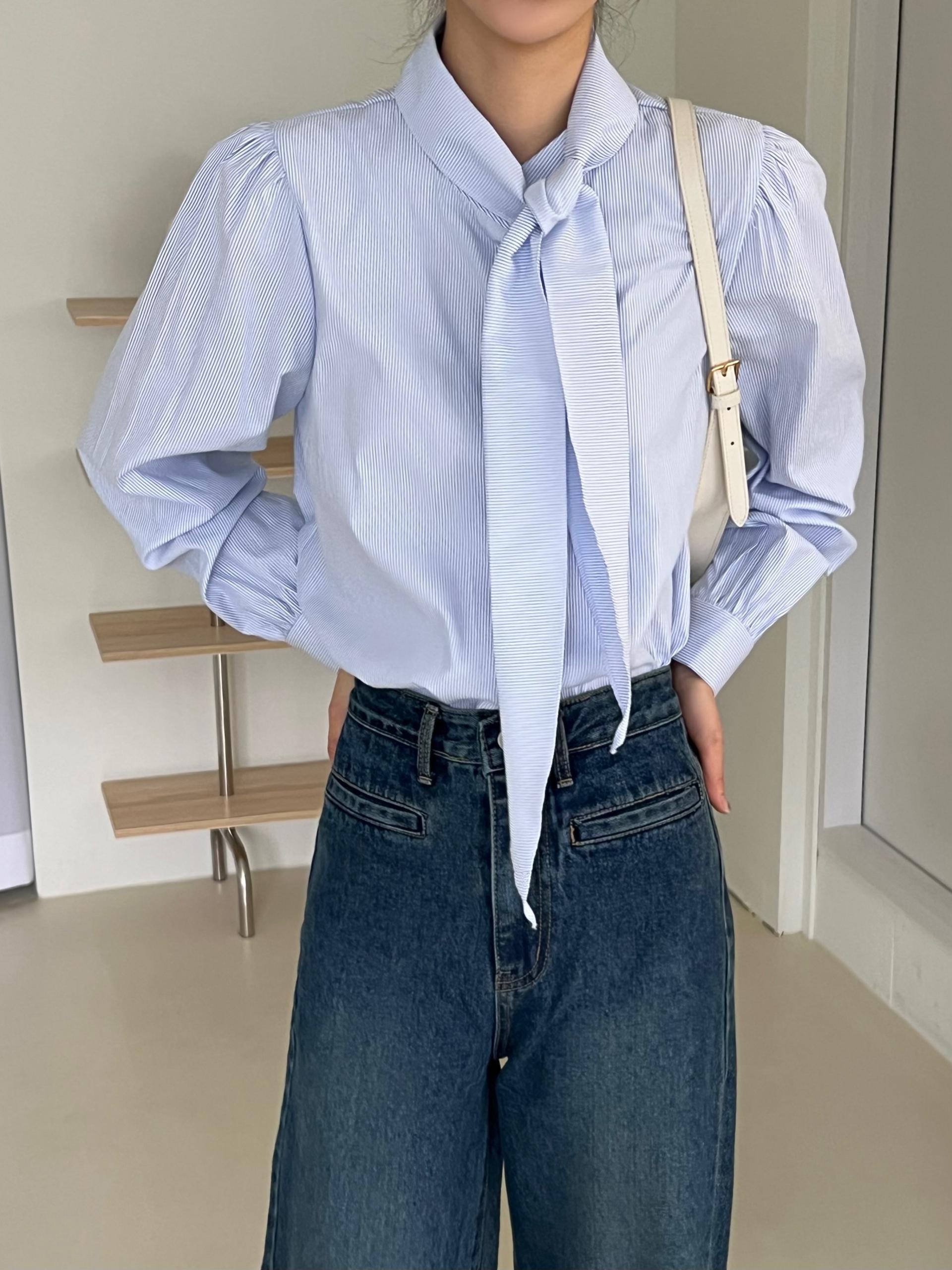 시원한 스트라이프 패턴으로 밋밋하지 않고 하이넥이지만 답답한 느낌이 없습니다. 과하지 않은 퍼프소매로 어깨와 팔 라인이 정돈된 느낌이 들고, 전체적으로 부하지 않은 기본 핏이라 호불호 없이 좋아해 주실 핏입니다. 데님이나 슬랙스 모두 잘 어울려요. 캐주얼한 스타일부터 격식 있는 스타일까지 스타일링에 따라 다양한 분위기를 내는 타이 블라우스입니다.