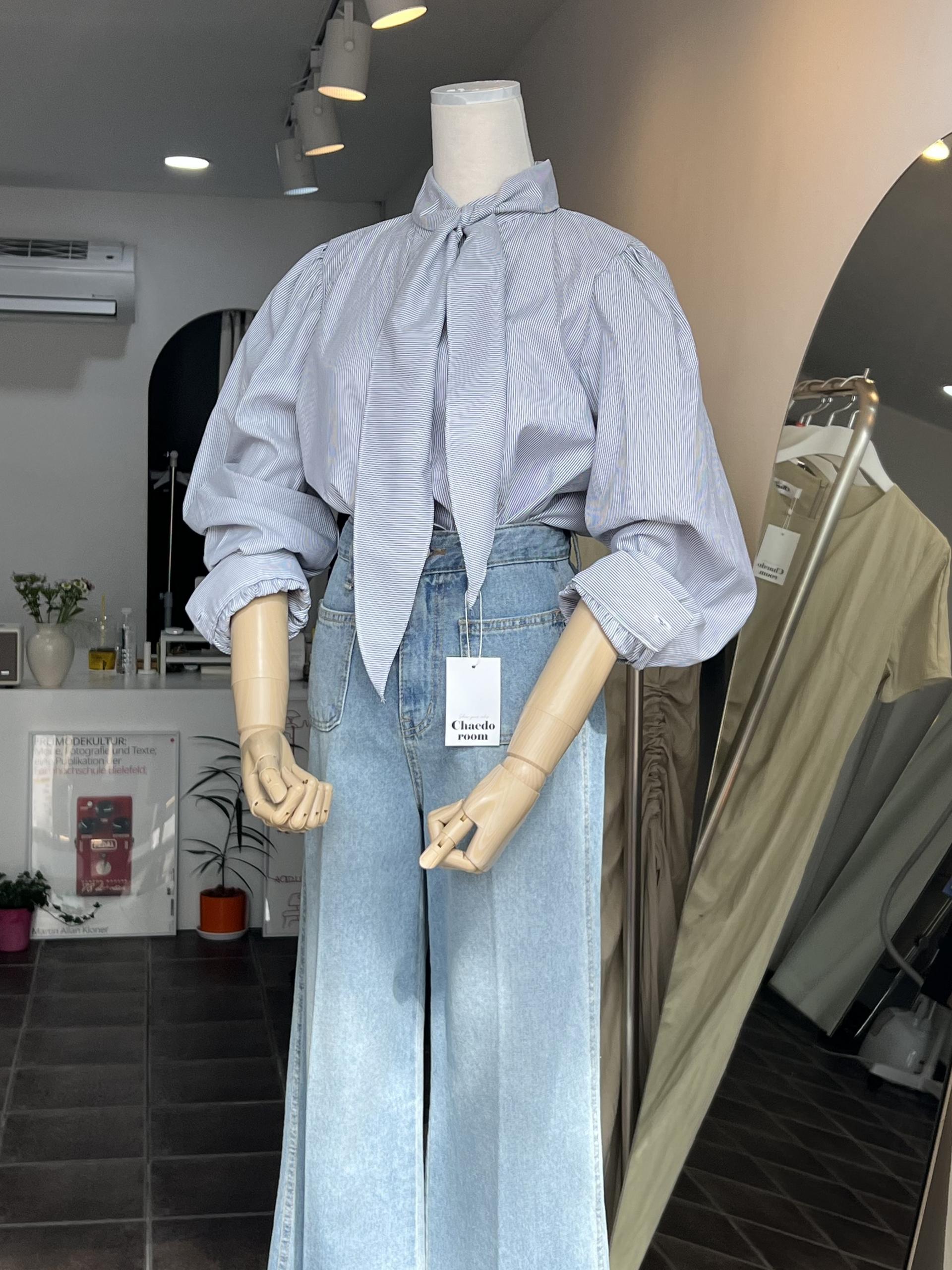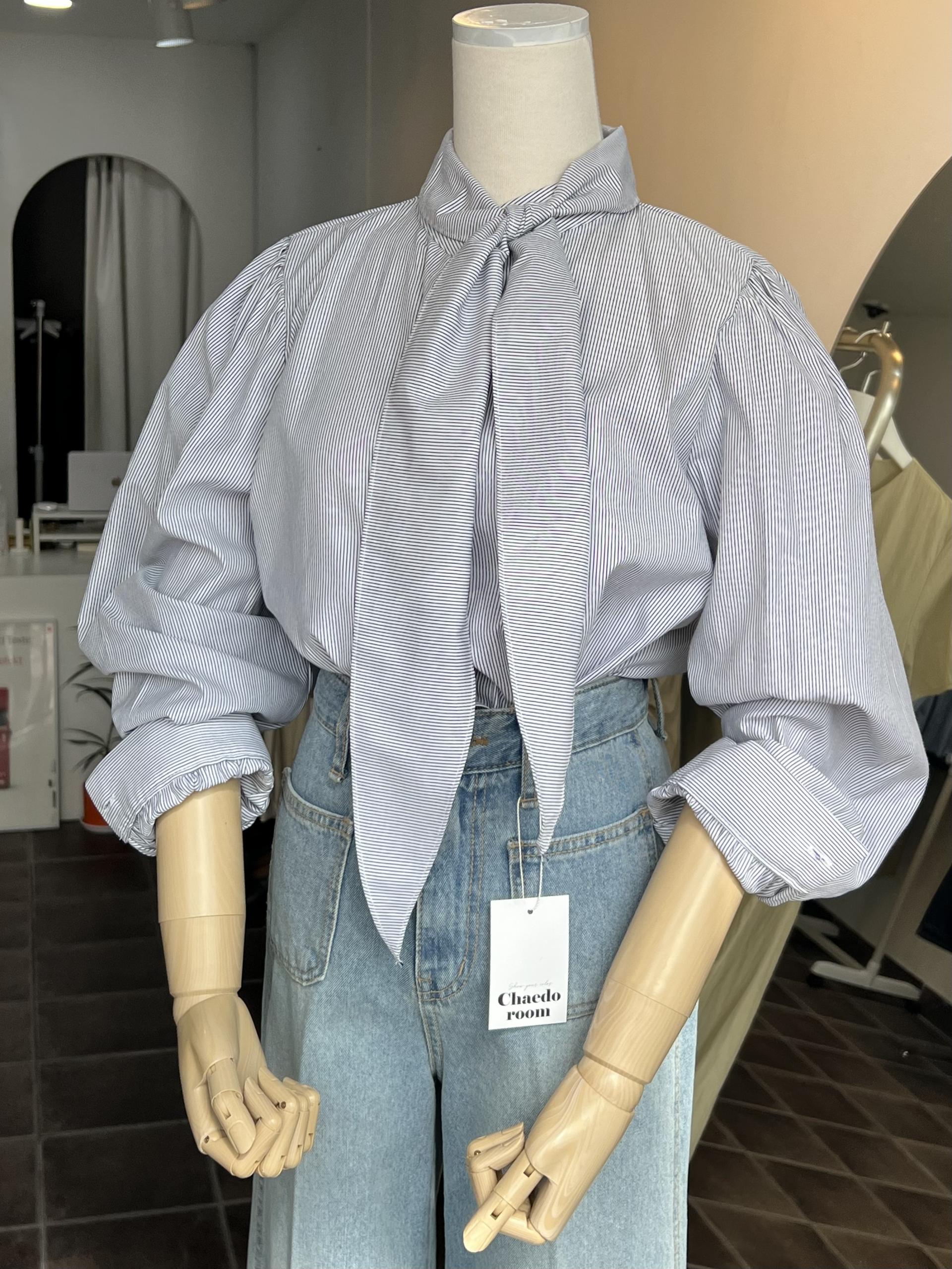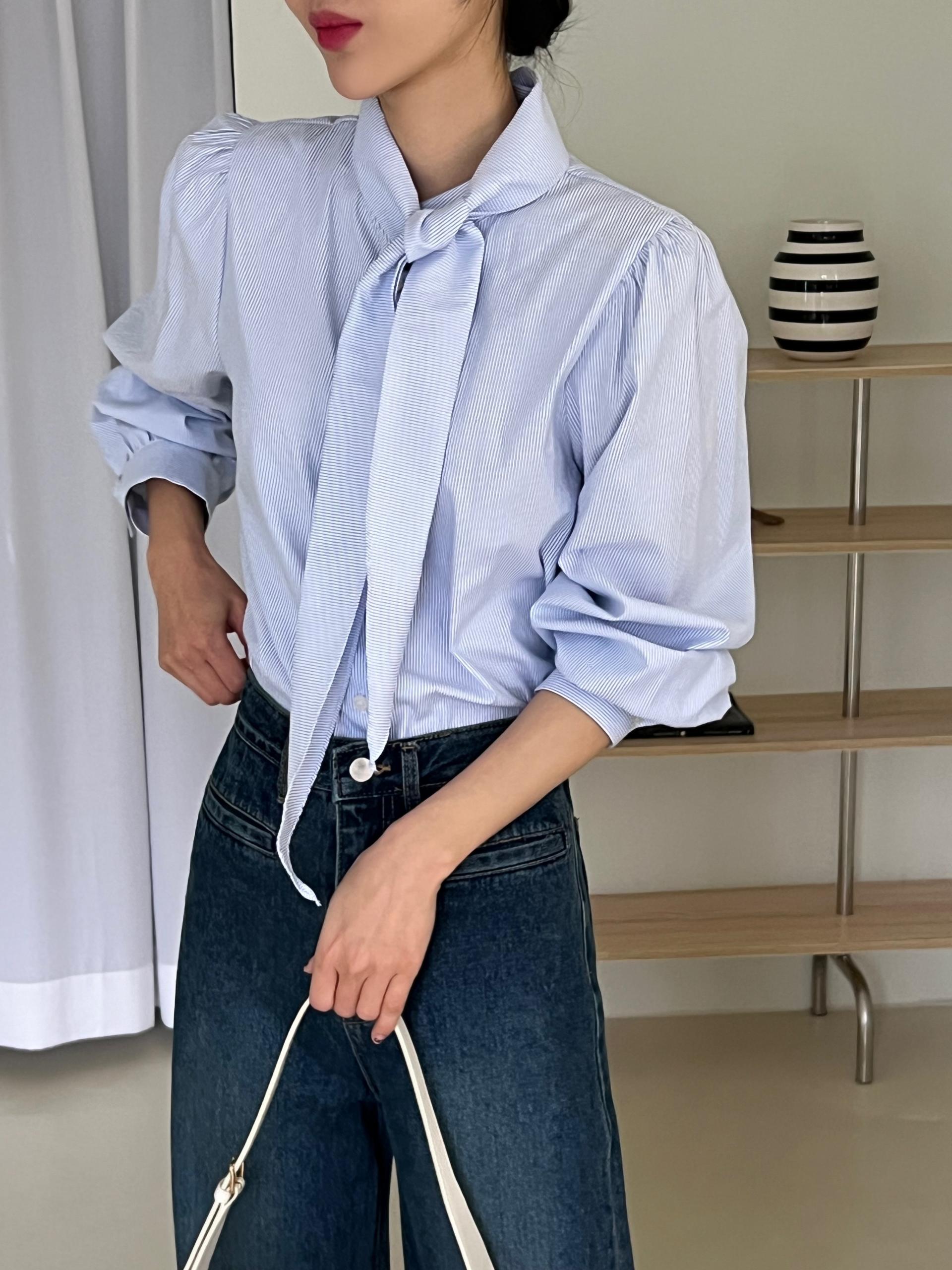 시원한 스트라이프 패턴으로 밋밋하지 않고 하이넥이지만 답답한 느낌이 없습니다. 과하지 않은 퍼프소매로 어깨와 팔 라인이 정돈된 느낌이 들고, 전체적으로 부하지 않은 기본 핏이라 호불호 없이 좋아해 주실 핏입니다. 데님이나 슬랙스 모두 잘 어울려요. 캐주얼한 스타일부터 격식 있는 스타일까지 스타일링에 따라 다양한 분위기를 내는 타이 블라우스입니다.