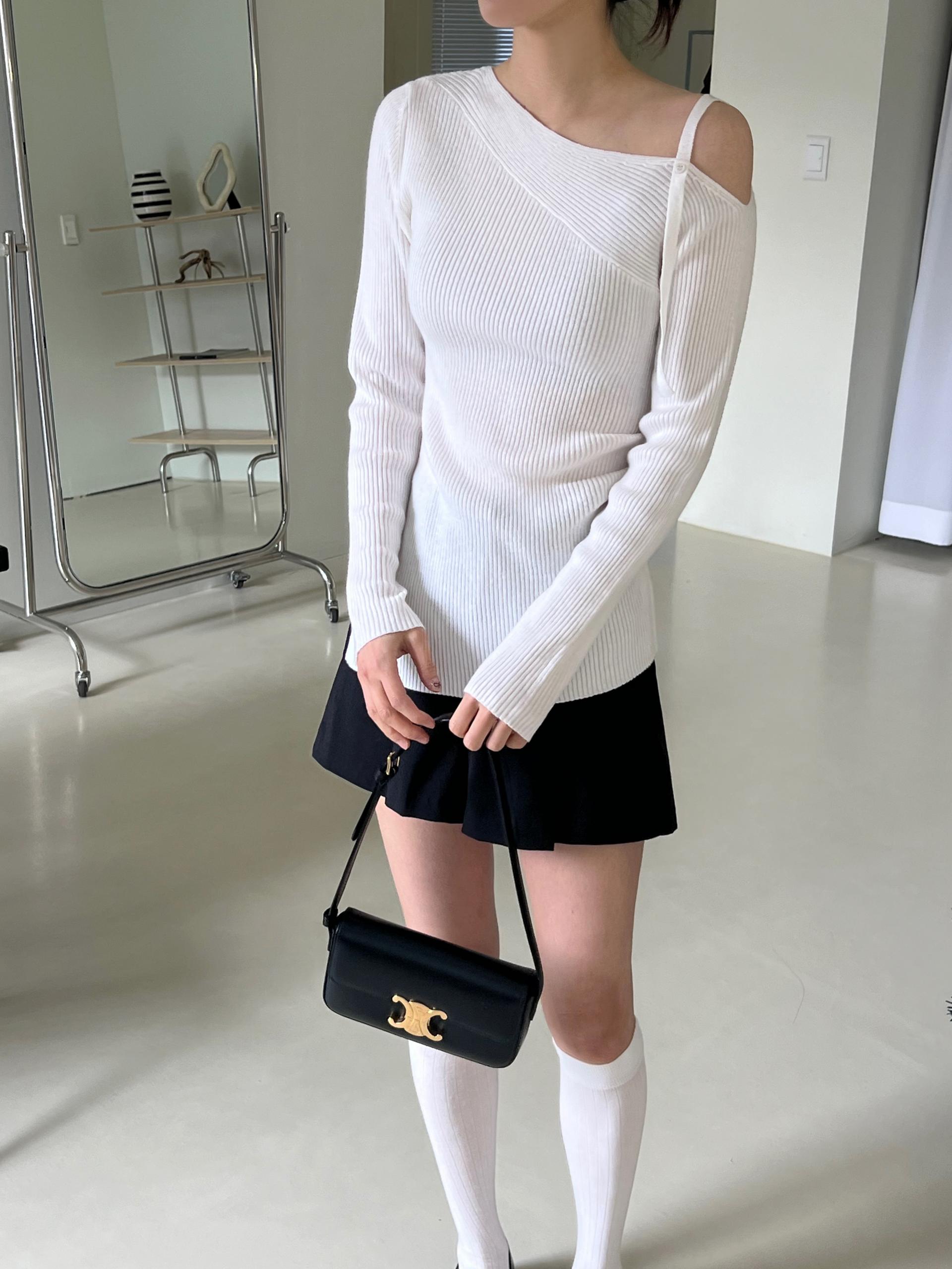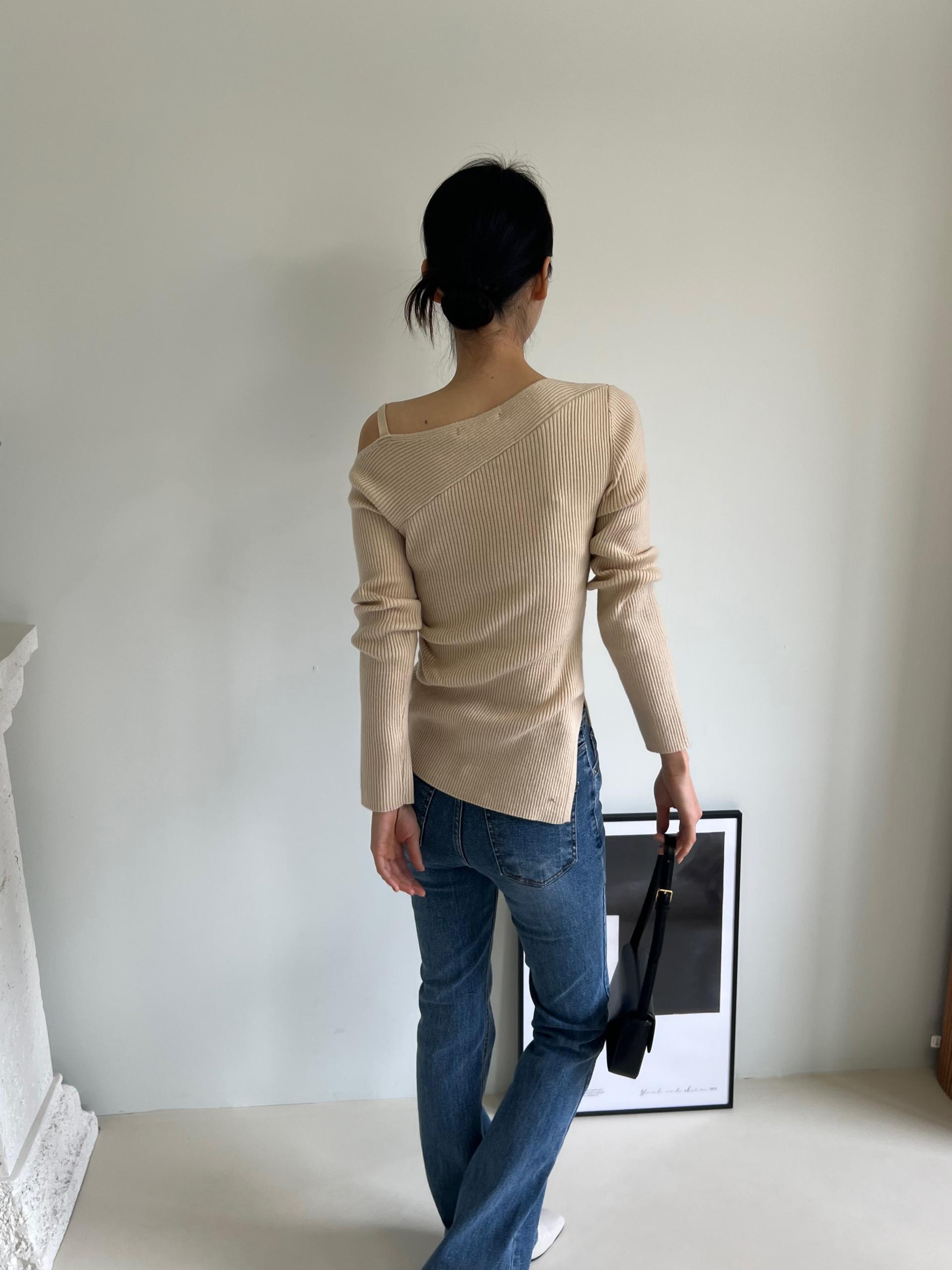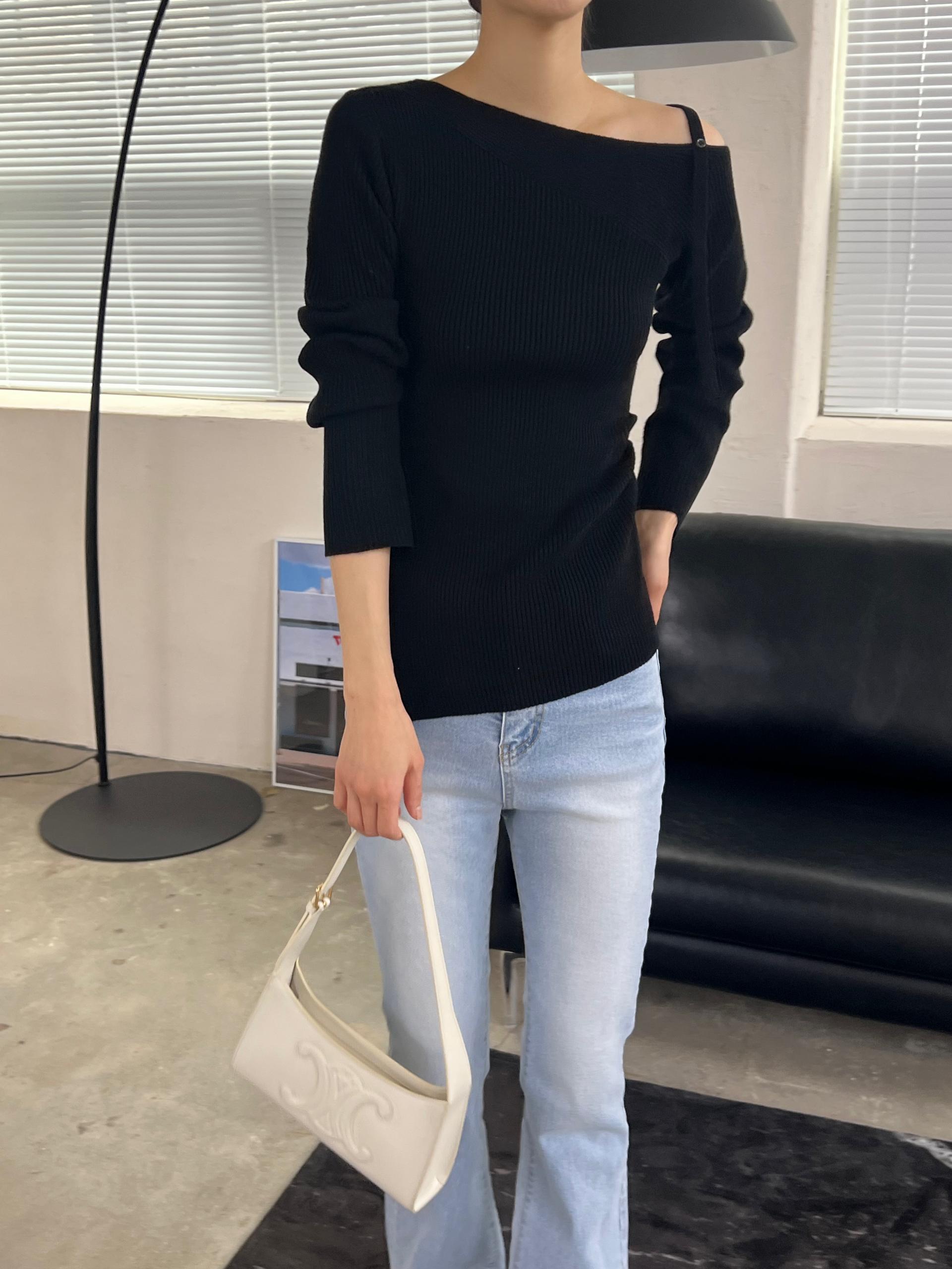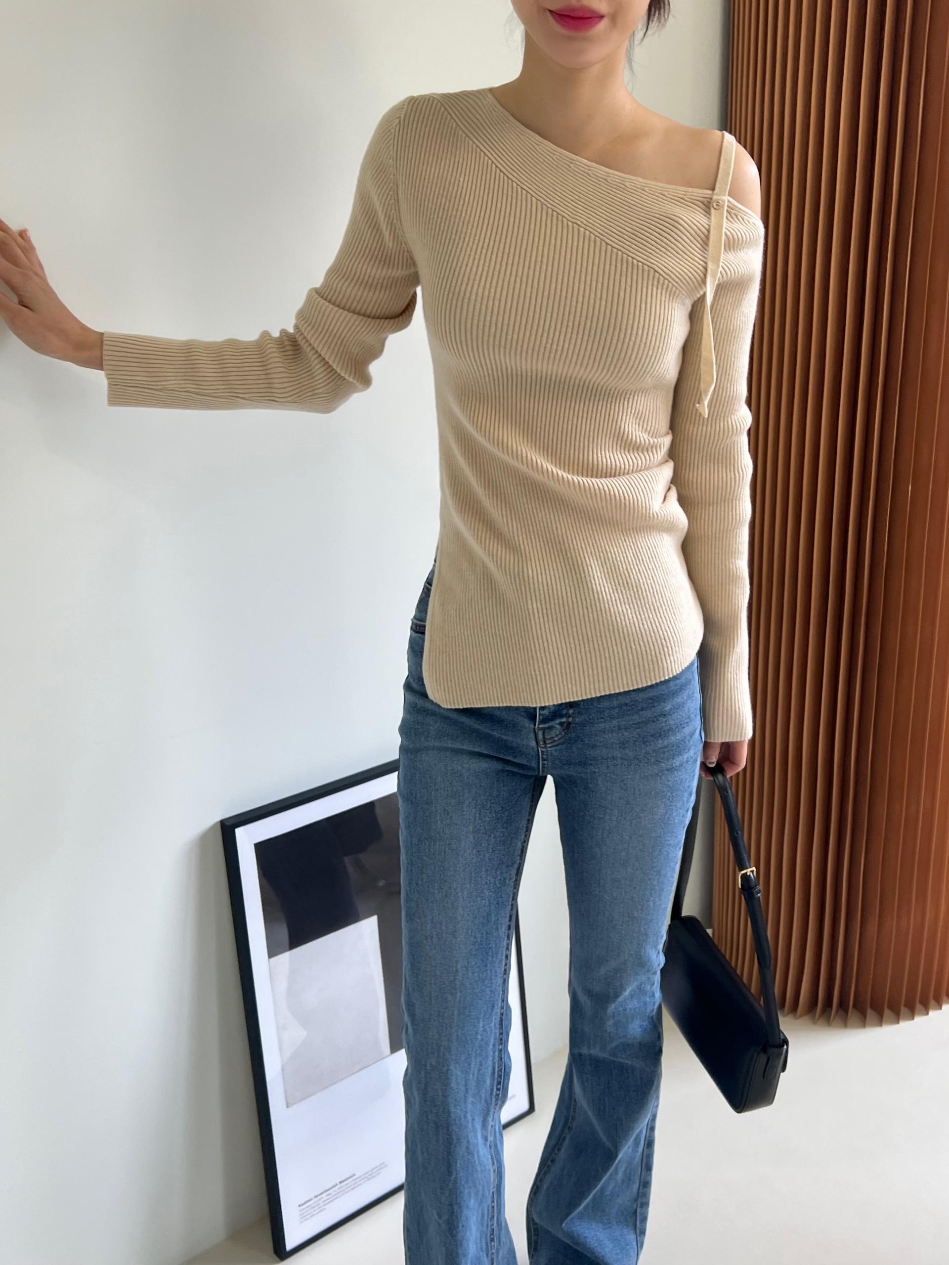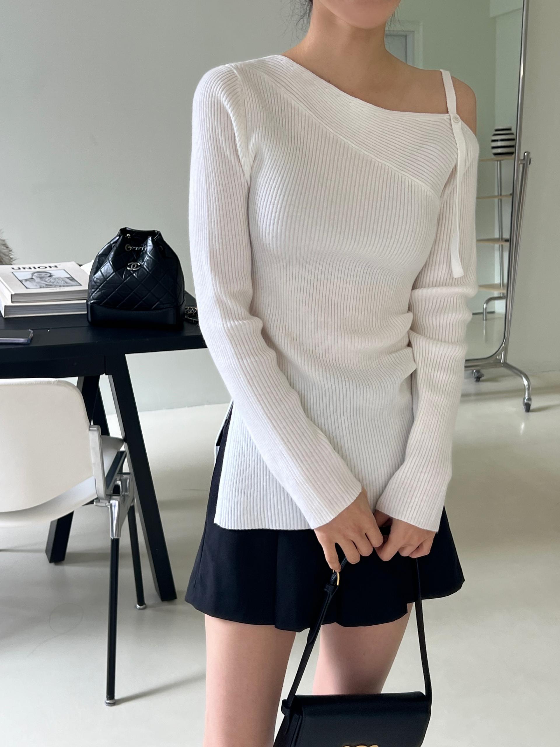 과하지 않은 원오프숄더넥에 심플한 디자인으로 웨어러블하게 활용하기 좋은 니트 티셔츠입니다.