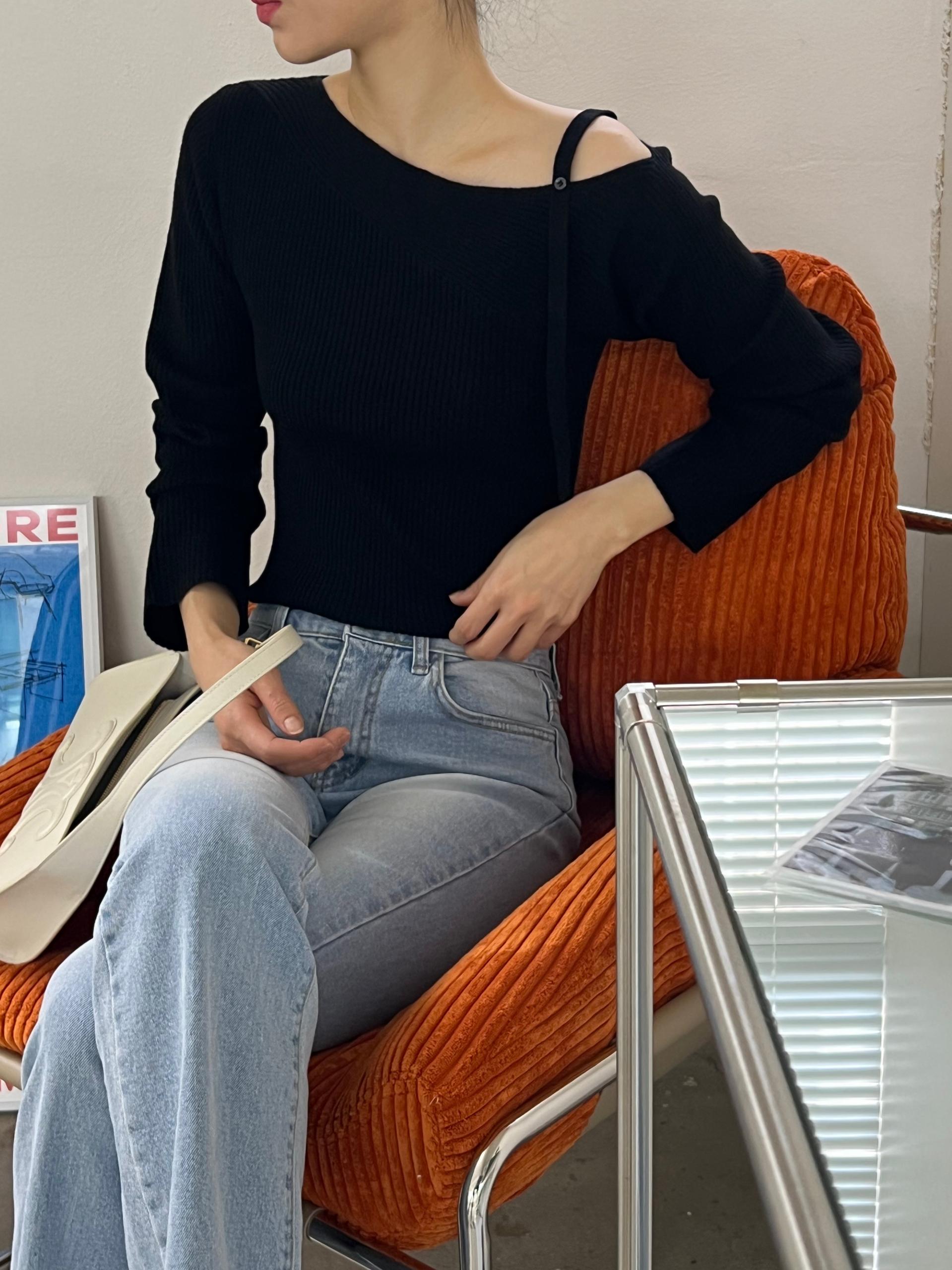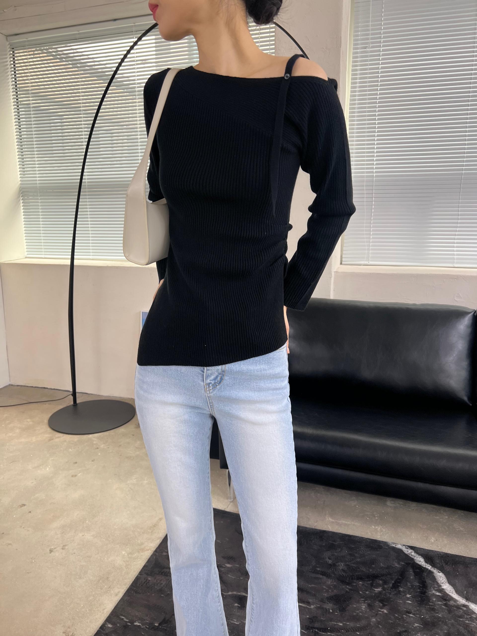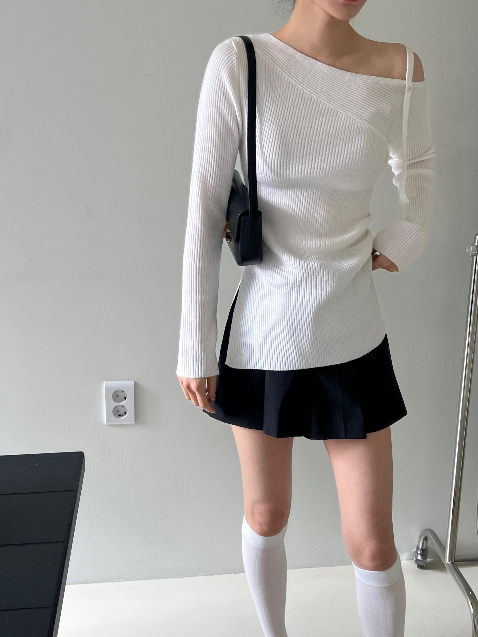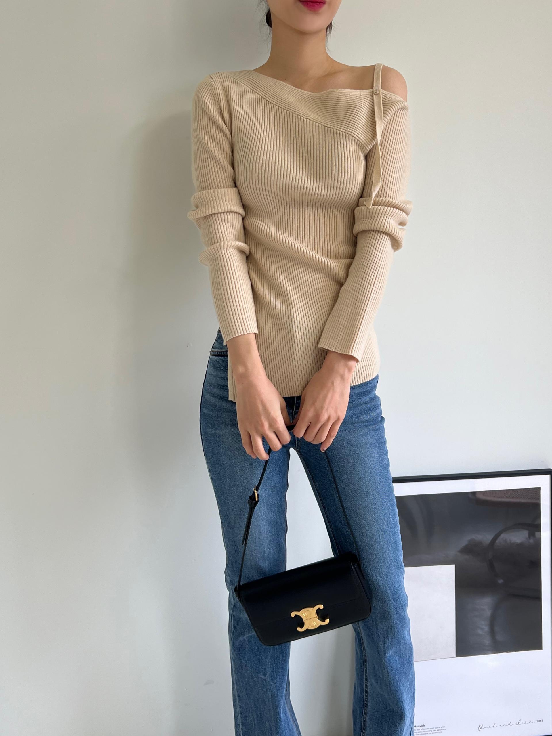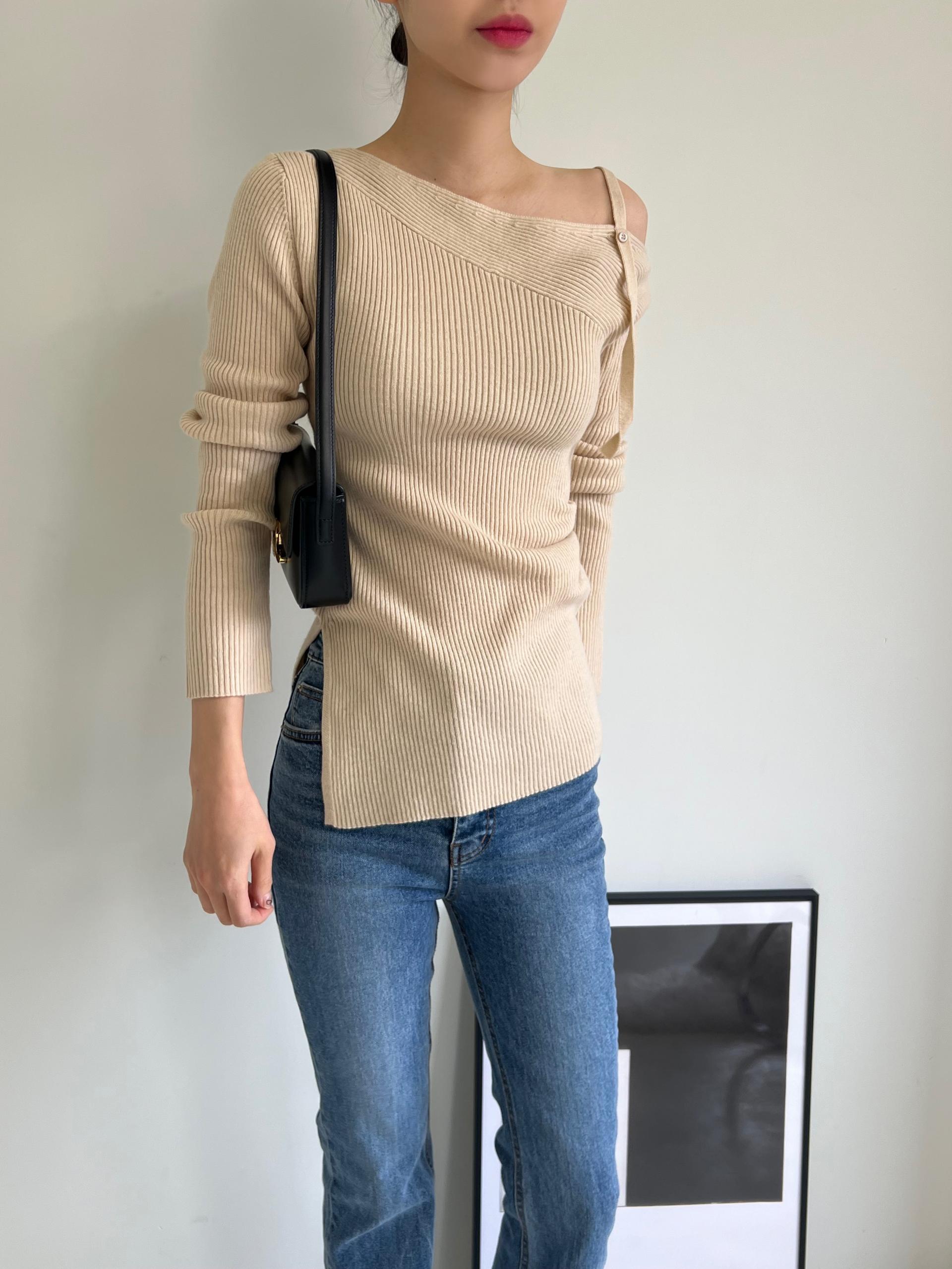 과하지 않은 원오프숄더넥에 심플한 디자인으로 웨어러블하게 활용하기 좋은 니트 티셔츠입니다.