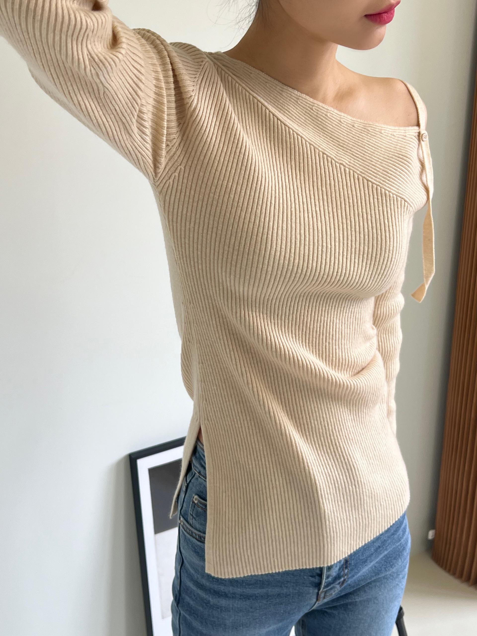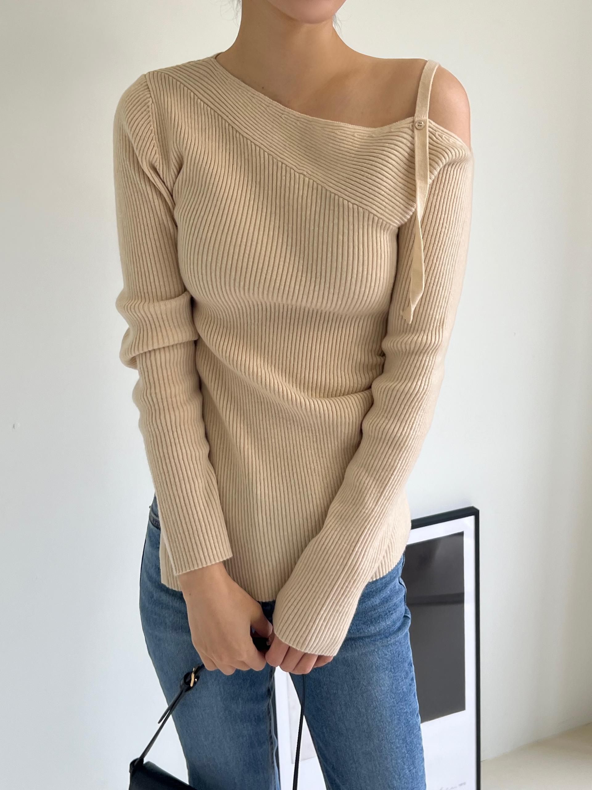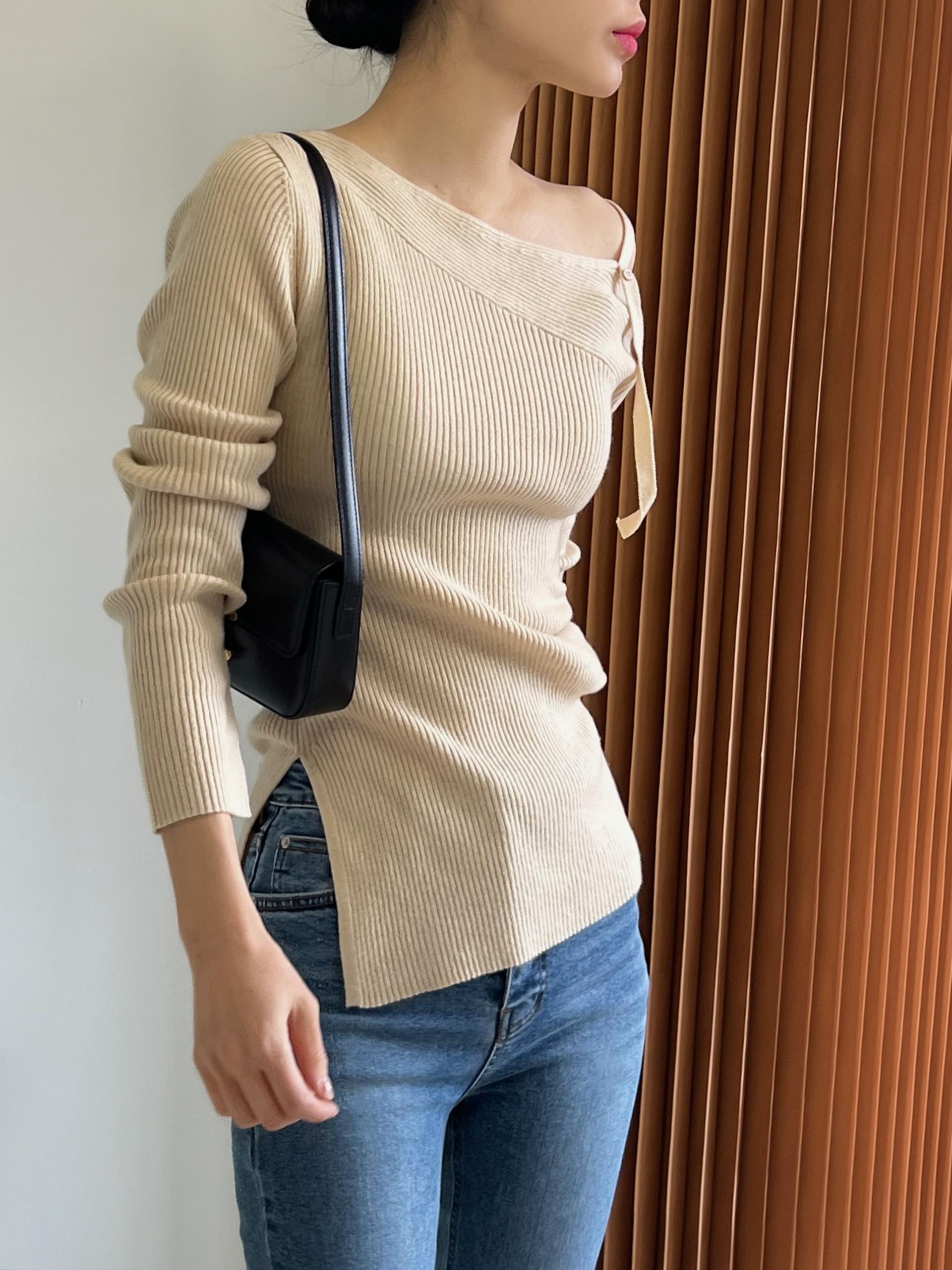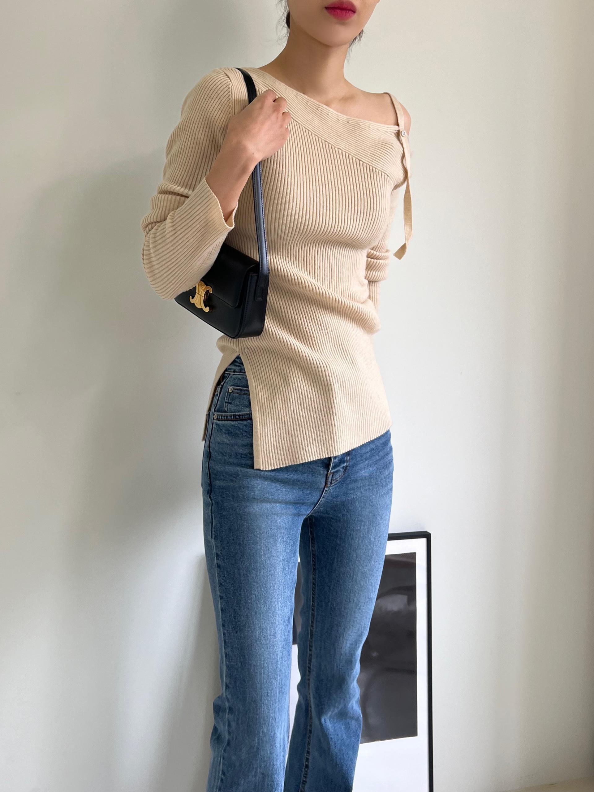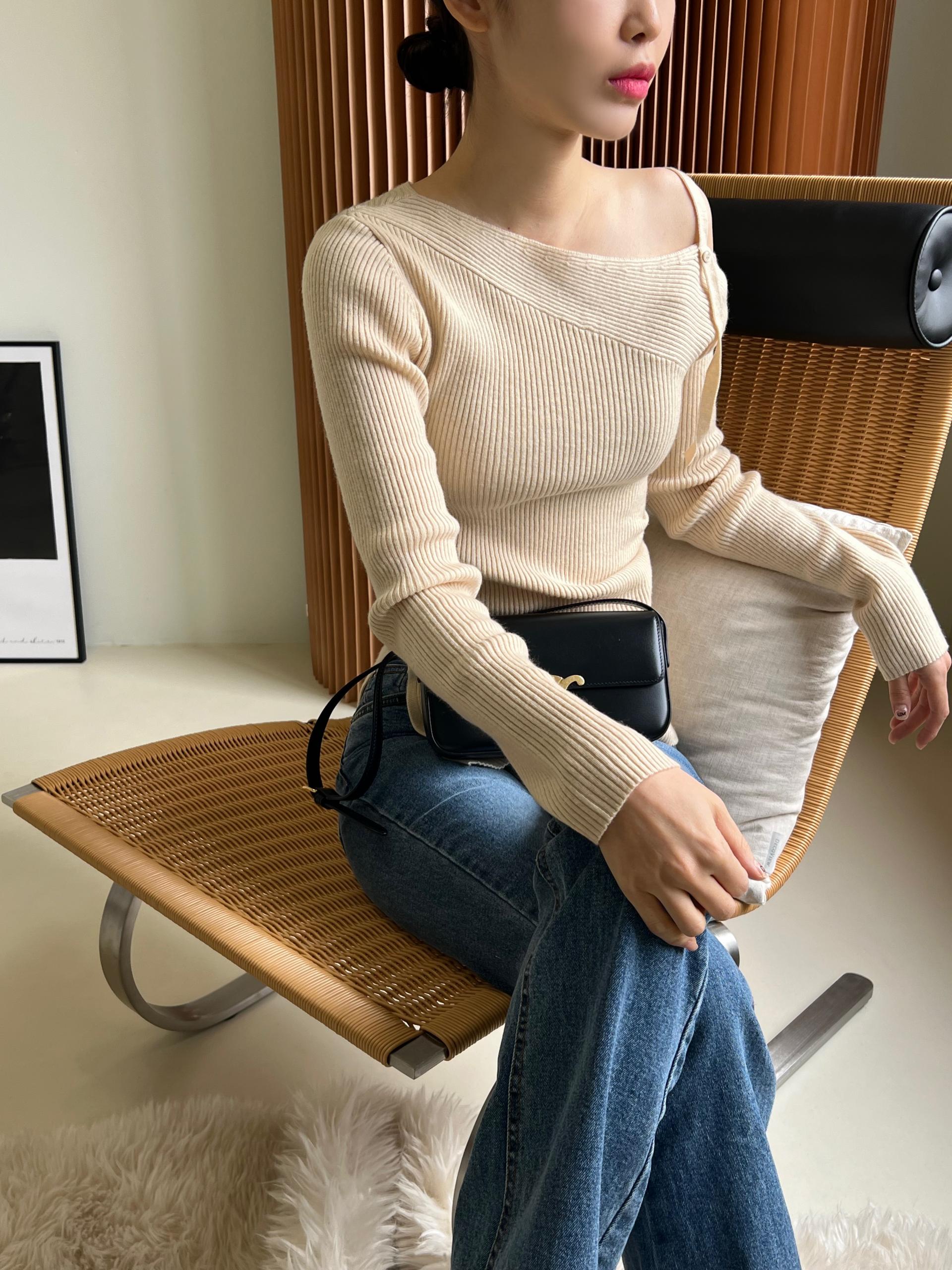 과하지 않은 원오프숄더넥에 심플한 디자인으로 웨어러블하게 활용하기 좋은 니트 티셔츠입니다.