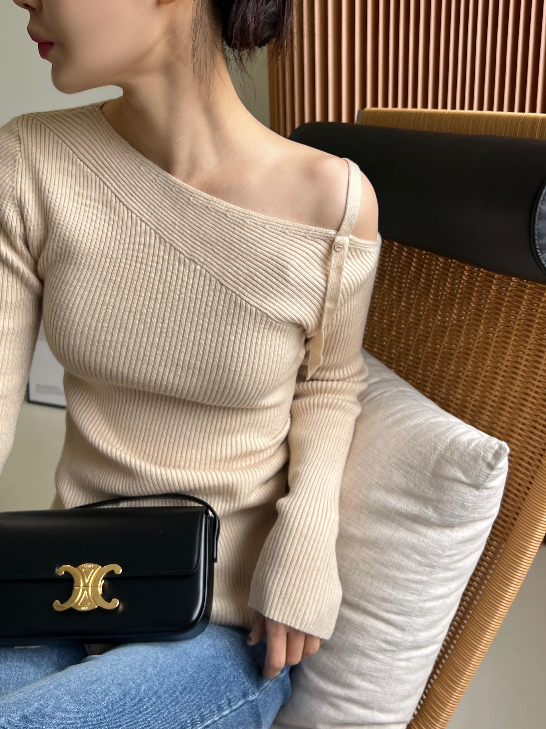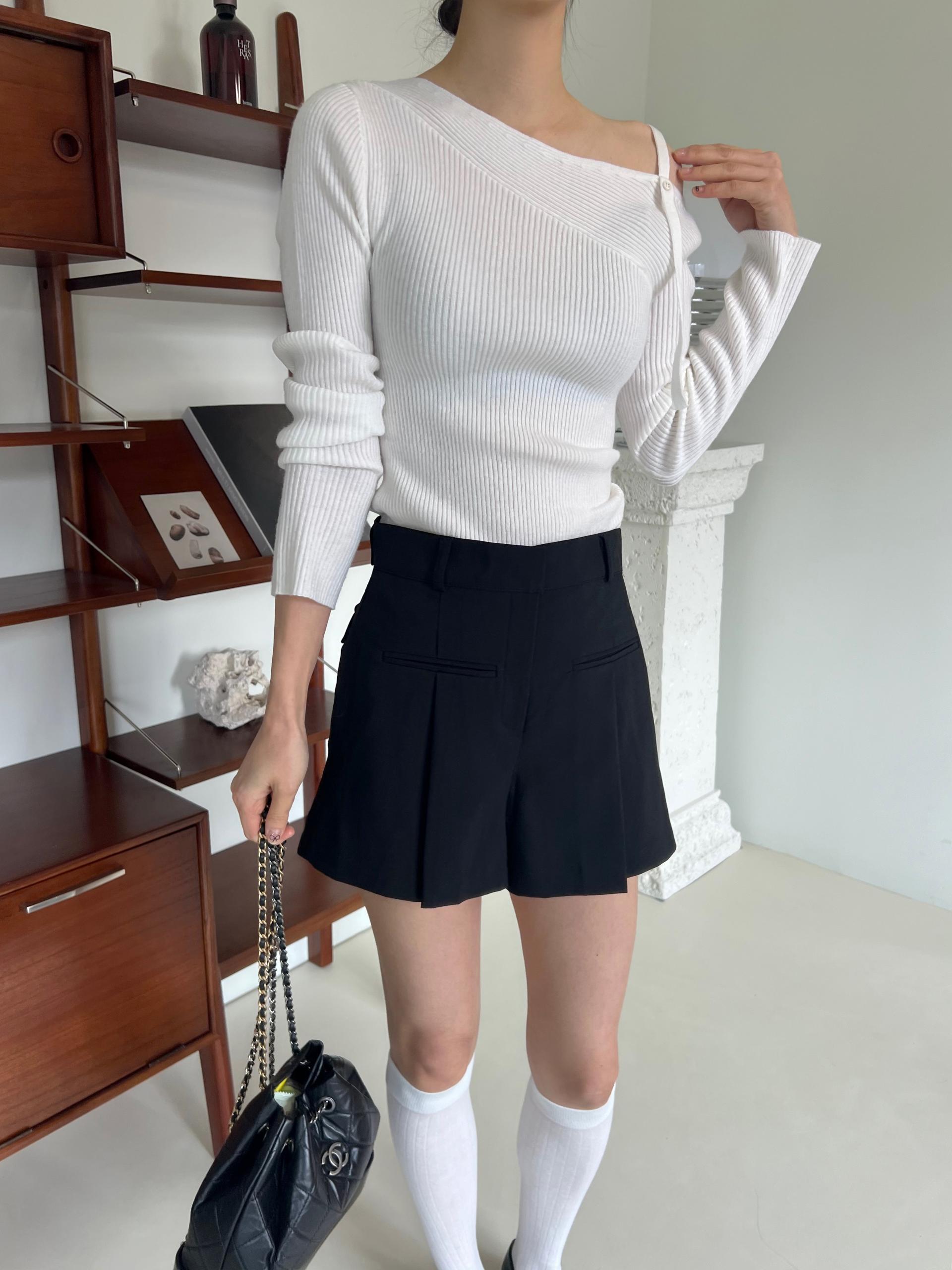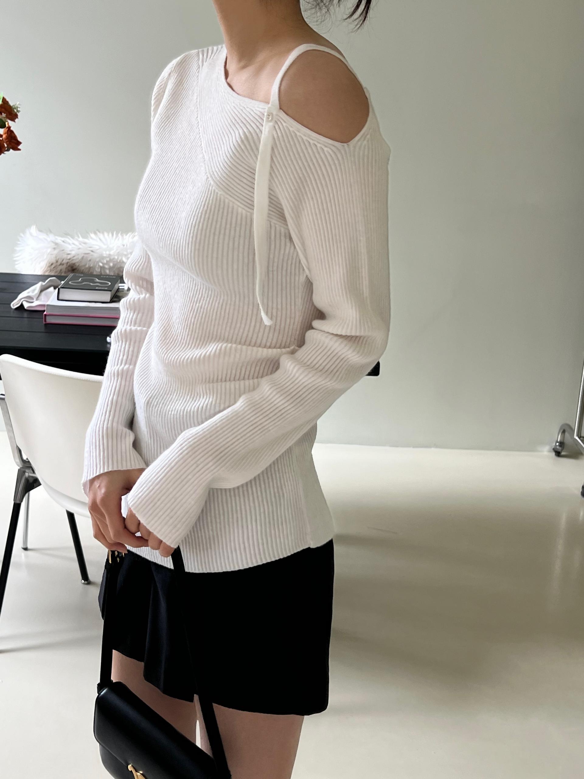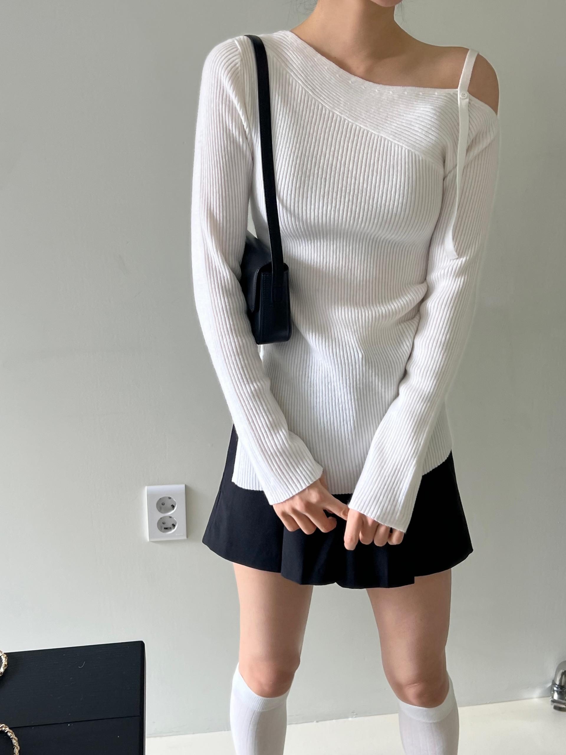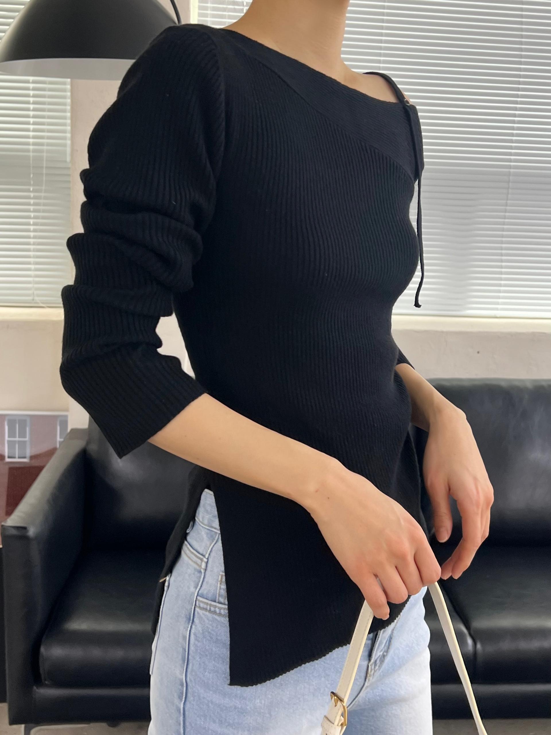 과하지 않은 원오프숄더넥에 심플한 디자인으로 웨어러블하게 활용하기 좋은 니트 티셔츠입니다.