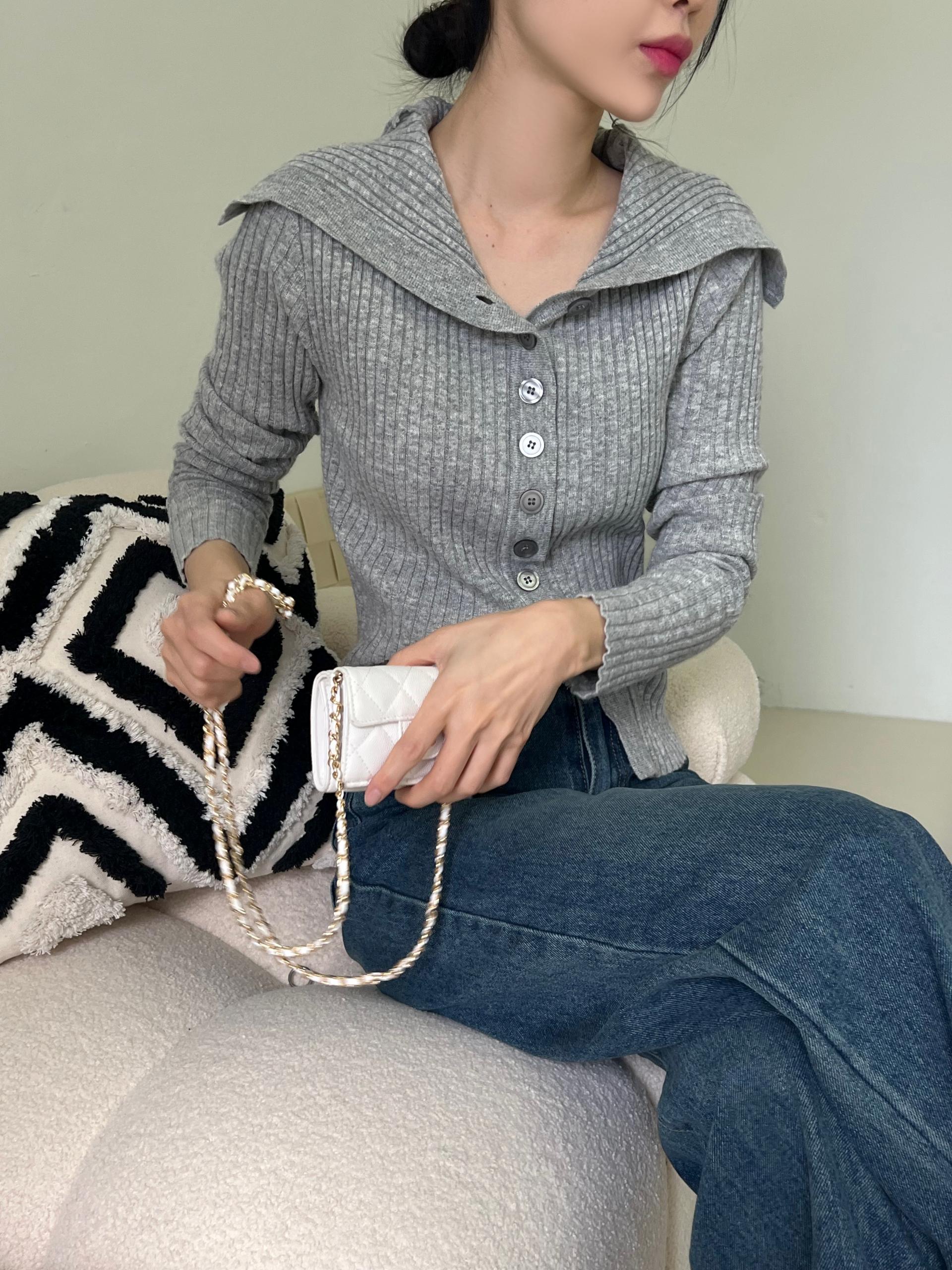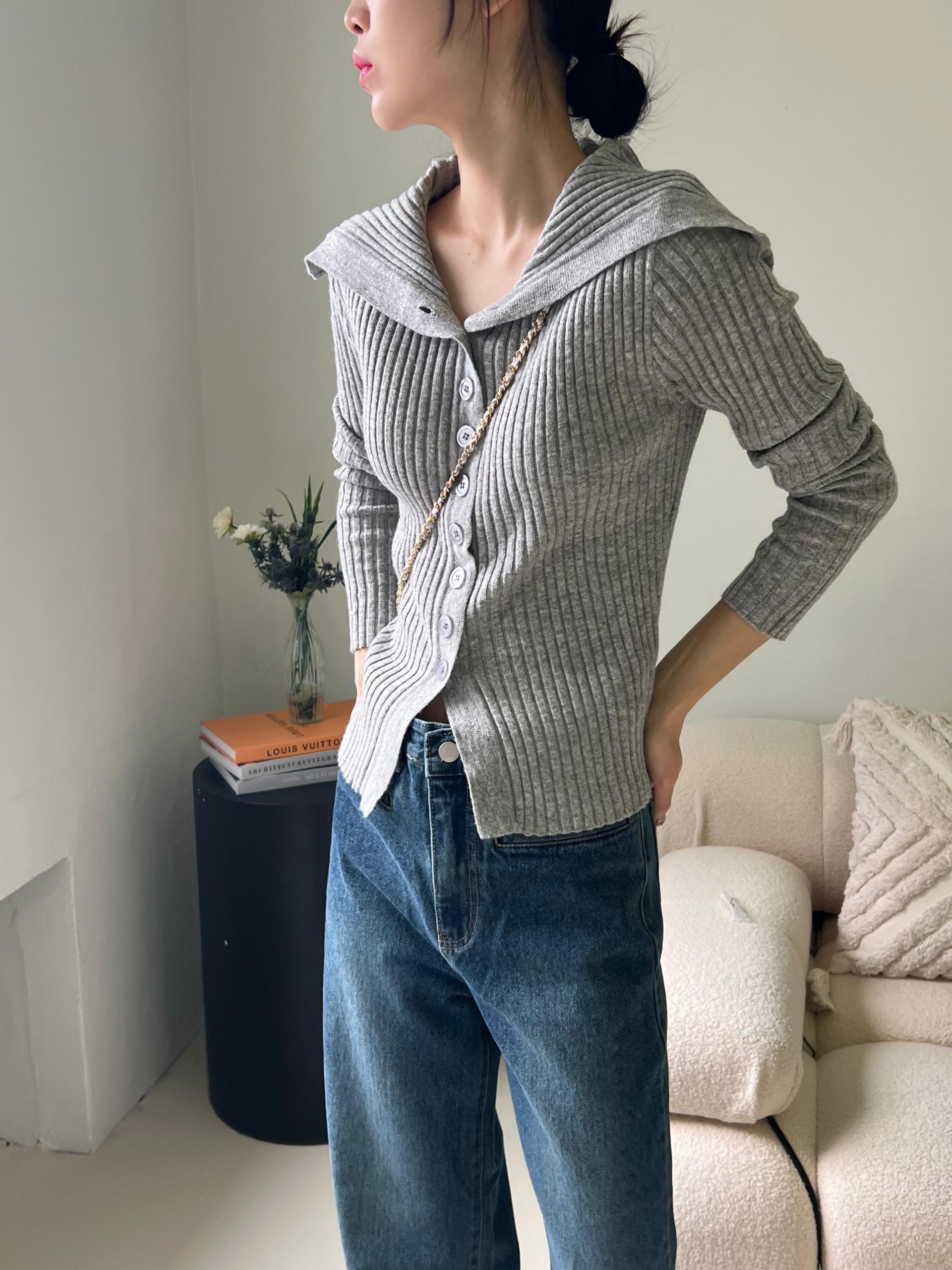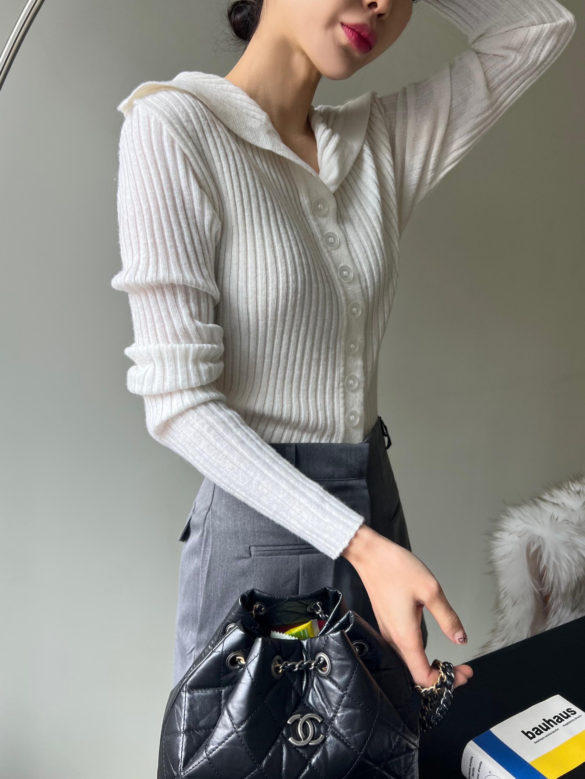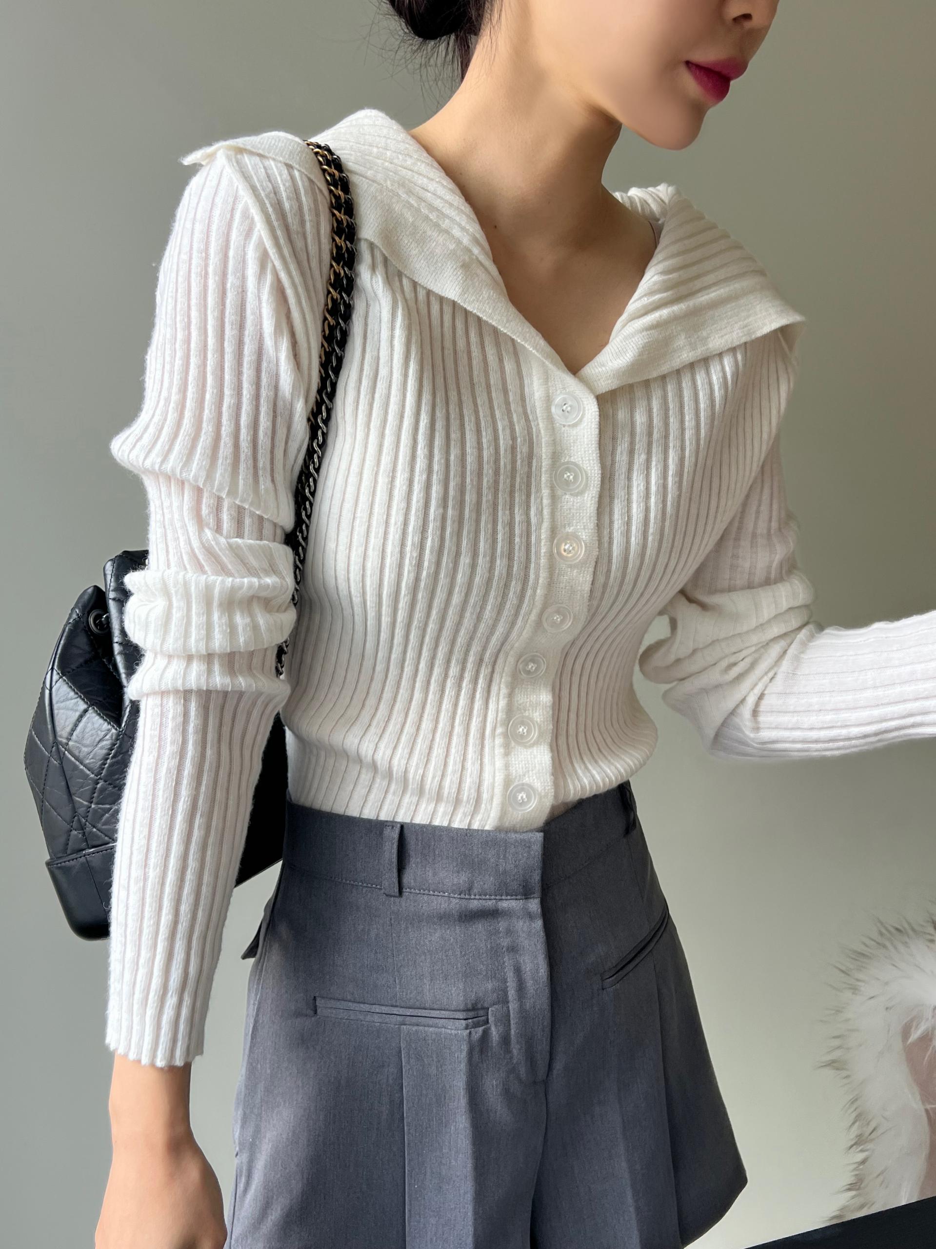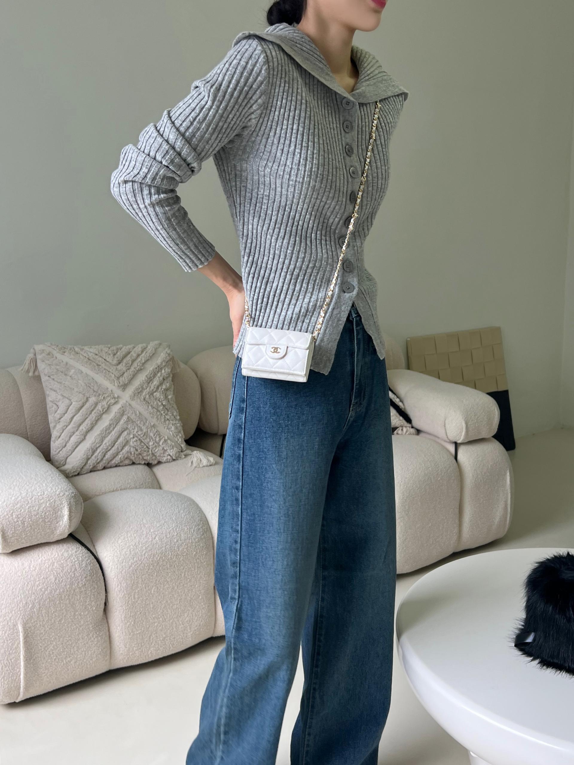 세로 골지 가공으로 슬림해 보이면서 지나치게 붙는 핏이 아니라 체형 커버에도 좋으며 데일리하게 착용하기 좋습니다. 적당한 깊이감의 브이넥 라인으로 여리한 느낌이 더 강조되며, 단추를 한두 개 정도 풀어 어깨선이 보이도록 착용하시는 것도 좋아요.